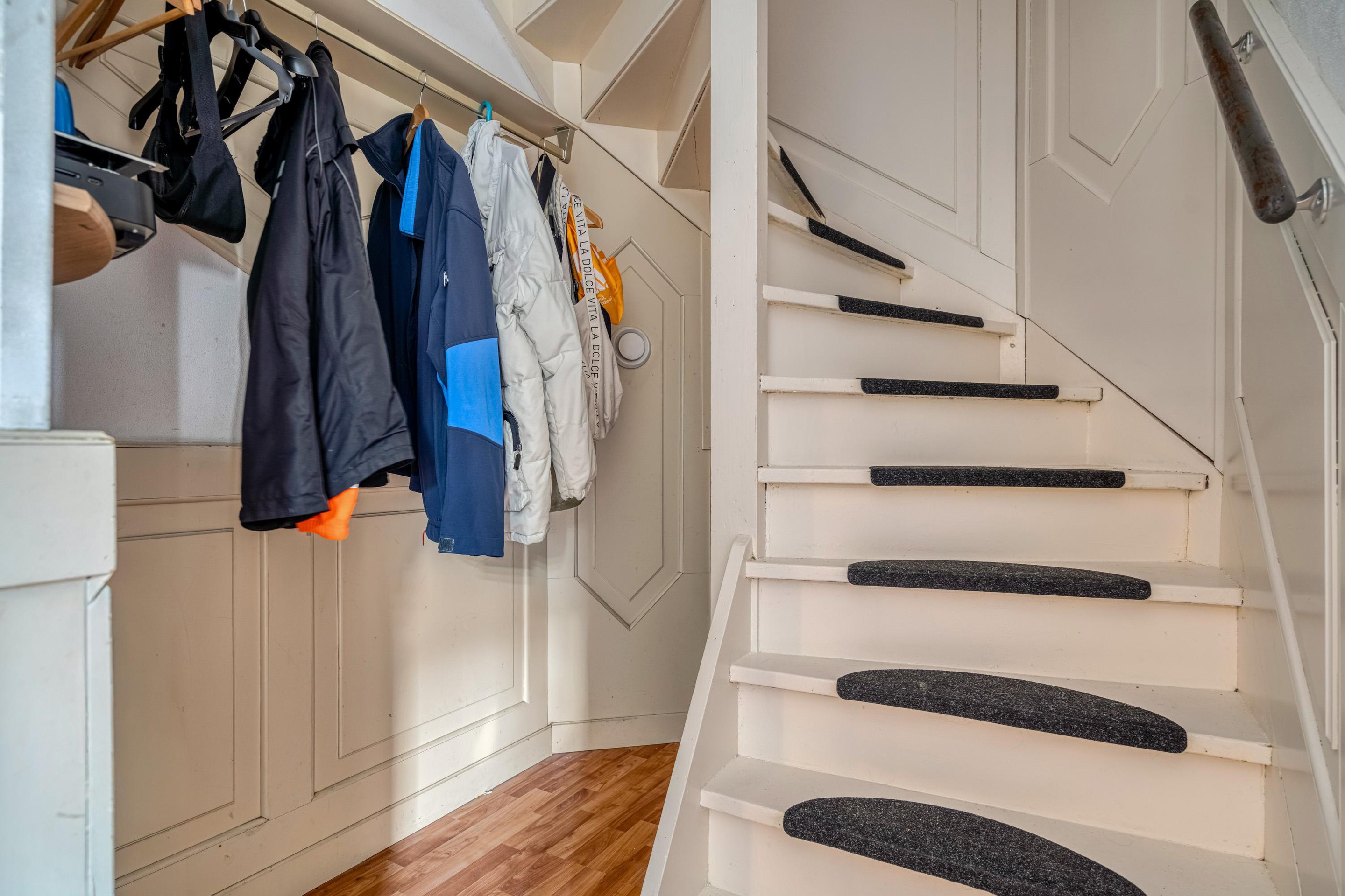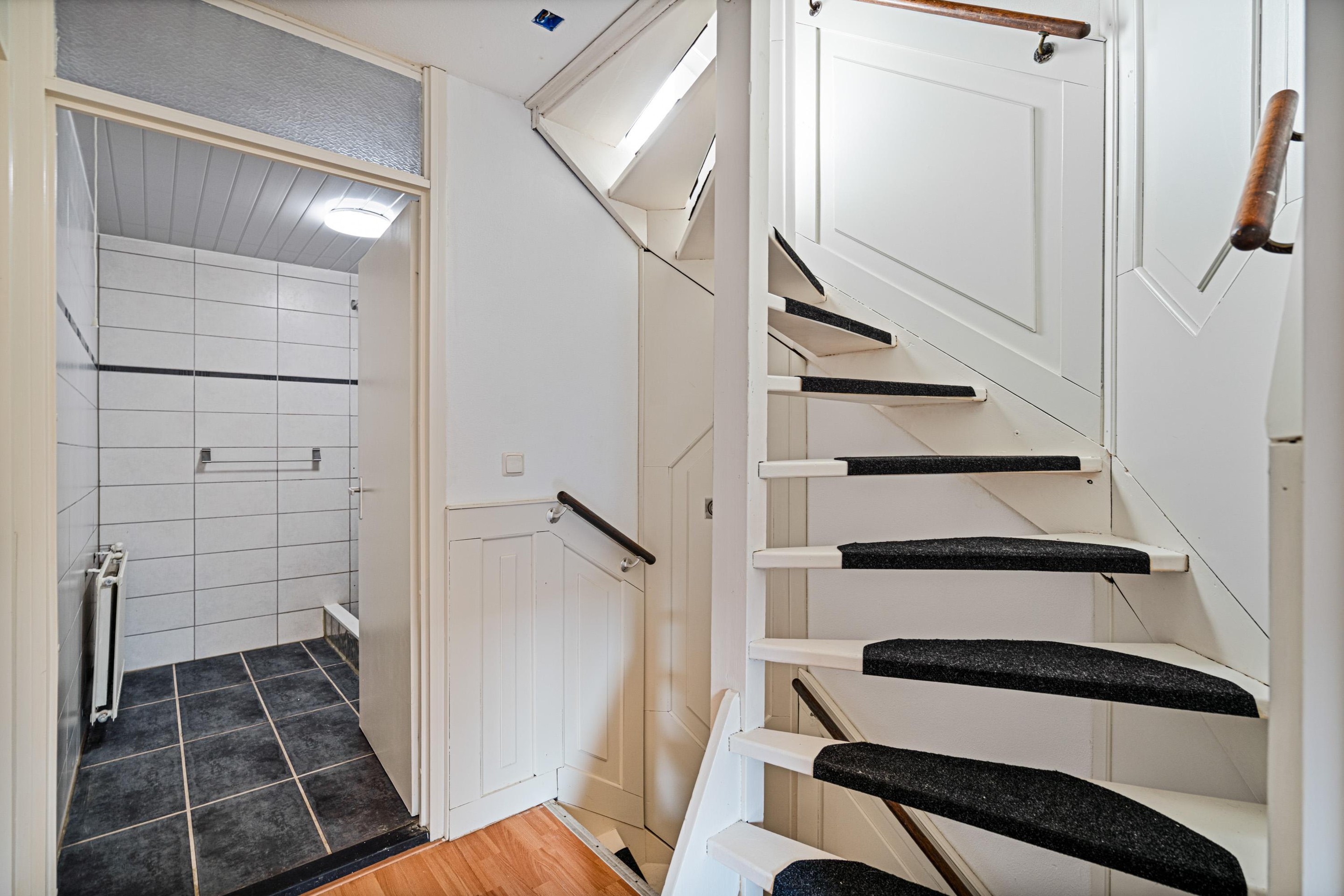 Centraal in de woning bevindt zich de trapopgang met tussenhal en garderobe.