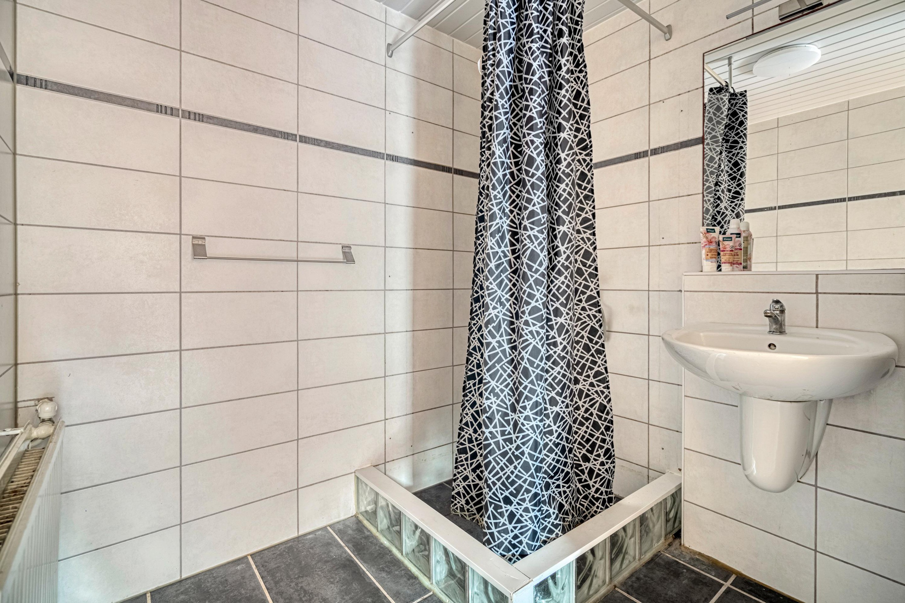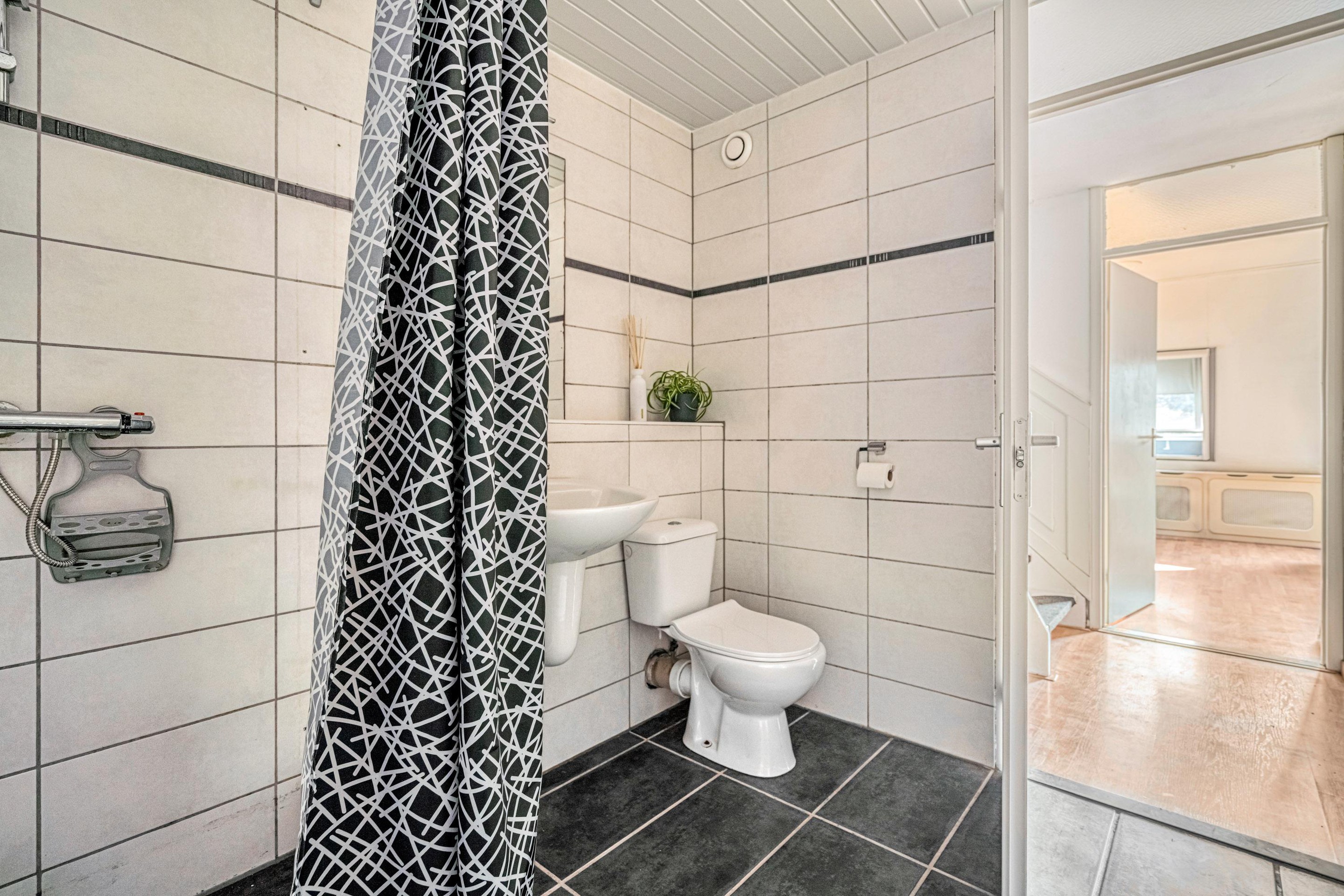 De moderne badkamer is compleet uitgevoerd met een douche, wastafel en tweede toilet.
