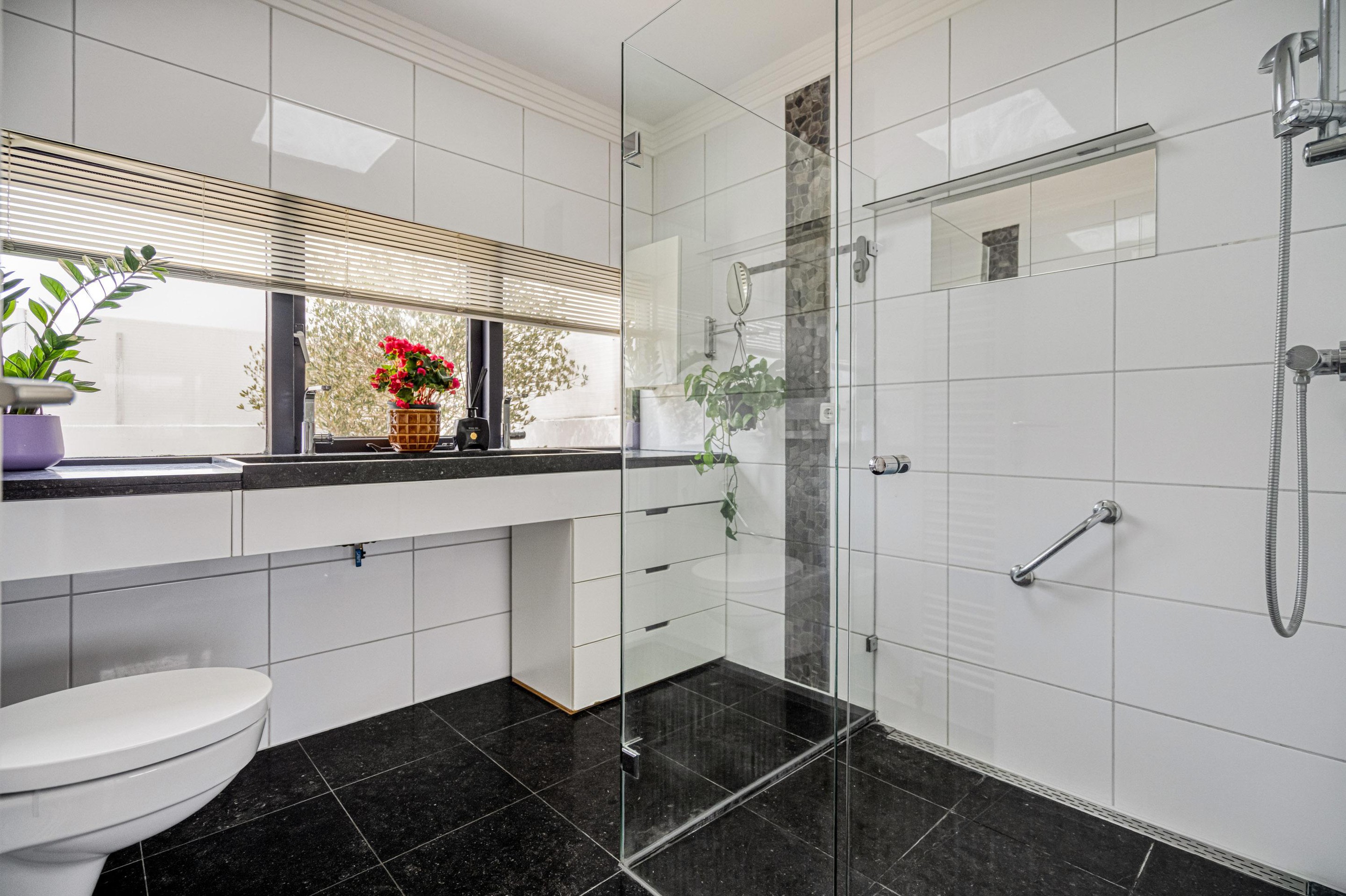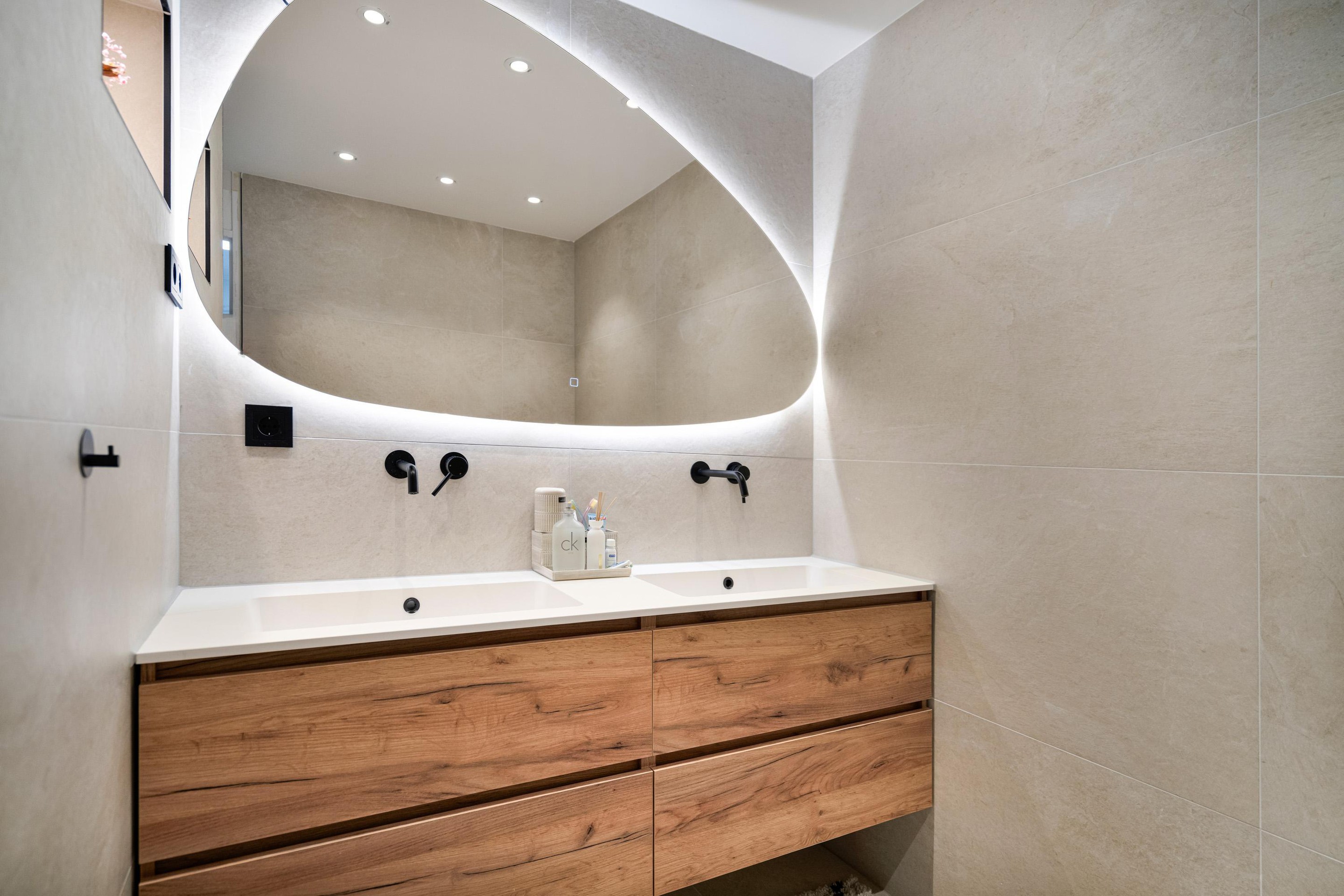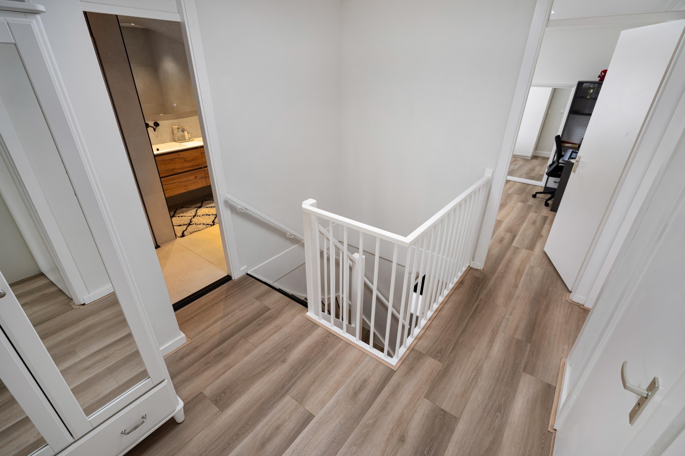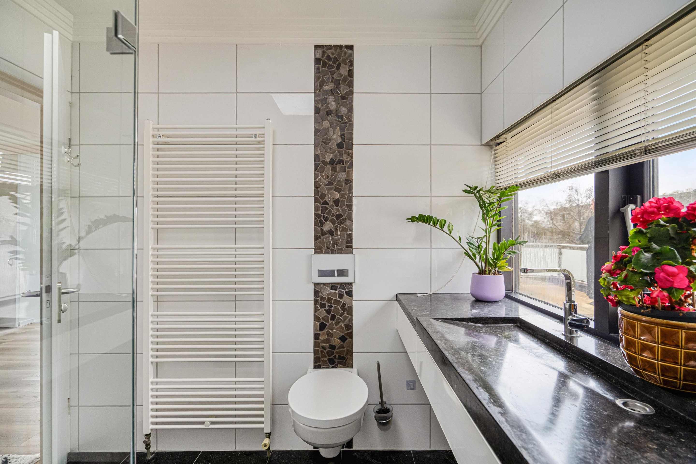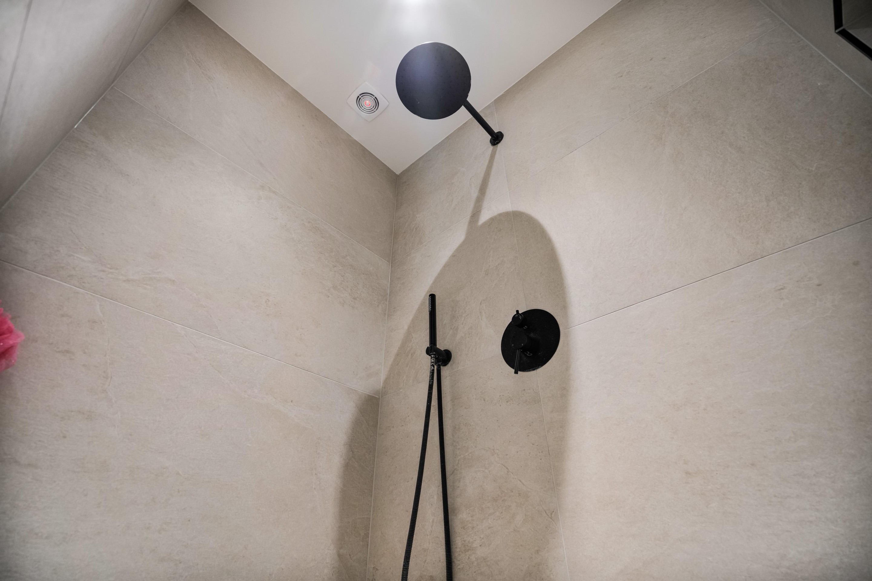 De moderne badkamer is uitgerust met een douche en een dubbele wastafel met stijlvolle zwarte kranen. Daarnaast beschikt deze verdieping over een separate toiletruimte en een praktische inloopkast met toegang tot de dakopbouw op de tweede verdieping. Indien gewenst is hier een extra slaapkamer te realiseren.