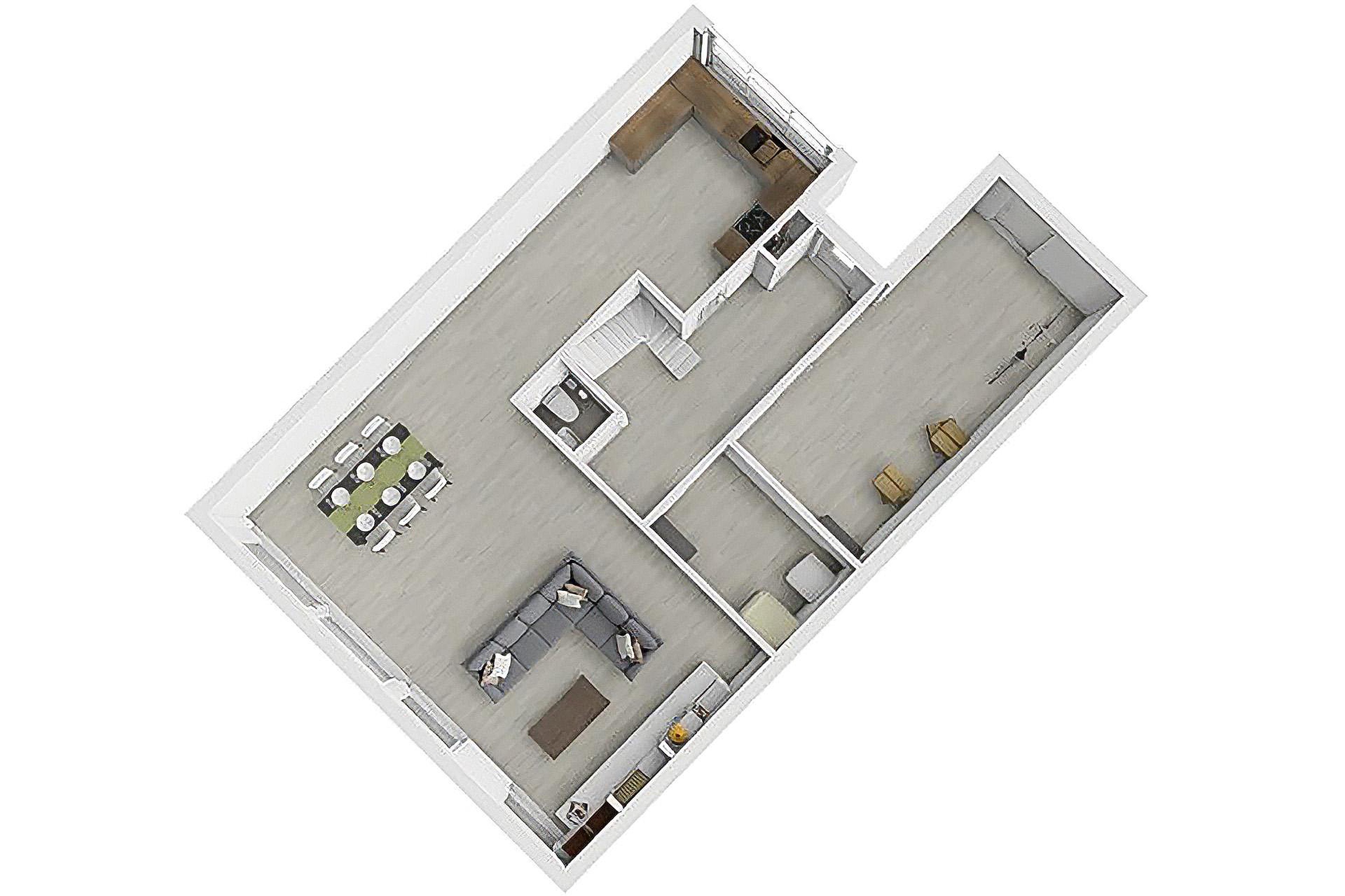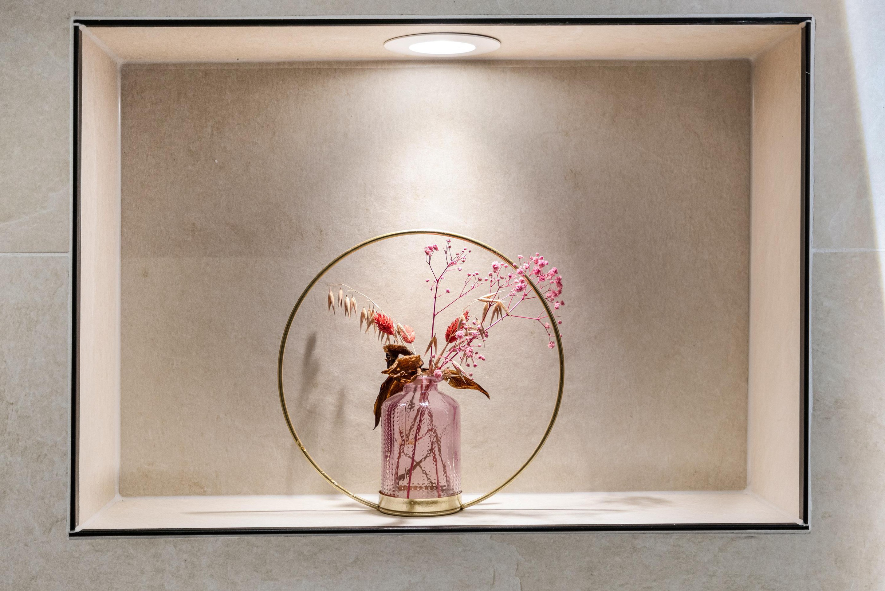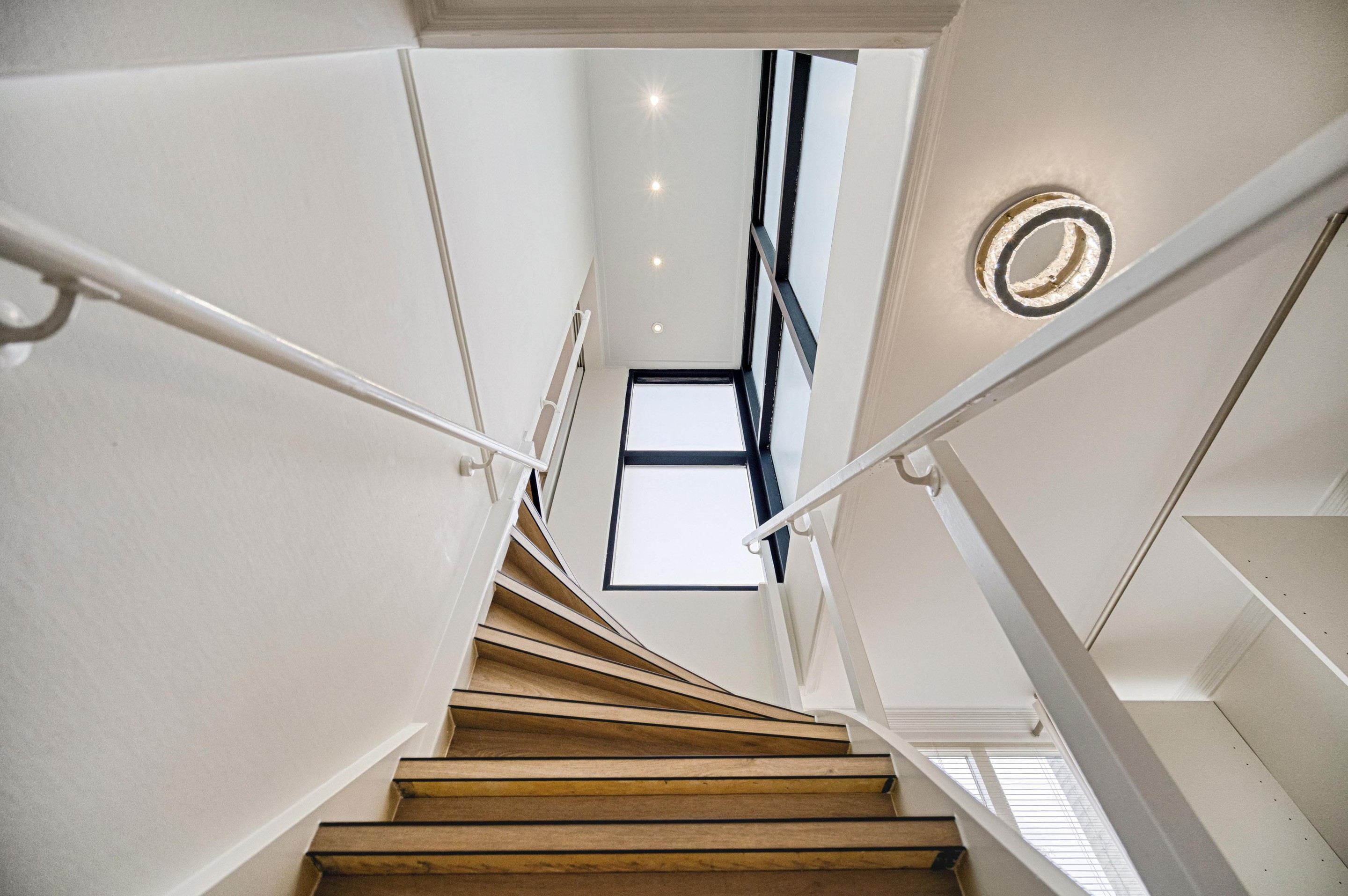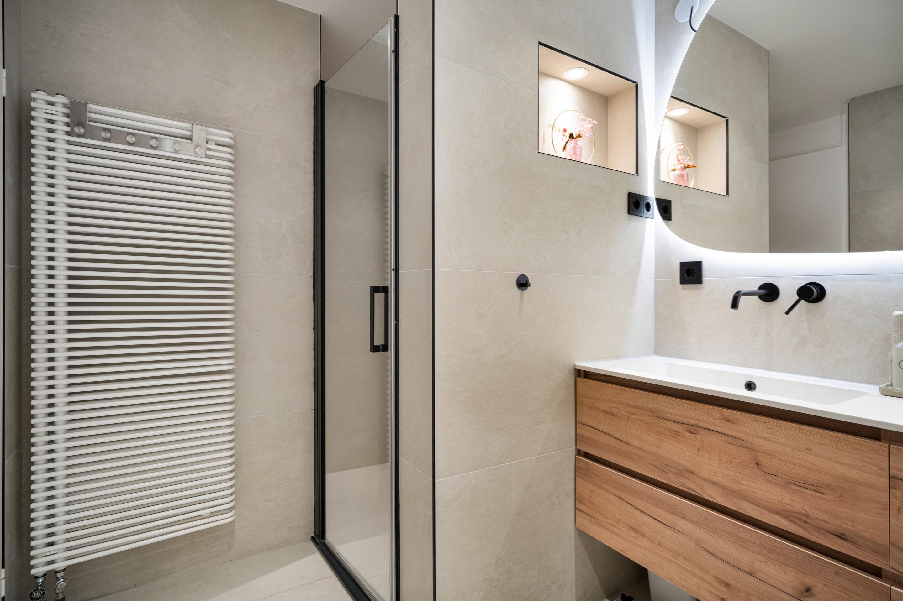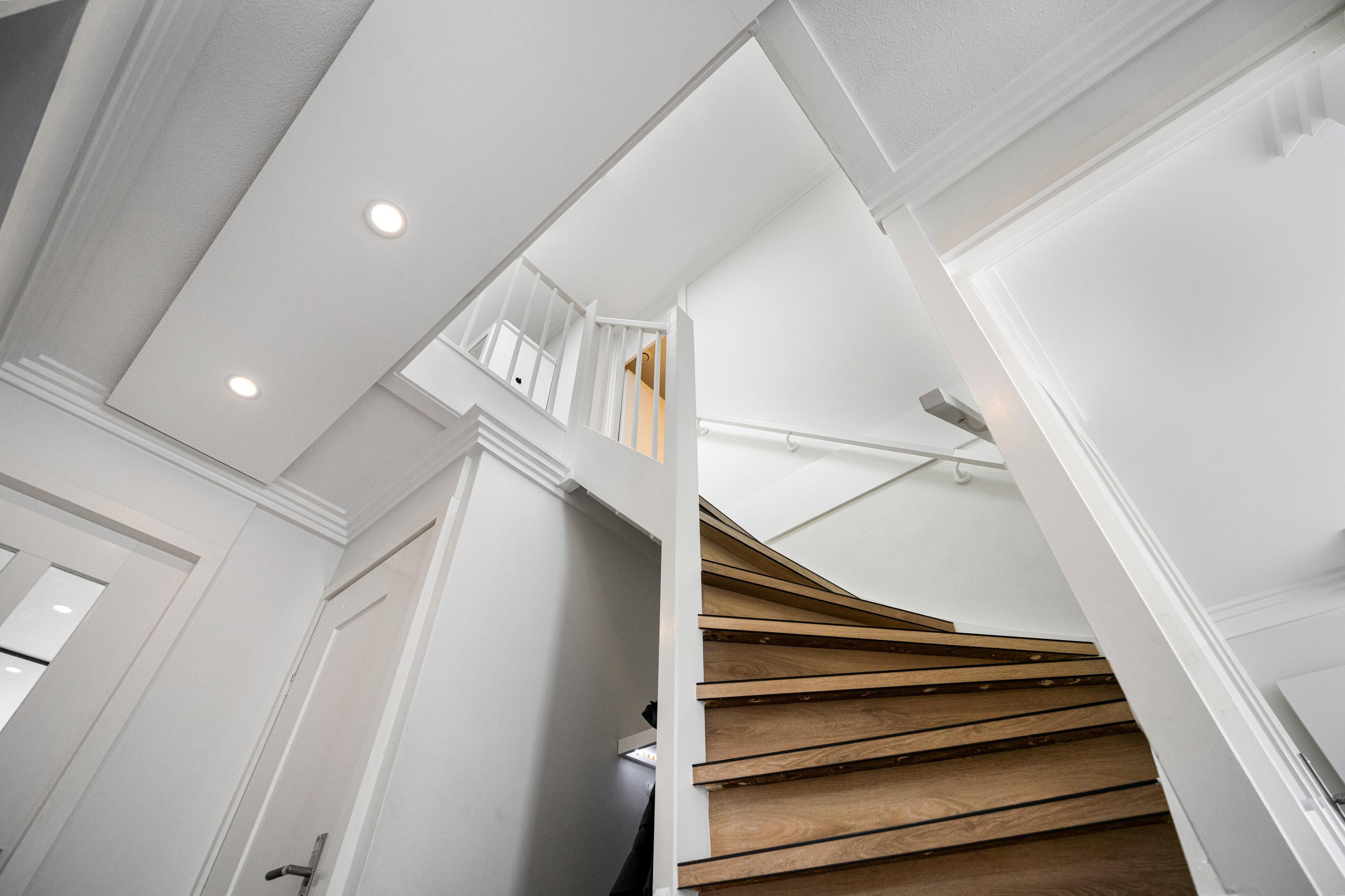De moderne badkamer is uitgerust met een douche en een dubbele wastafel met stijlvolle zwarte kranen. Daarnaast beschikt deze verdieping over een separate toiletruimte en een praktische inloopkast met toegang tot de dakopbouw op de tweede verdieping. Indien gewenst is hier een extra slaapkamer te realiseren.