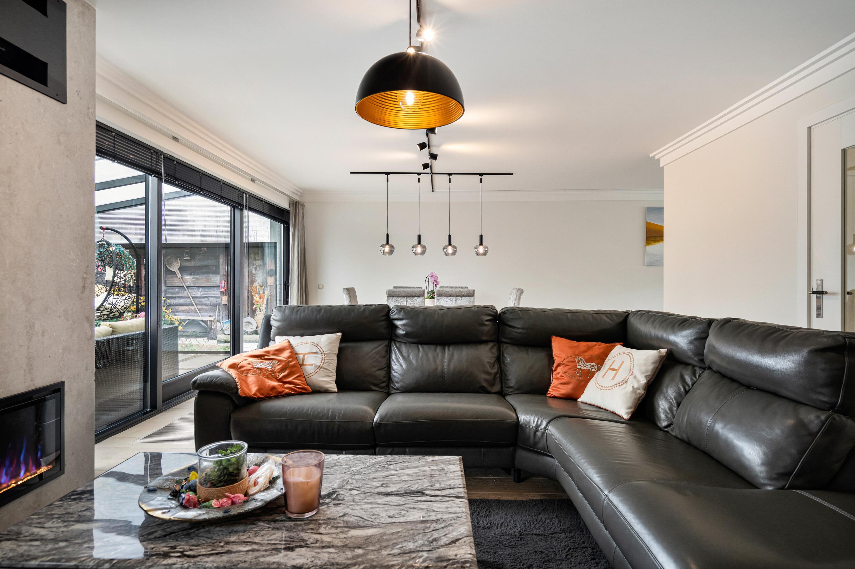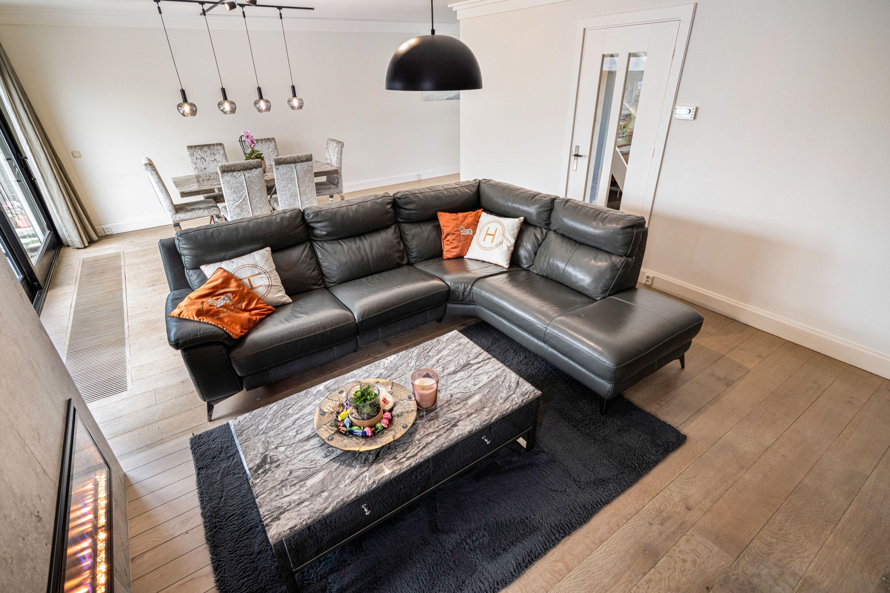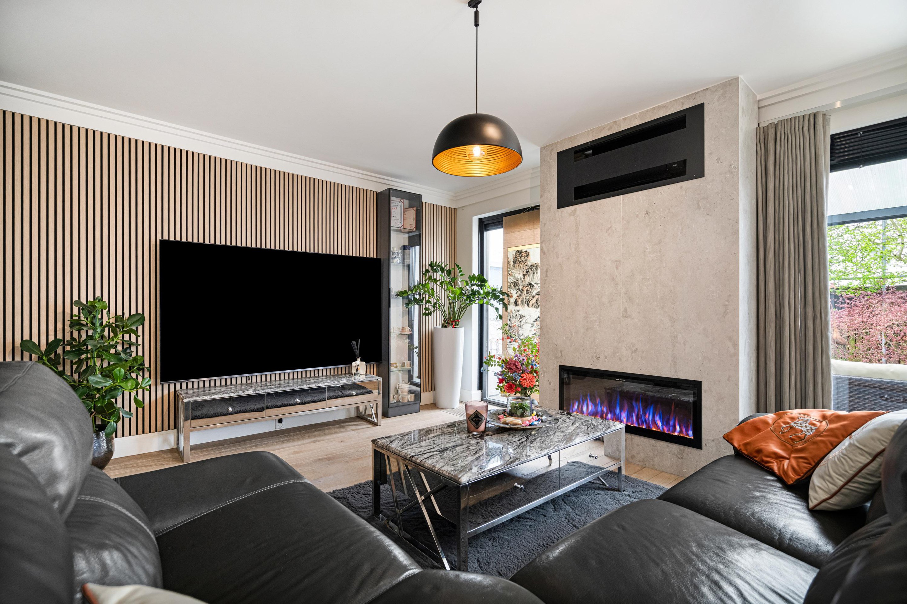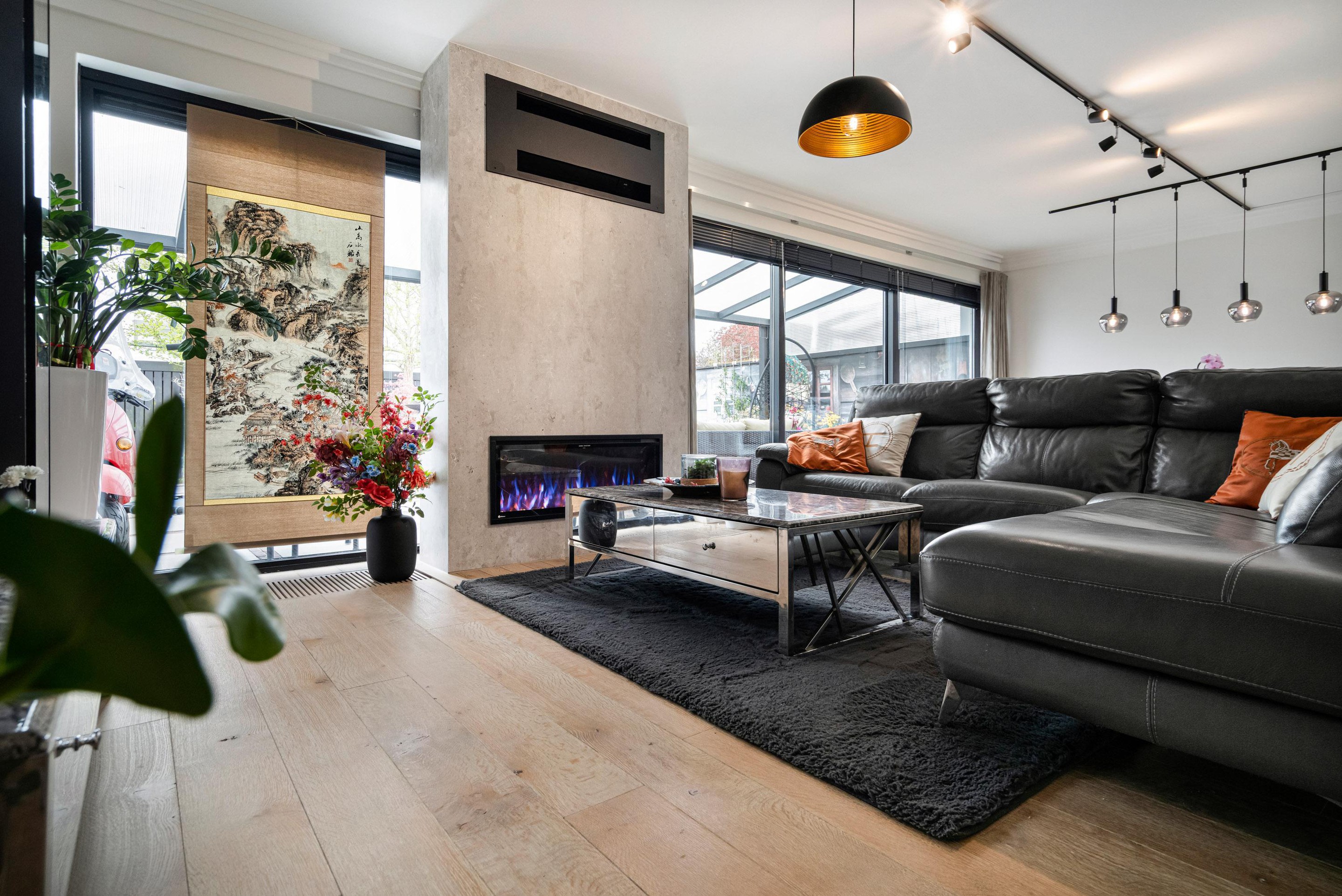 De royale woonkamer van maar liefst 7,82 meter breed is heerlijk licht dankzij de grote raampartijen aan de achterzijde. De ruimte is voorzien van een sfeervolle haard, een fraaie vloerafwerking en biedt via de schuifpui toegang tot de ruime achtertuin.