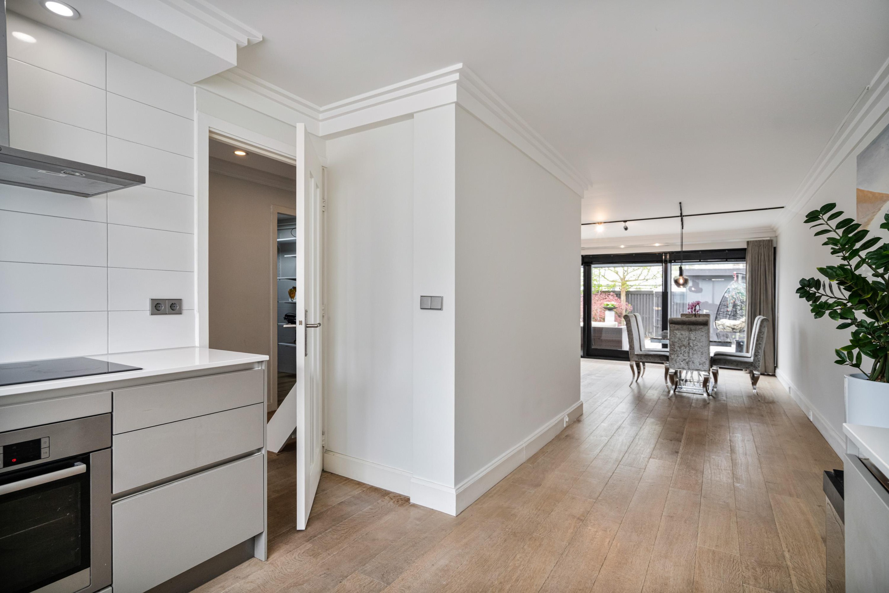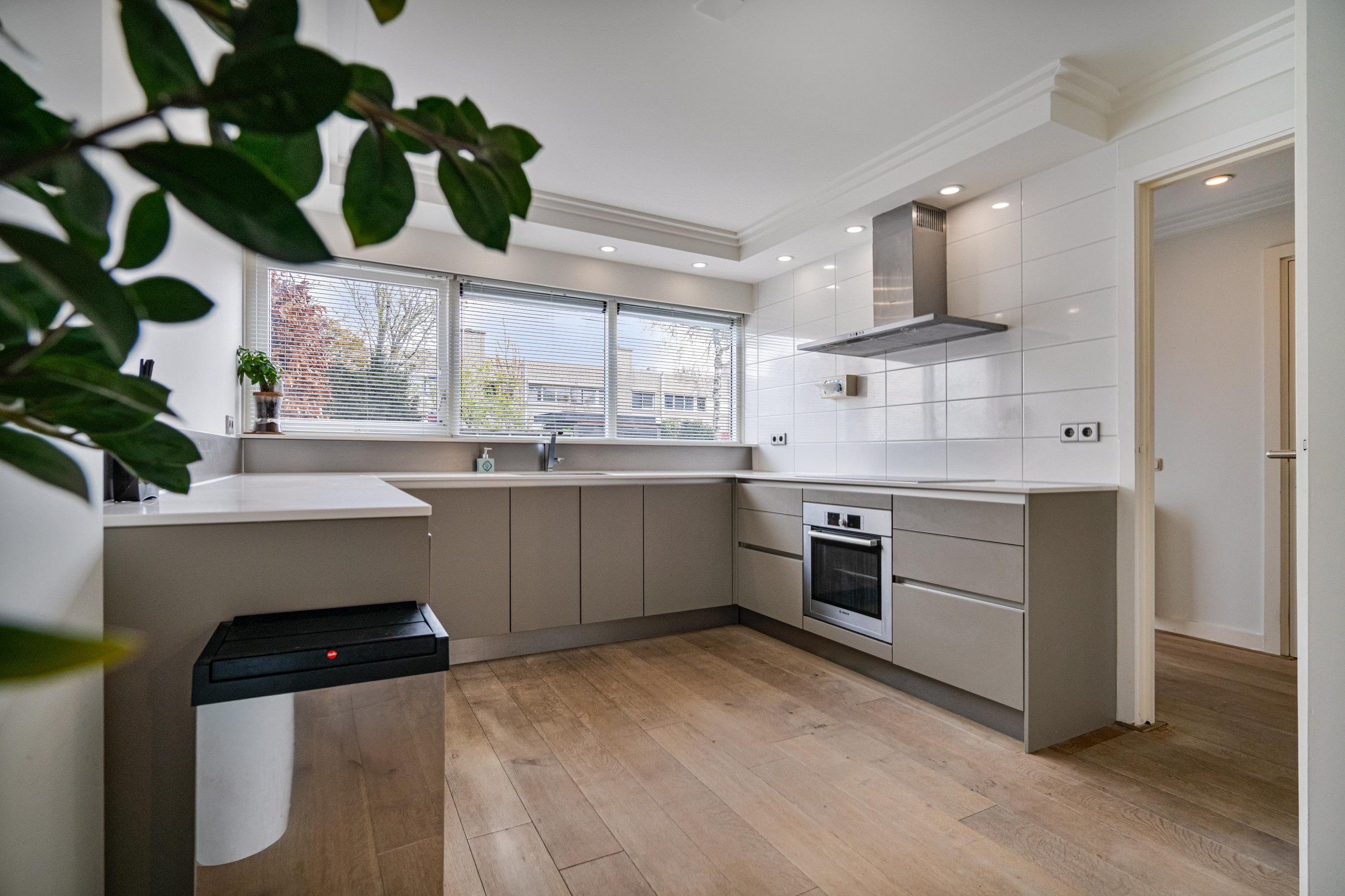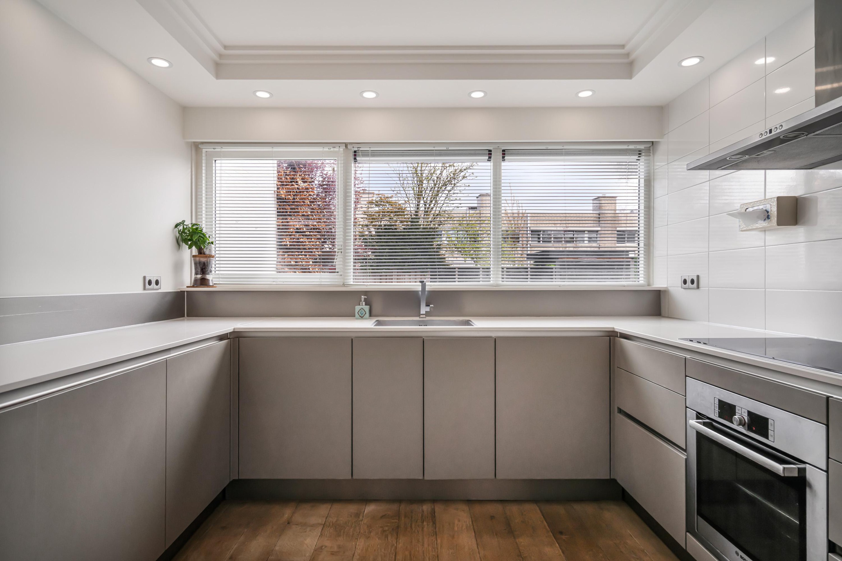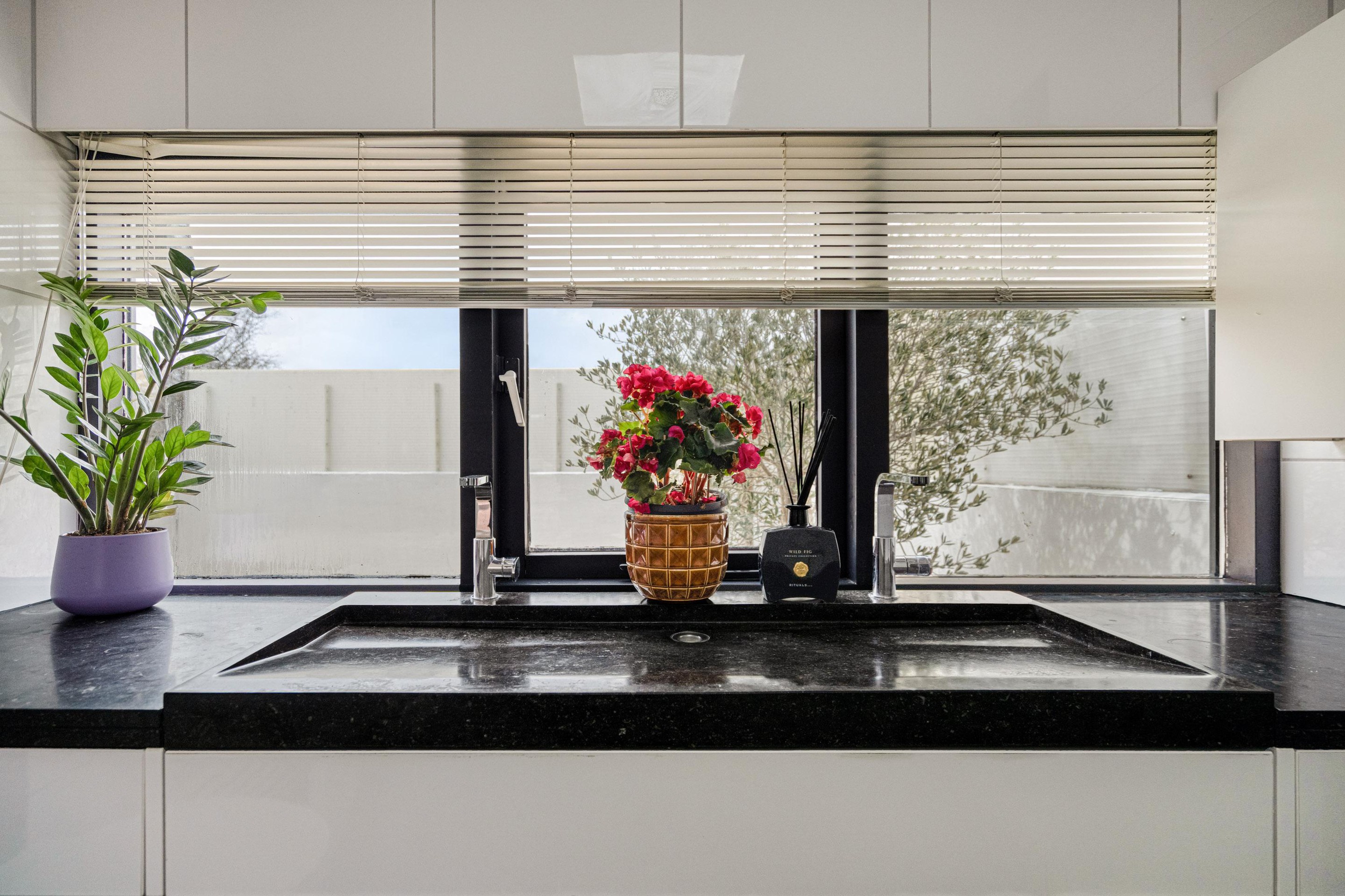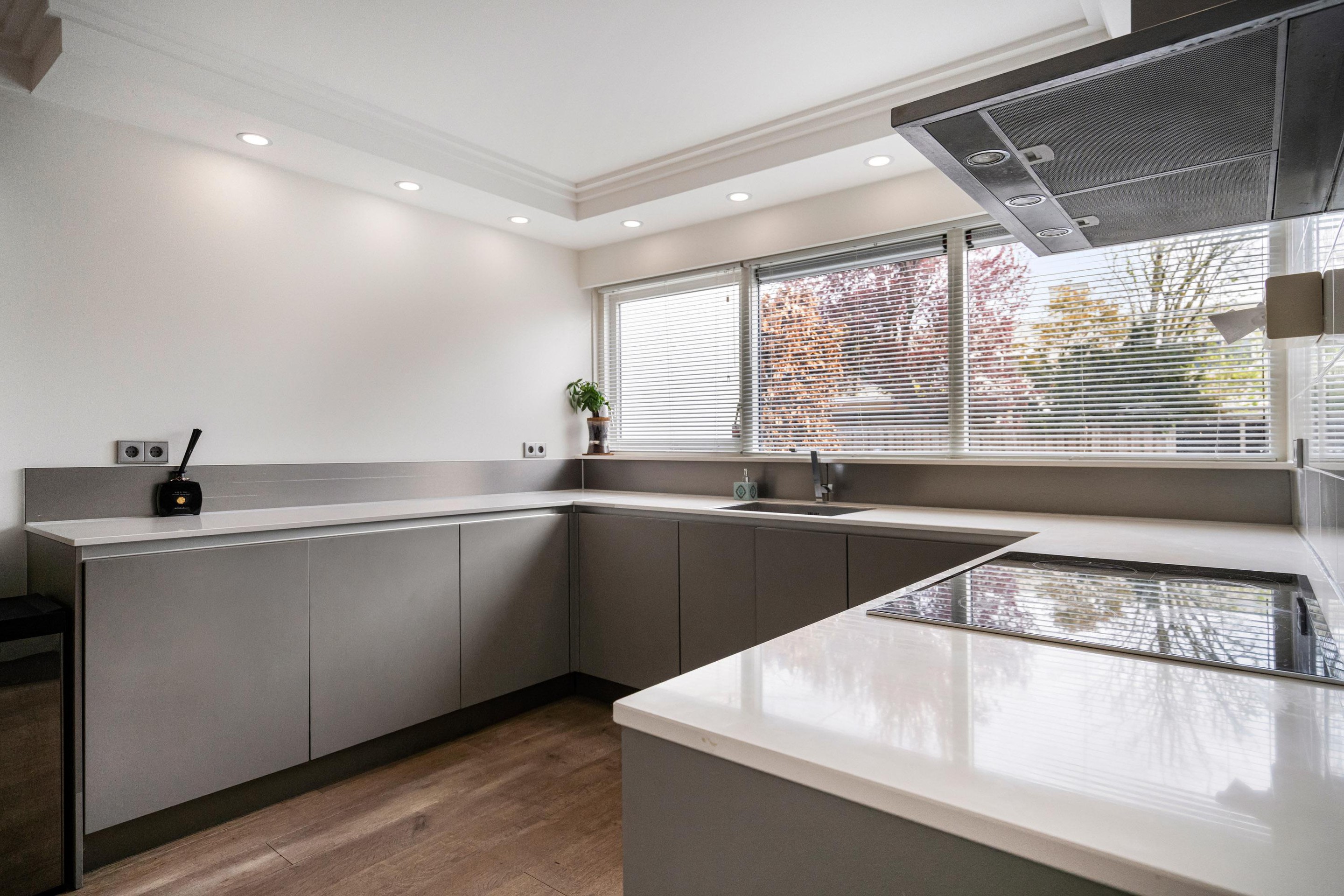 De keuken bevindt zich aan de voorzijde van de woning en is uitgevoerd in een neutrale kleurstelling. Deze is voorzien van diverse inbouwapparatuur en straalt dankzij de strakke afwerking rust en ruimte uit – een fijne plek om te koken.