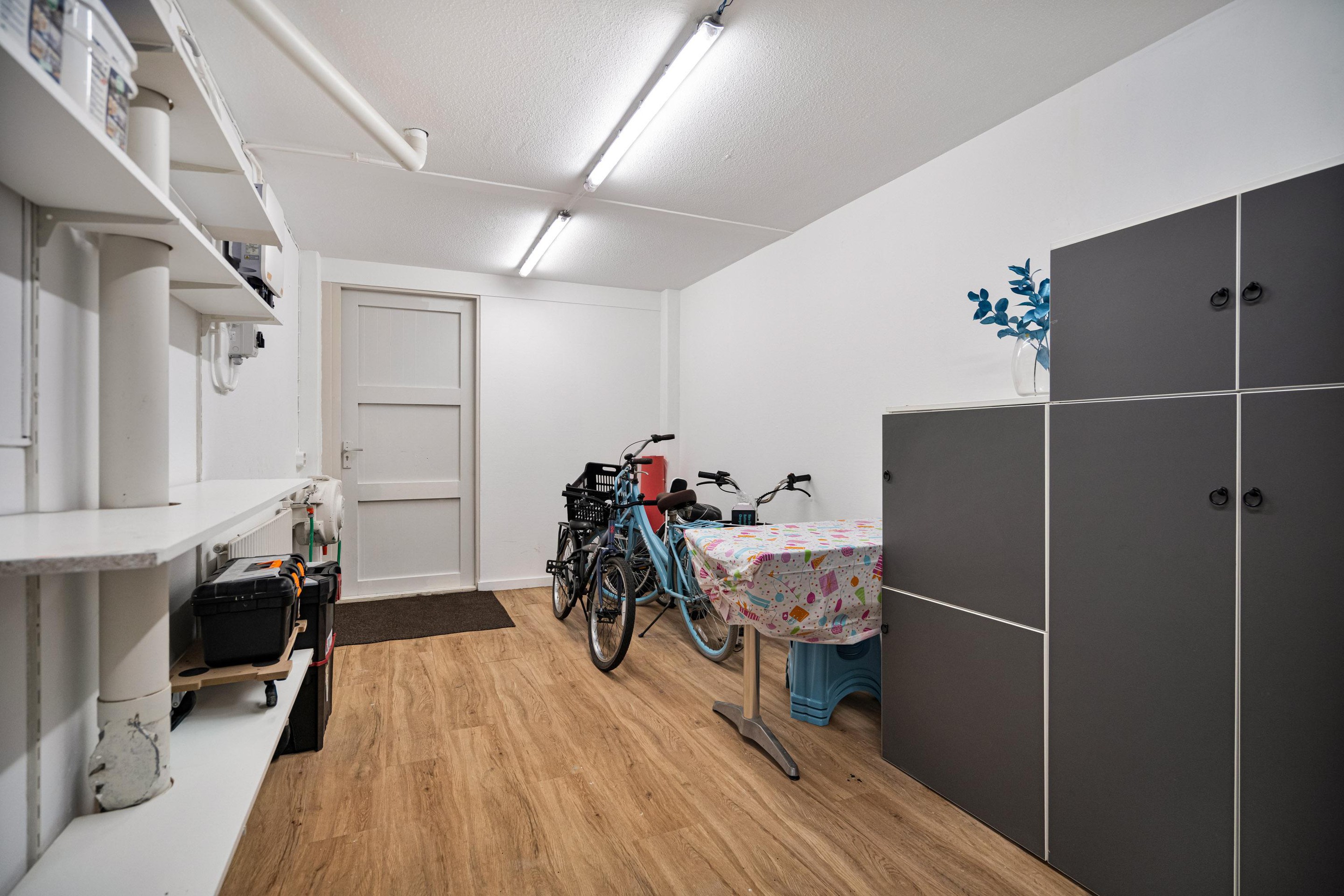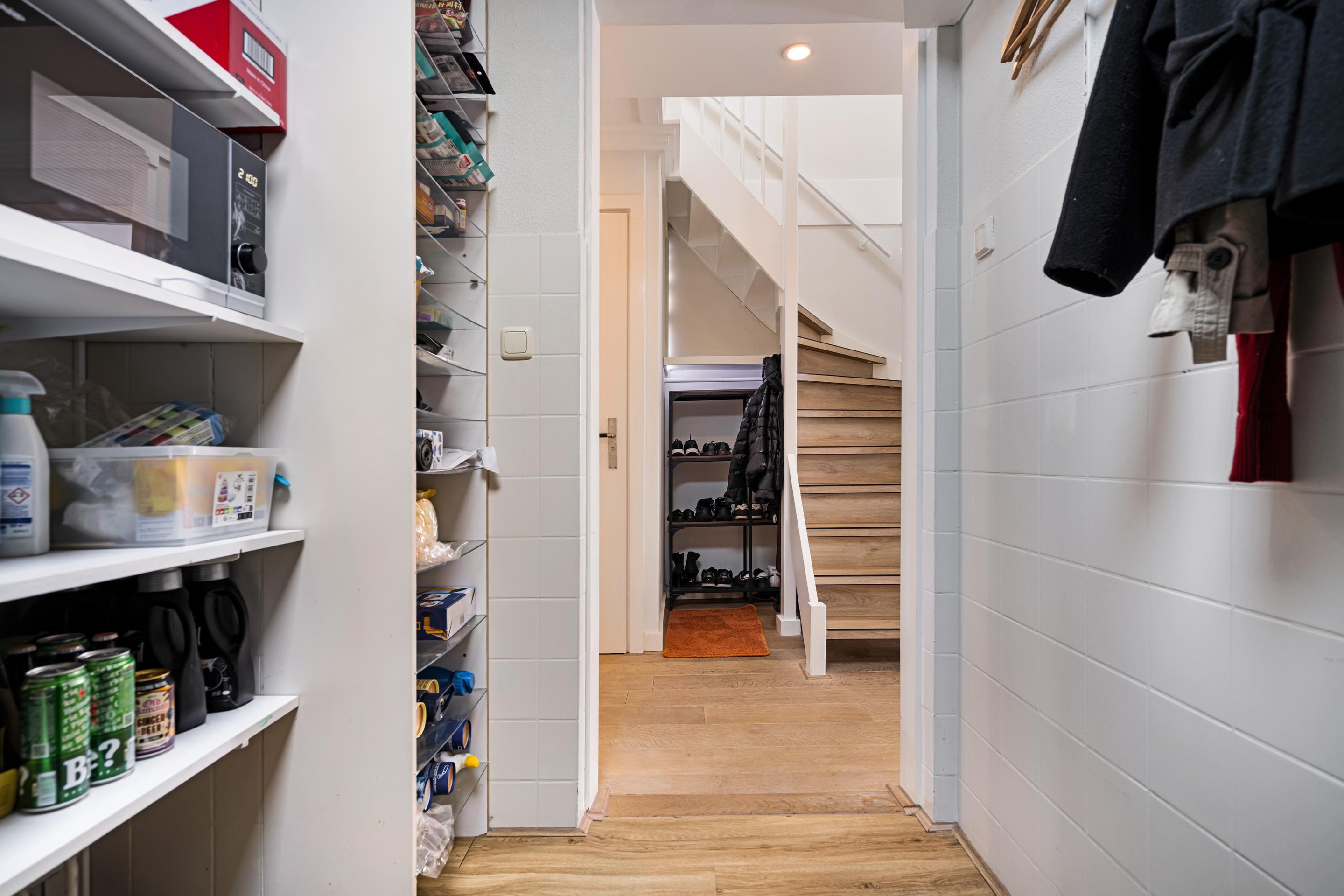 In de hal bevinden zich de meterkast en de toegang tot de ruime berging, welke ook via de voortuin bereikbaar is. Hier tref je tevens de omvormer voor de zonnepanelen.