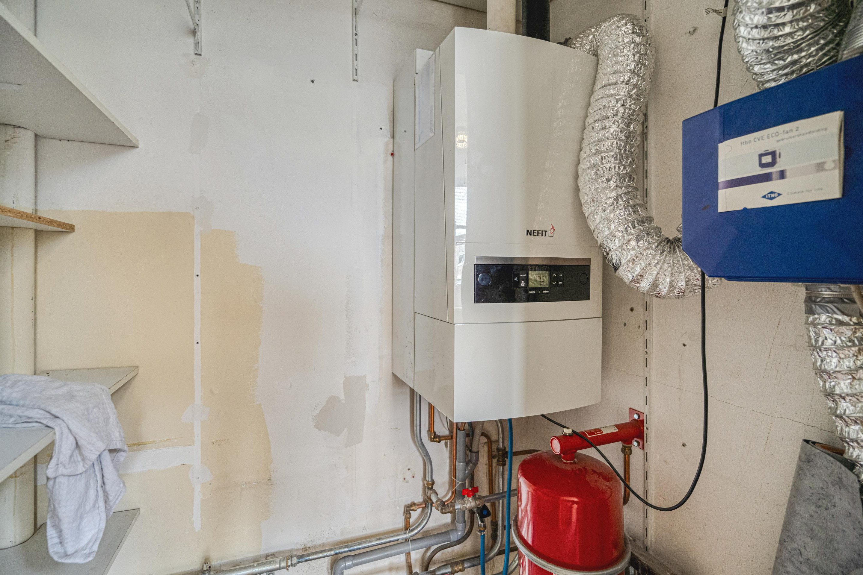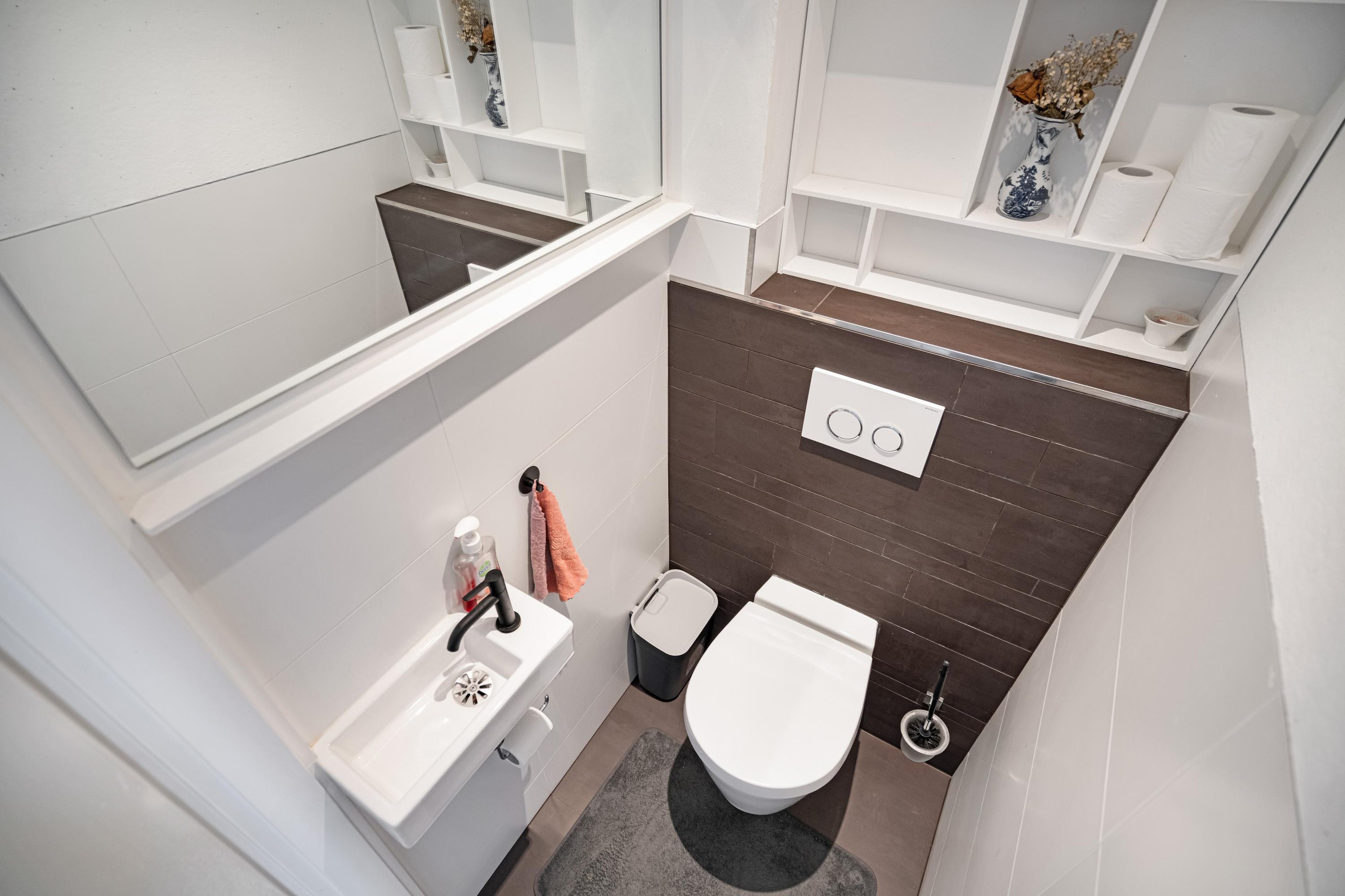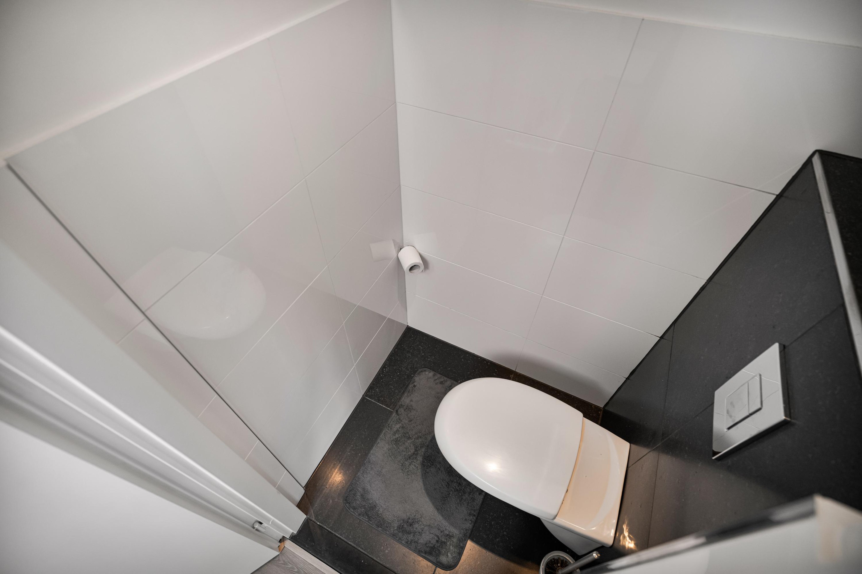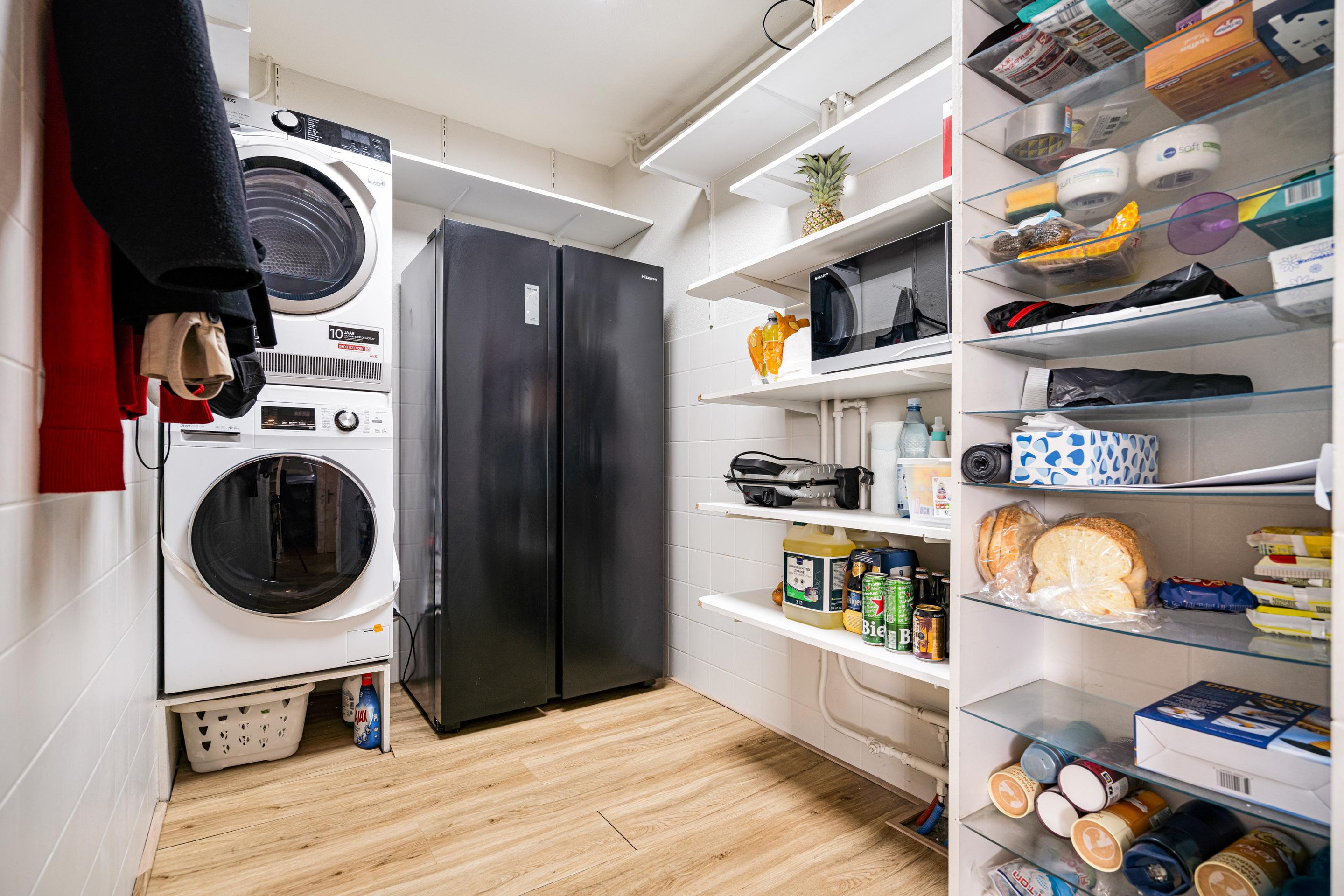 De bijkeuken biedt ruimte voor de wasmachine en droger en voldoende opbergmogelijkheden. Het toilet is modern uitgevoerd, zwevend en voorzien van een fonteintje.