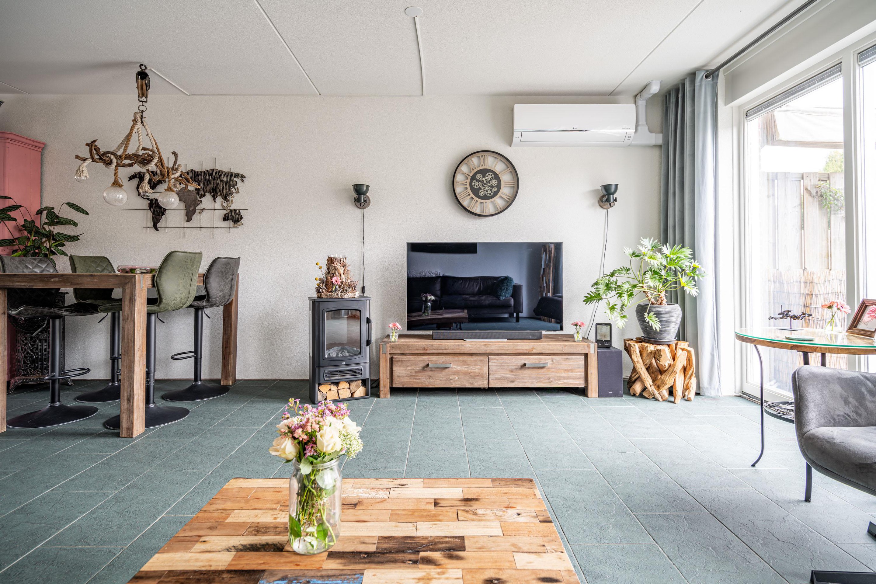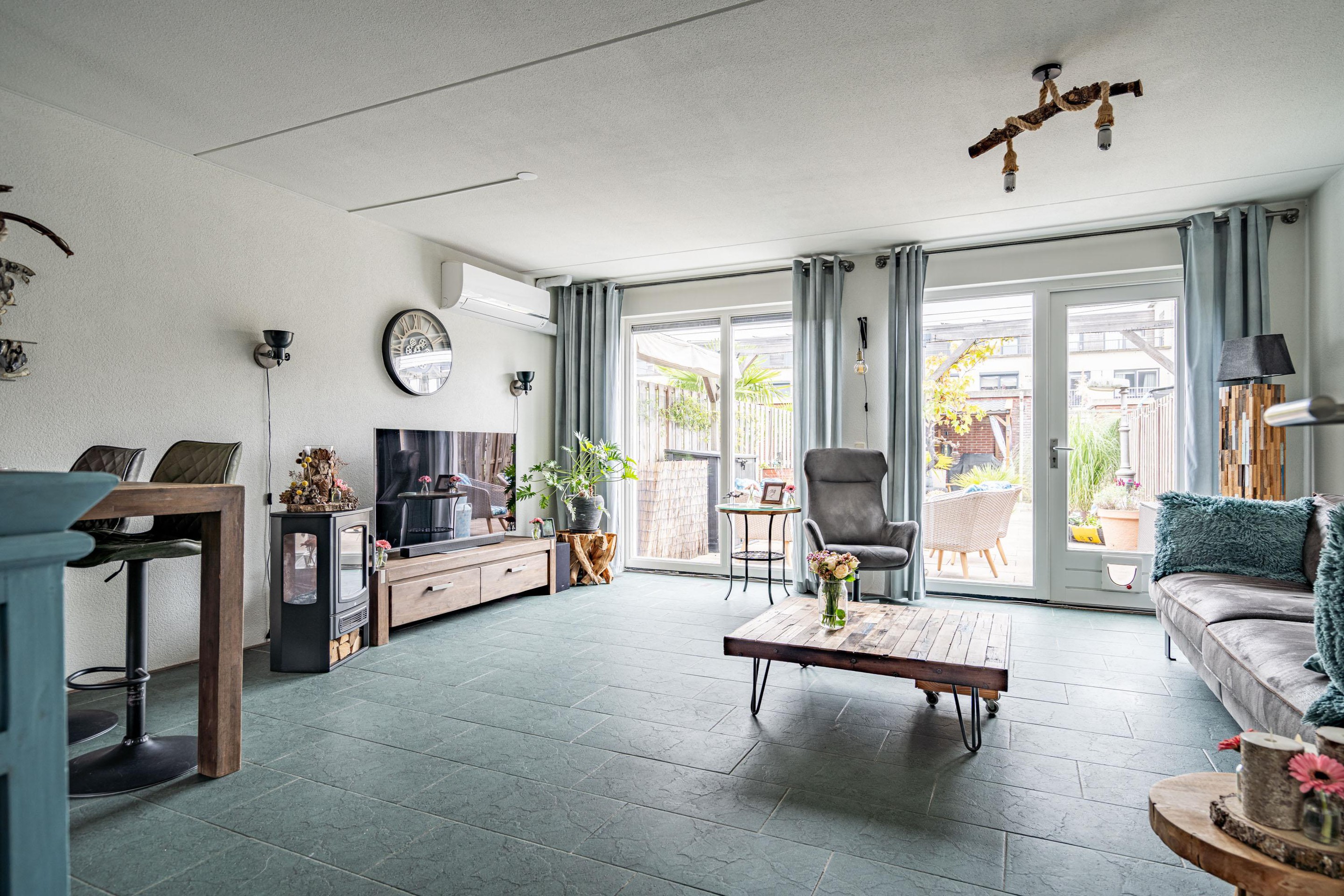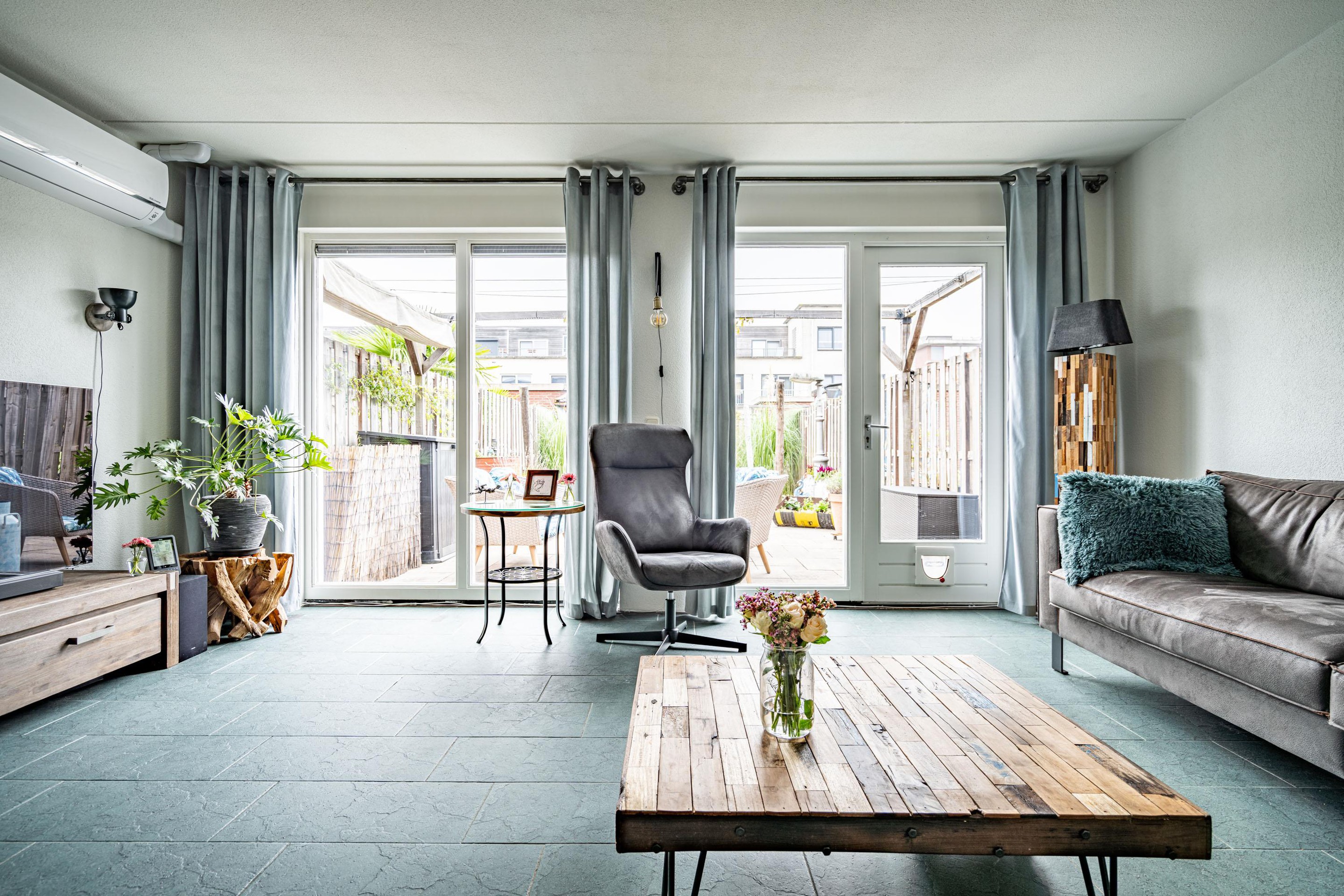 Via de hal, met toegang tot het toilet, de trapopgang en de meterkast, bereikt u de ruime en lichte woonkamer. Grote raampartijen zorgen voor een prettige lichtinval en bieden uitzicht op zowel de voor- als achtertuin. Dankzij de aanwezige airconditioning en de vloerverwarming geniet u hier het hele jaar door van een aangenaam binnenklimaat.