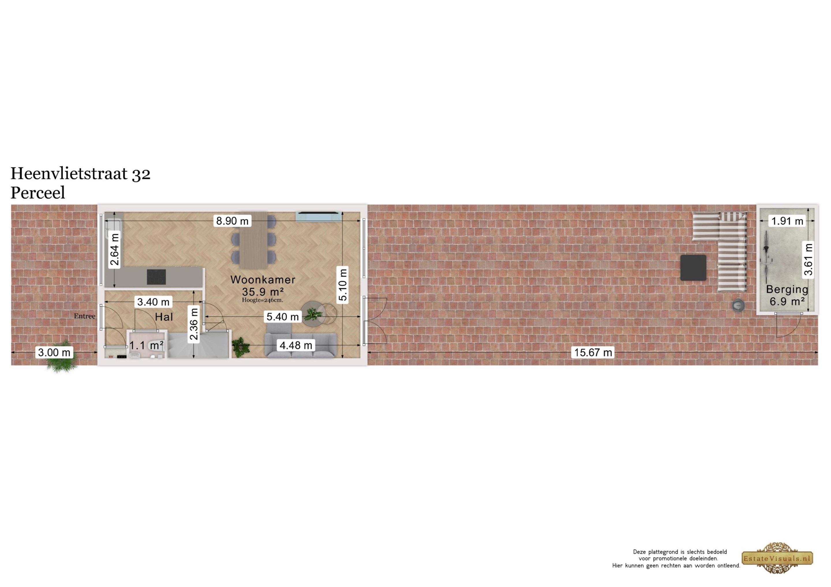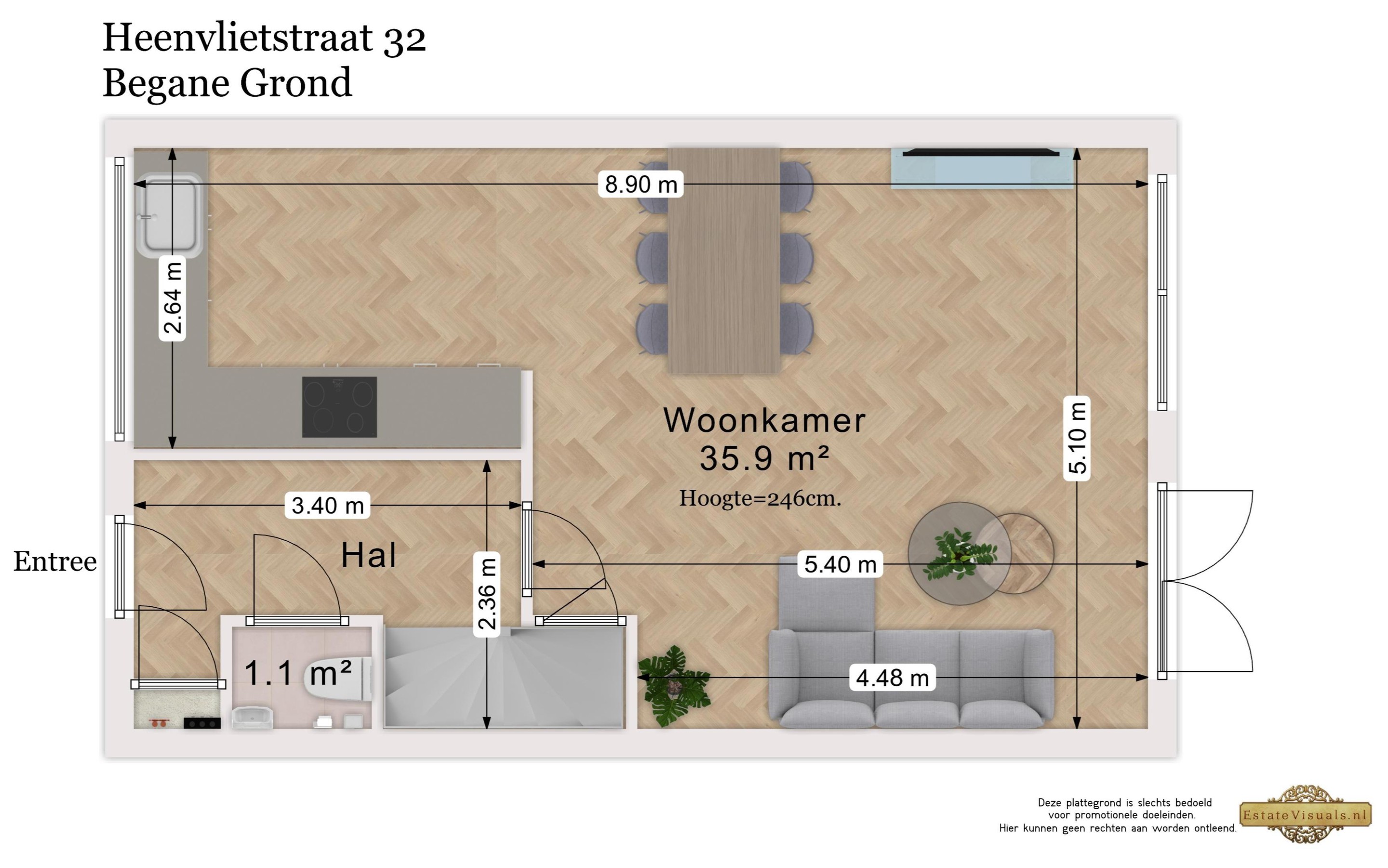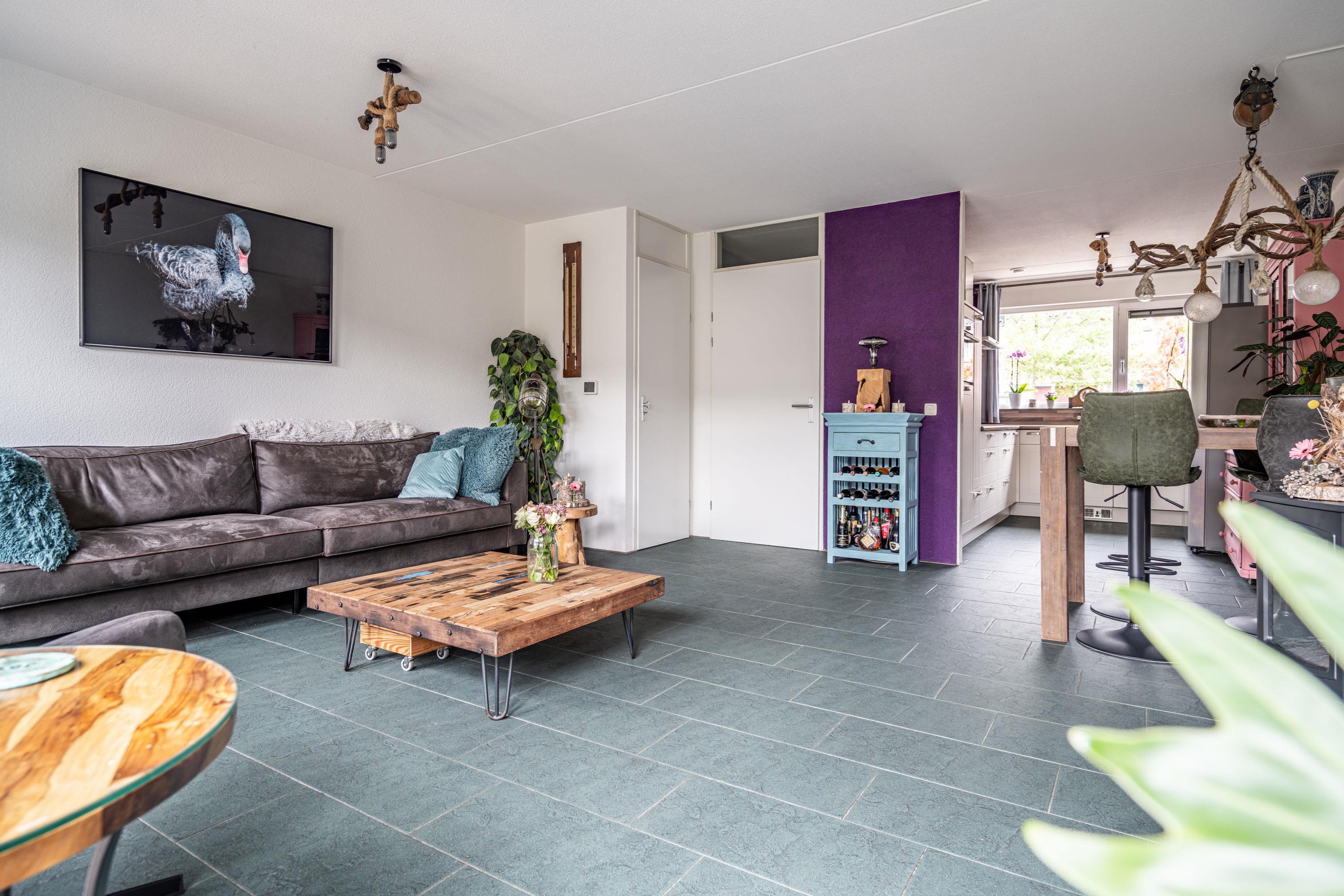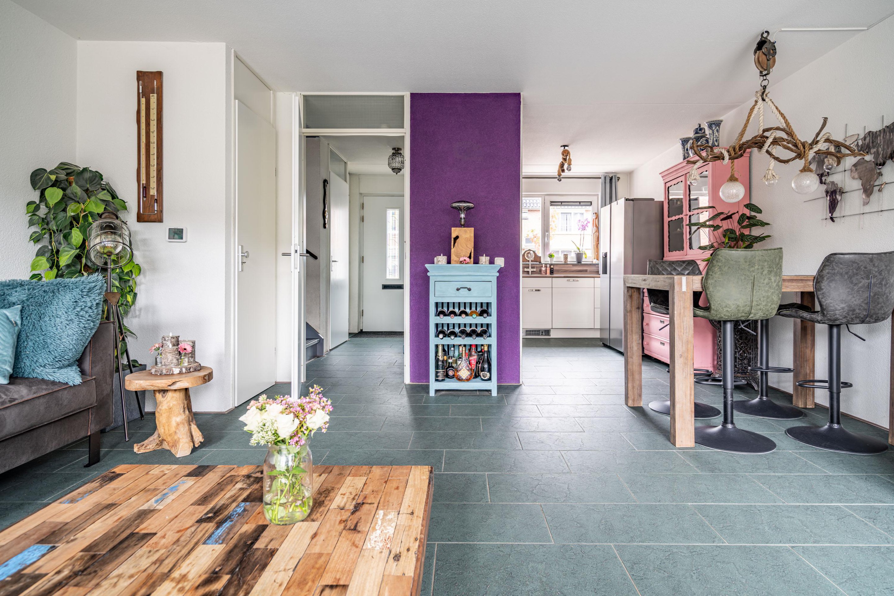 Via de hal, met toegang tot het toilet, de trapopgang en de meterkast, bereikt u de ruime en lichte woonkamer. Grote raampartijen zorgen voor een prettige lichtinval en bieden uitzicht op zowel de voor- als achtertuin. Dankzij de aanwezige airconditioning en de vloerverwarming geniet u hier het hele jaar door van een aangenaam binnenklimaat.