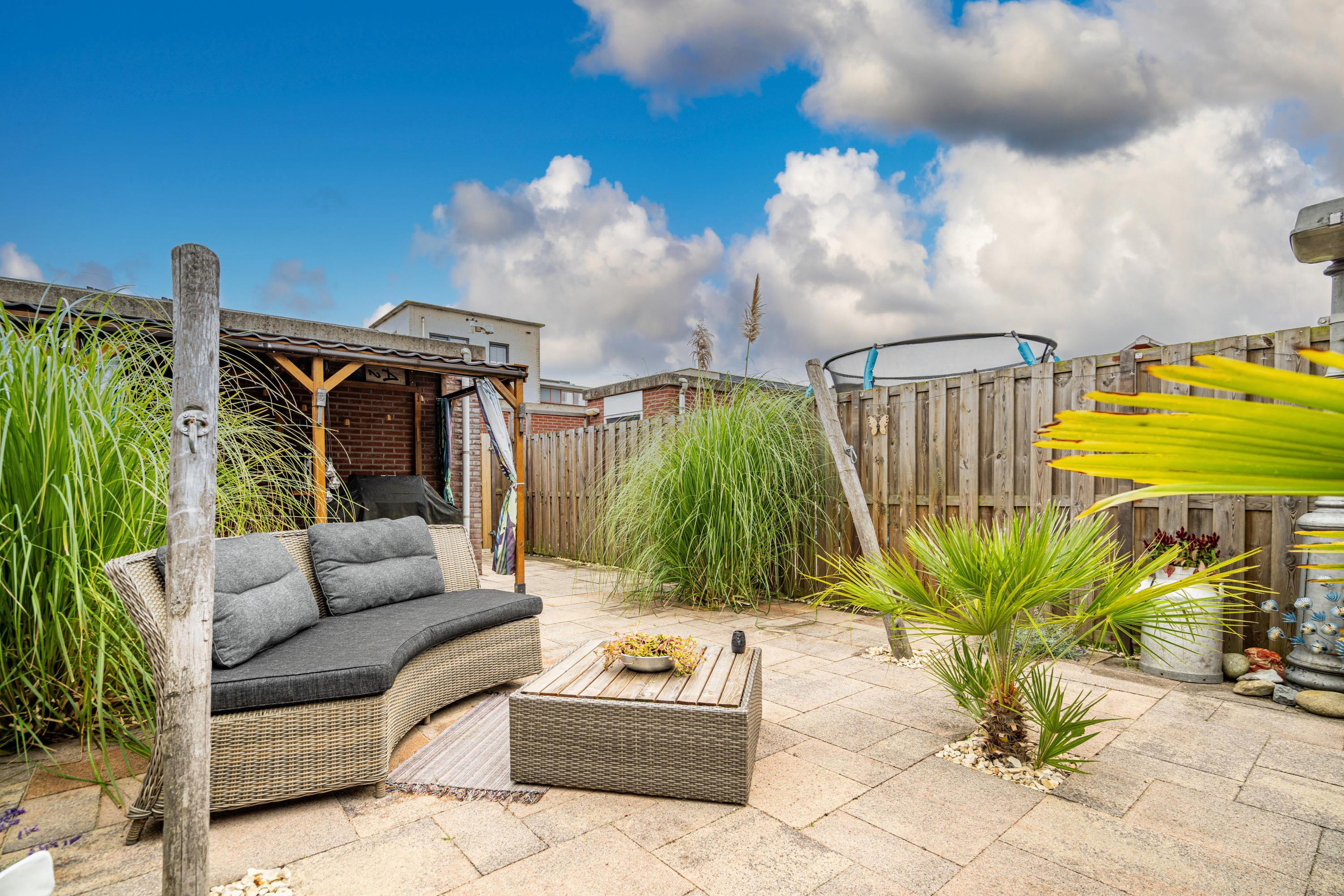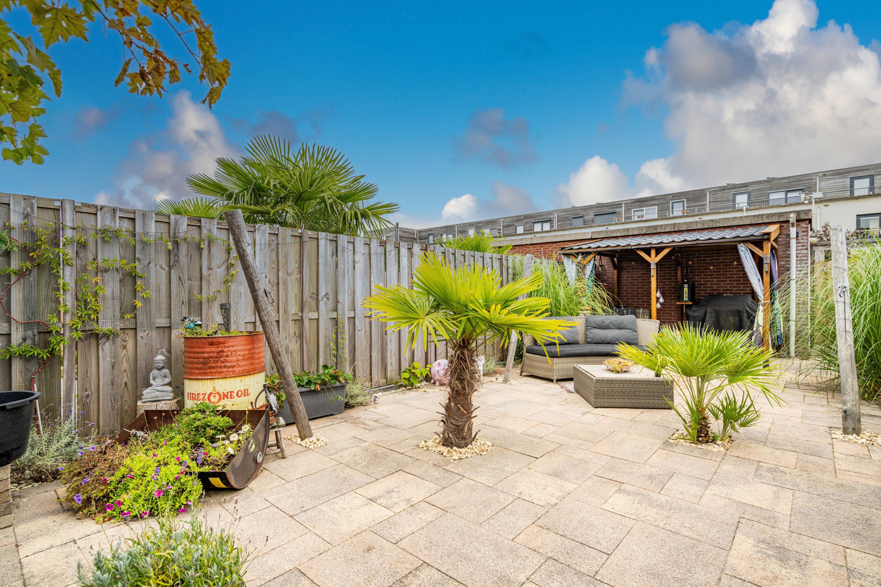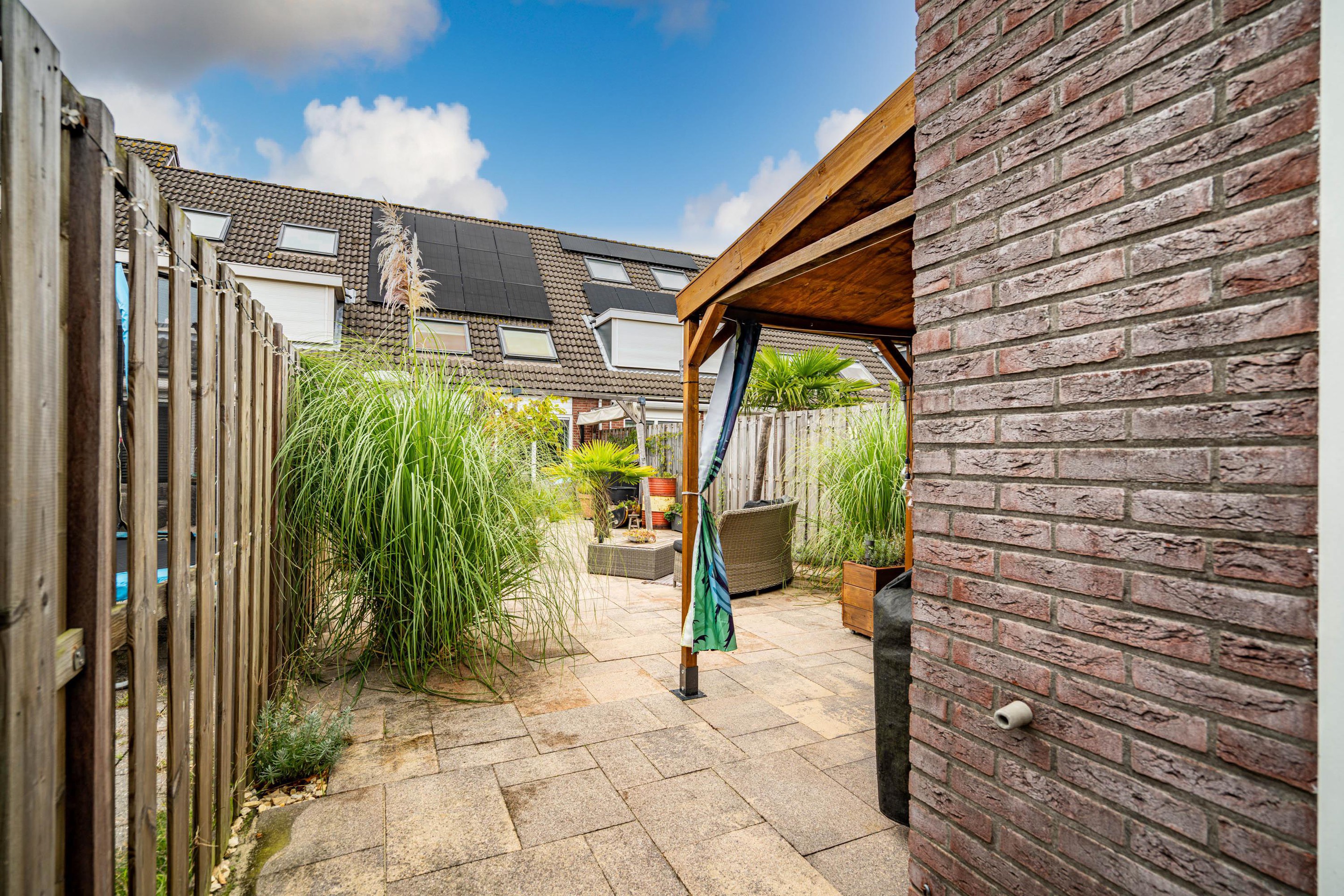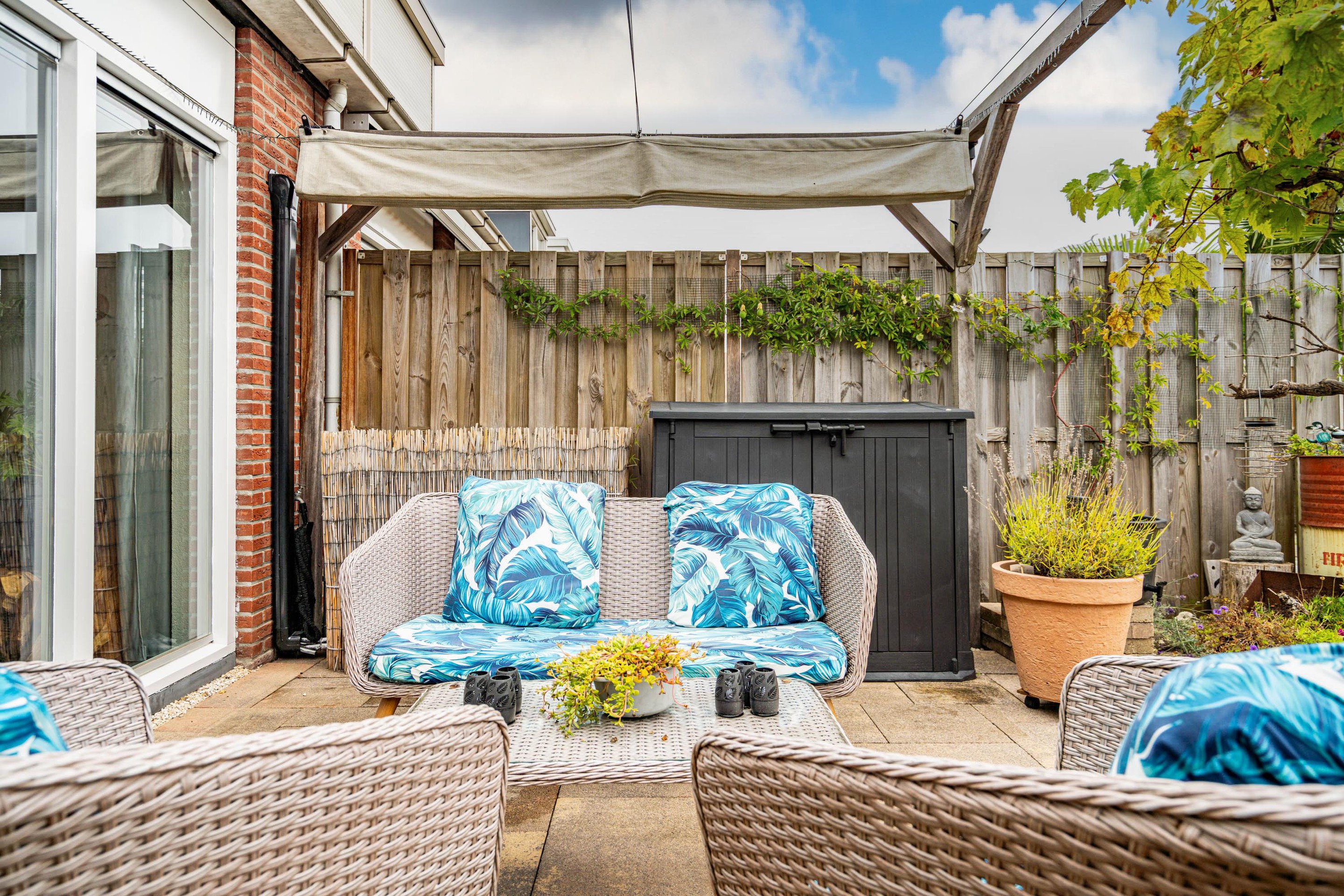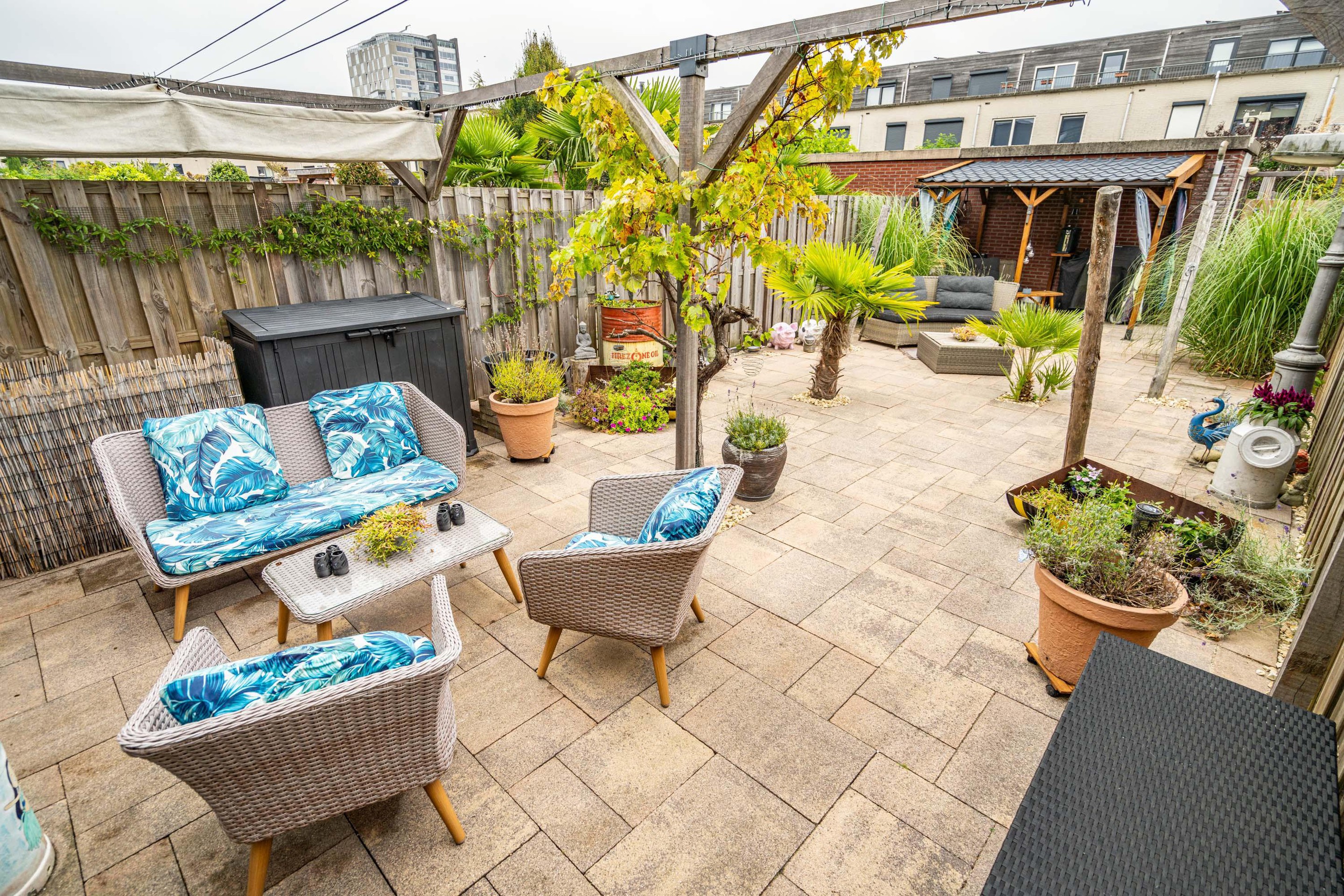 De achtertuin is een heerlijke plek om te ontspannen. Dankzij het schaduwdoek en de overkapping aan de achterzijde heeft u op warme dagen altijd een koel plekje. Verder beschikt de tuin over een praktische berging en een achterom.