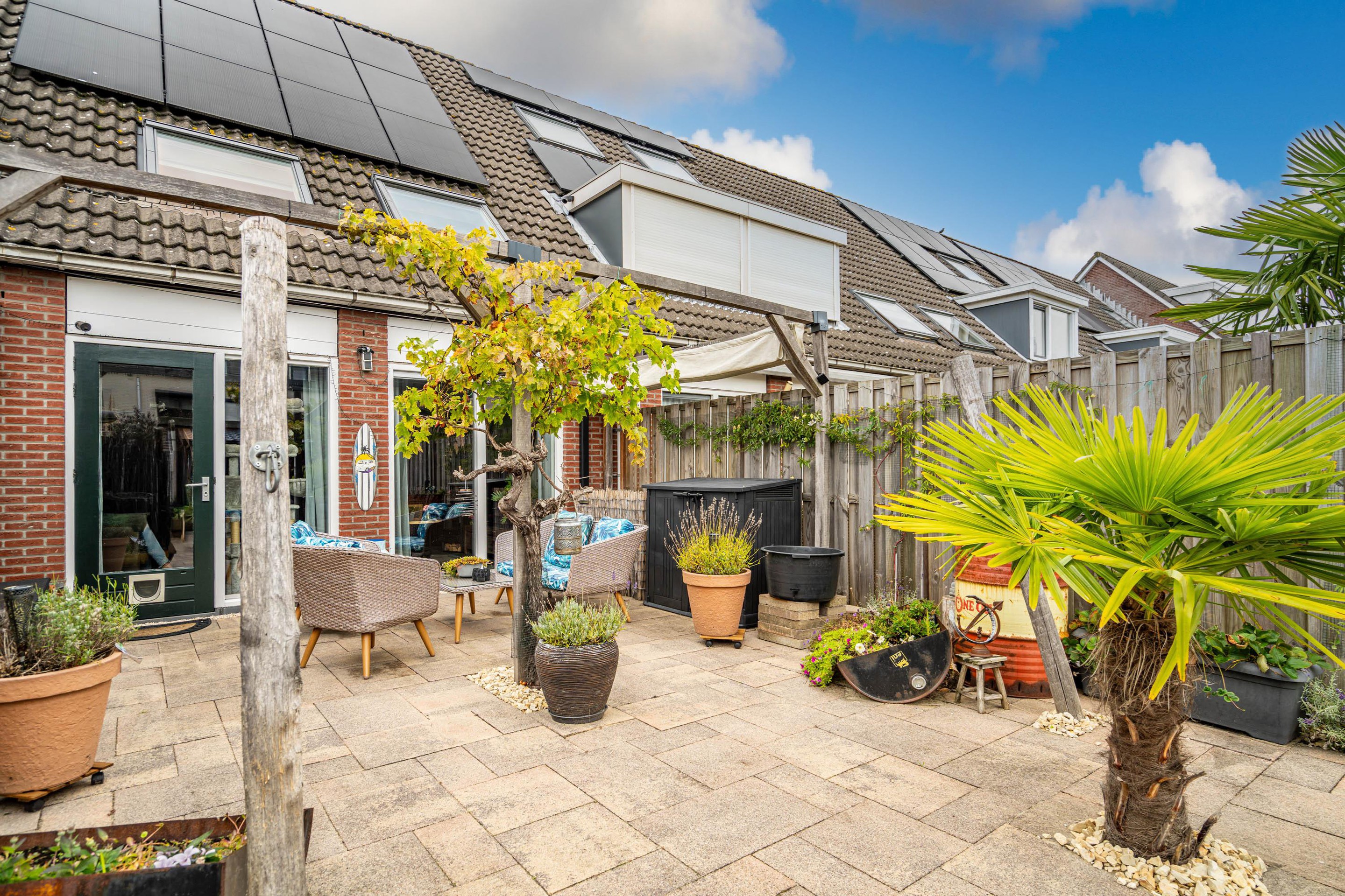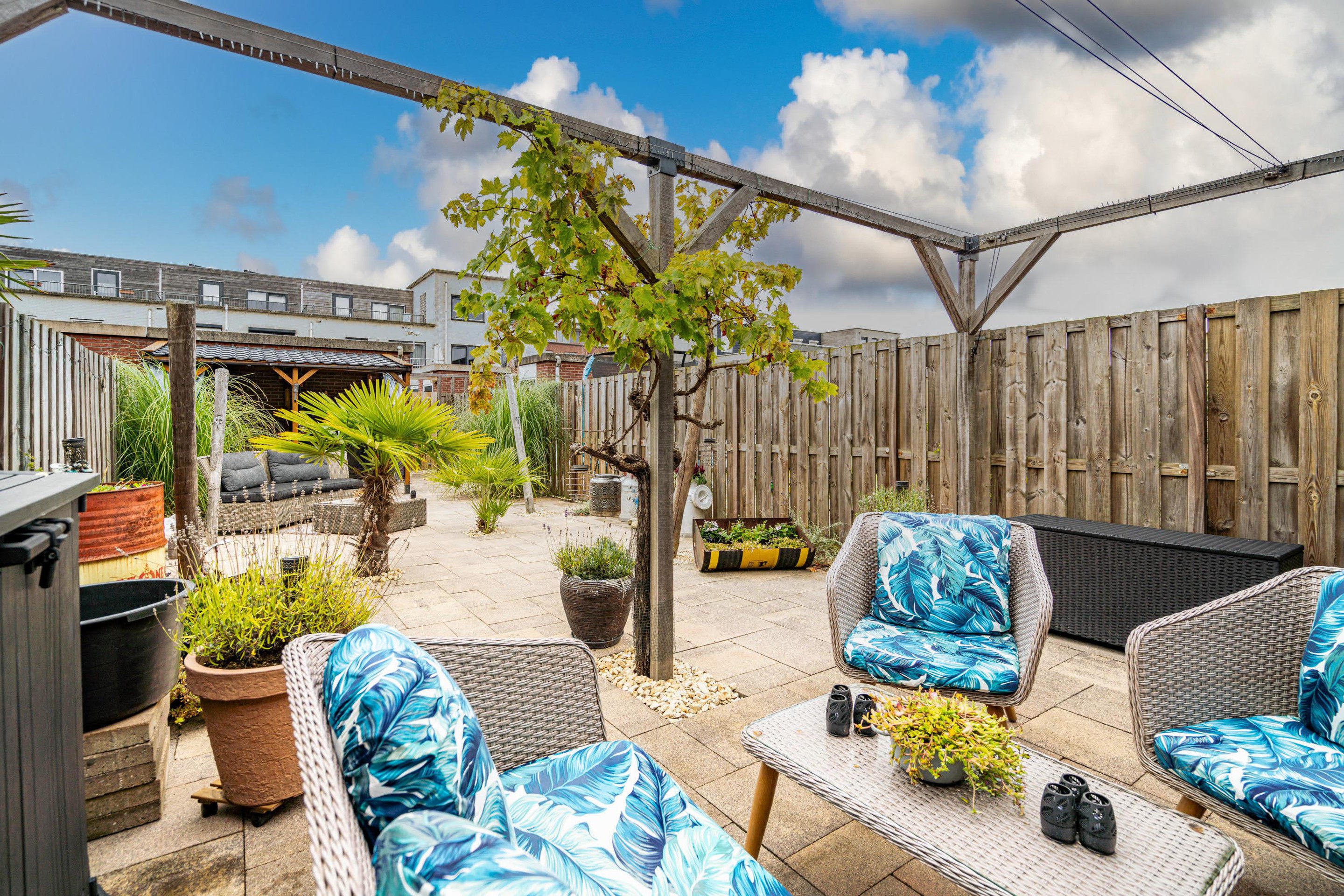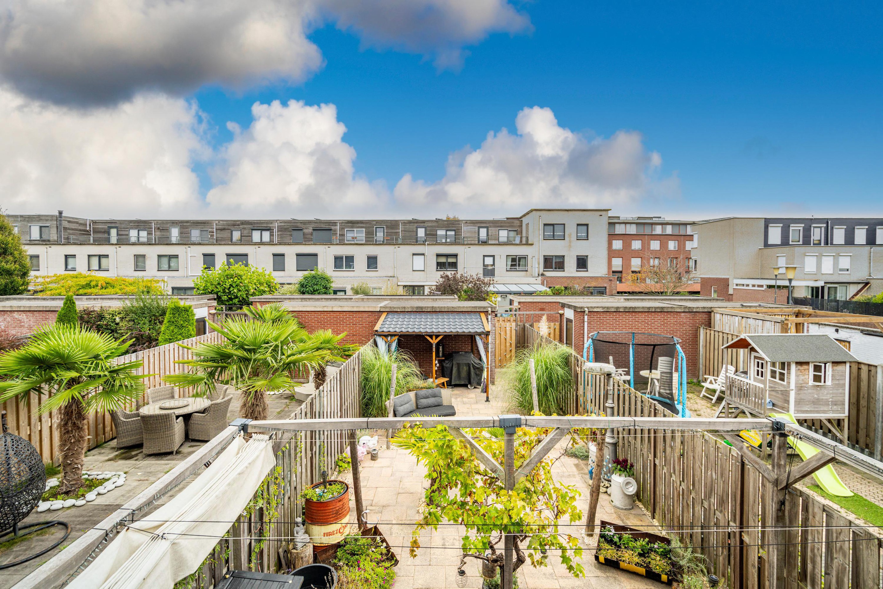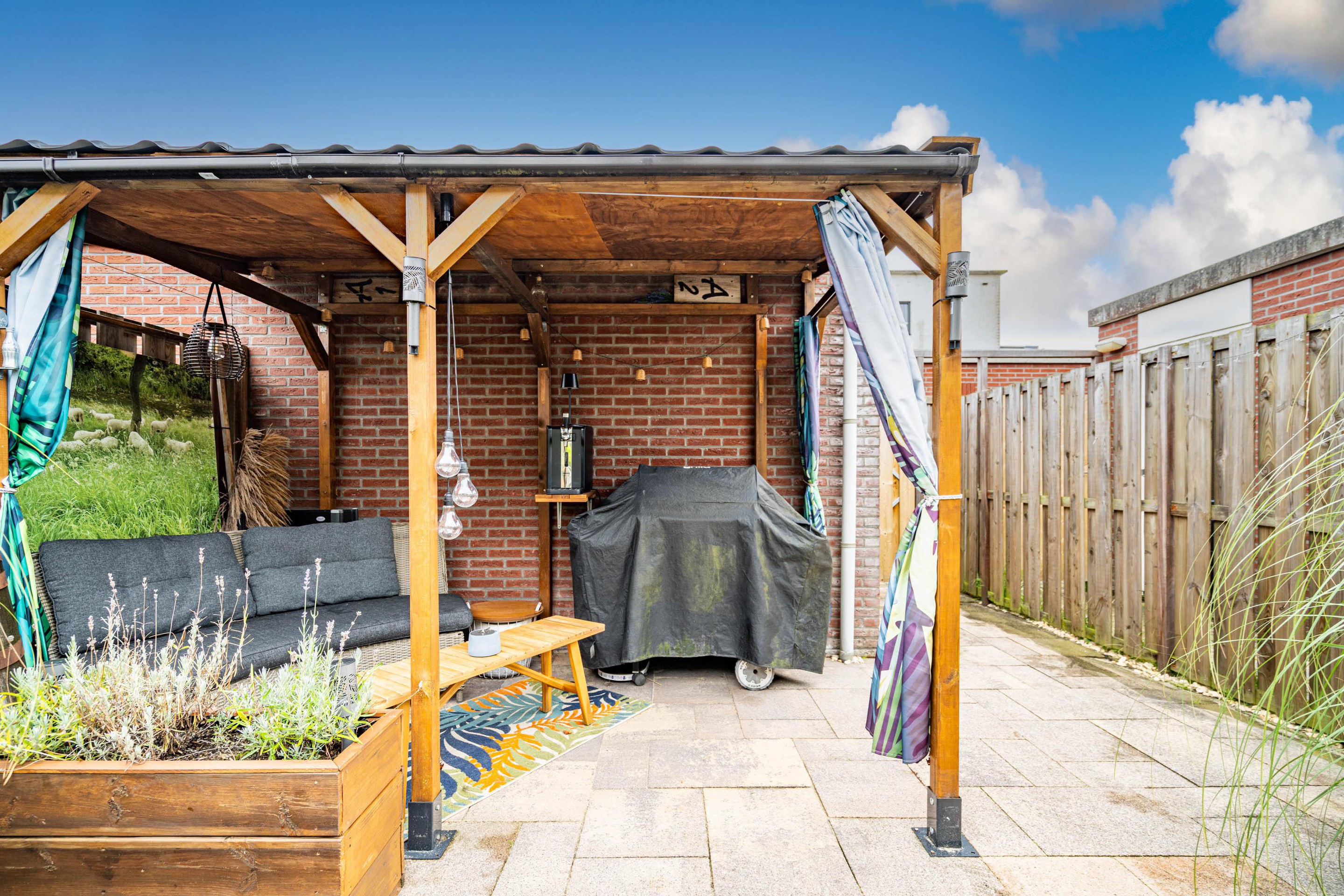 De achtertuin is een heerlijke plek om te ontspannen. Dankzij het schaduwdoek en de overkapping aan de achterzijde heeft u op warme dagen altijd een koel plekje. Verder beschikt de tuin over een praktische berging en een achterom.