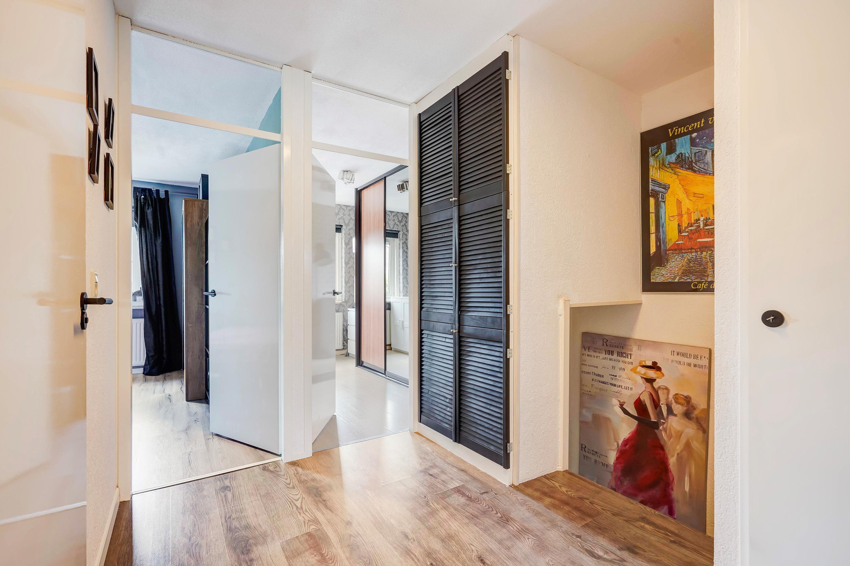 De eerste verdieping is zeer ruim opgezet met aan de voor-en achterzijde twee masterbedrooms maar ook de overige 2 kamers zijn prima formaat.de badkamer is eveneens keurig onderhouden en v.v. douche, toilet, dubbel wastafelmeubel, mechanische ventilatie en handdoekradiator. Op de overloop treft u een berging alwaar opstelplaats cv combi ketel en een tweede berging.