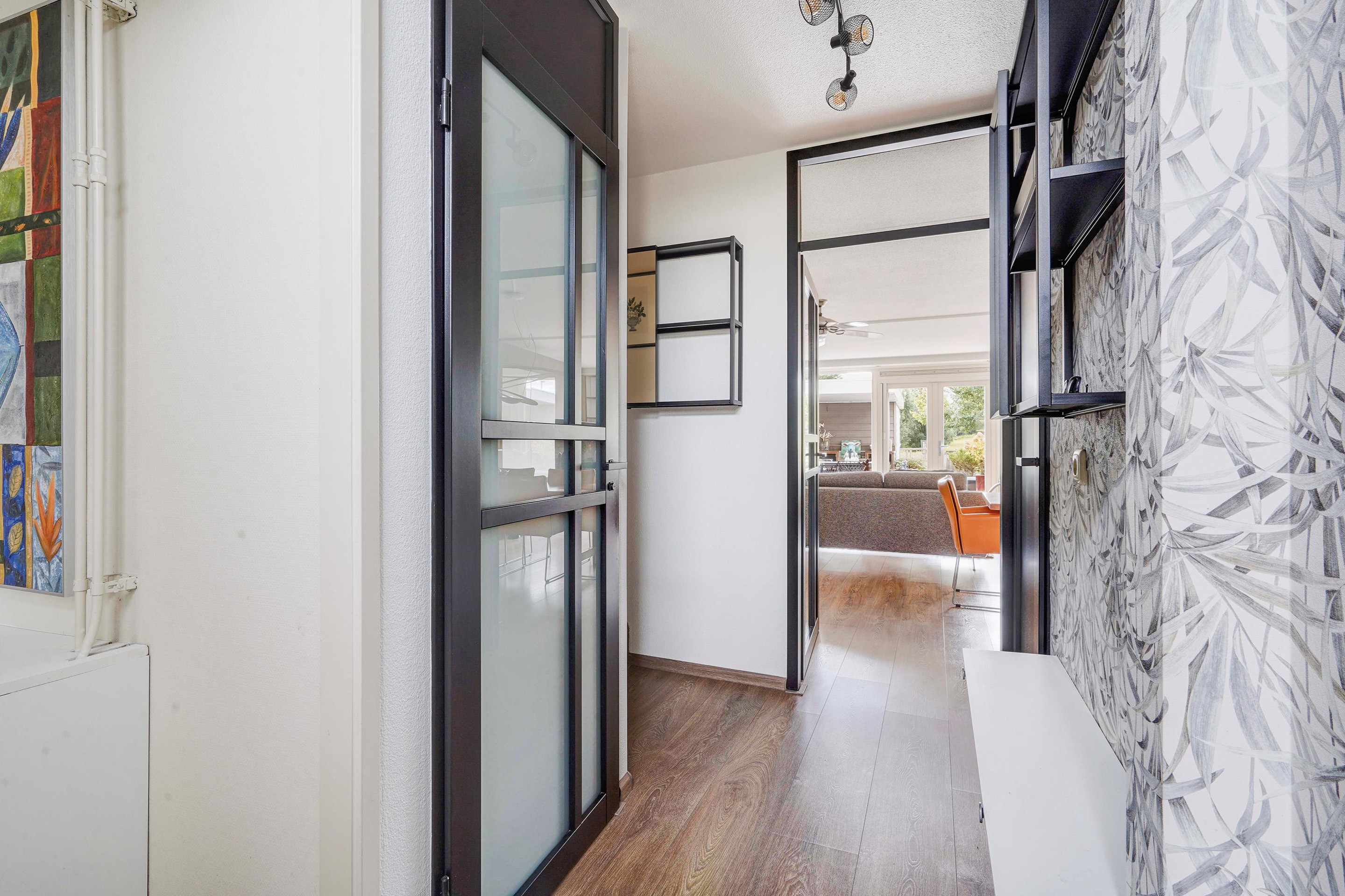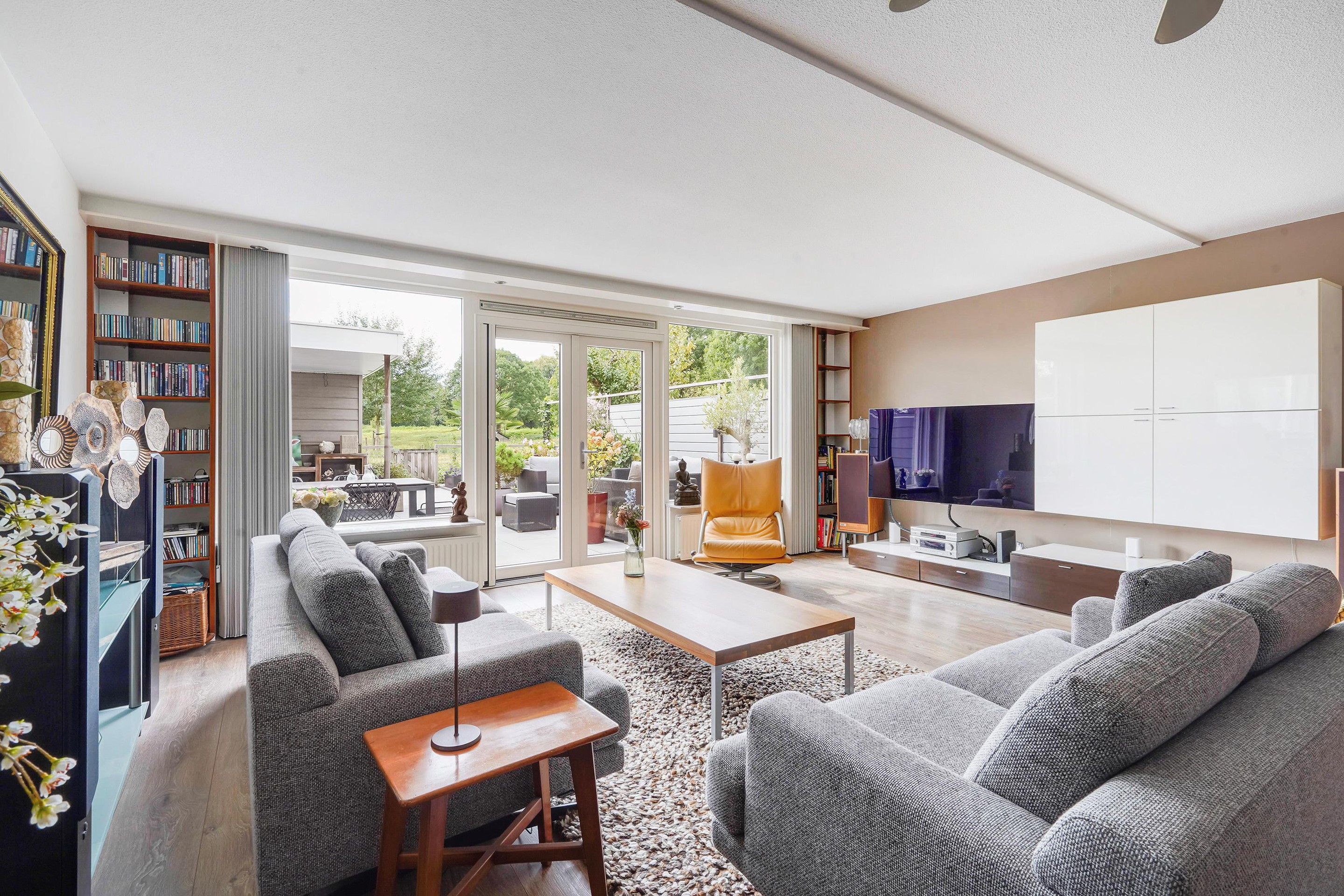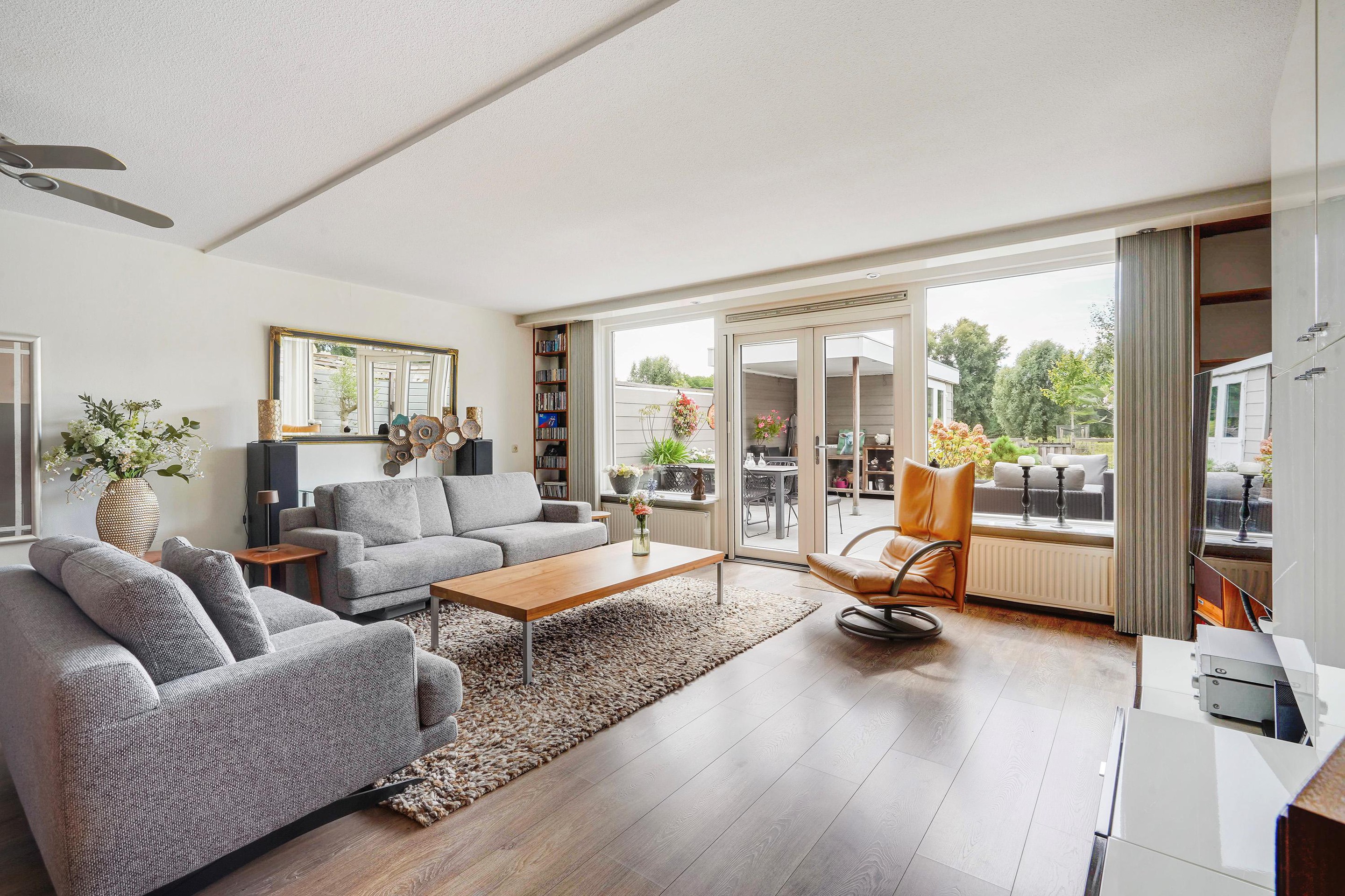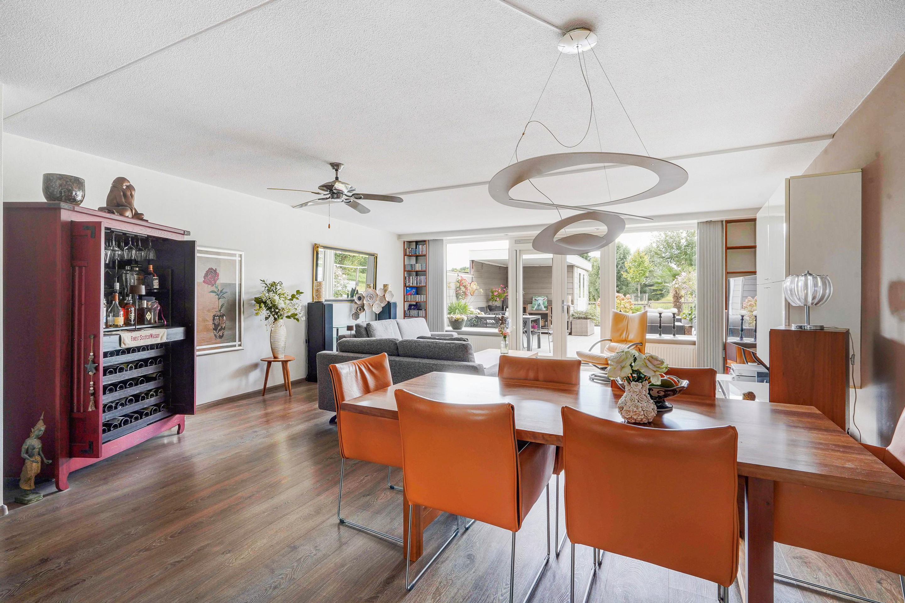 Entree woning, ruime hal waarbij de schuur aan de voorzijde bij de woning betrokken is, ideaal te gebruiken als garderobe en opslag voorraad. Het toilet is vernieuwd en v.v. fontein, uitgebreide groepenkast. Vanuit de hal toegang tot de riante woonkamer v.v. uitbouw, trapkast, open keuken en door de dubbele deuren toegang tot de tuin. De keuken is v.v. 5 pits inductie kookplaat, afzuigkap, grote koelkast, vriezer, combioven, vaatwasser en granieten aanrechtblad. De achtertuin is zeer zonnig, modern aangelegd, v.v. elektrisch bedienbare zonnescherm, ruime schuur en fijne veranda en geniet van prachtig vrij uitzicht over het park met de schapenweide.