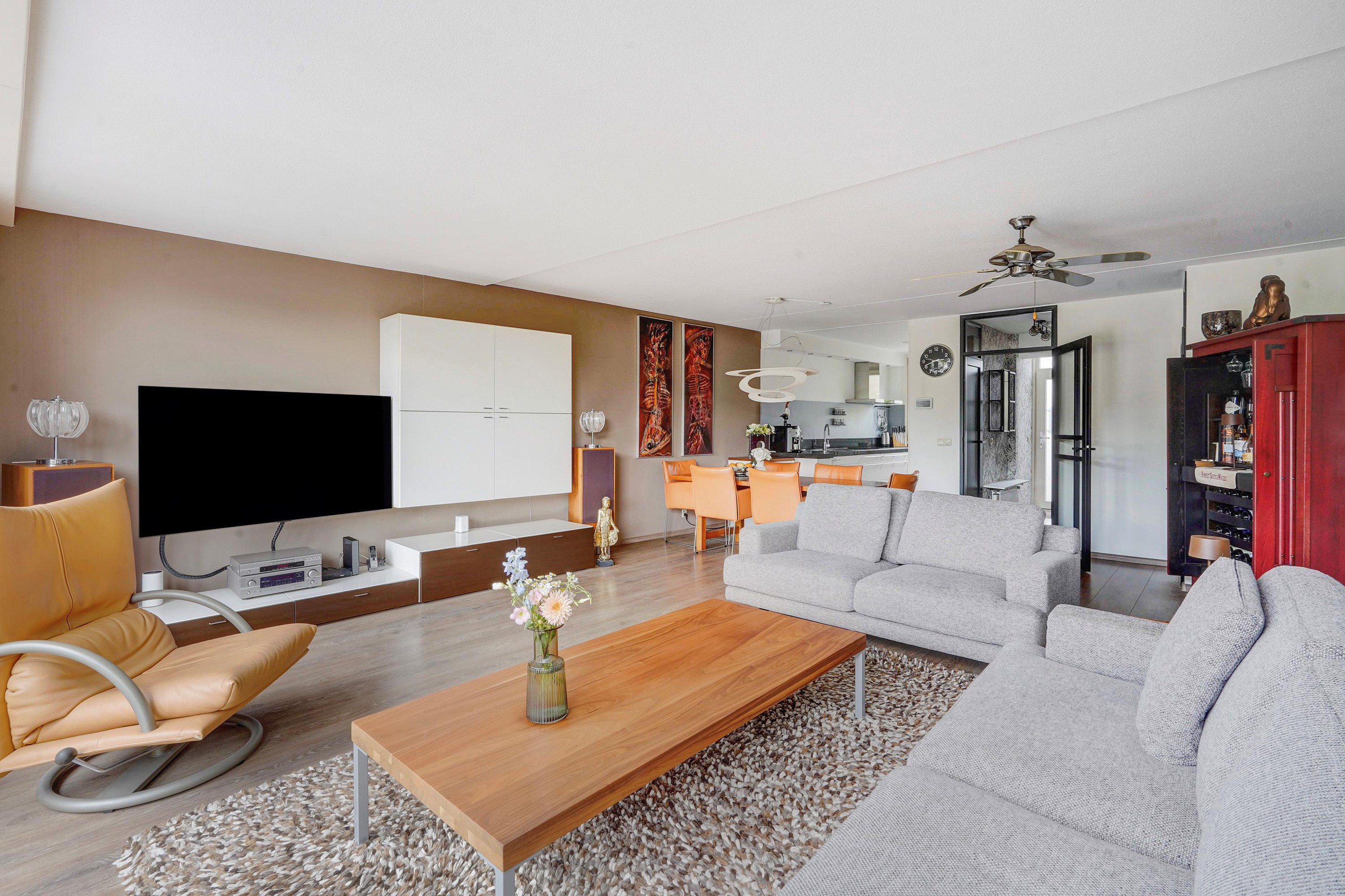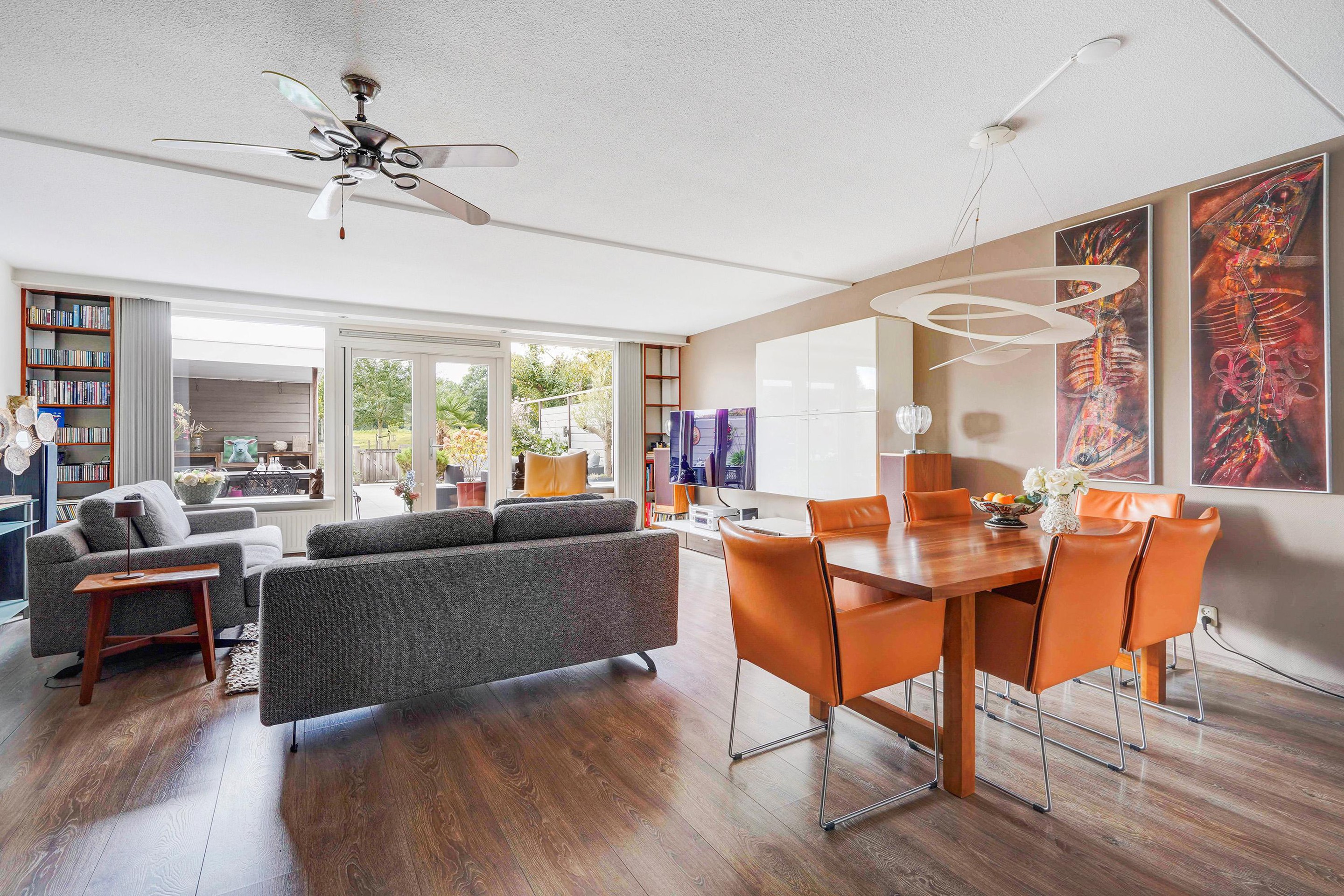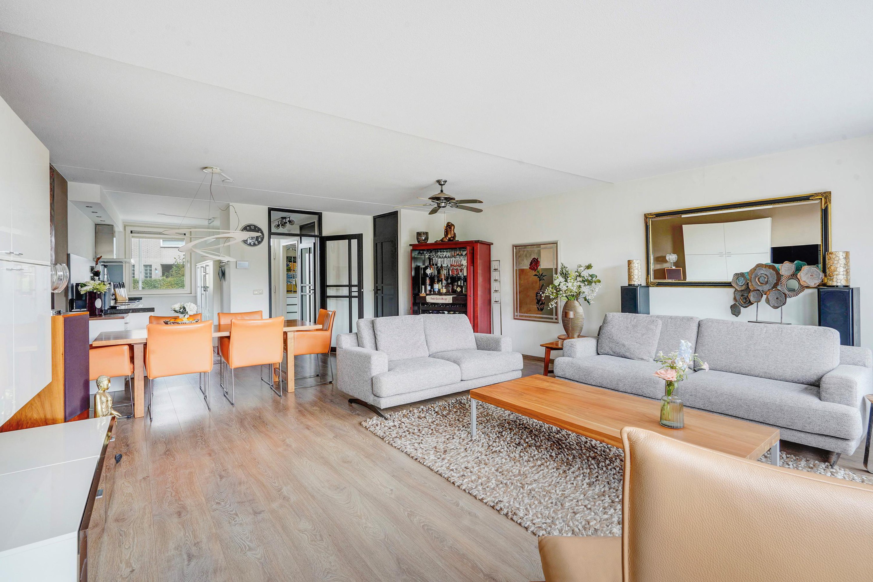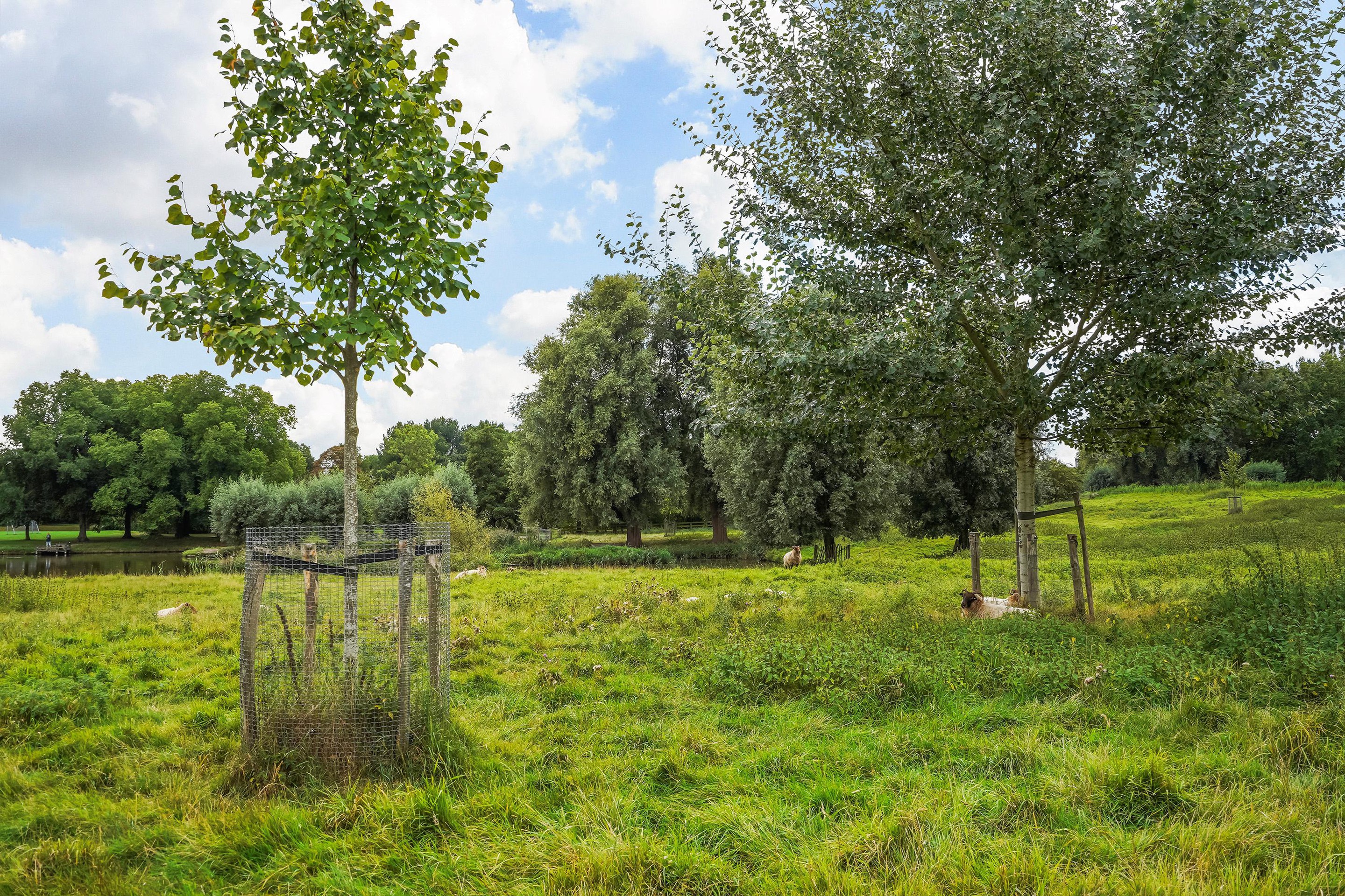 Entree woning, ruime hal waarbij de schuur aan de voorzijde bij de woning betrokken is, ideaal te gebruiken als garderobe en opslag voorraad. Het toilet is vernieuwd en v.v. fontein, uitgebreide groepenkast. Vanuit de hal toegang tot de riante woonkamer v.v. uitbouw, trapkast, open keuken en door de dubbele deuren toegang tot de tuin. De keuken is v.v. 5 pits inductie kookplaat, afzuigkap, grote koelkast, vriezer, combioven, vaatwasser en granieten aanrechtblad. De achtertuin is zeer zonnig, modern aangelegd, v.v. elektrisch bedienbare zonnescherm, ruime schuur en fijne veranda en geniet van prachtig vrij uitzicht over het park met de schapenweide.