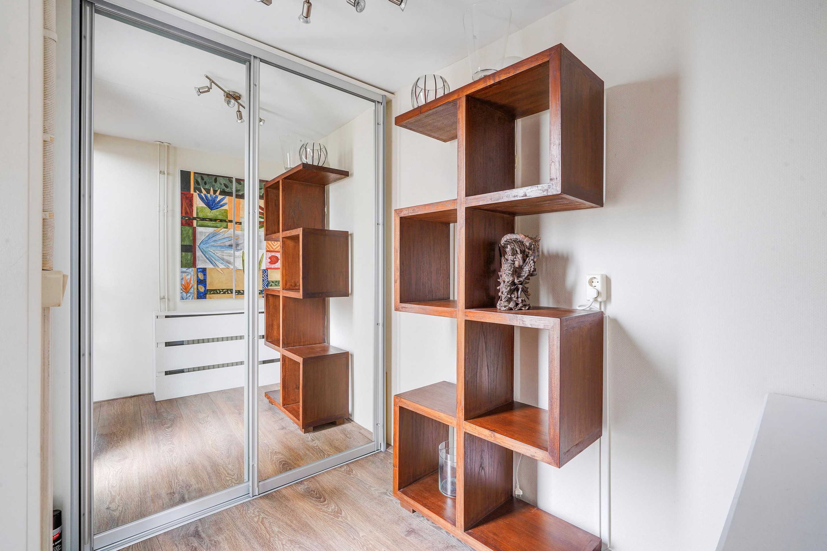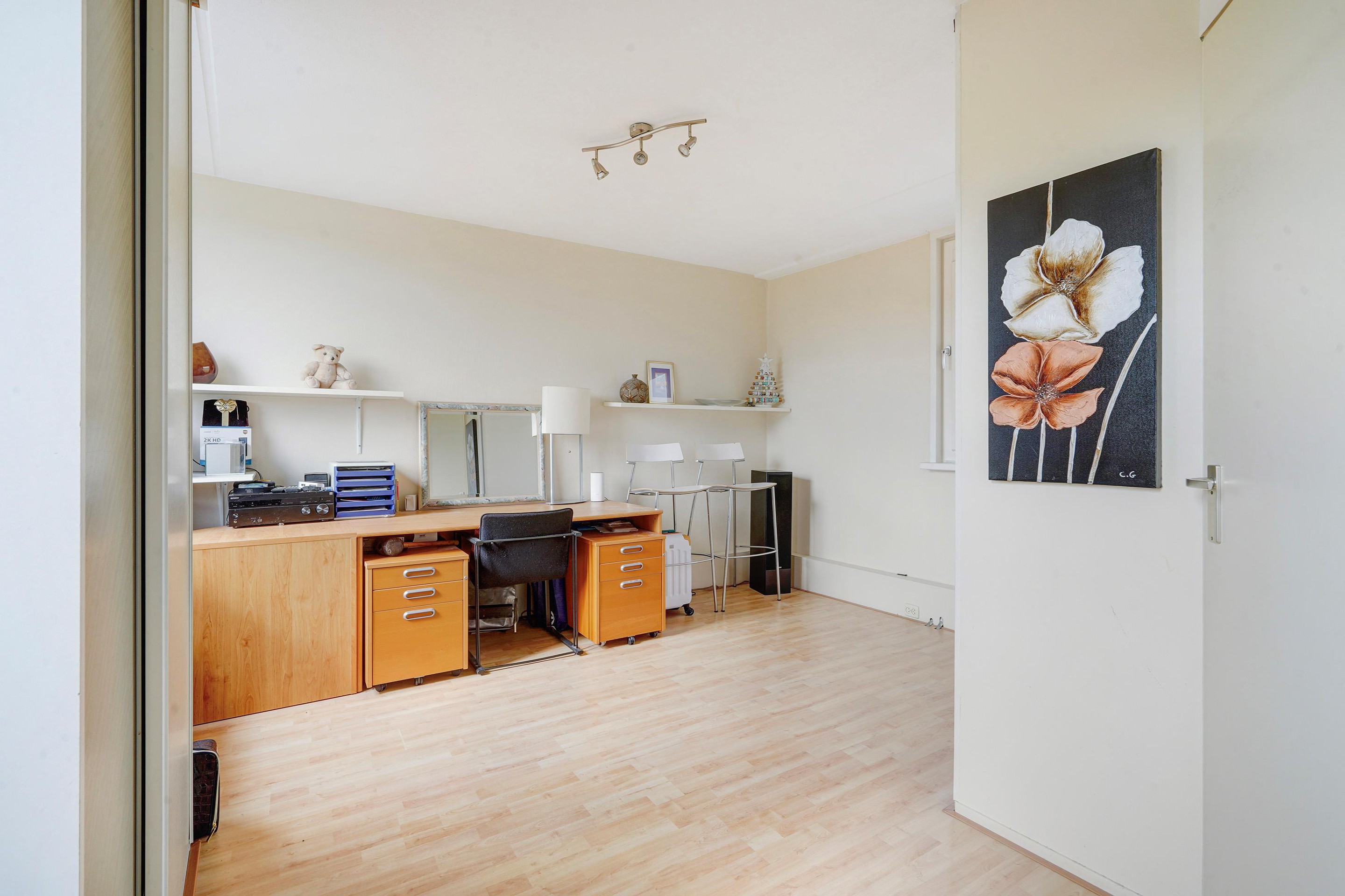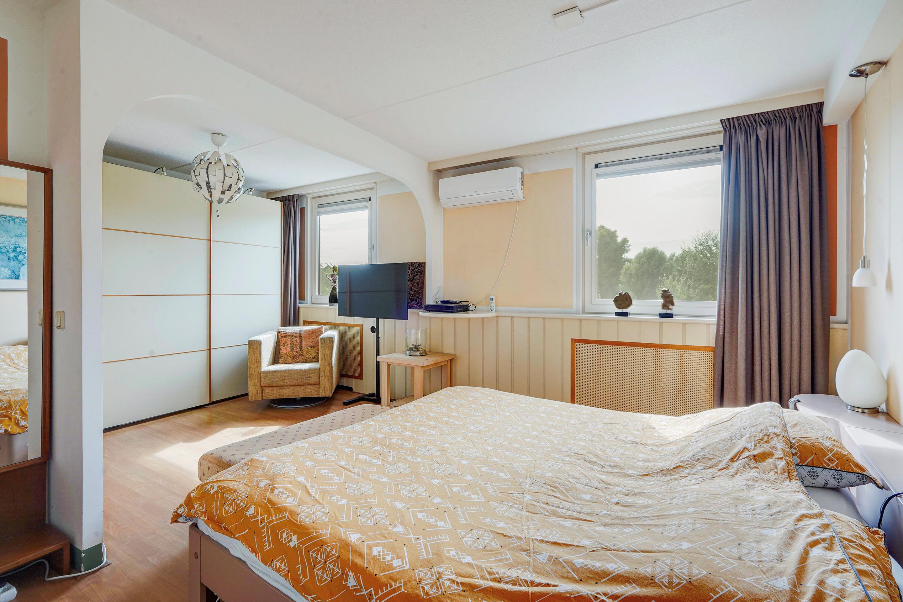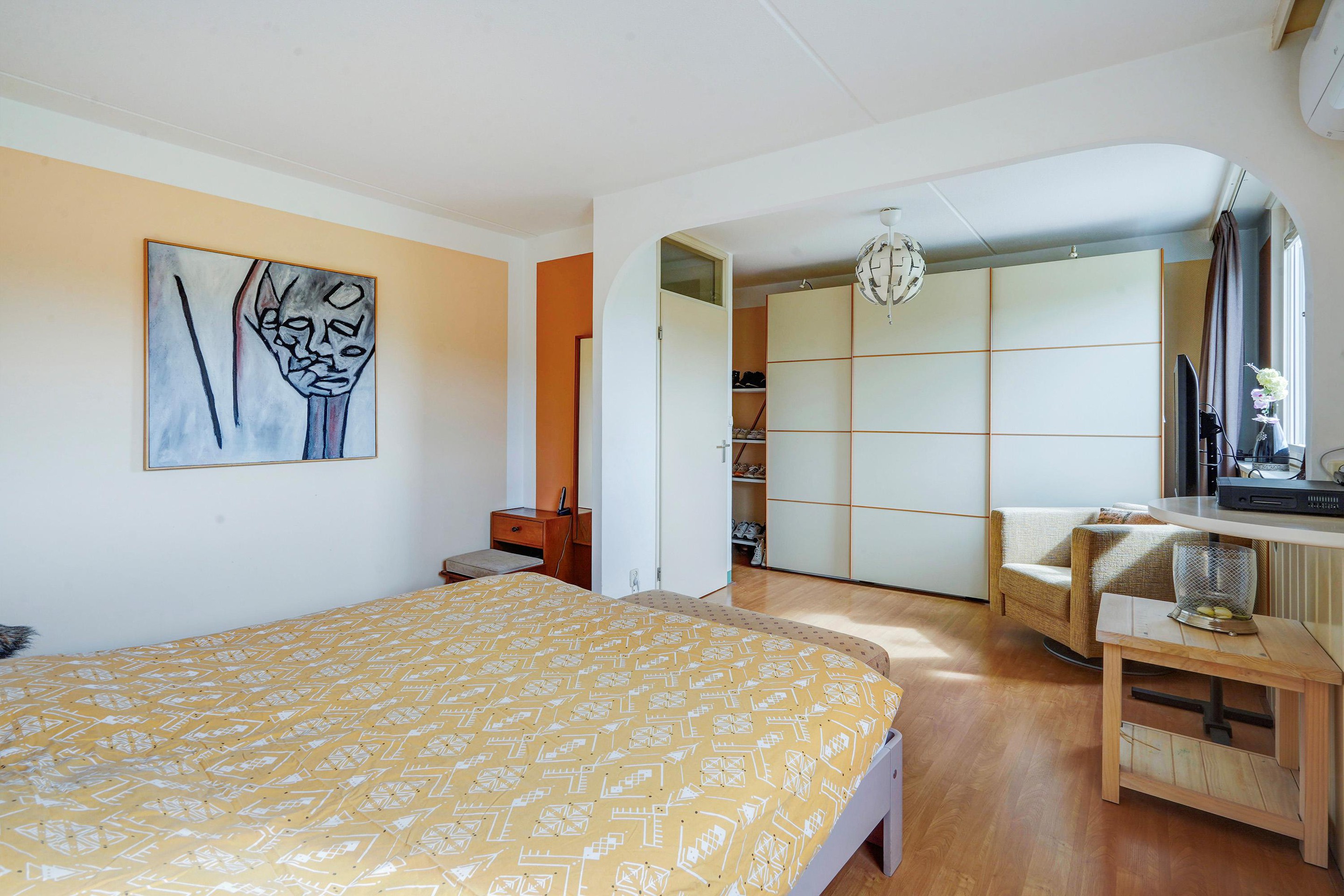 1e verdieping: aan de achterzijde een zeer ruime slaapkamer (voorheen 2 slaapkamers) en v.v. airco. De slaapkamer aan de voorzijde is eveneens van ruime afmetingen en thans in gebruik als kastenkamer. De badkamer is recent geplaatst, modern uitgerust en v.v. douche, wastafelmeubel, wandkasten, toilet, bidet, handdoekradiator, elektrische vloerverwarming, inbouwspots en mechanische ventilatie.