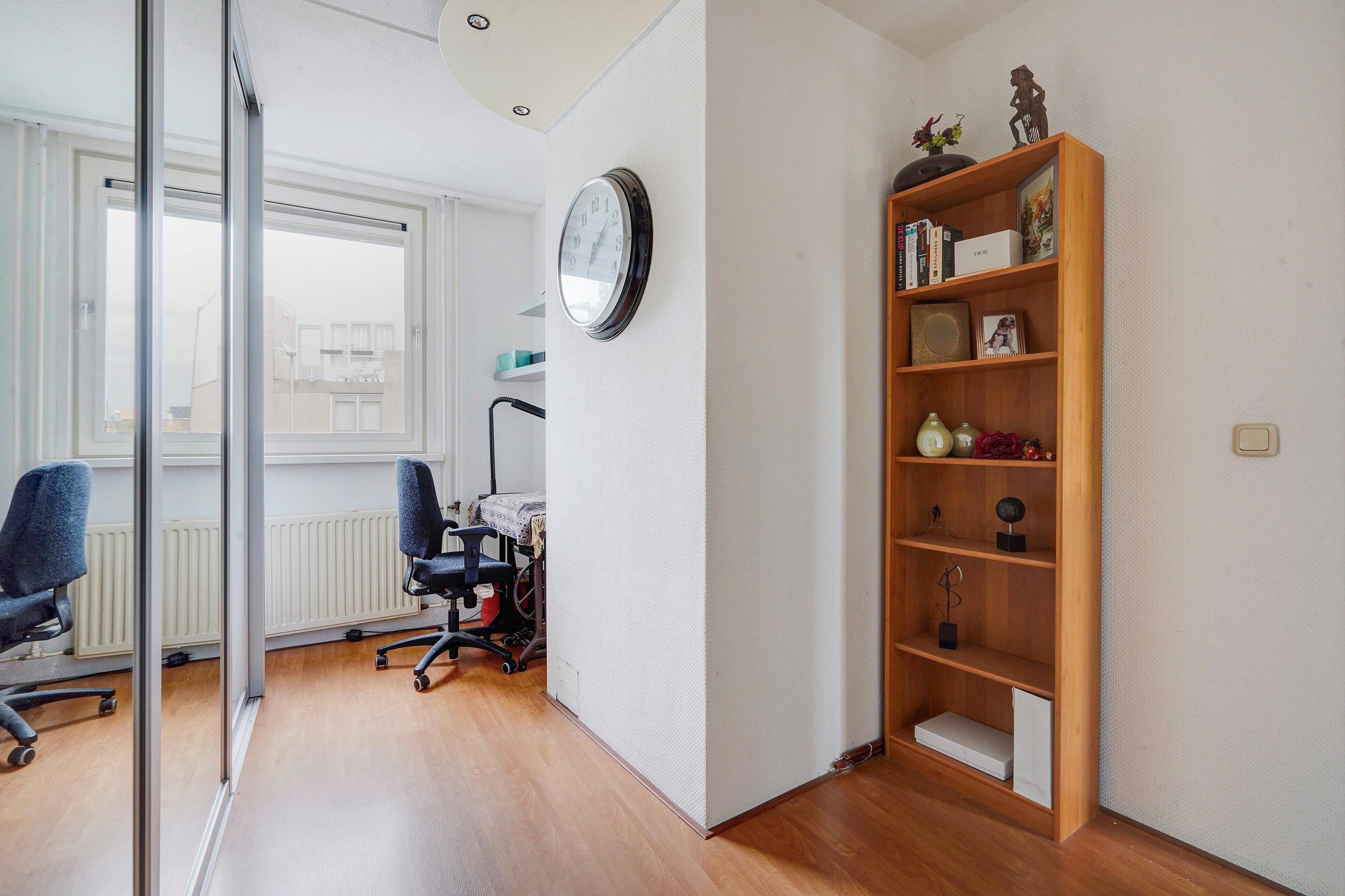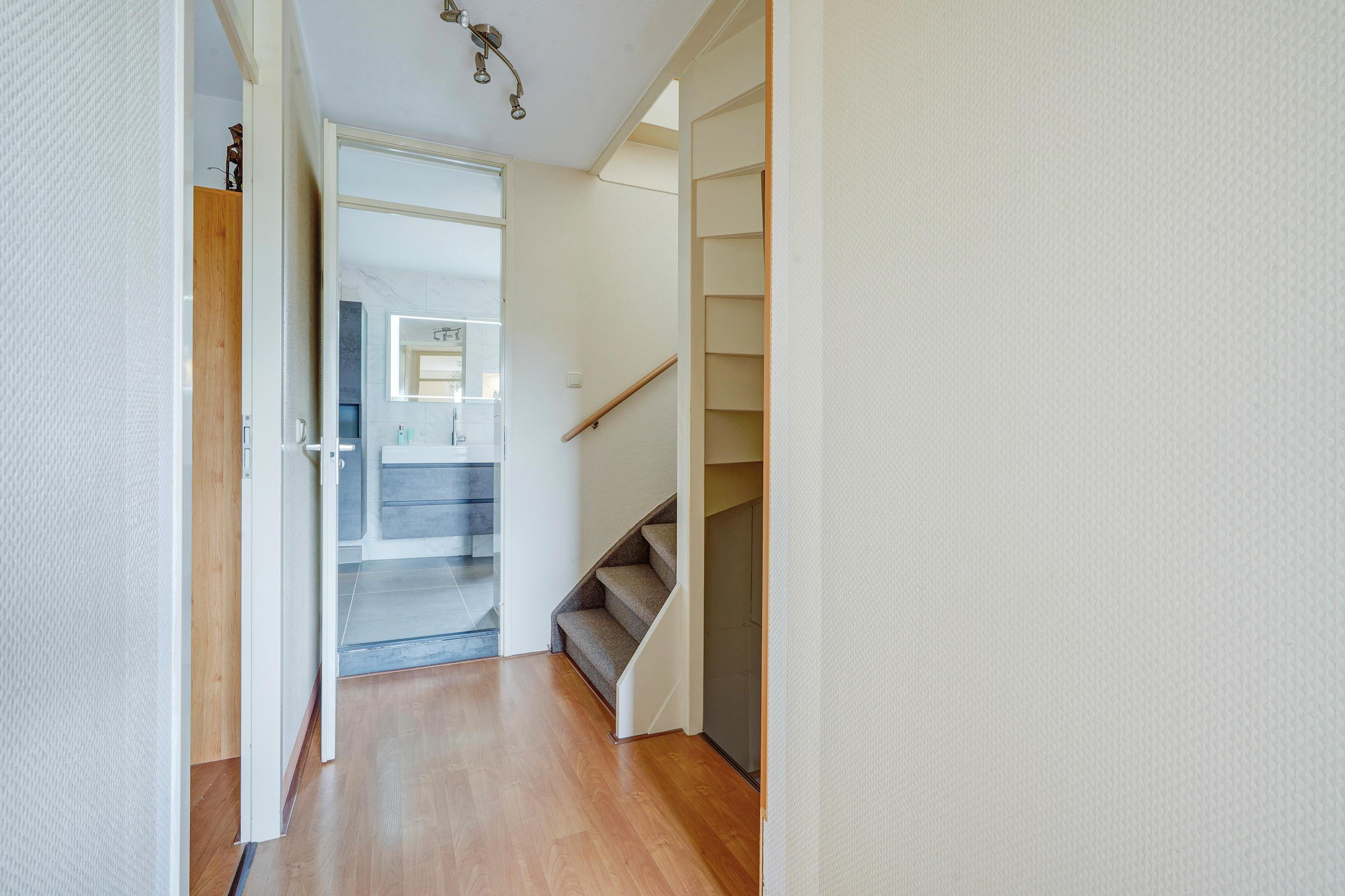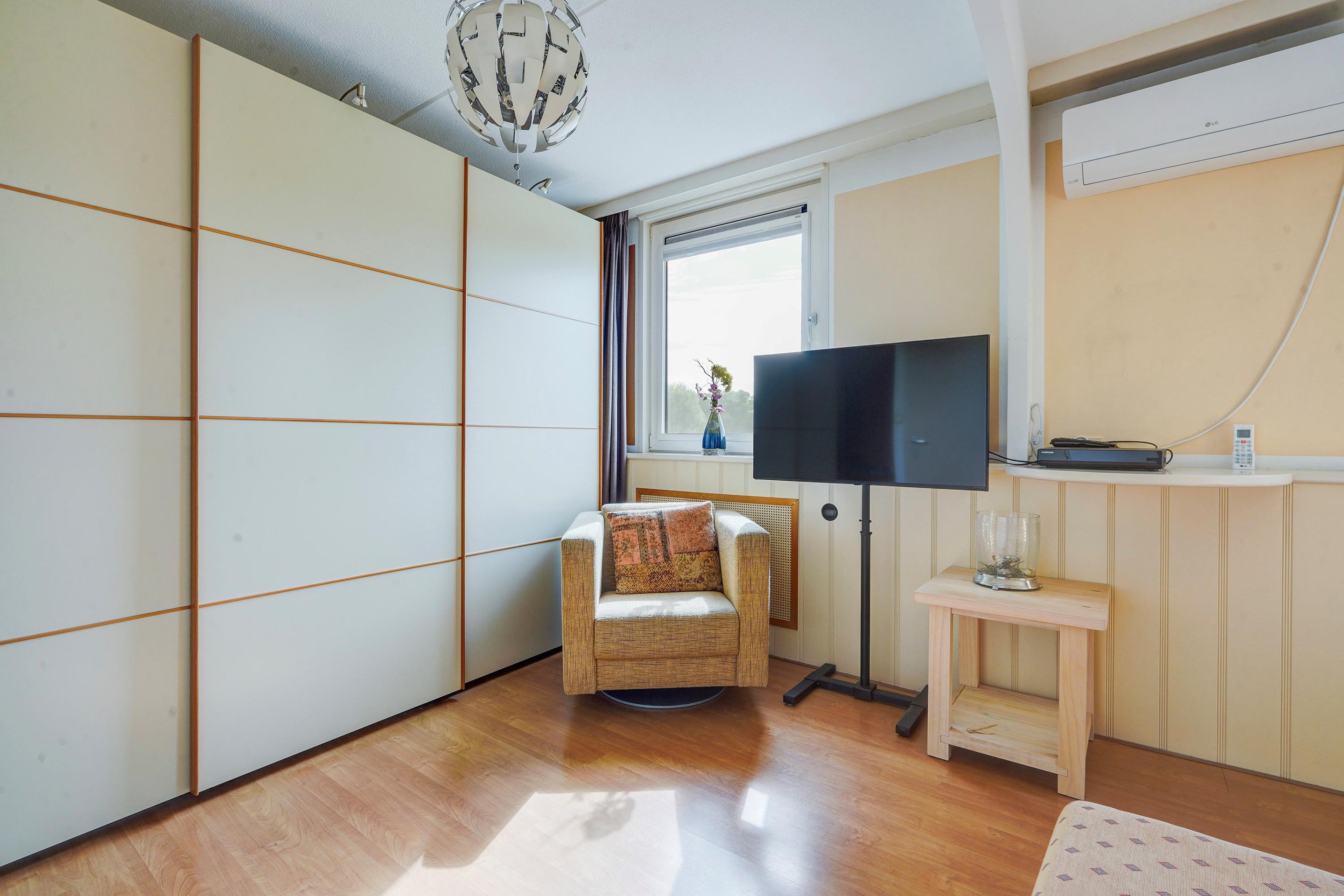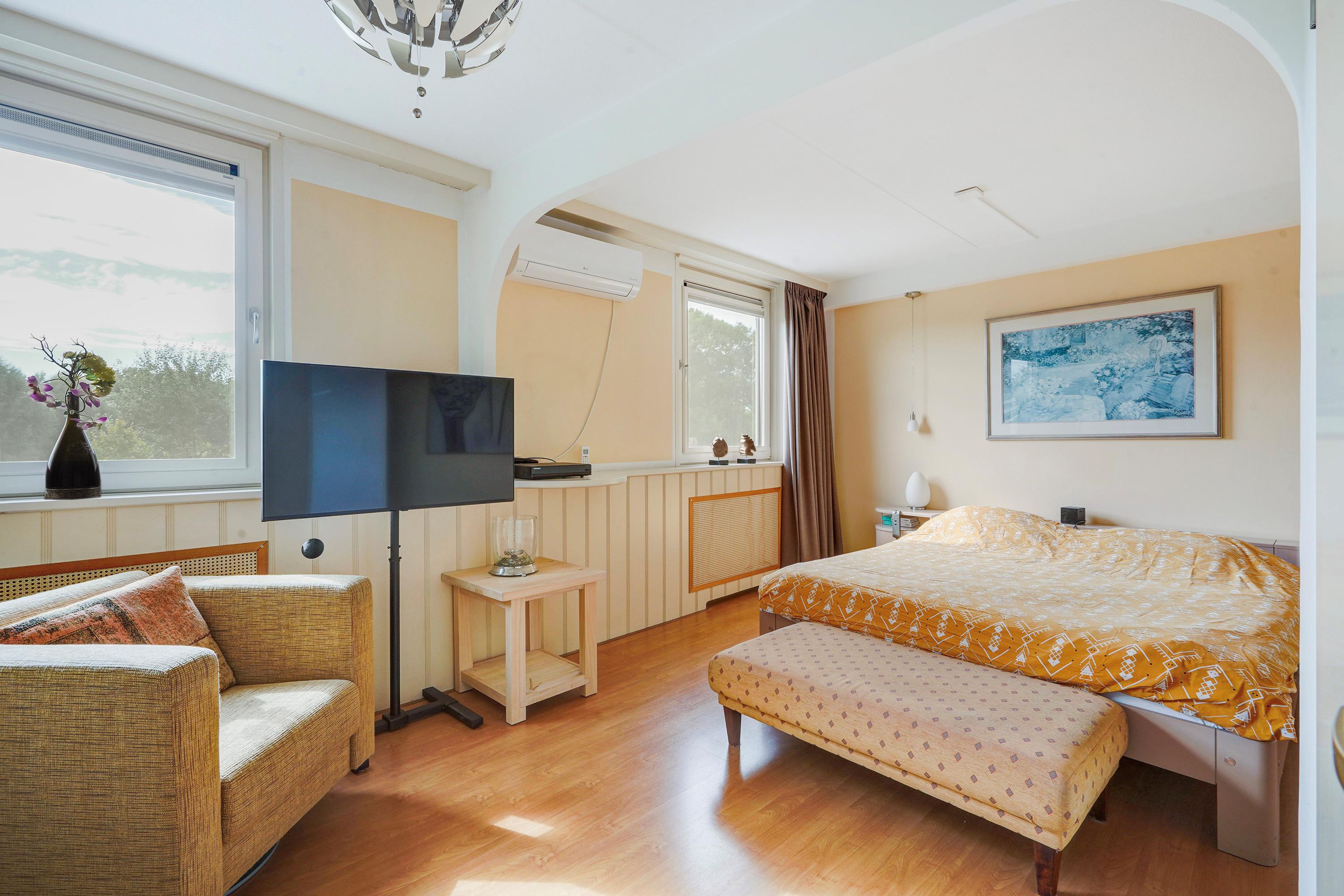 1e verdieping: aan de achterzijde een zeer ruime slaapkamer (voorheen 2 slaapkamers) en v.v. airco. De slaapkamer aan de voorzijde is eveneens van ruime afmetingen en thans in gebruik als kastenkamer. De badkamer is recent geplaatst, modern uitgerust en v.v. douche, wastafelmeubel, wandkasten, toilet, bidet, handdoekradiator, elektrische vloerverwarming, inbouwspots en mechanische ventilatie.