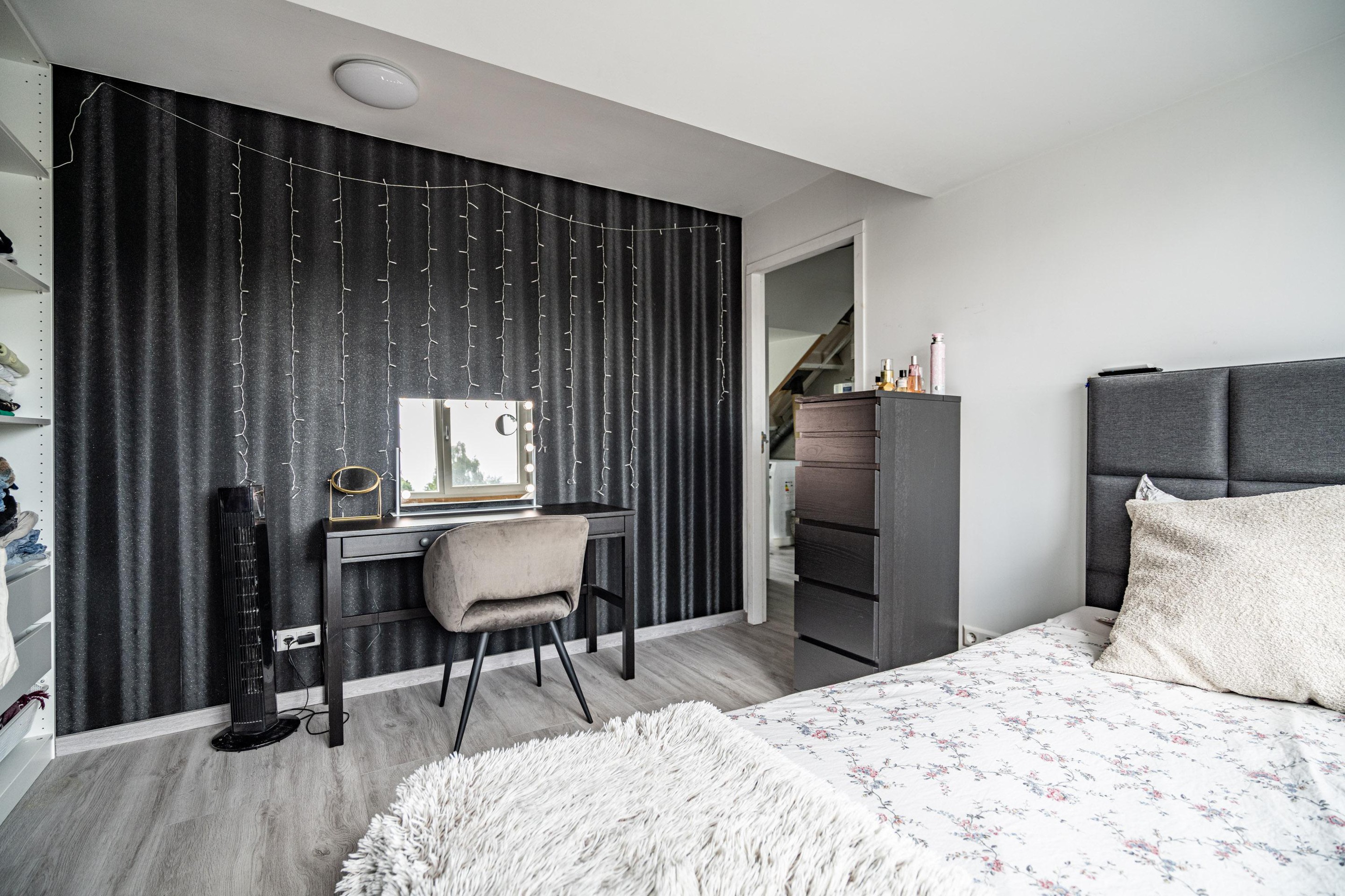 Op de eerste etage bevind zich een grote overloop met aan de ene kant een ruime luxe badkamer met inloopdouche, bad, wastafel, 2e toilet en een zeer ruime slaapkamer. Aan de andere kant de masterbedroom met een extra kamer die momenteel is ingericht als inloopkast.