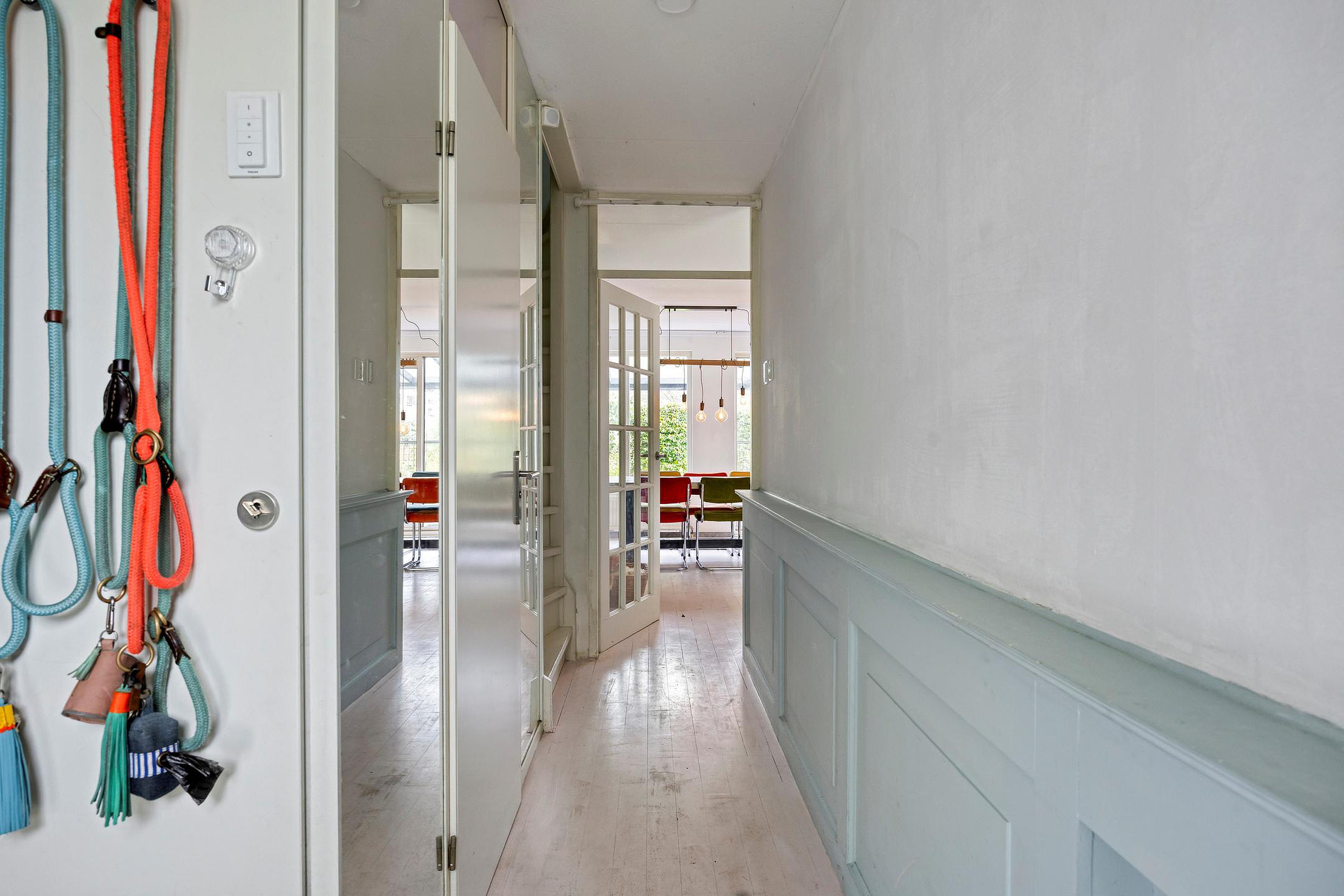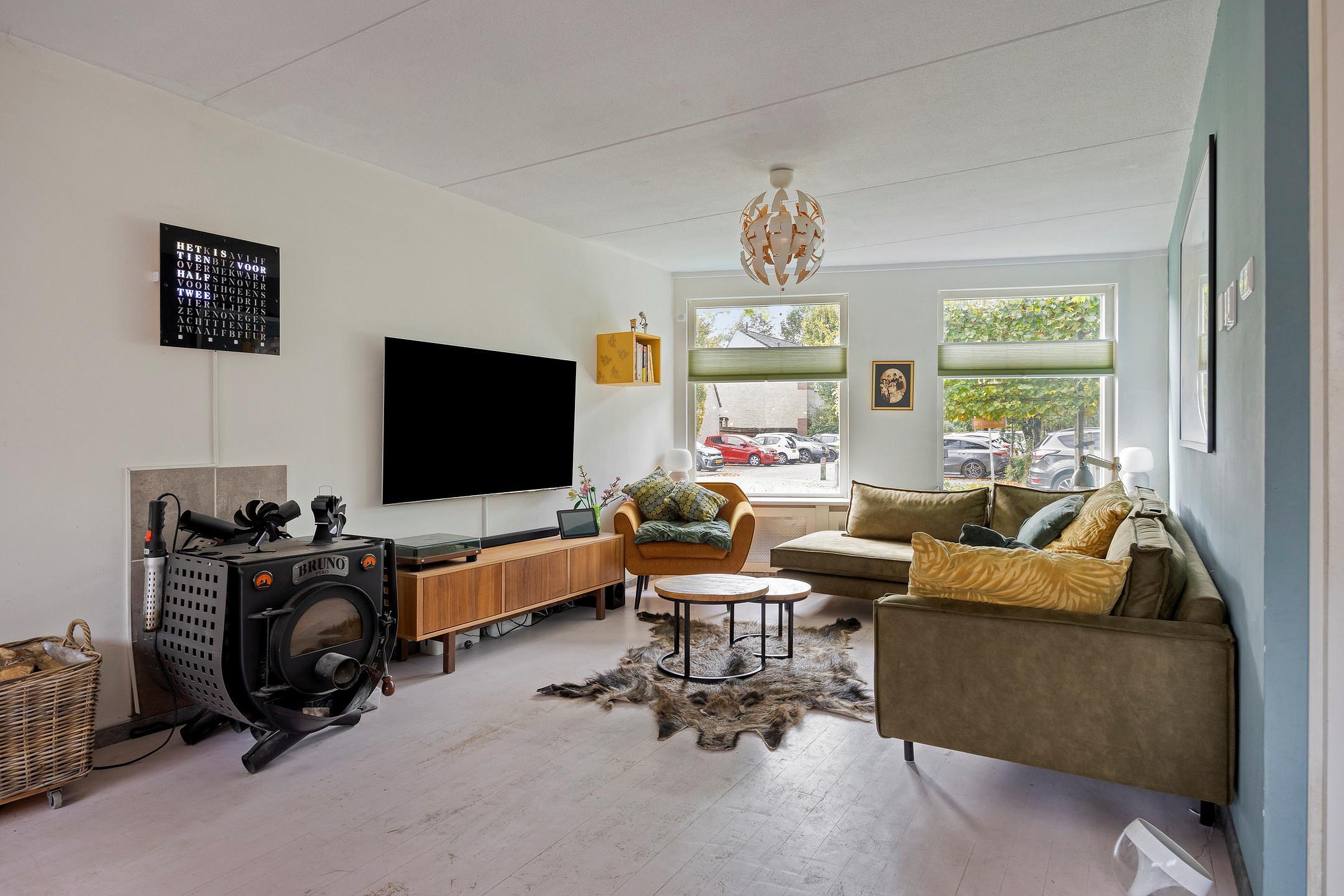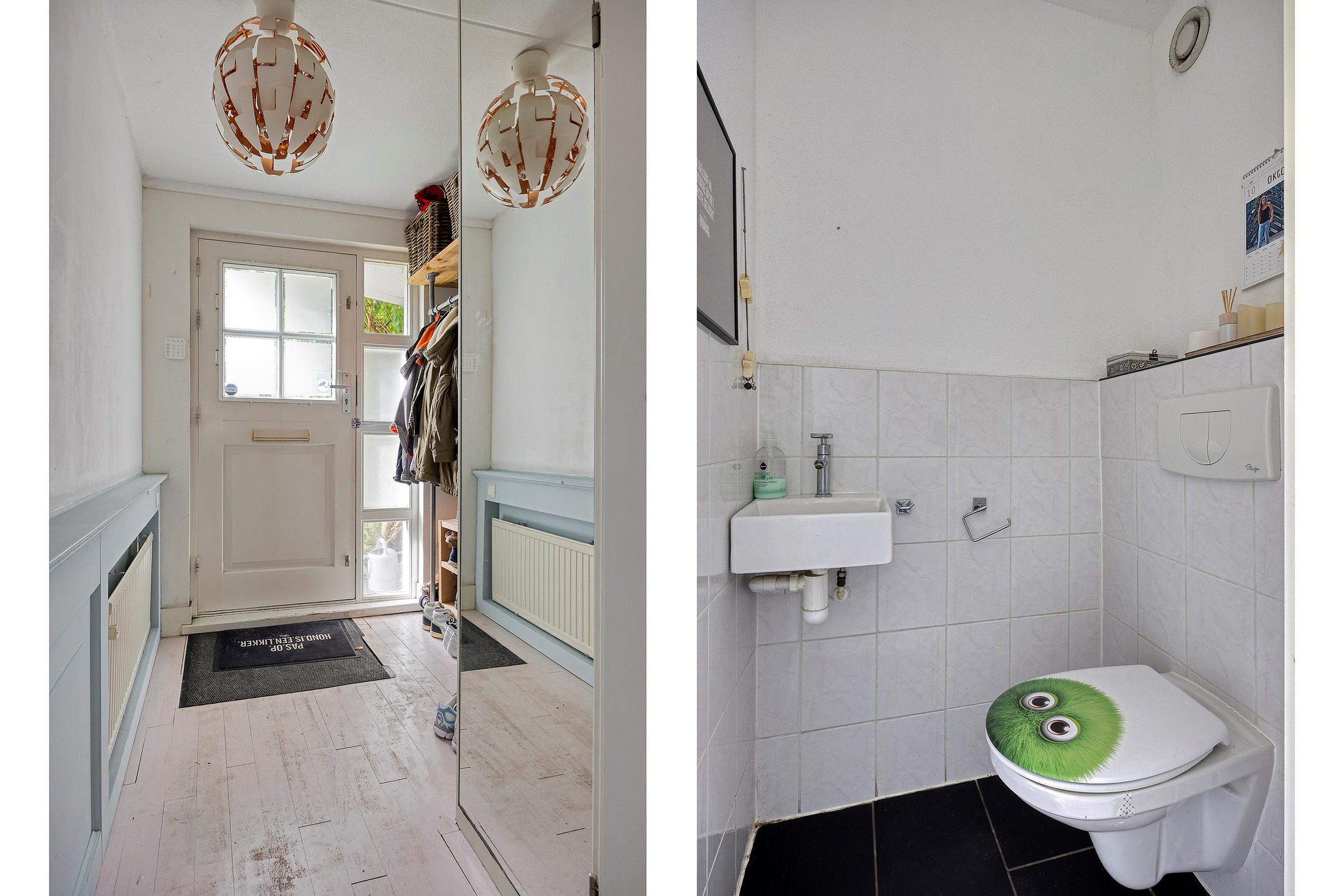 Begane grond Via de overdekte entree kom je binnen in de lange hal met garderobehoek. Hier vind je de meterkast en een net toilet met fontein. Vervolgens lopen we door naar de woonkamer – en die is ronduit groot. De "uitbouw" zorgt voor een enorme leefruimte, waardoor er moeiteloos plek is voor een grote eettafel, speelhoek of werkplek. De schuine erker aan de voorzijde geeft het geheel een speelse indeling en zorgt voor veel lichtinval. Op de vloer ligt een gave whitewash parketvloer en er is een praktische trapkast aanwezig en een geweldige haard voor de sfeervolle avonden of gewoon voor de directe warmte.