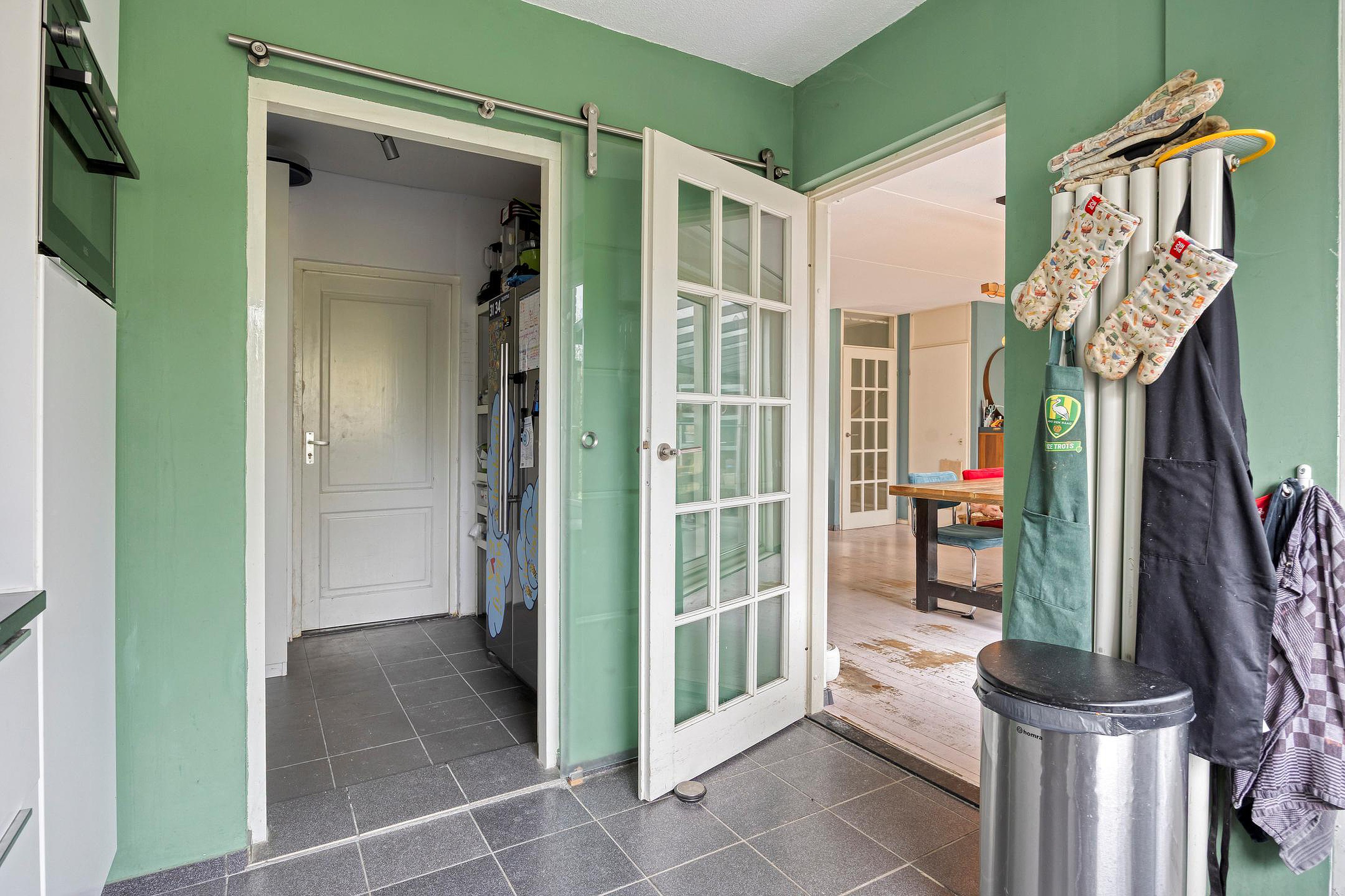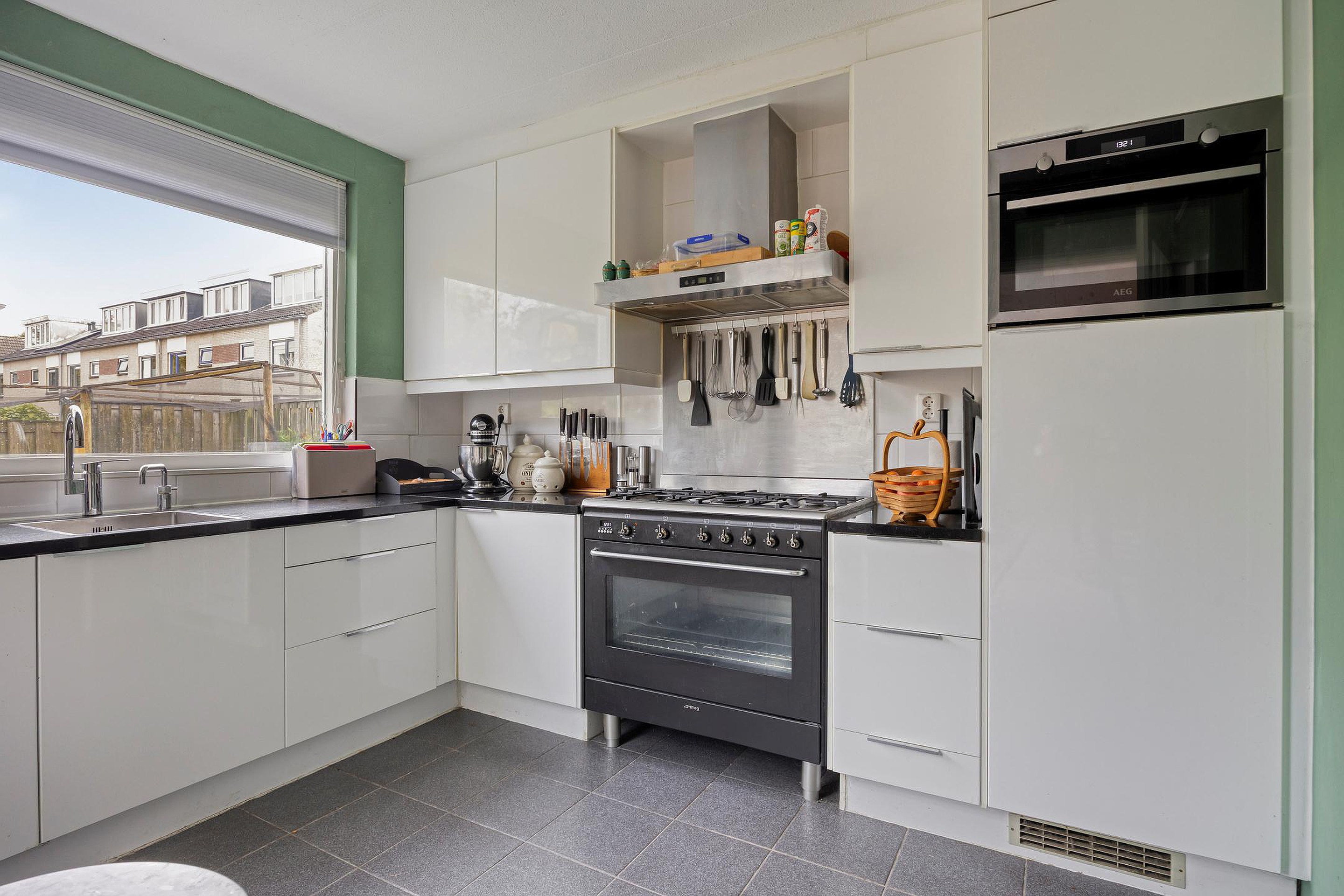 Aan de achterzijde ligt de hoekkeuken in de uitbouw, modern uitgevoerd met diverse inbouwapparatuur zoals een vaatwasser, Quooker, SMEG ovenunit met 5-pits kookplaat, afzuigkap, magnetron en koelkast. Vanuit hier kom je in de bijkeuken, ideaal voor extra voorraad, apparatuur of een tweede koelkast. Aansluitend bereik je de garage (voorzien van elektra en een roldeur).