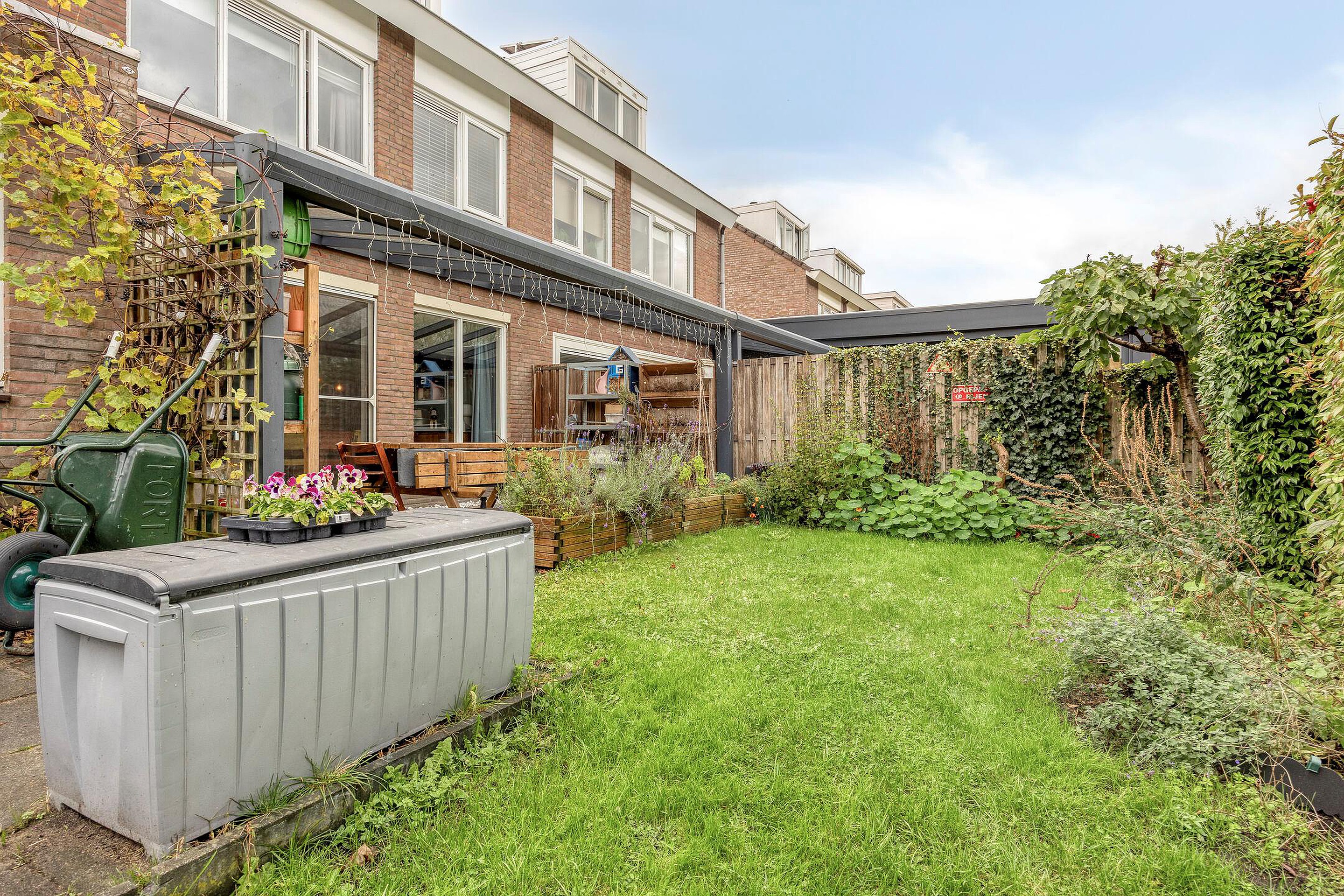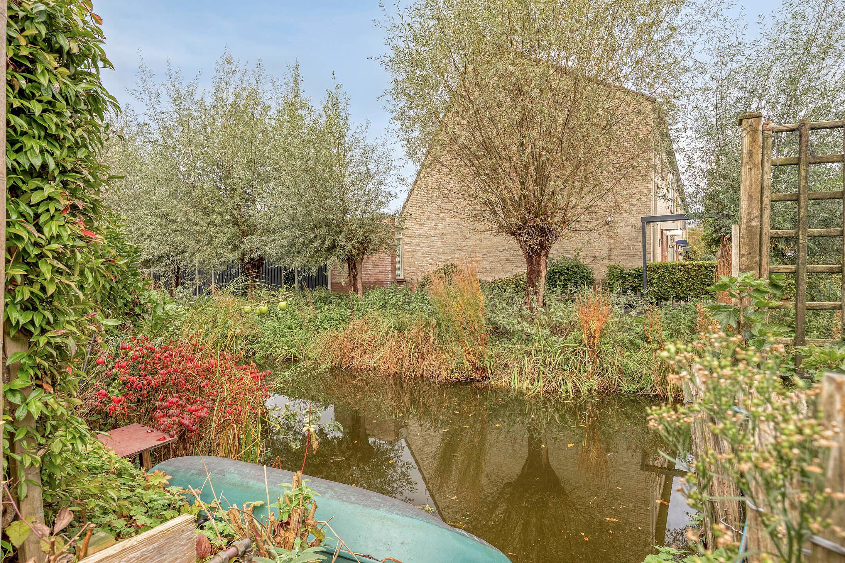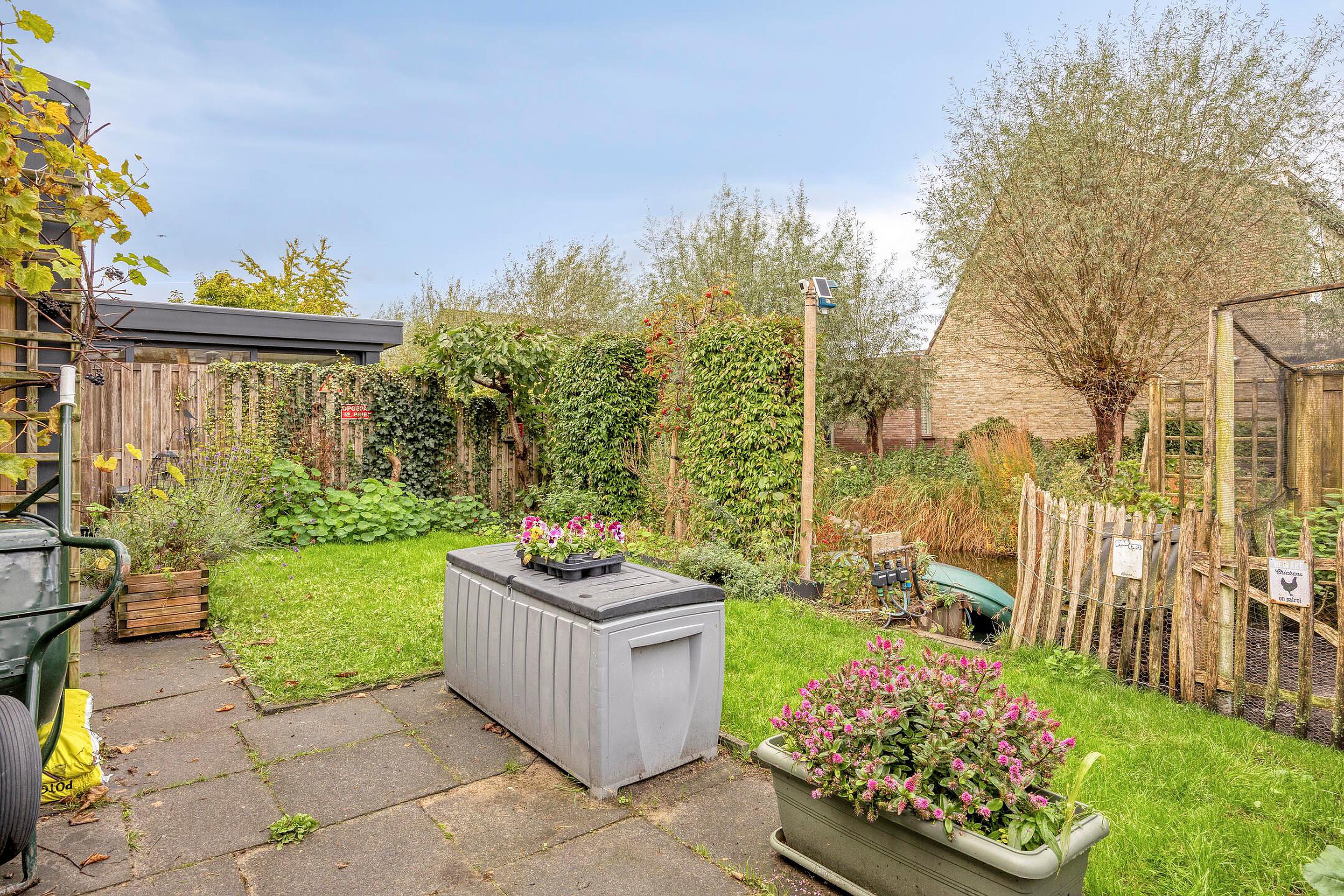 Via de schuifpui aan de achterzijde loop je de riante achtertuin in – een waar buitenparadijs. Met ruim dik 85 m2 aan groen, ligging aan het watertje, een vrij uitzicht en volop zon door het ontbreken van omliggende bebouwing is dit een uitzonderlijke plek. De tuin ligt op het noordwesten en biedt ook in de middag heerlijke zonuren. Je vindt hier volwassen groen, fruitbomen, een grote schuur van maar liefst 14 m2 én zelfs een kippenren (kippen kunnen desgewenst blijven).