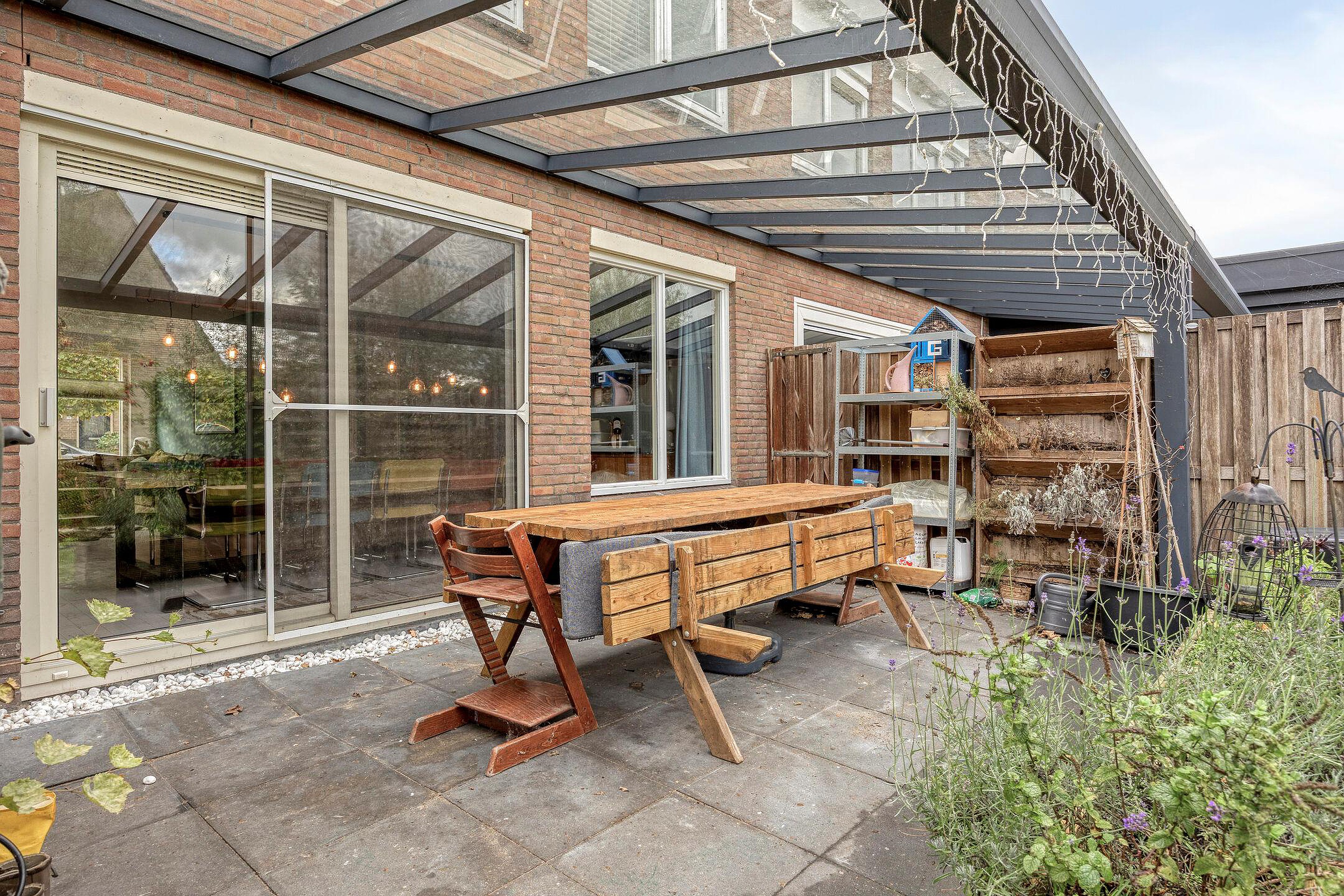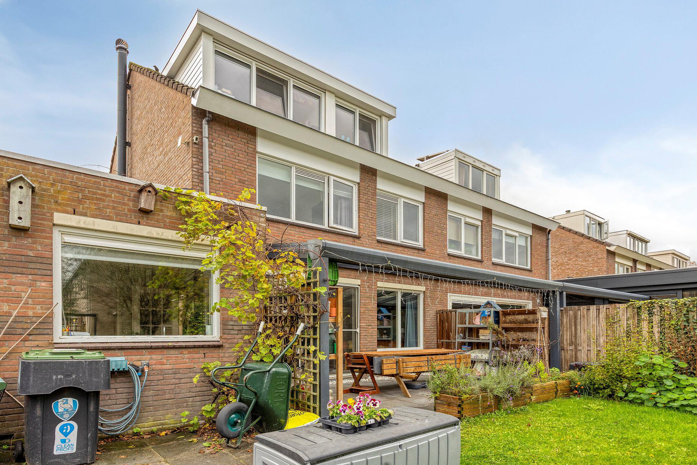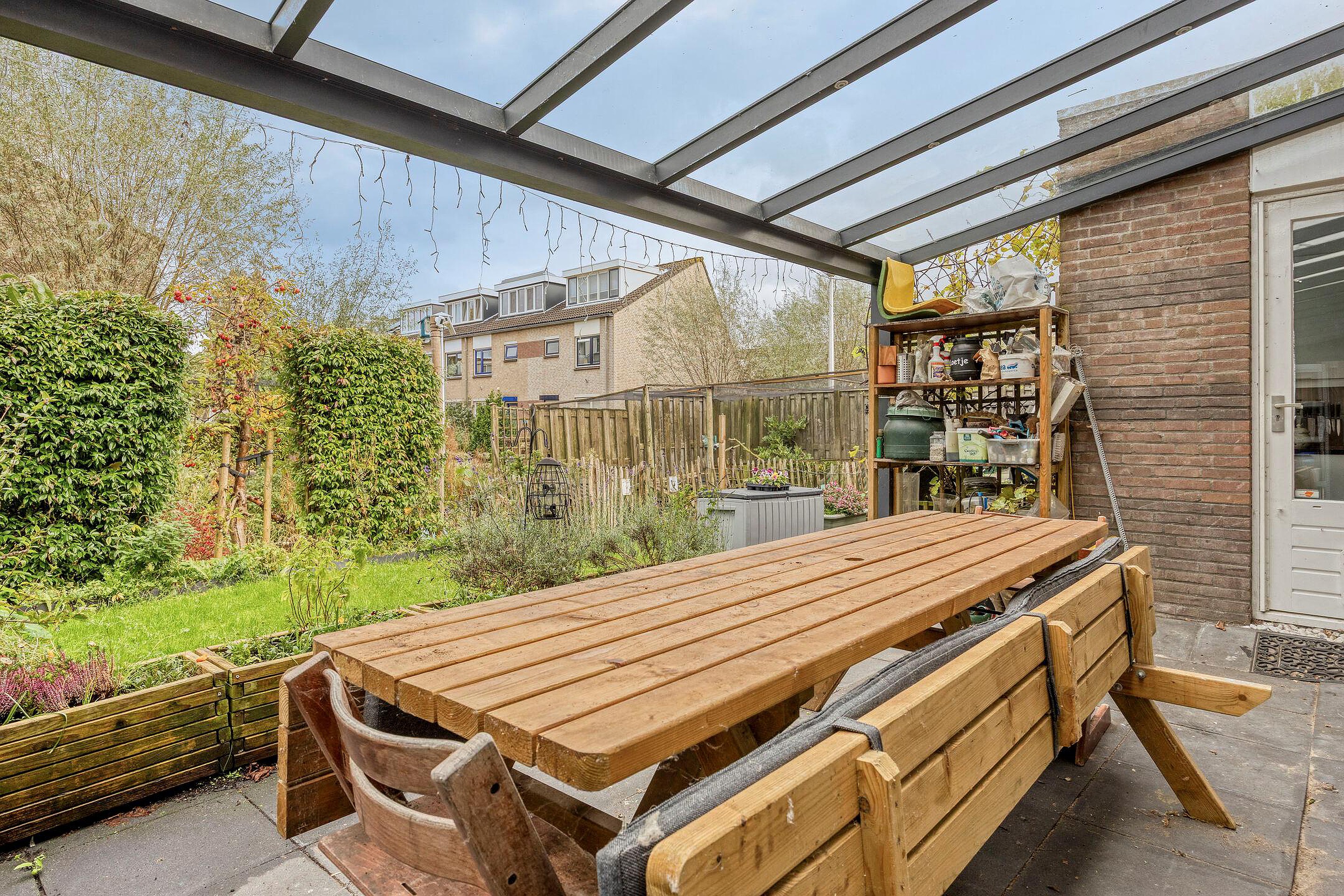 Via de schuifpui aan de achterzijde loop je de riante achtertuin in – een waar buitenparadijs. Met ruim dik 85 m2 aan groen, ligging aan het watertje, een vrij uitzicht en volop zon door het ontbreken van omliggende bebouwing is dit een uitzonderlijke plek. De tuin ligt op het noordwesten en biedt ook in de middag heerlijke zonuren. Je vindt hier volwassen groen, fruitbomen, een grote schuur van maar liefst 14 m2 én zelfs een kippenren (kippen kunnen desgewenst blijven).