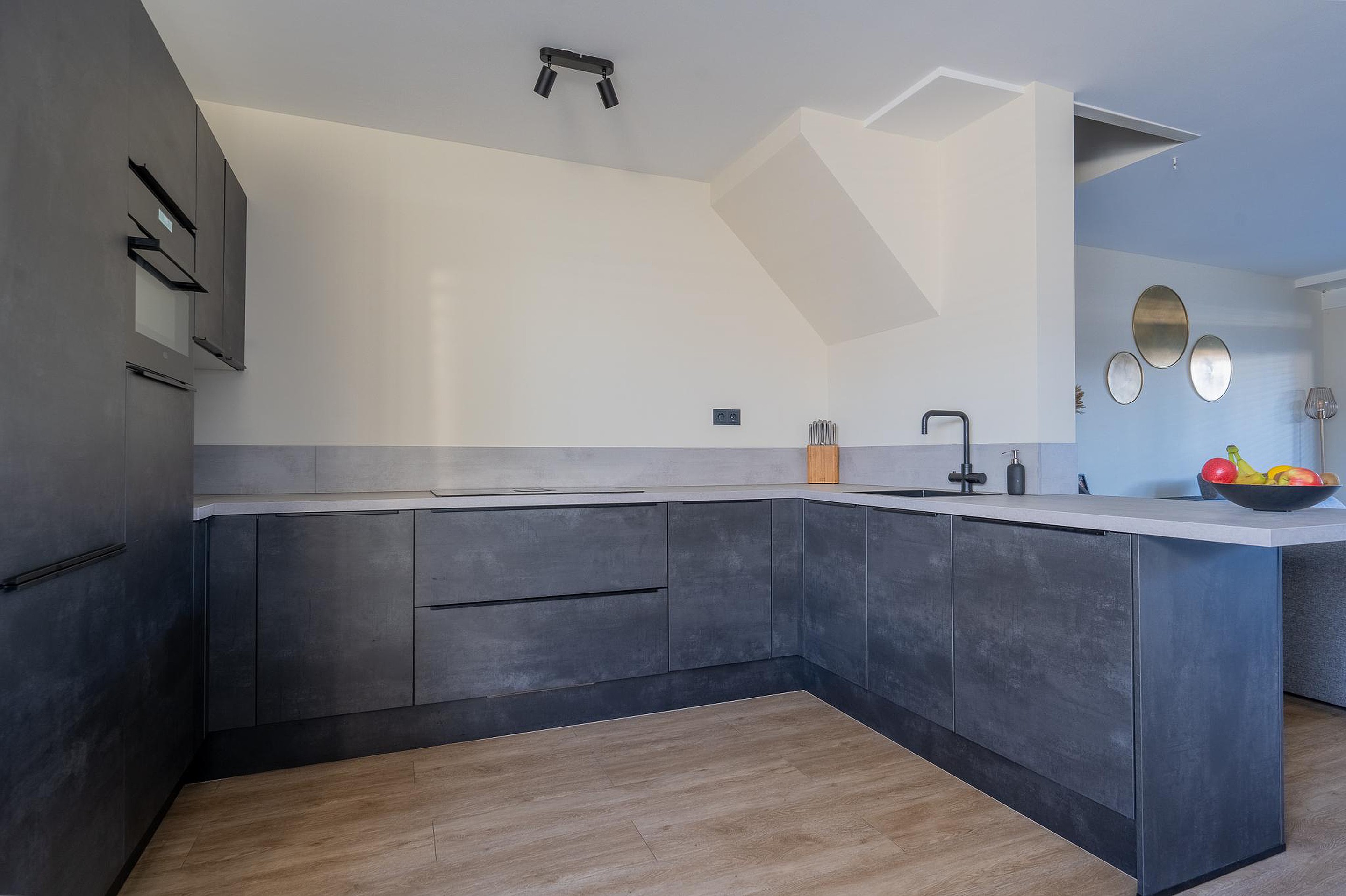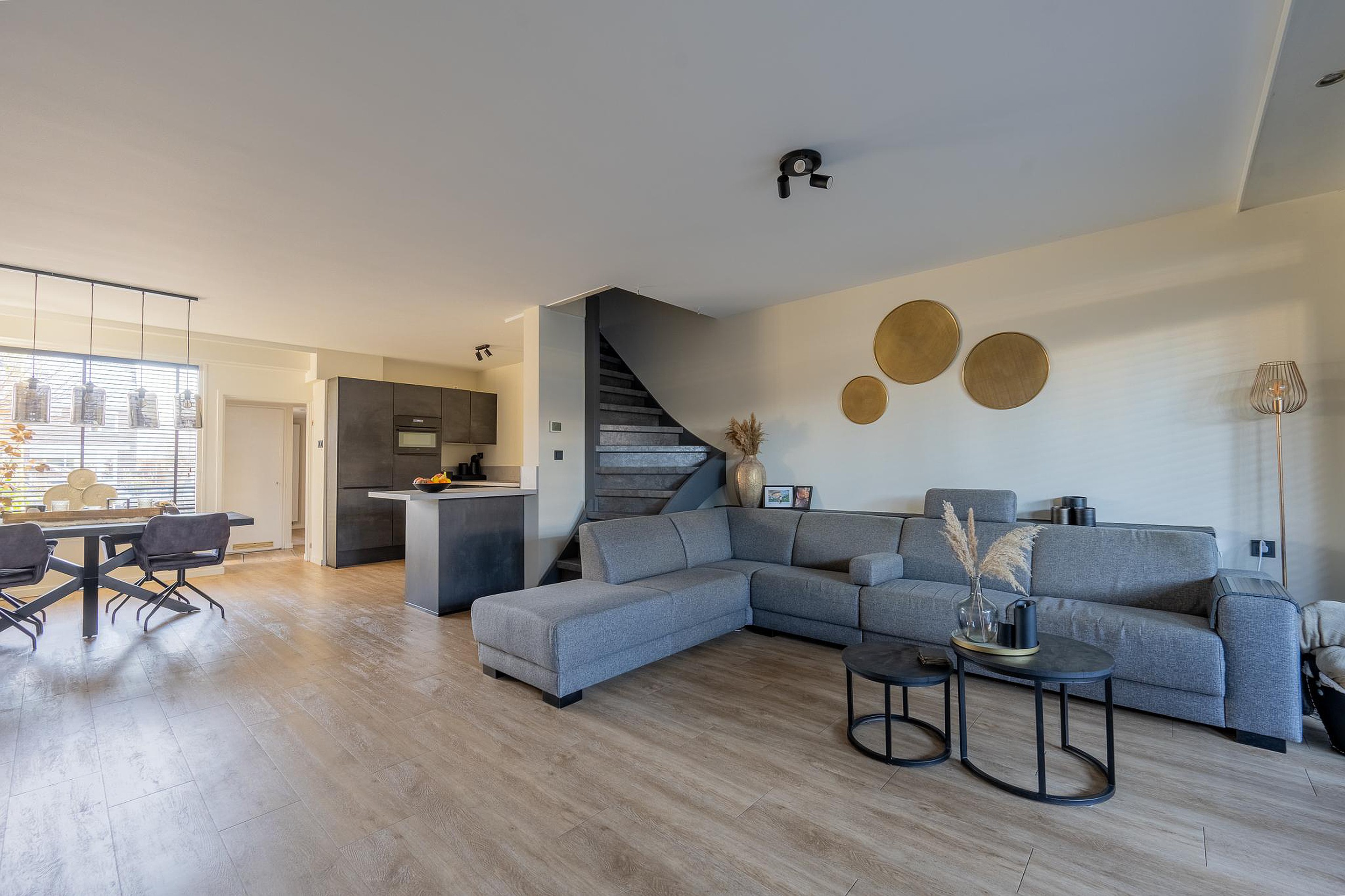 Vanuit de hal stap je de ruime en moderne keuken binnen (2021), voorzien van diverse inbouwapparatuur, waaronder een Quooker, combi-oven en voldoende kastruimte. De keuken en woonkamer zijn strak afgewerkt met gestucte wanden en een doorgelegde pvc-vloer met vloerverwarming.