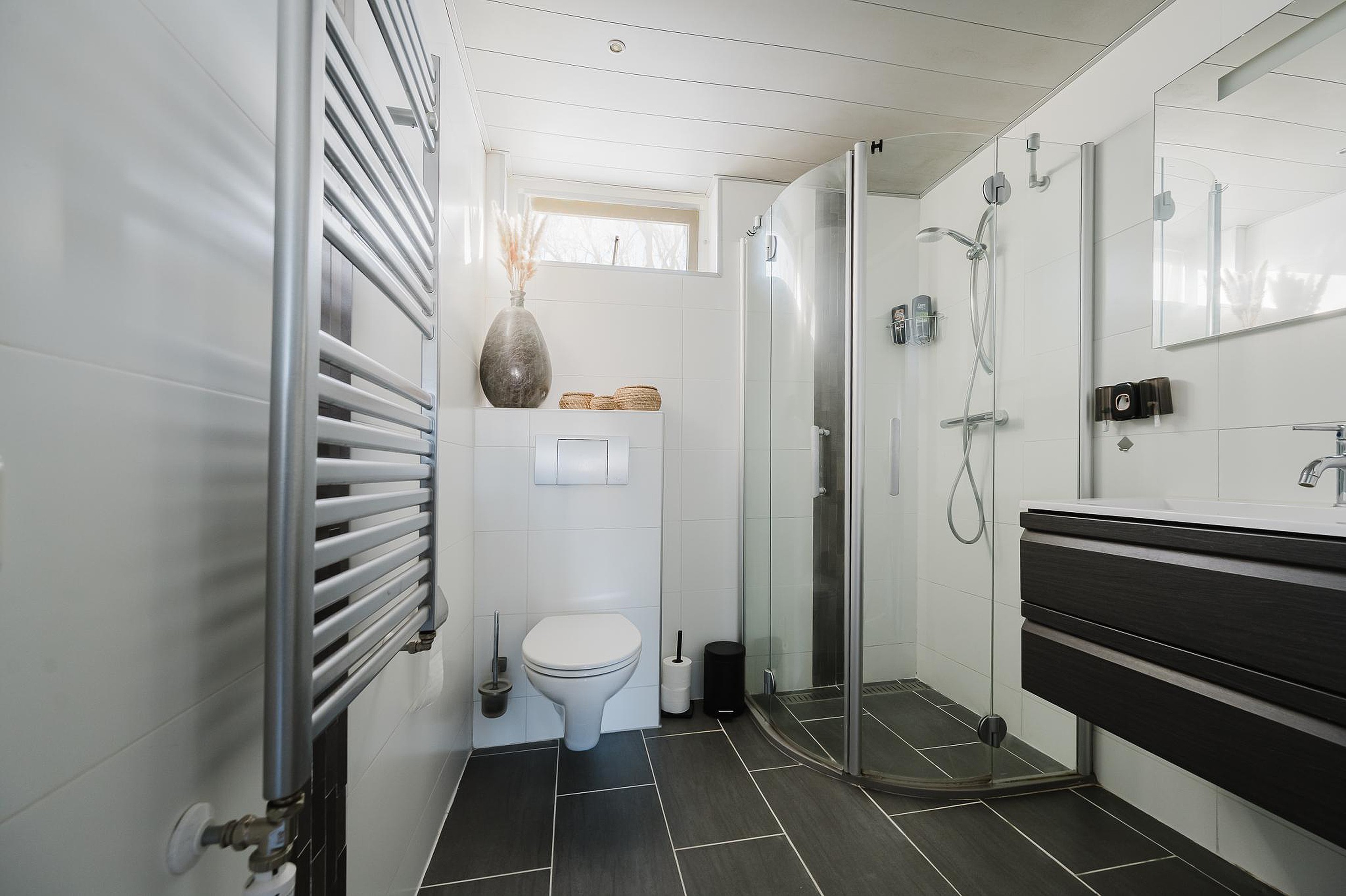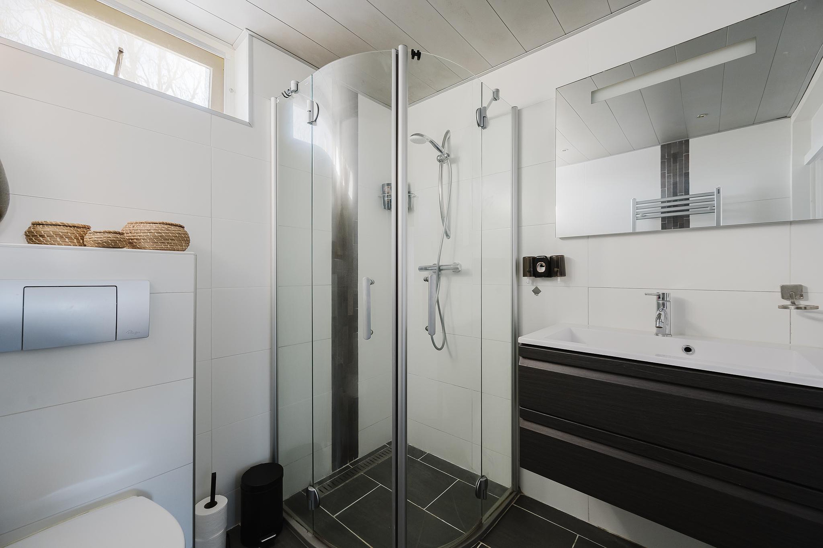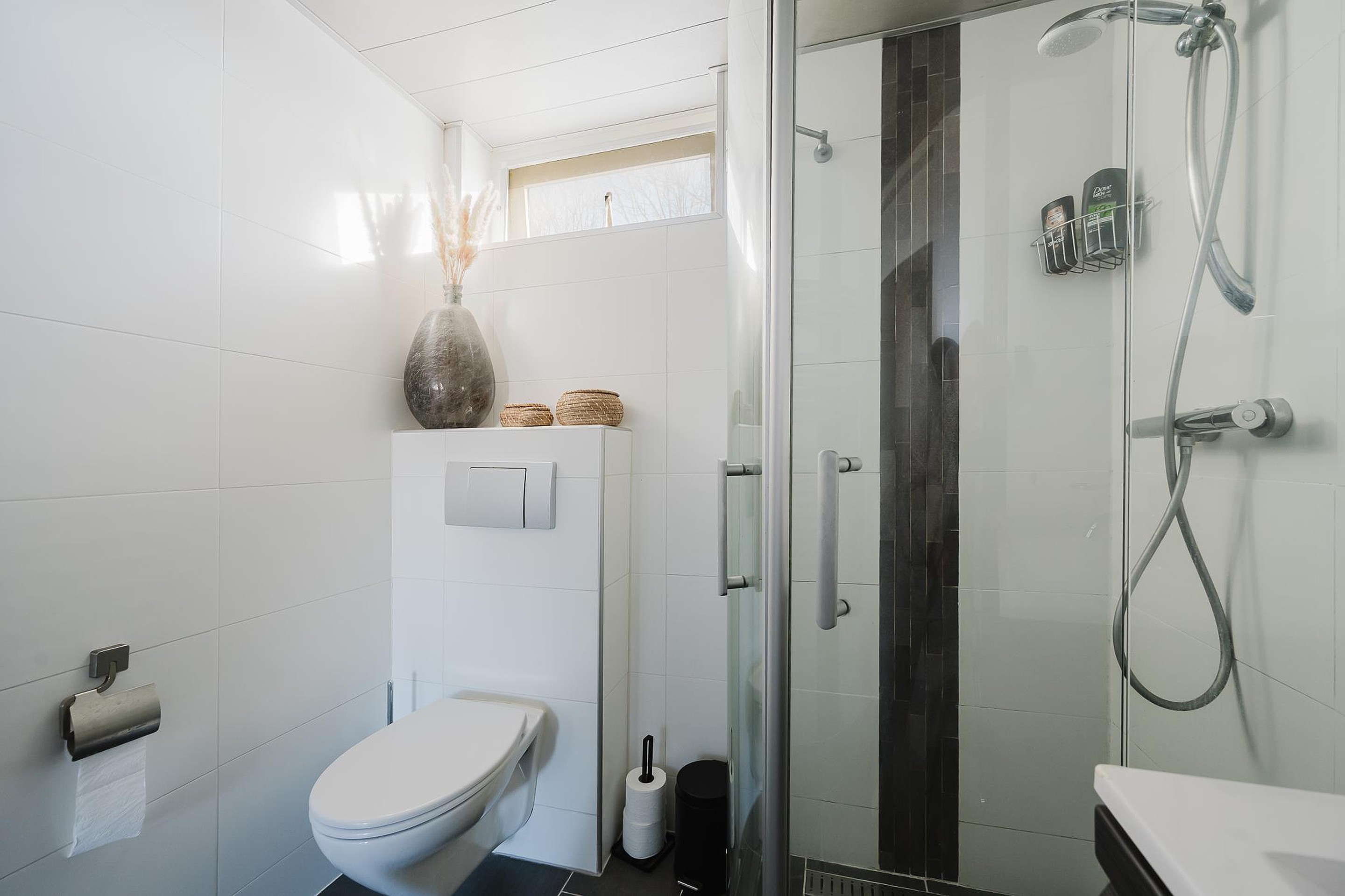 De badkamer is praktisch ingericht en voorzien van een douche, toilet, wastafel en wastafelmeubel.