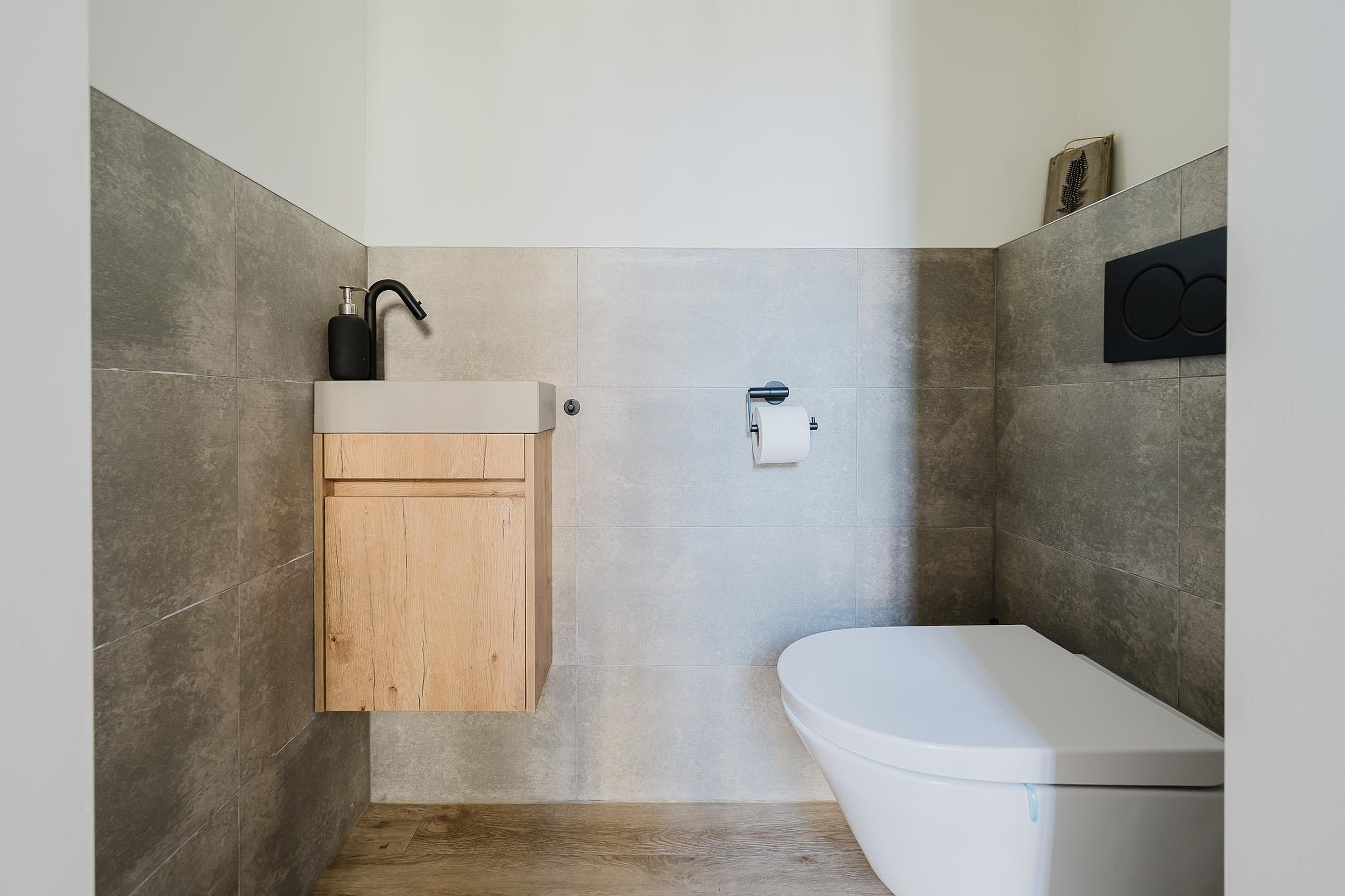 Via de entree kom je binnen in de hal, welke voorheen diende als berging en bij de woning is getrokken. Hier bevinden zich het moderne toilet en de toegang tot de woning.