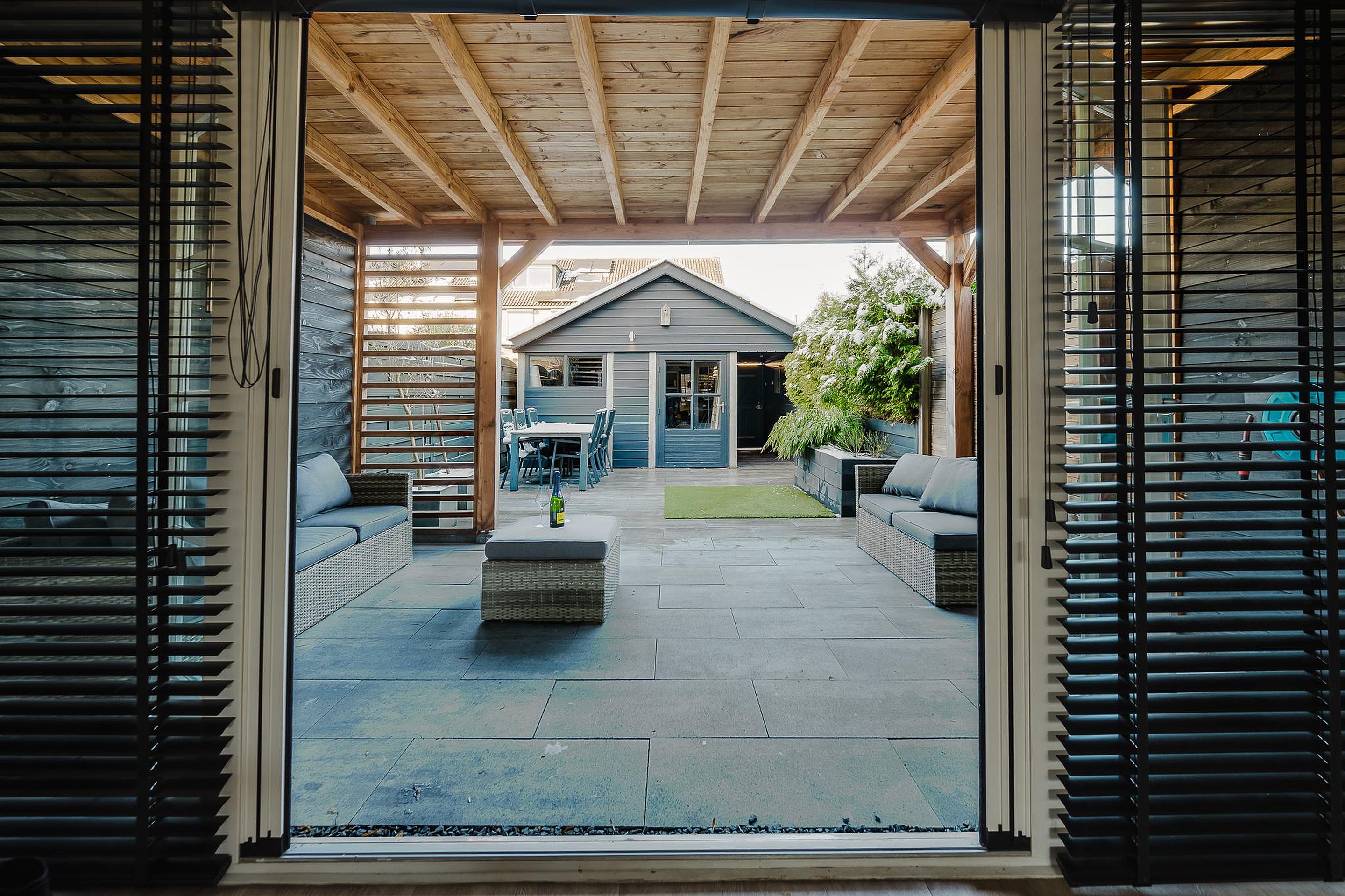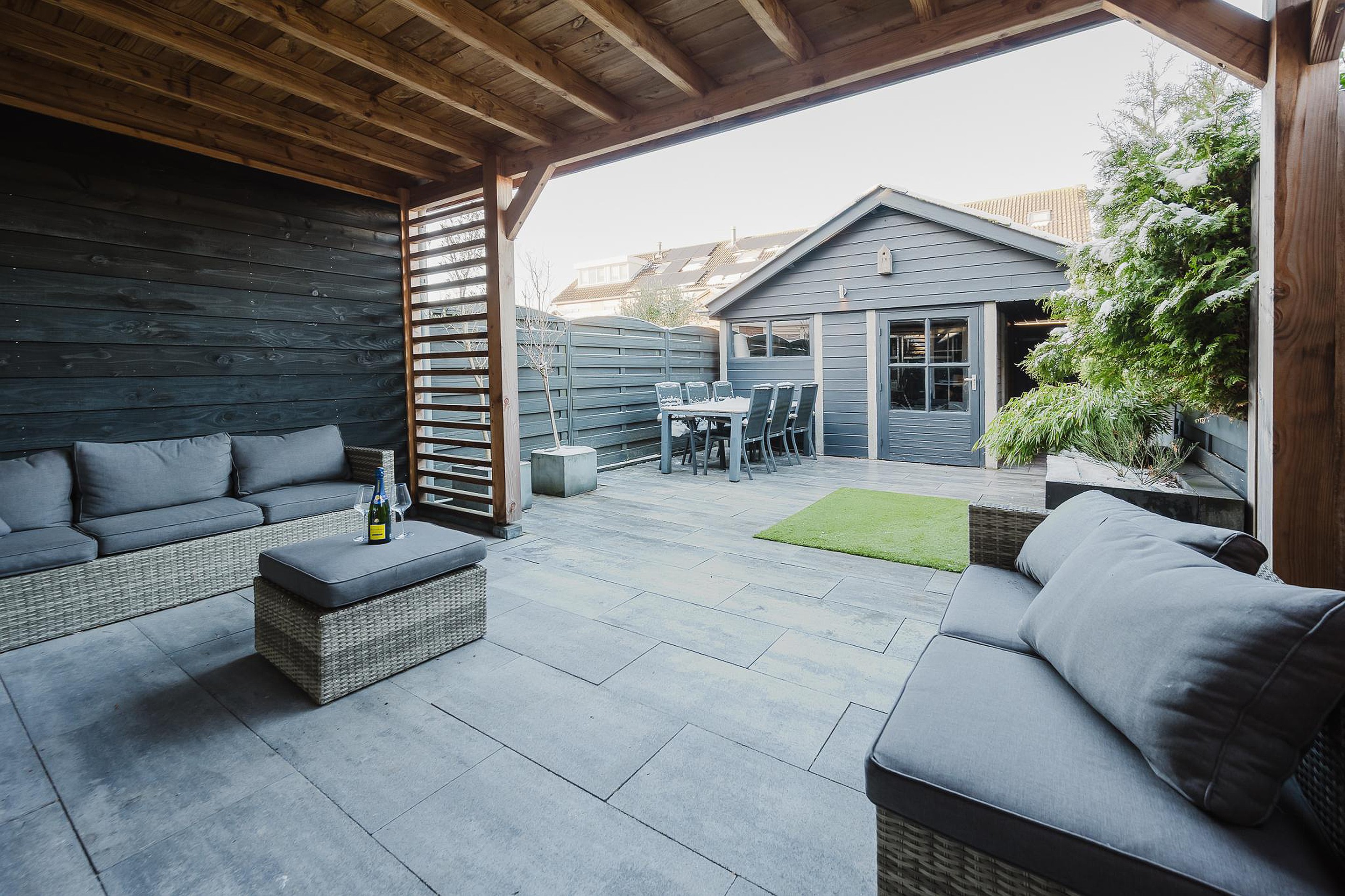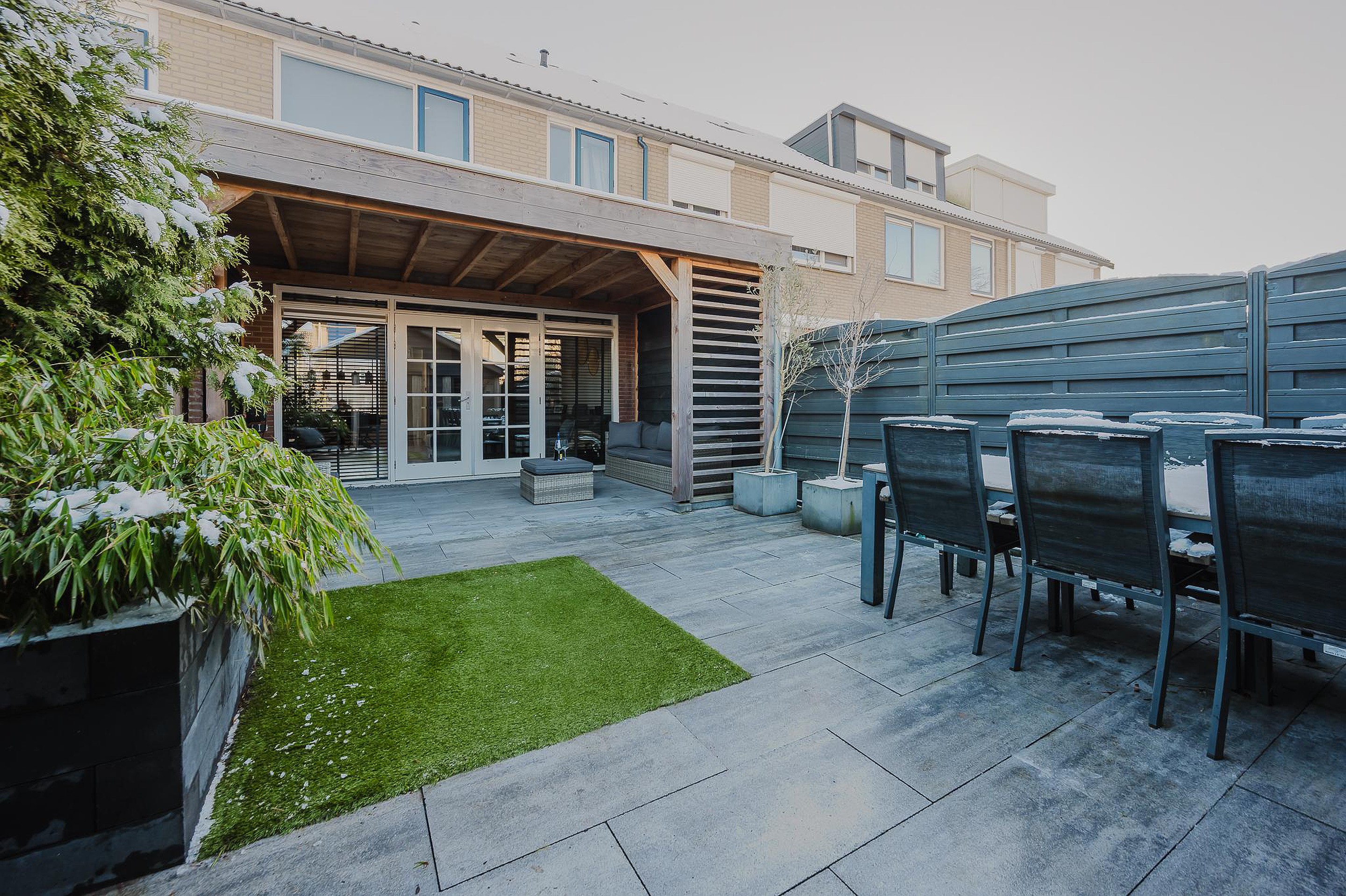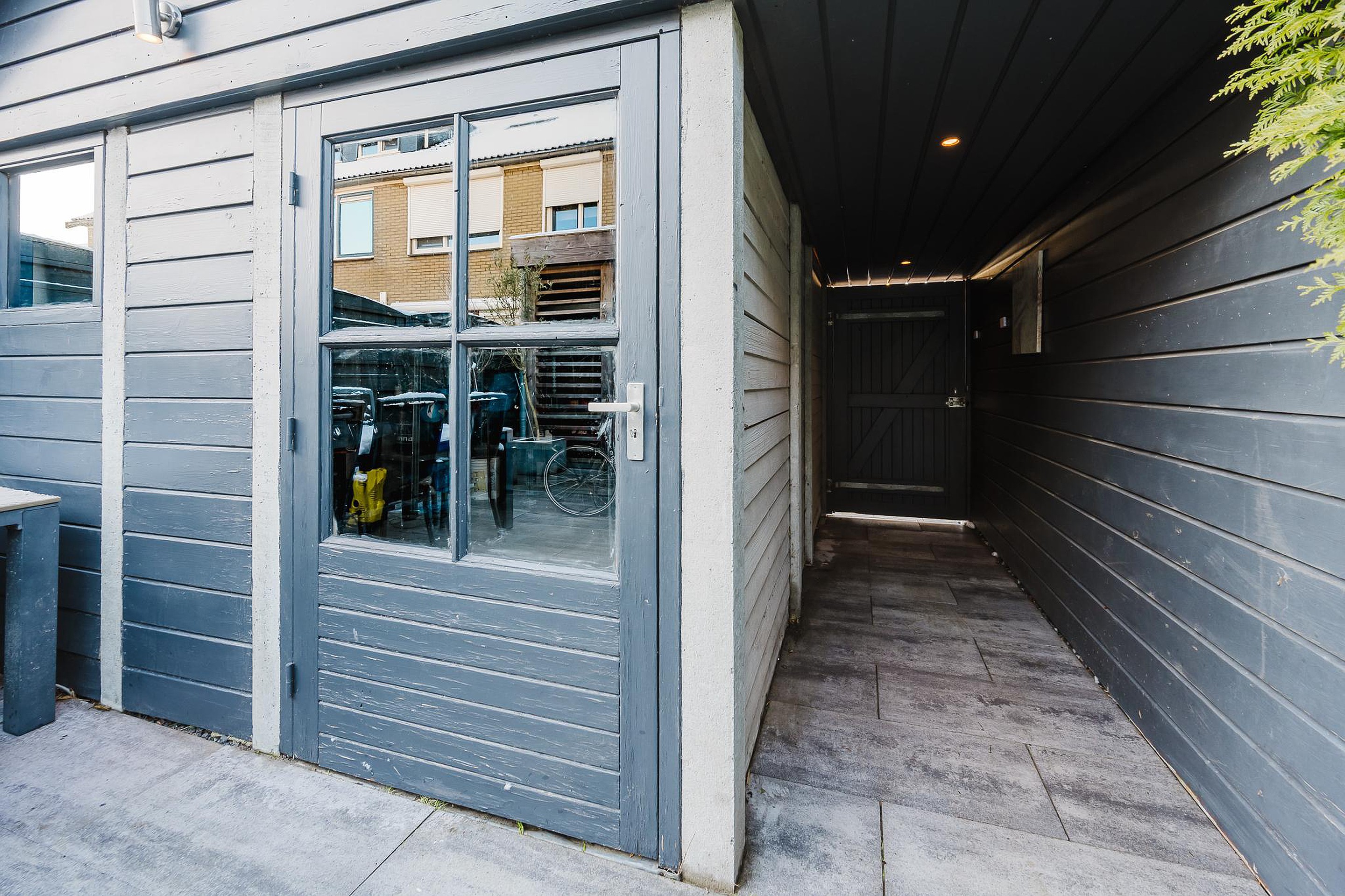 De achtertuin is in 2021 aangelegd en beschikt over een overkapping en een grote schuur van circa 14 m2, ideaal voor opslag, hobby’s of fietsen.