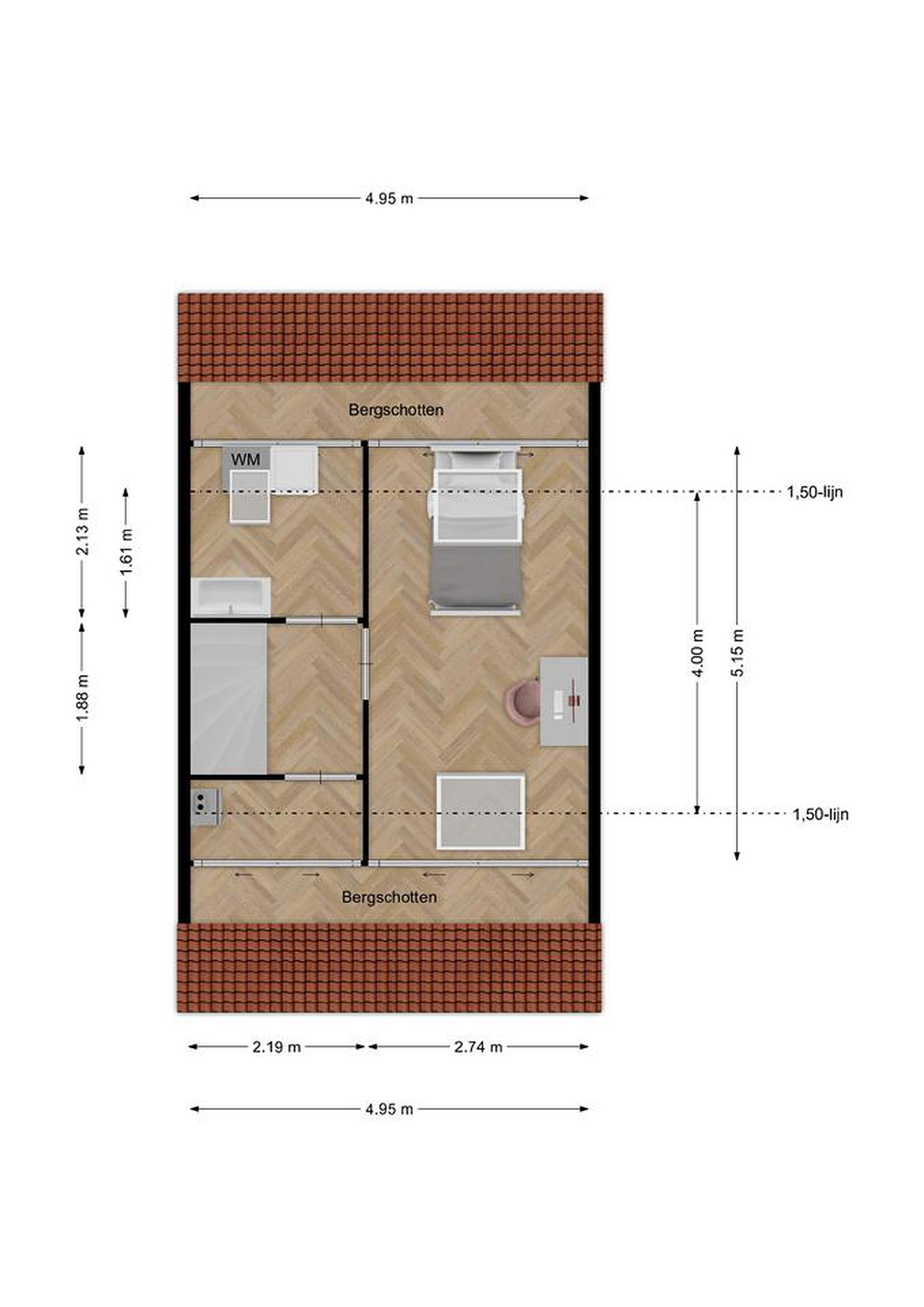 Ook bevindt zich hier de vierde slaapkamer, een ruime en lichte kamer met twee grote dakramen en een airco die zowel kan koelen als verwarmen.