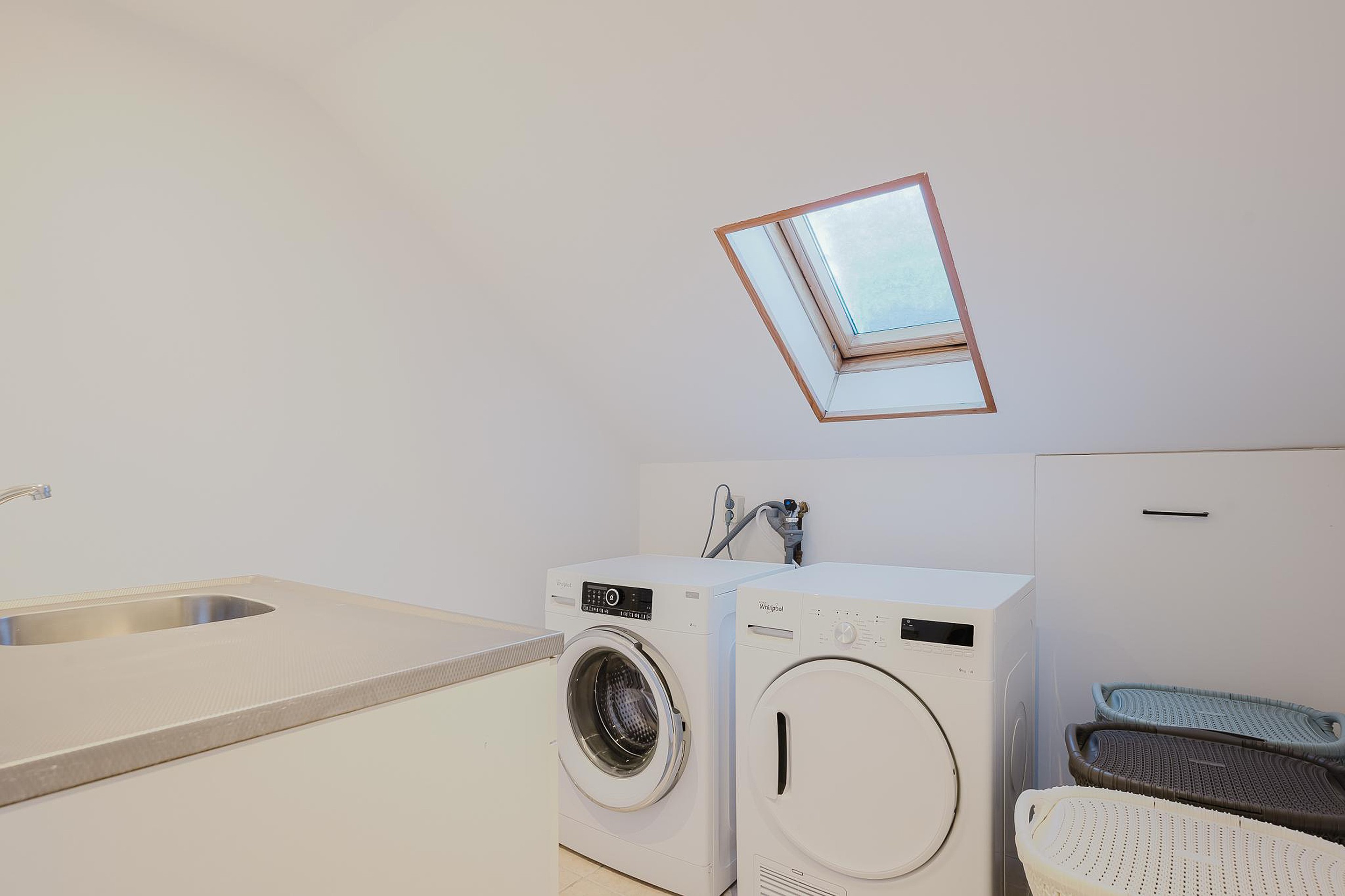 Via de trap bereik je de tweede verdieping met een wasruimte, voorzien van wasmachineaansluiting, wastafel en ruimte voor een droger. Daarnaast is hier extra bergruimte aanwezig door middel van bergschotten.