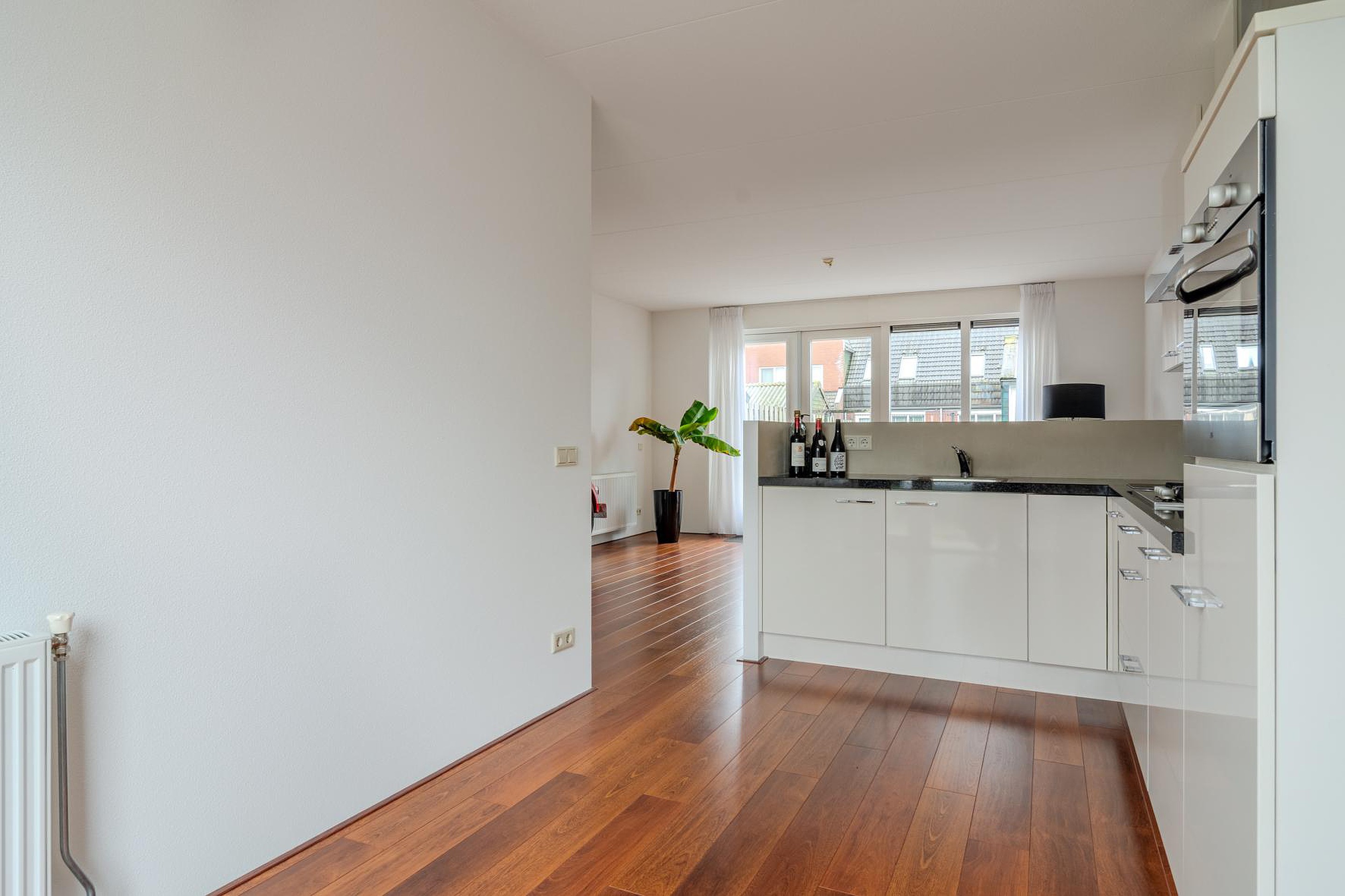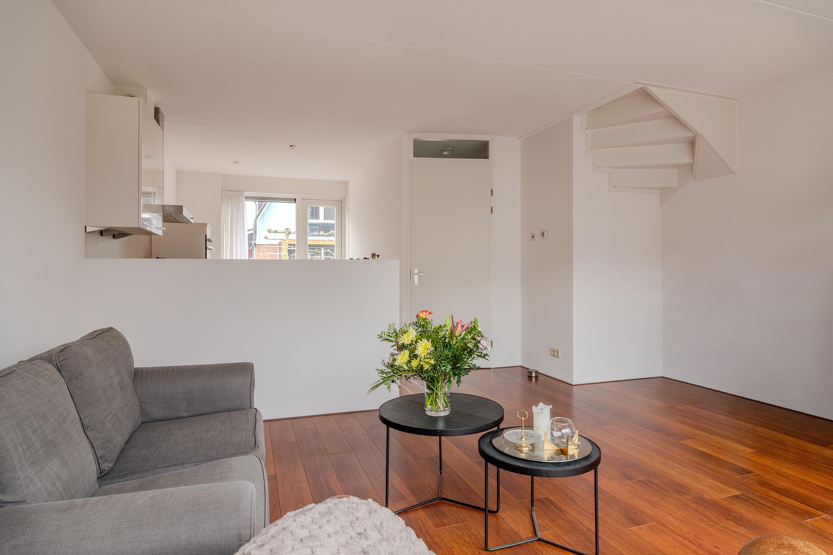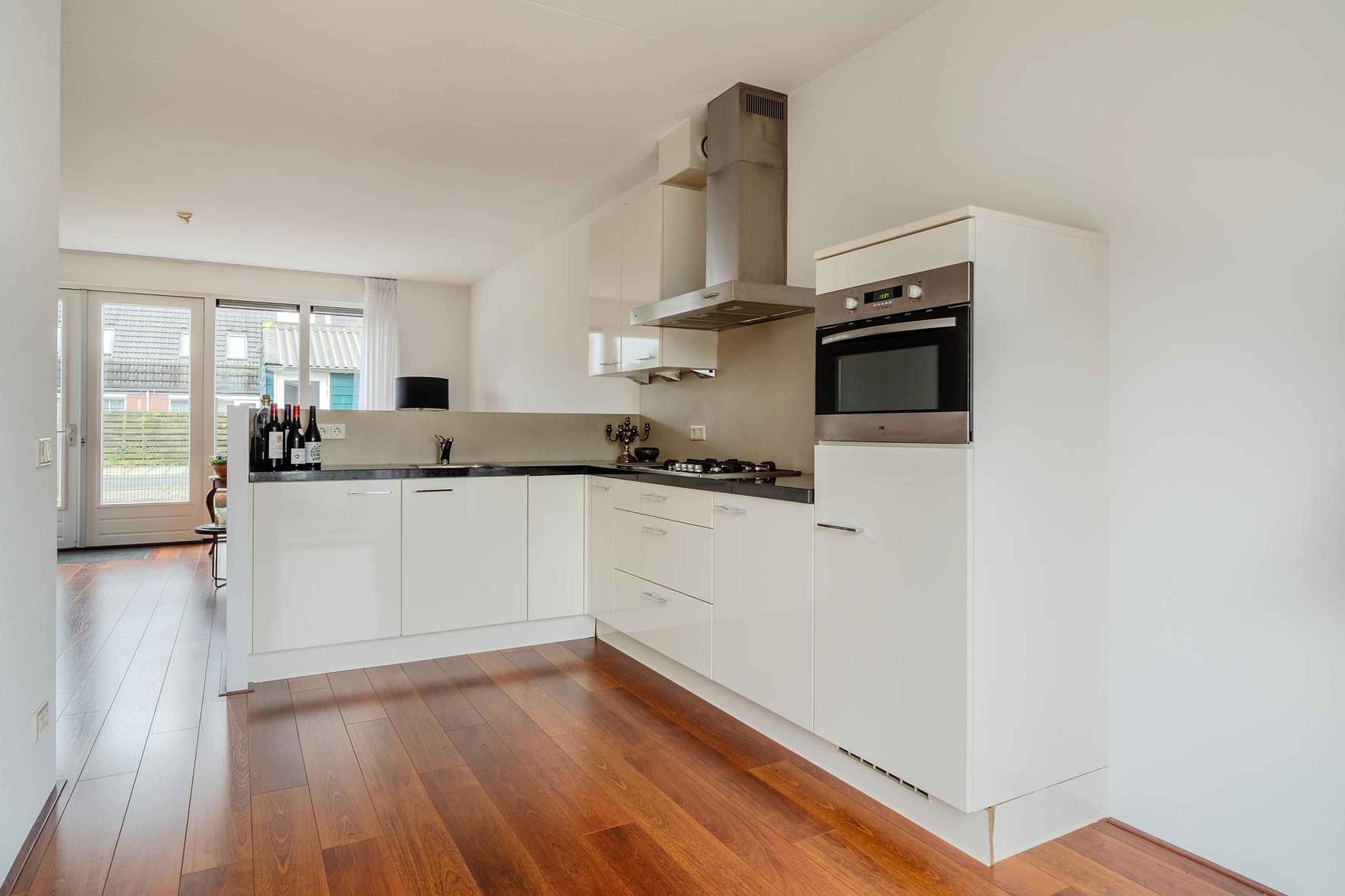 Via de entree kom je binnen in de hal met toegang tot de woonkamer. De tuingerichte woonkamer is heerlijk licht en heeft openslaande deuren naar de achtertuin op het zuid/westen. Aan de voorzijde bevindt zich de keuken, uitgevoerd in een praktische L-opstelling en voorzien van diverse inbouwapparatuur waardoor je hier comfortabel kunt koken met alles binnen handbereik. Het leuke van deze woning is dat ook de keuken een deur heeft naar de voortuin.