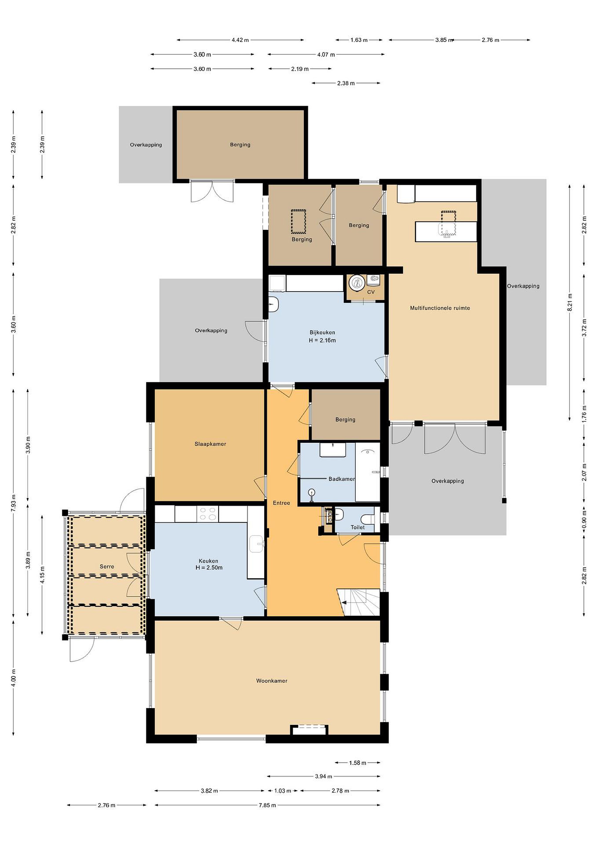 Begane grond Hal met toilet, trapopgang en meterkast. Woonkamer, gesloten keuken met toegang tot de serre, slaapkamer, badkamer, berging, bijkeuken met toegang tot de multifunctionele ruimte.
