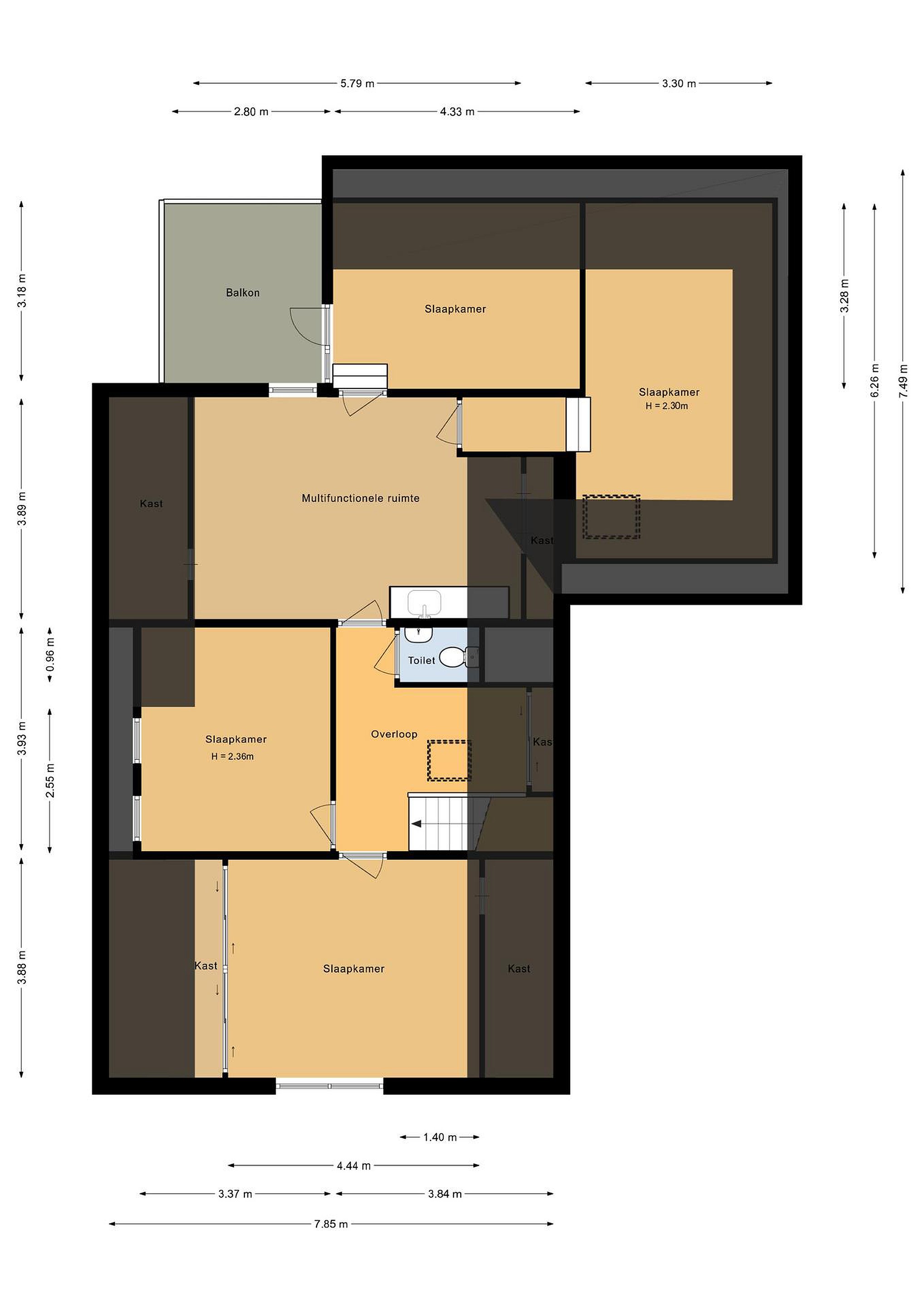 Eerste verdieping Overloop met vide en toilet, 4 slaapkamers, tussenruimte naar de slaapkamers.