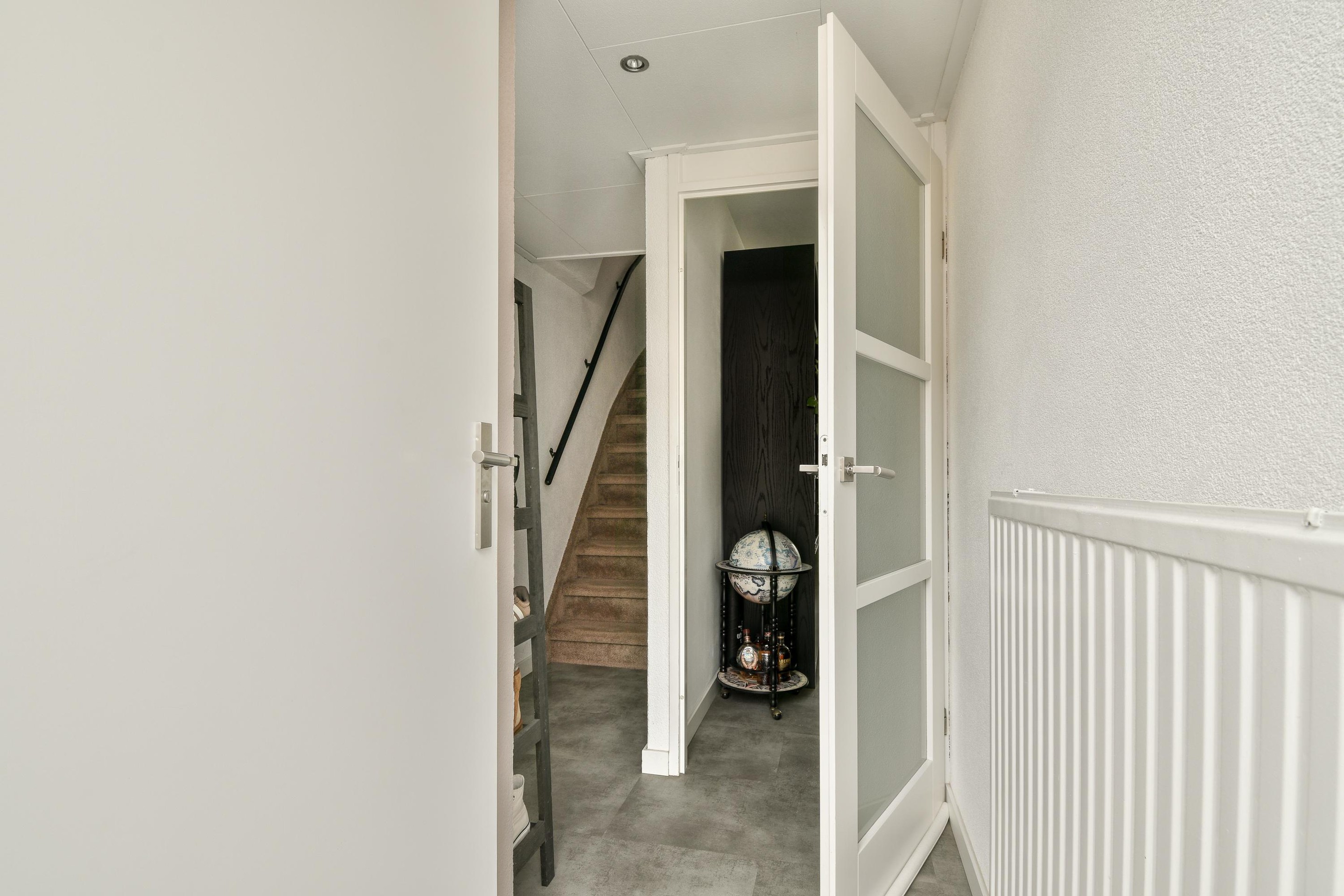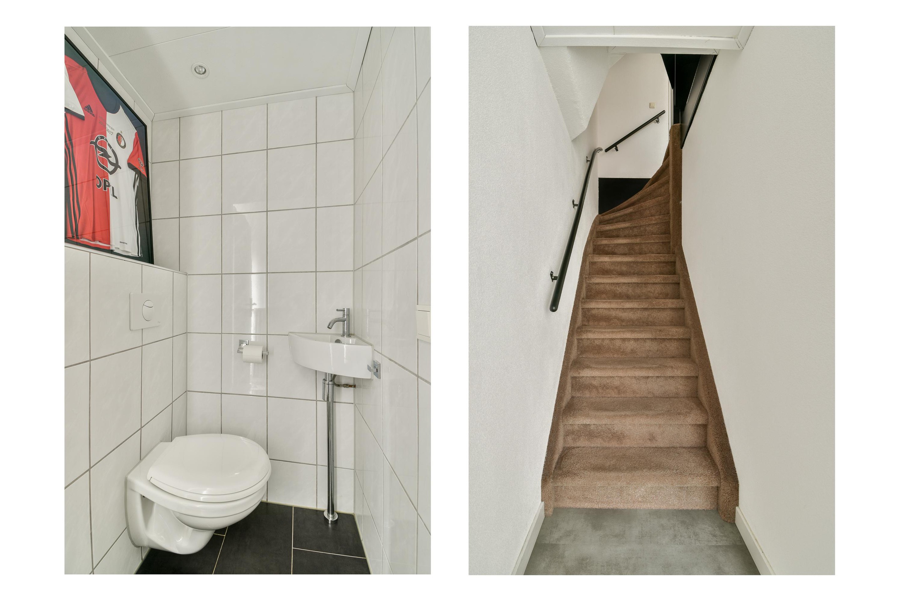 Hal met toiletruimte, toegang tot de tuin en trap naar de verdieping.