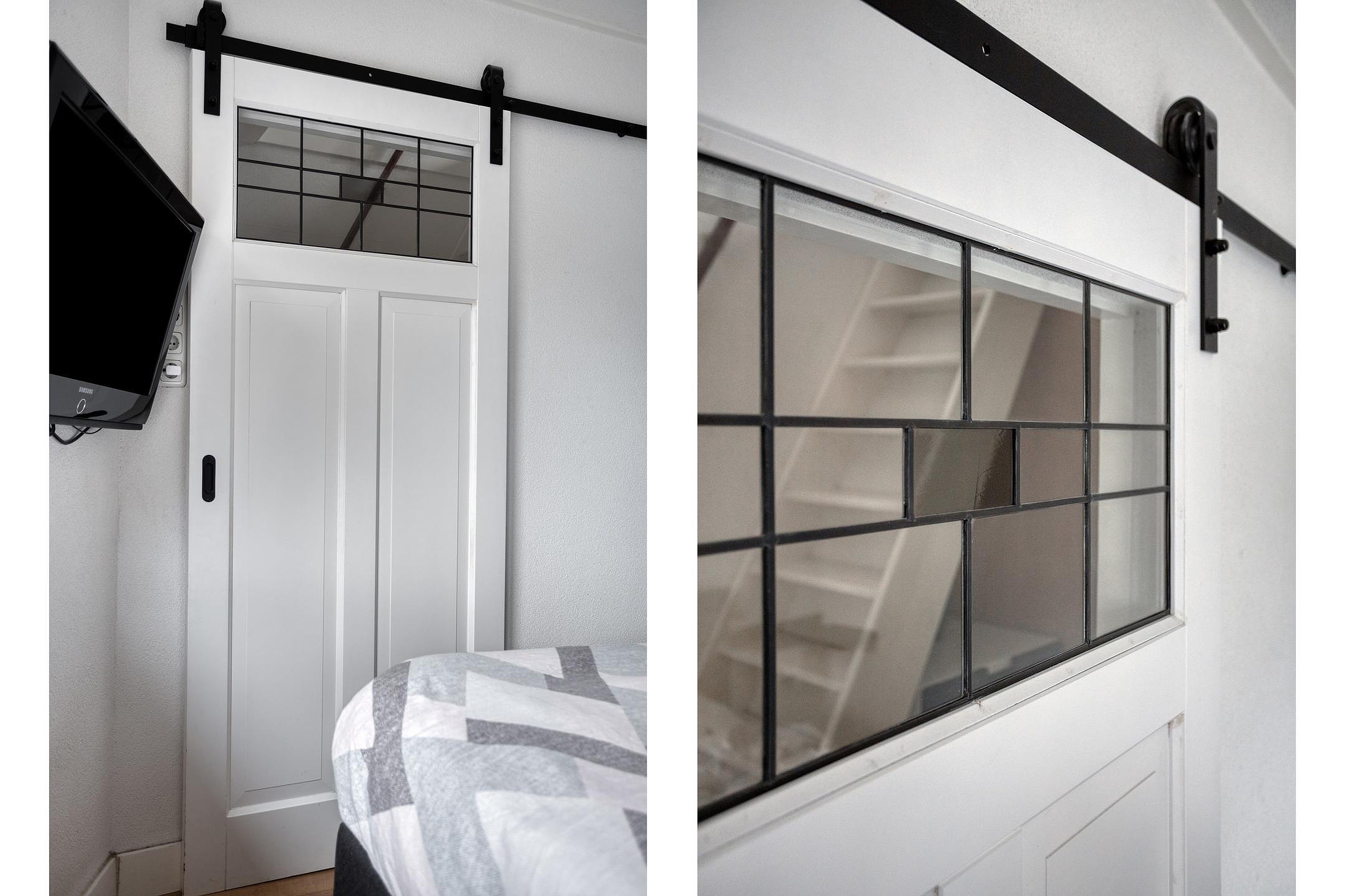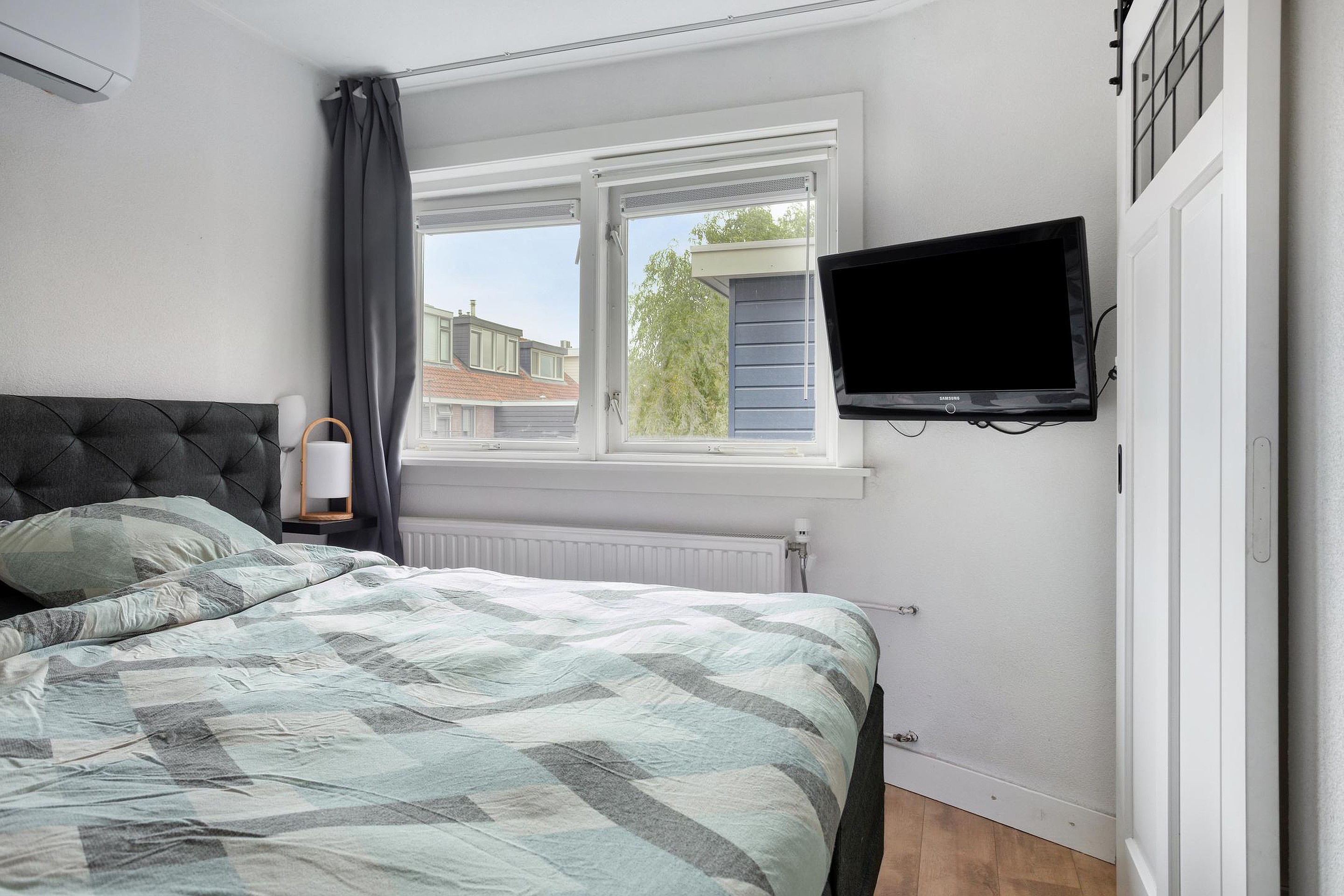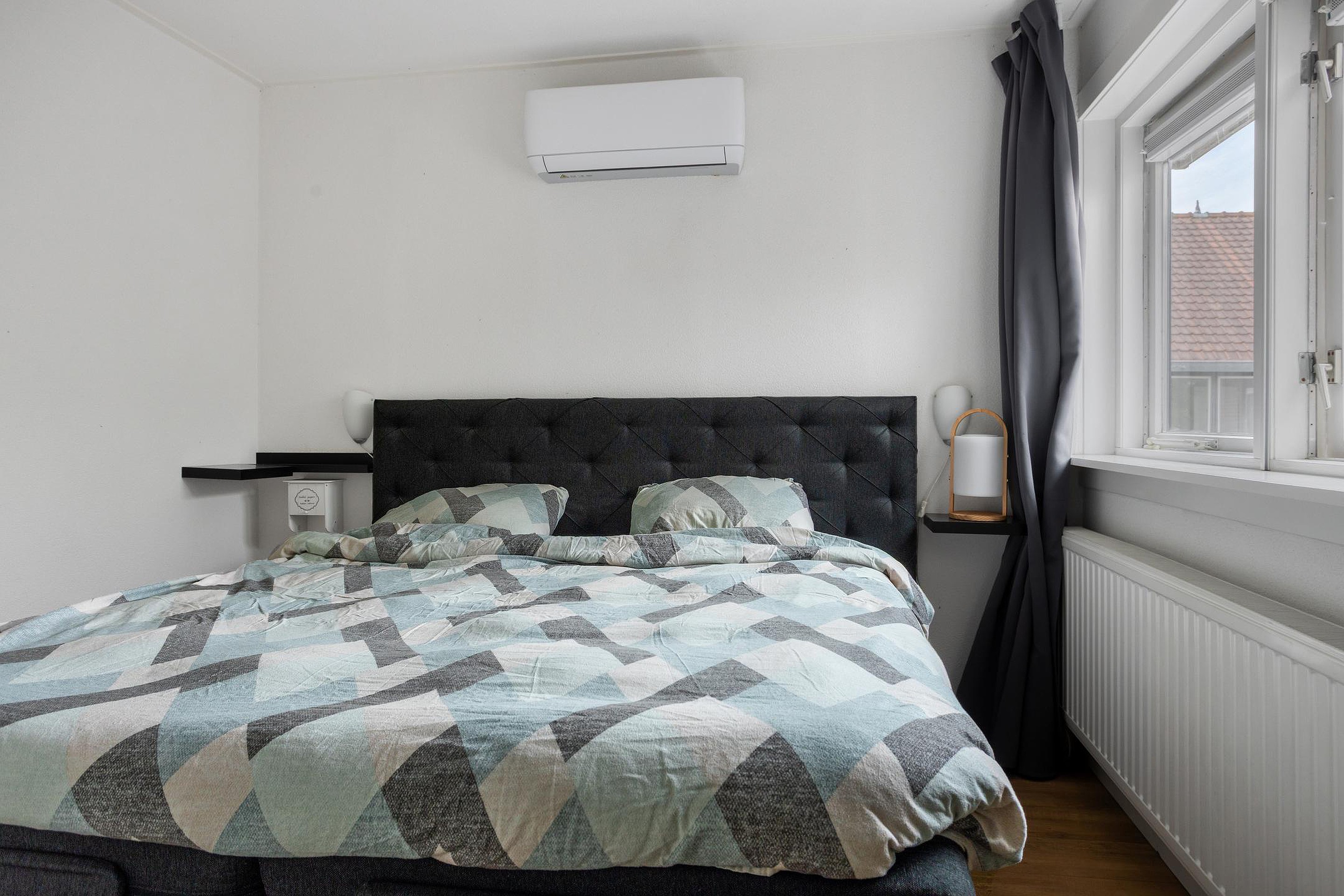 Master bedroom aan de achterzijde met laminaatvloer afwerking en toegankelijk via een schuifdeur. Deze kamer is vv een airconditioning die kan verwarmen en koelen.