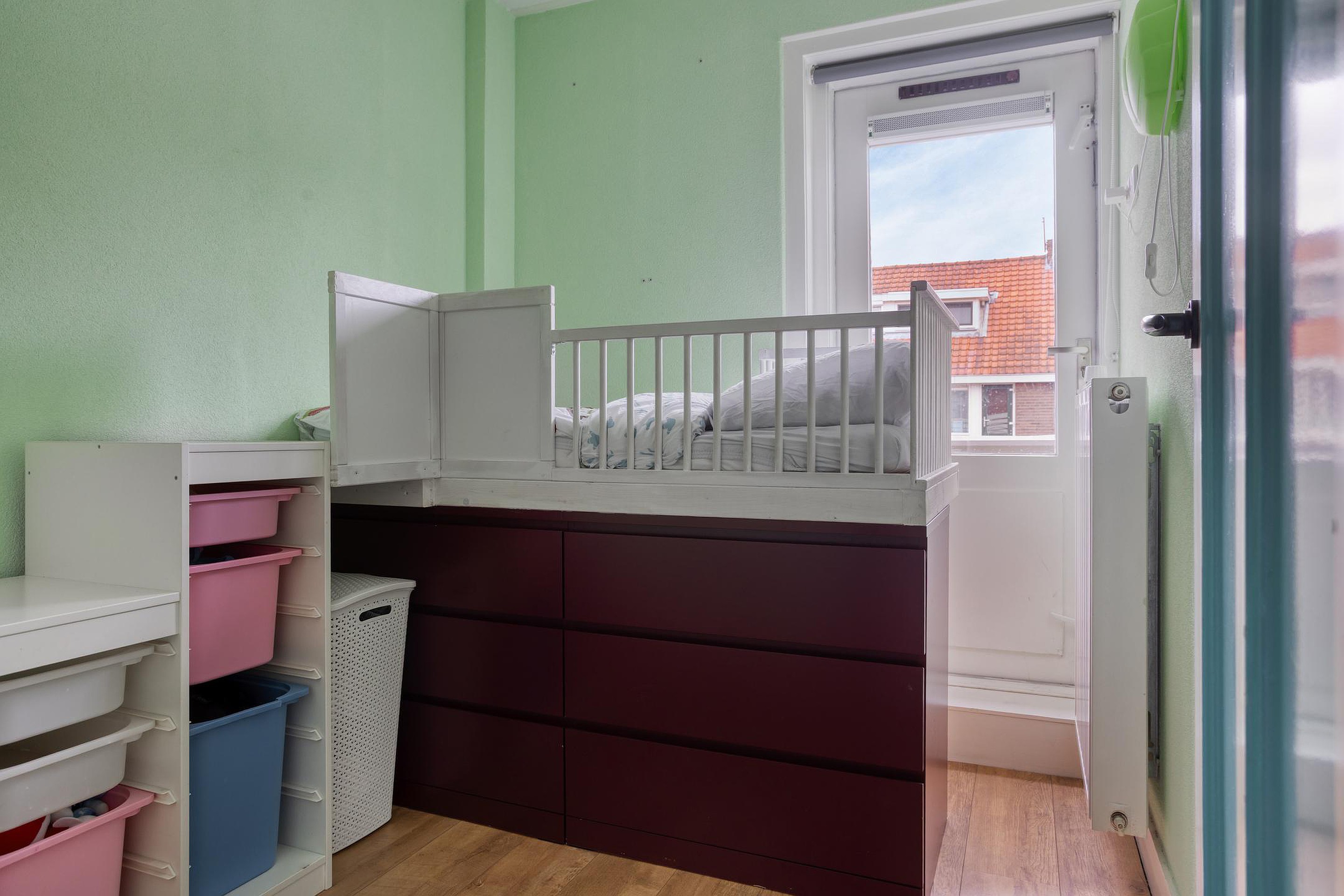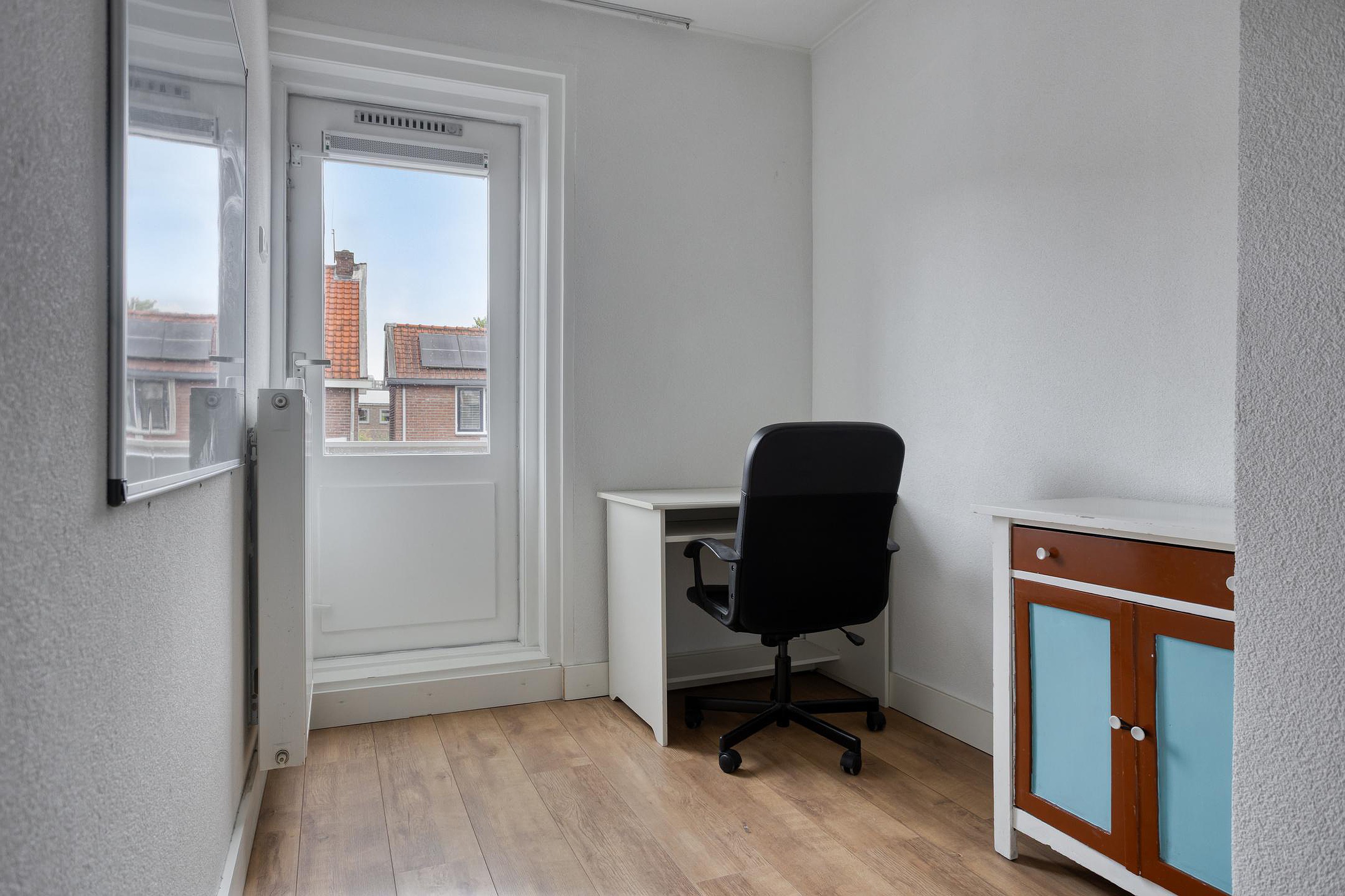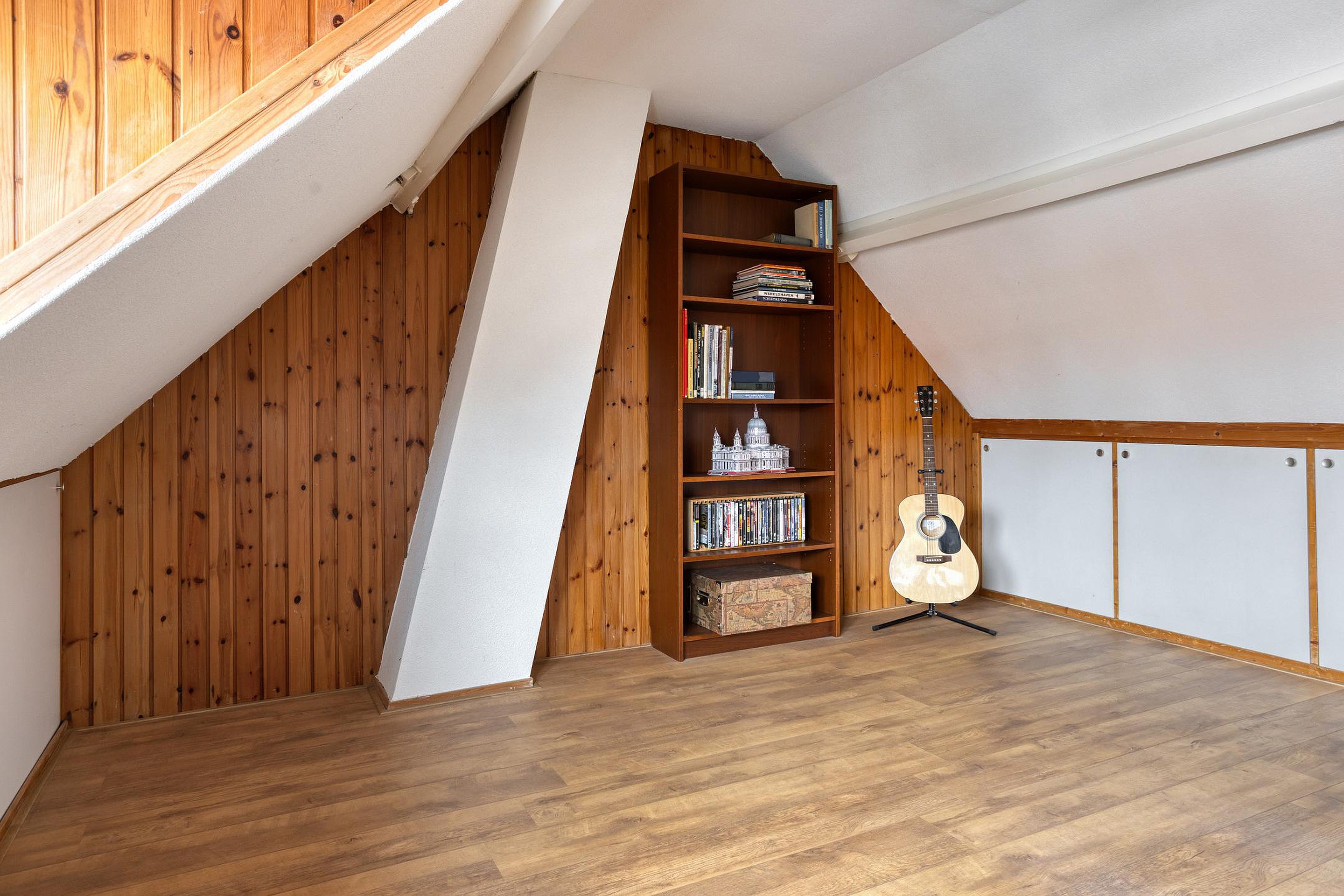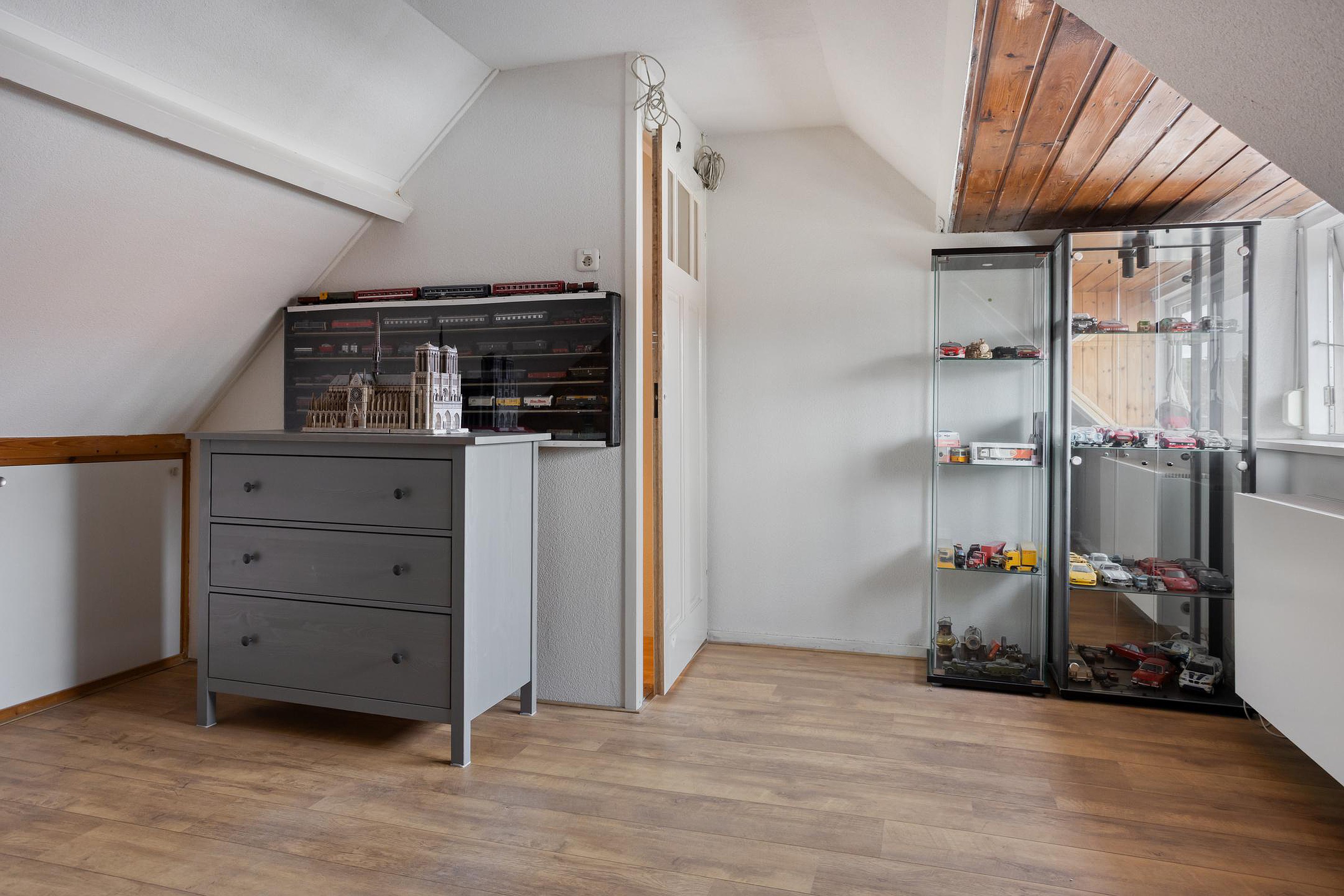 Slaapkamer aan met laminaatvloer en dakkapel. Bergruimte achter de knieschotten.