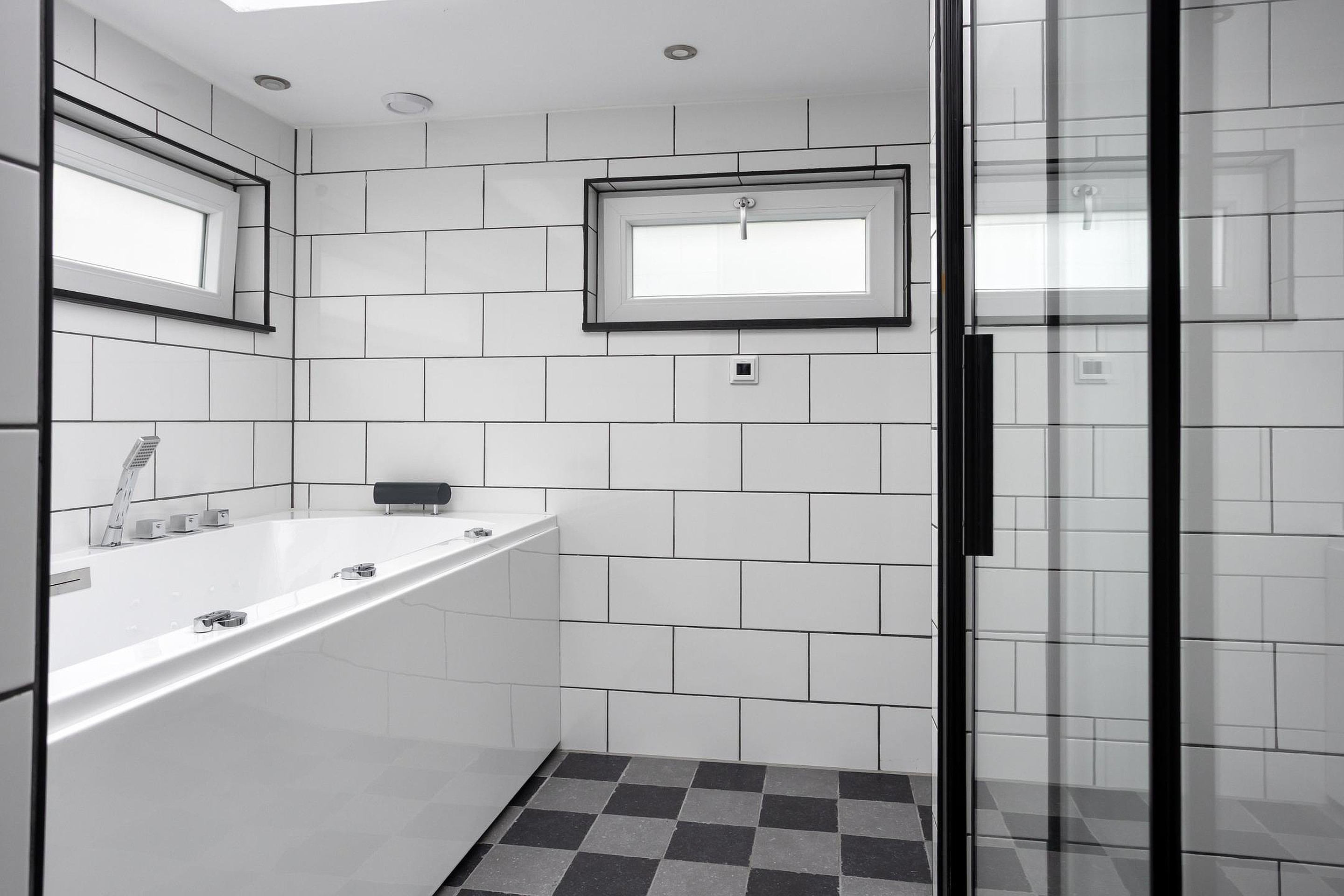 De grote moderne badkamer is voorzien van elektrische vloerverwarming en van het volgende sanitair: