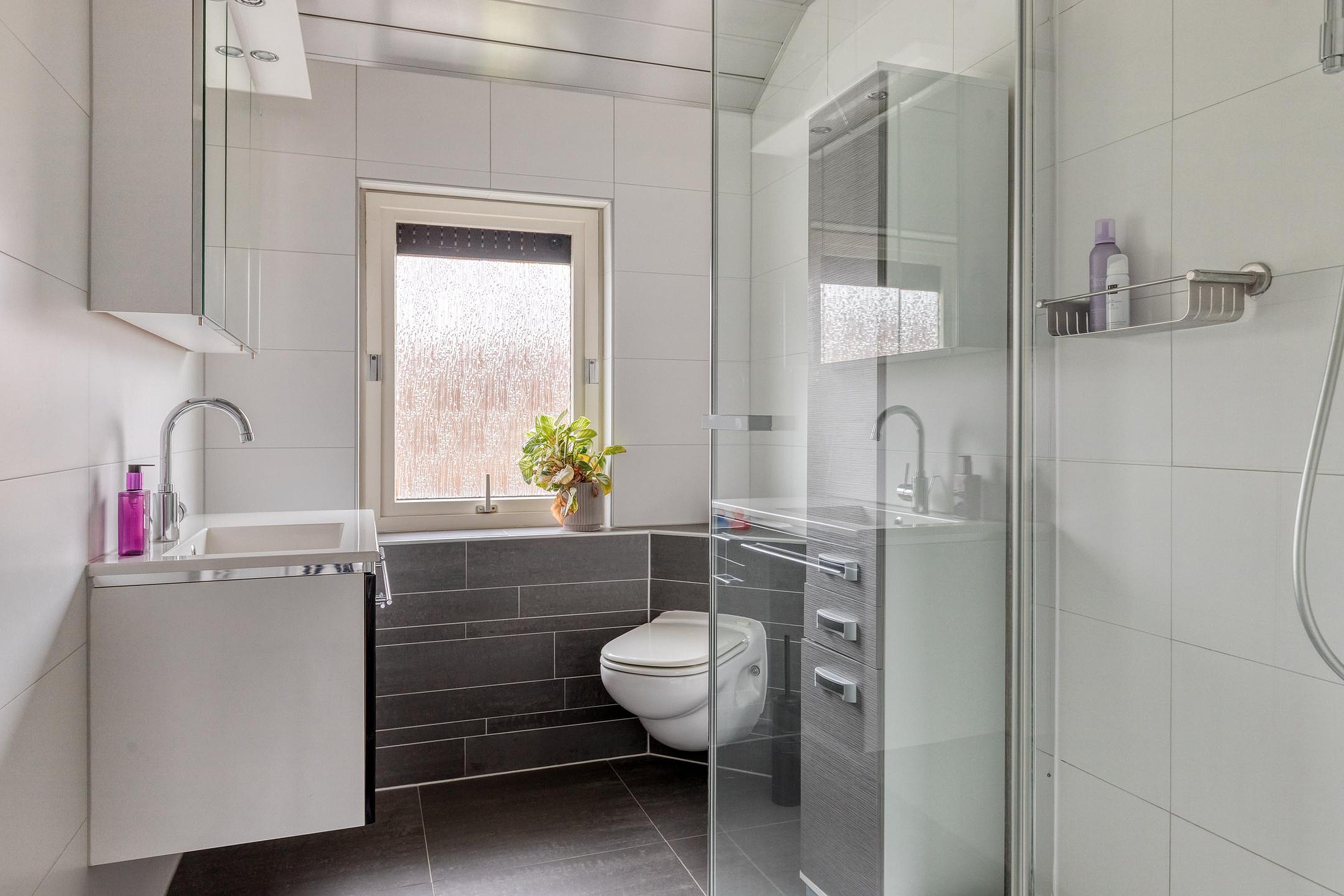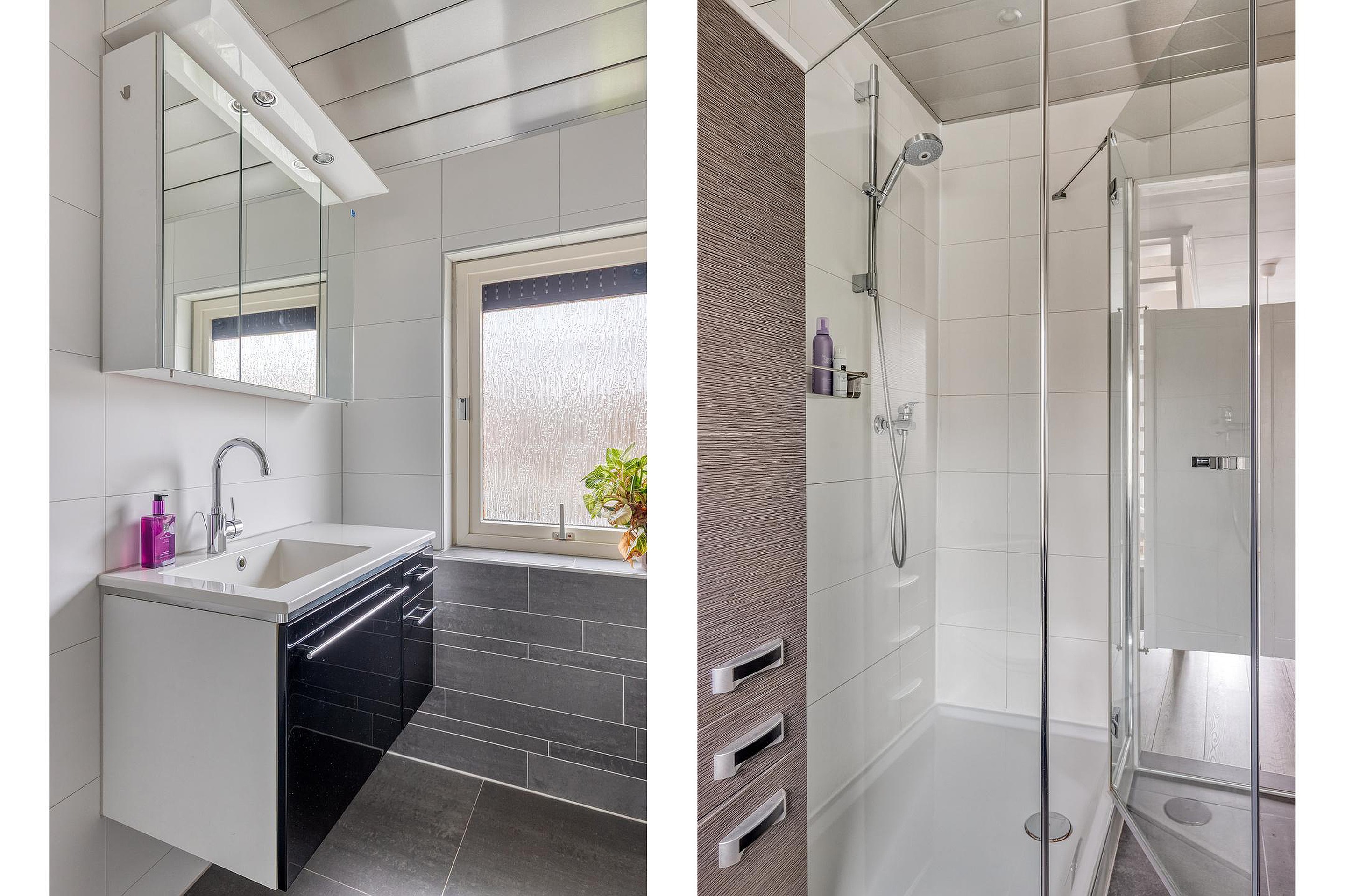 Moderne badkamer met grote douchecabine, 2e toilet en wastafelmeubel met spiegelkast.