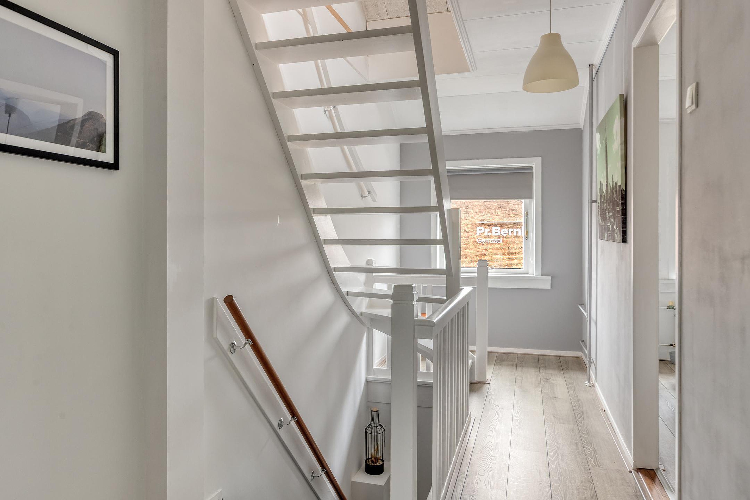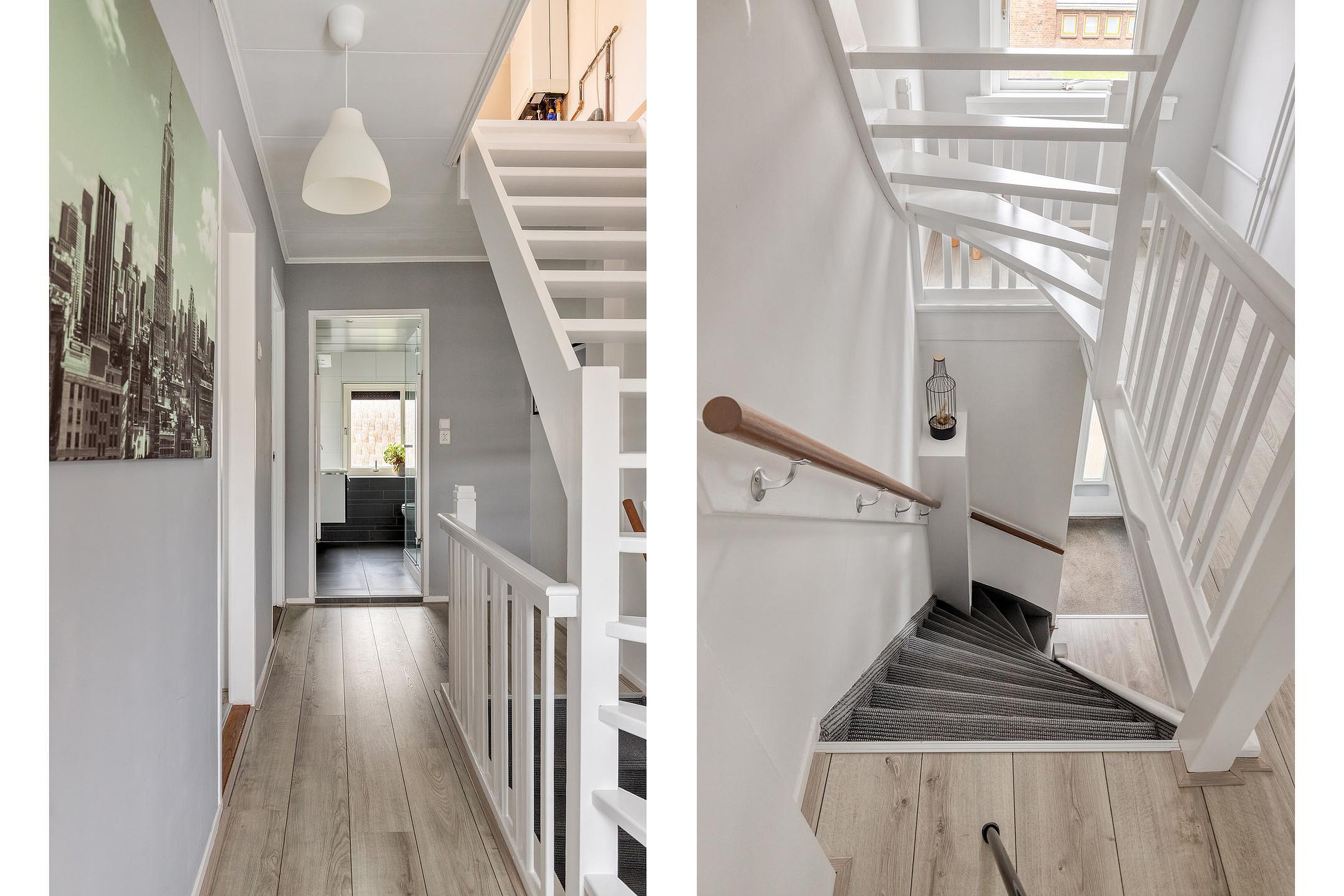 Met trap naar de verdieping, kelderkast en toegang tot de woonkamer. Leuk detail is het fraaie raam wat zorgt voor extra daglicht in de woonkamer.