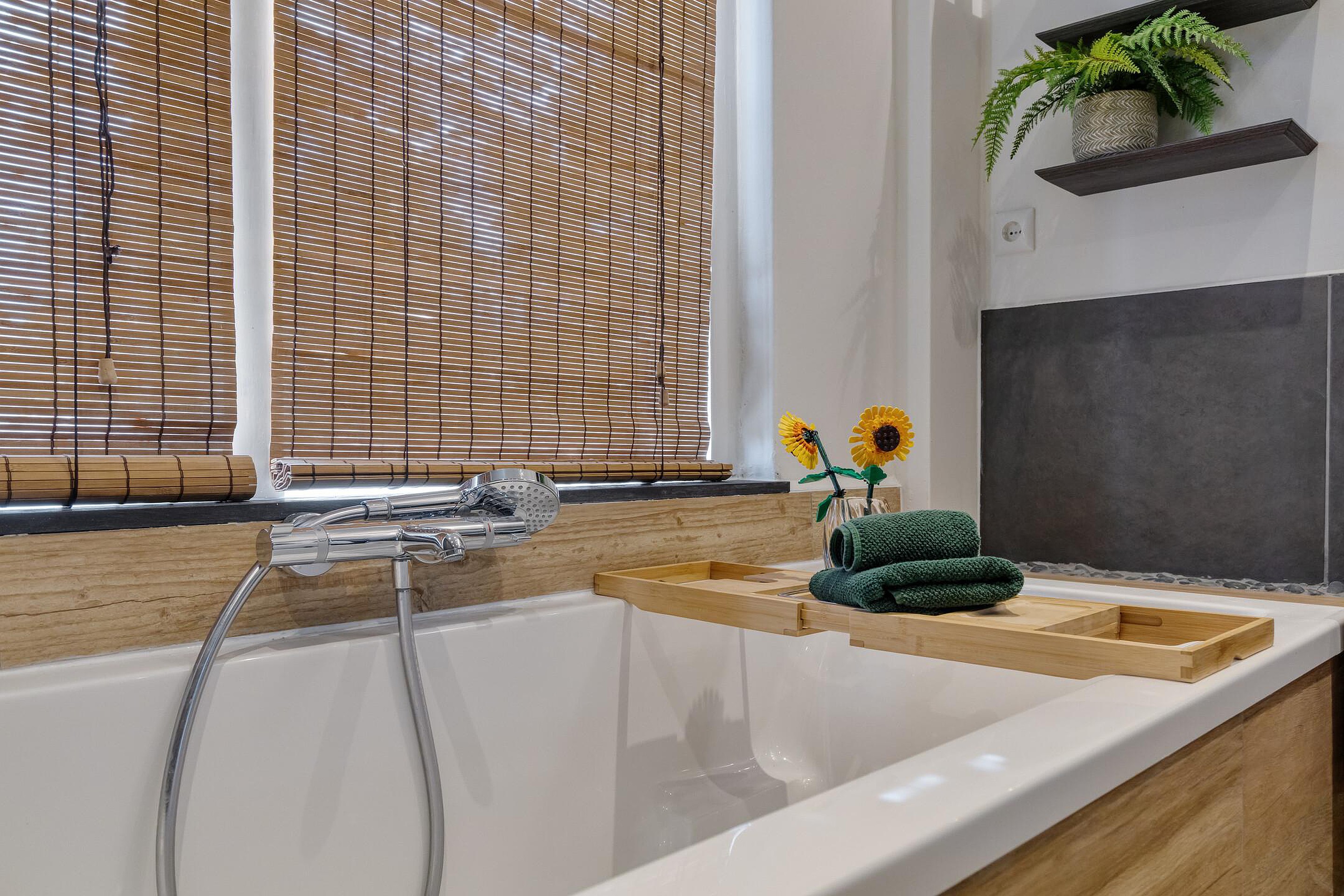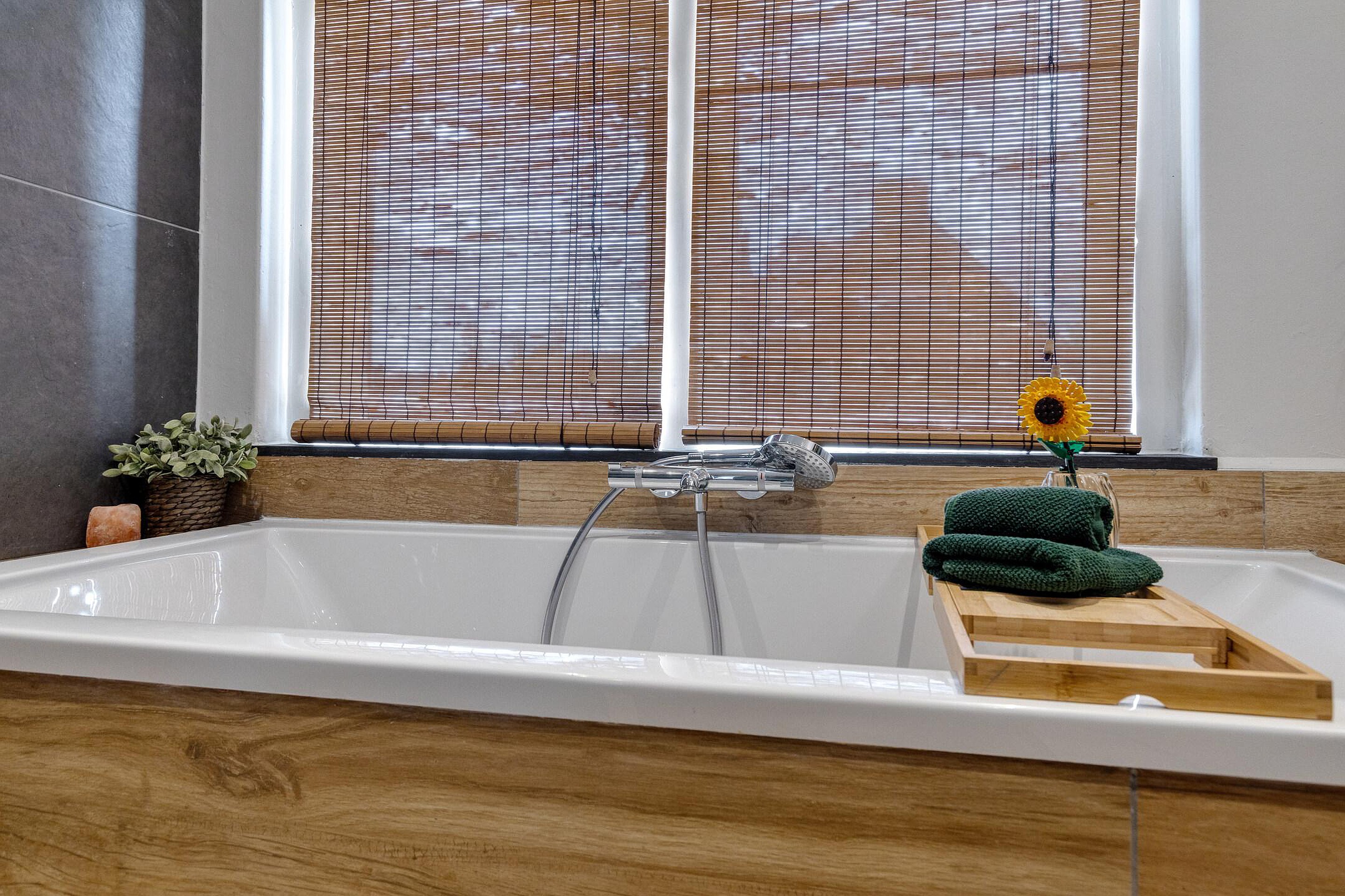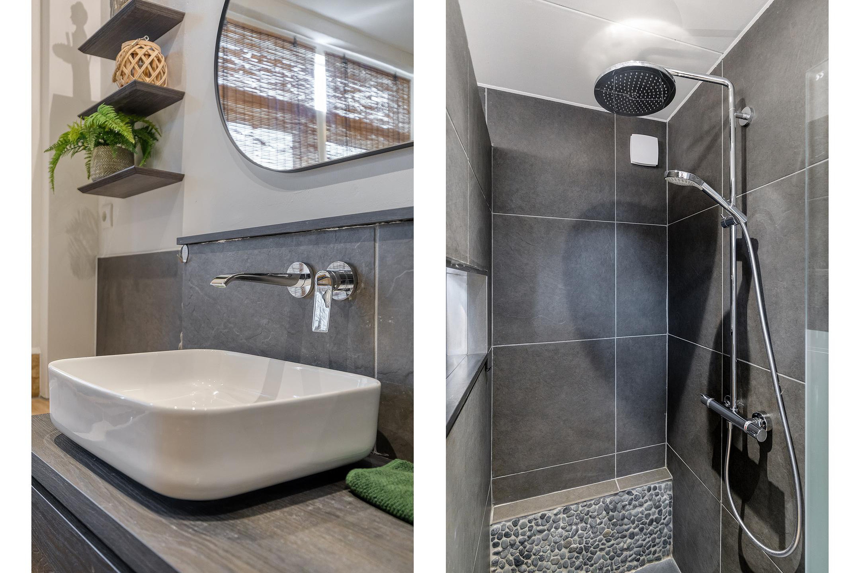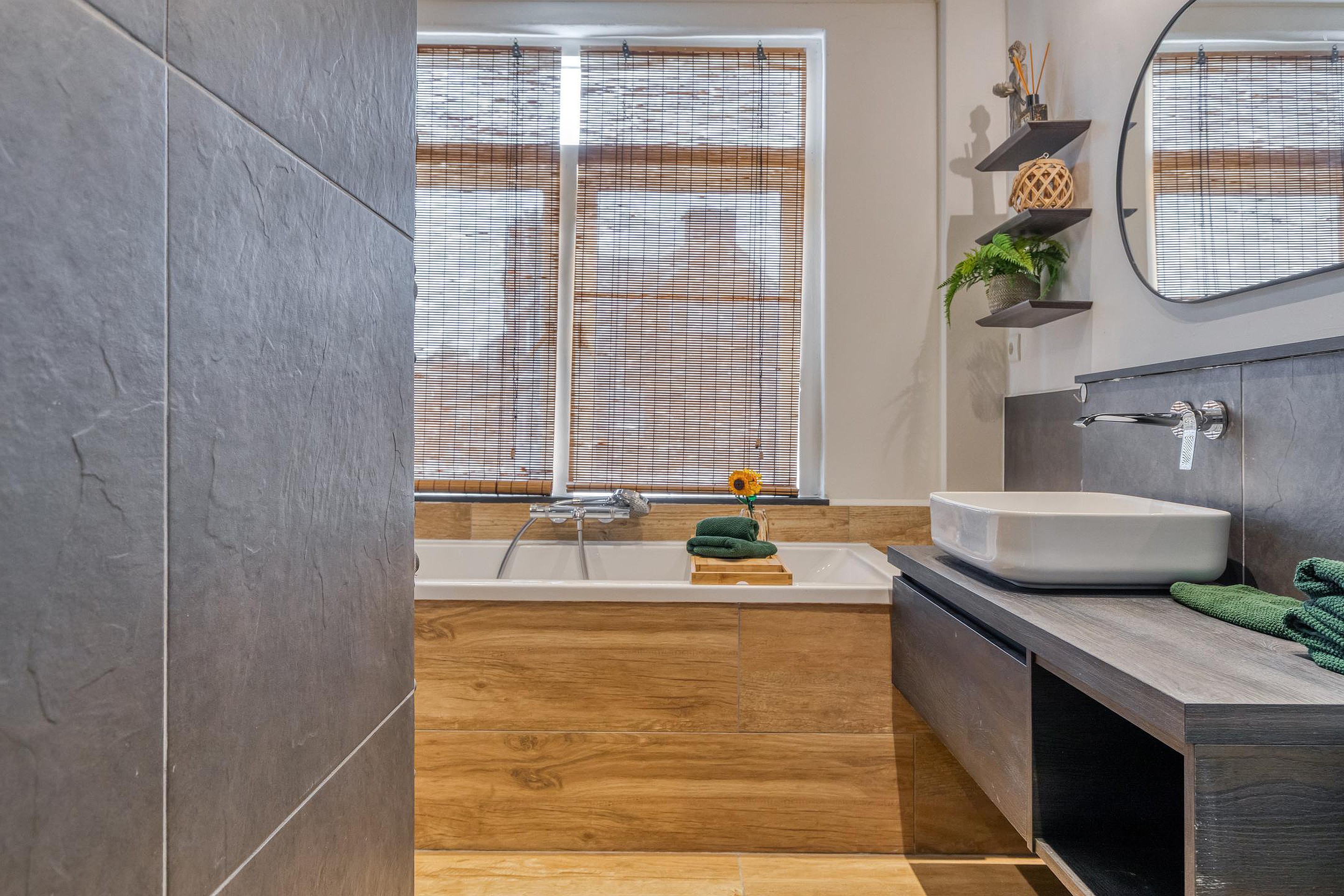 Moderne badkamer v.v. inloopdouche, ligbad en wastafelmeubel.