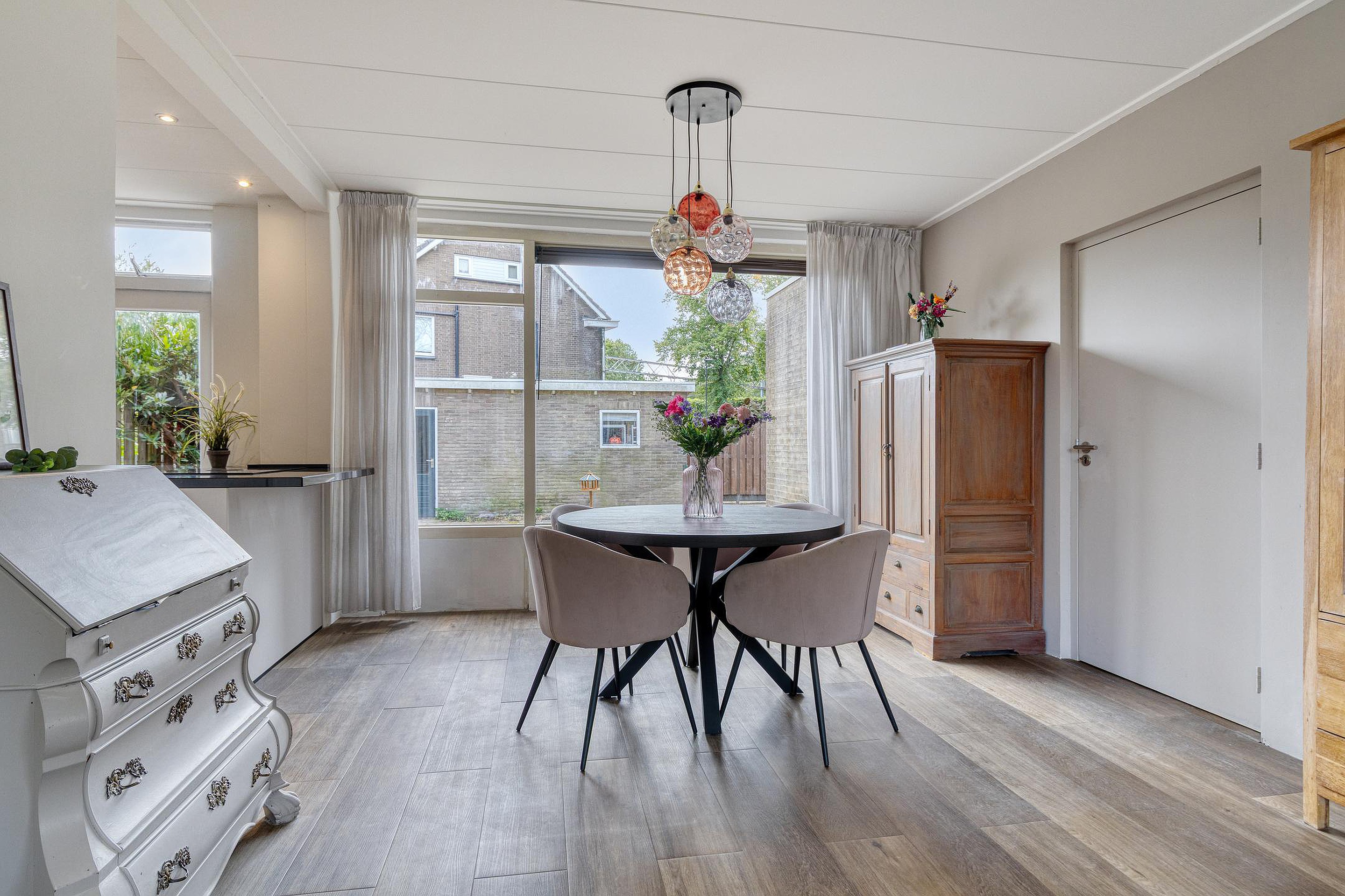 Lichte woonkamer met toegang tot de half open keuken en doorgang tot de naast gelegen praktijkruimte.