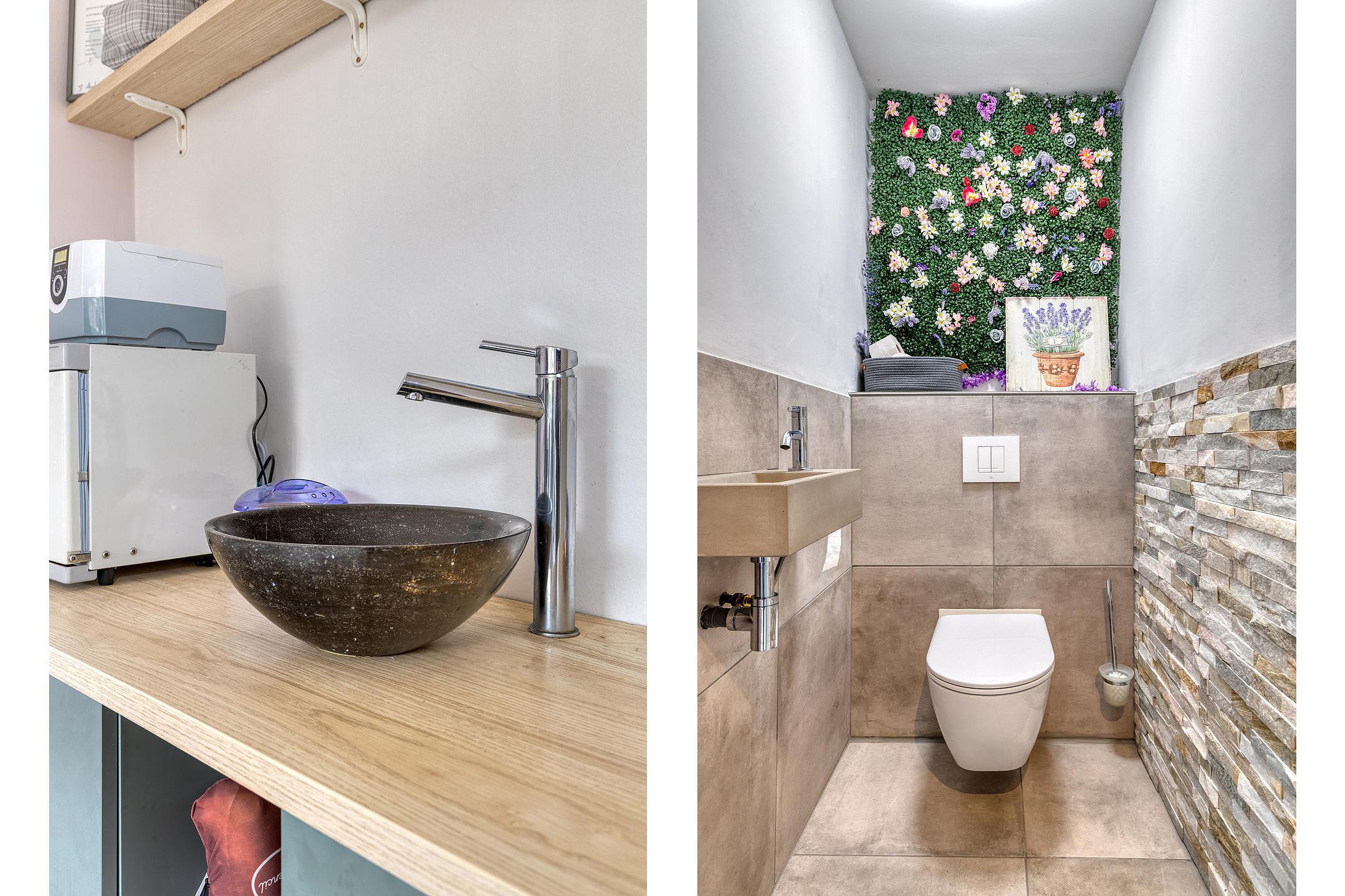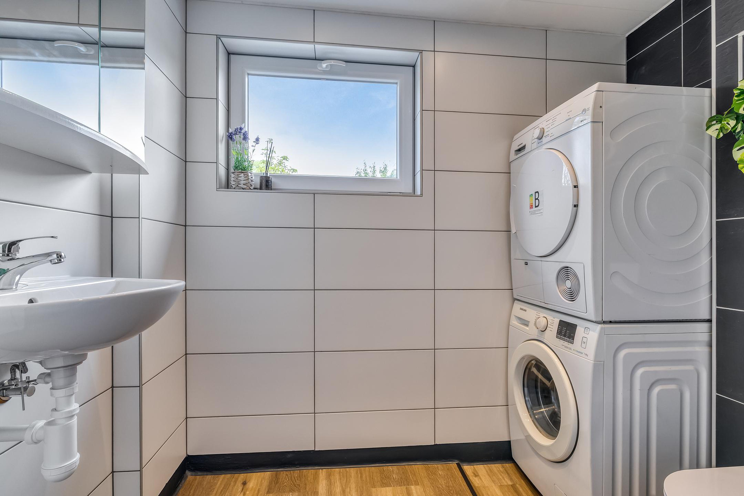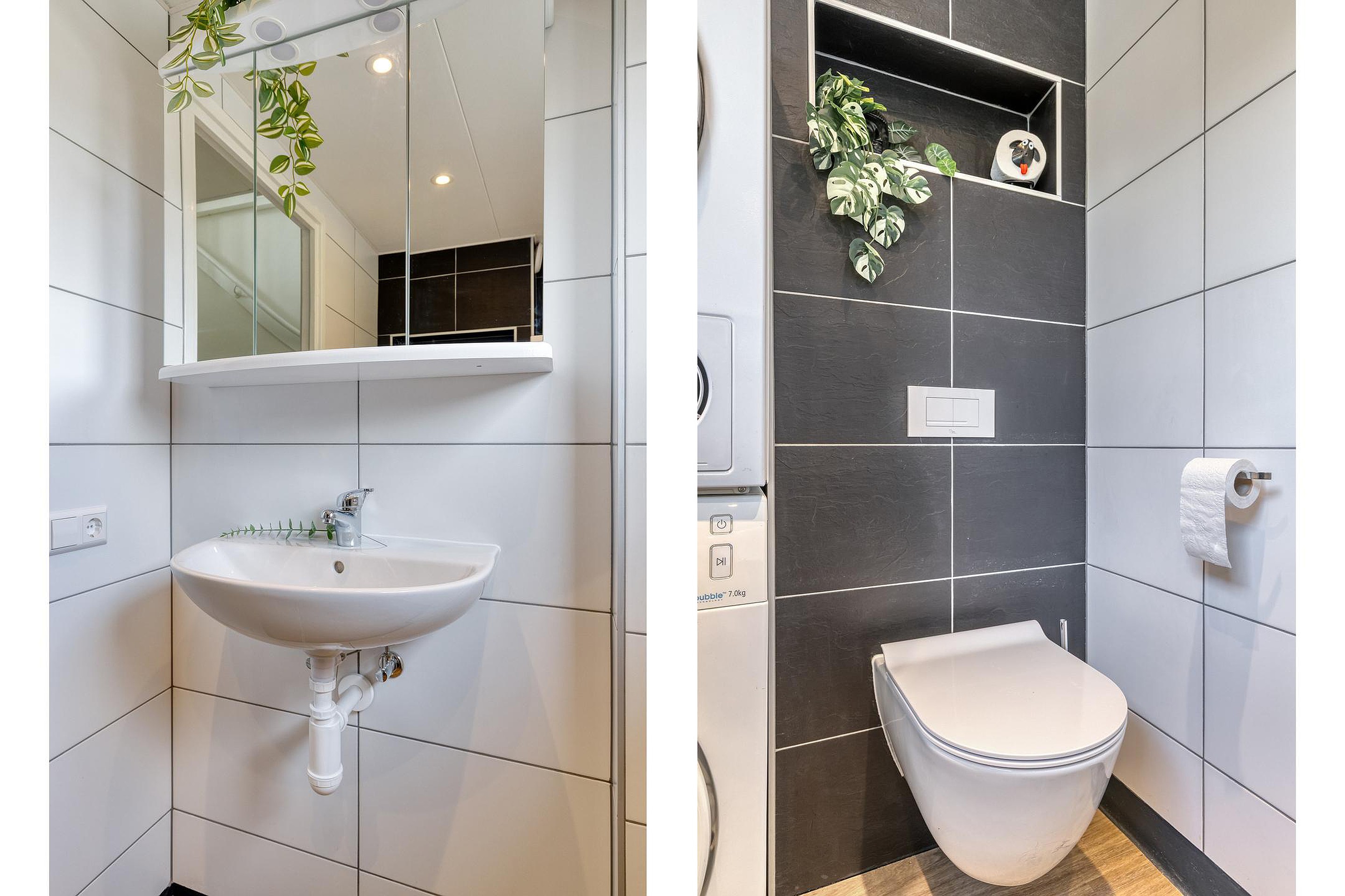 De voormalige badkamer is omgetoverd tot een toiletruimte met tevens de aansluitingen voor de was apparatuur.