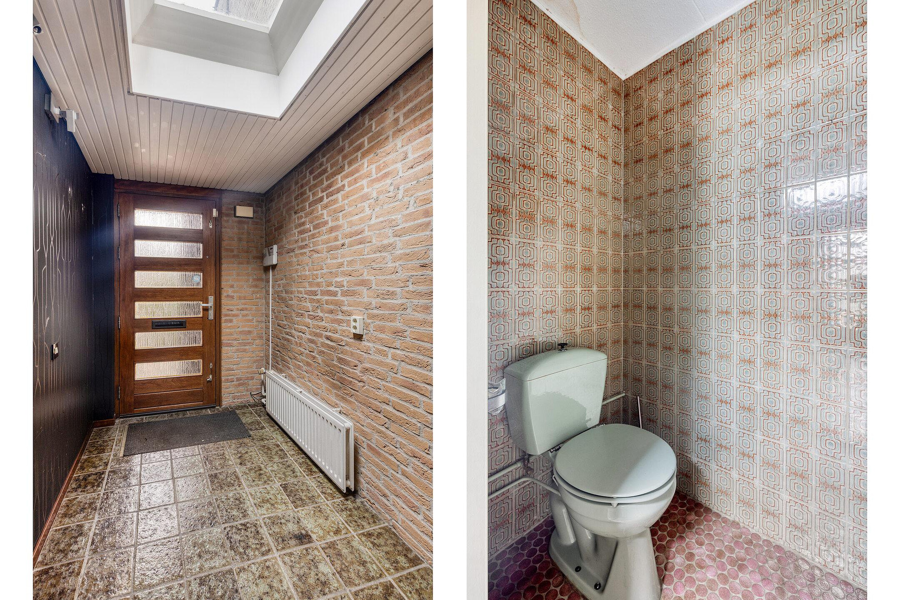 Hal met toiletruimte en toegang tot de vertrekken. De meterkast zit aan de buitenzijde van de woning naast de voordeur.