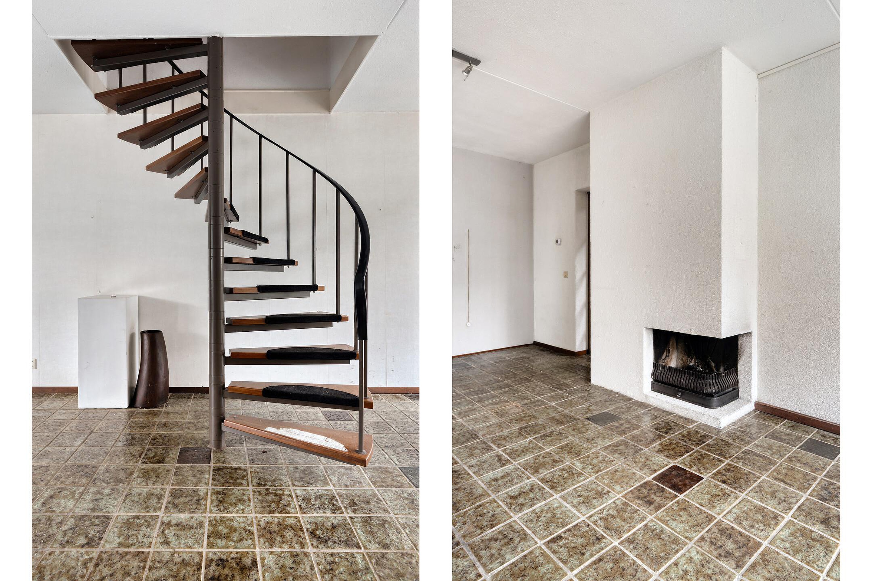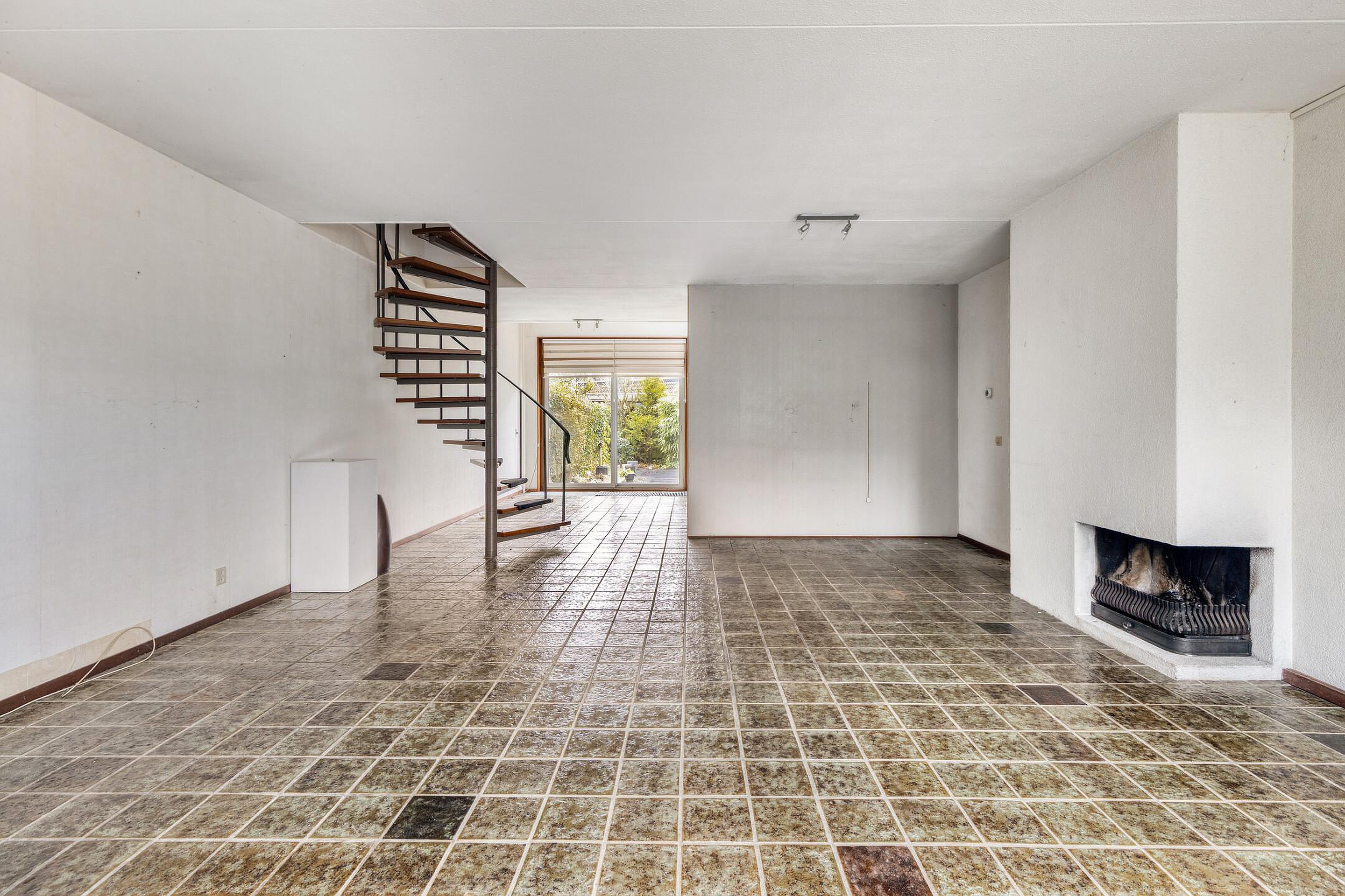 Royale woonkamer met open haard en spiltrap naar de eerste verdieping.