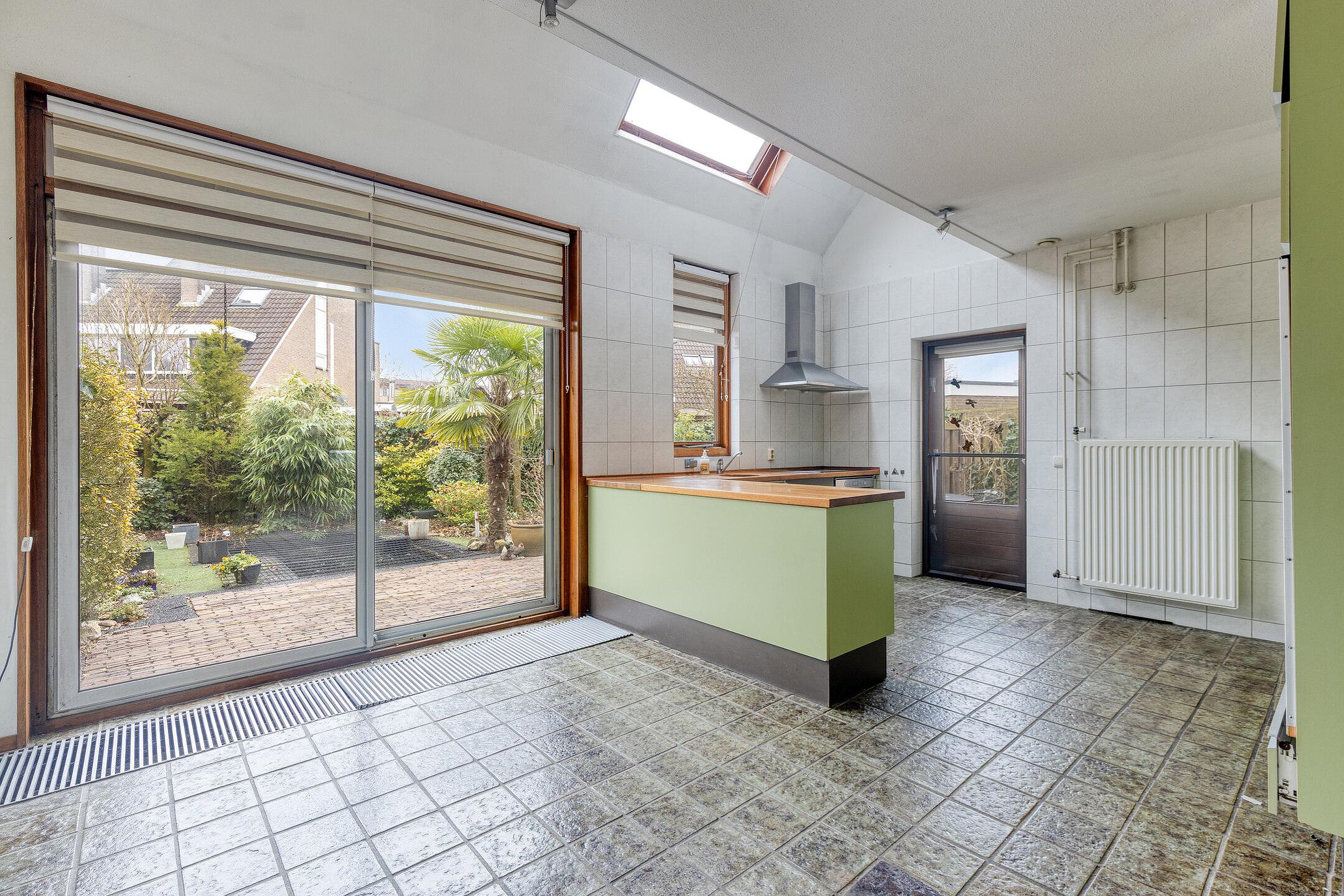 Grote ruime woonkeuken met leuk hoogteverschil in het plafond en een verrassende lichtinval heeft door de dakvensters. De keuken biedt middels een schuifpui en een loopdeur toegang tot de achtertuin.