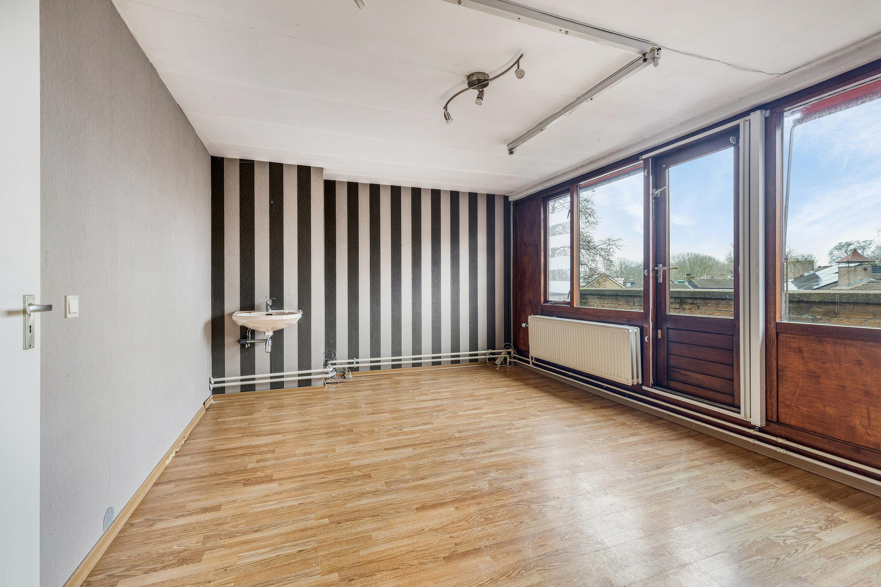 Grote slaapkamer aan de voorzijde van de woning met toegang tot een zonnig dakterras op het westen.