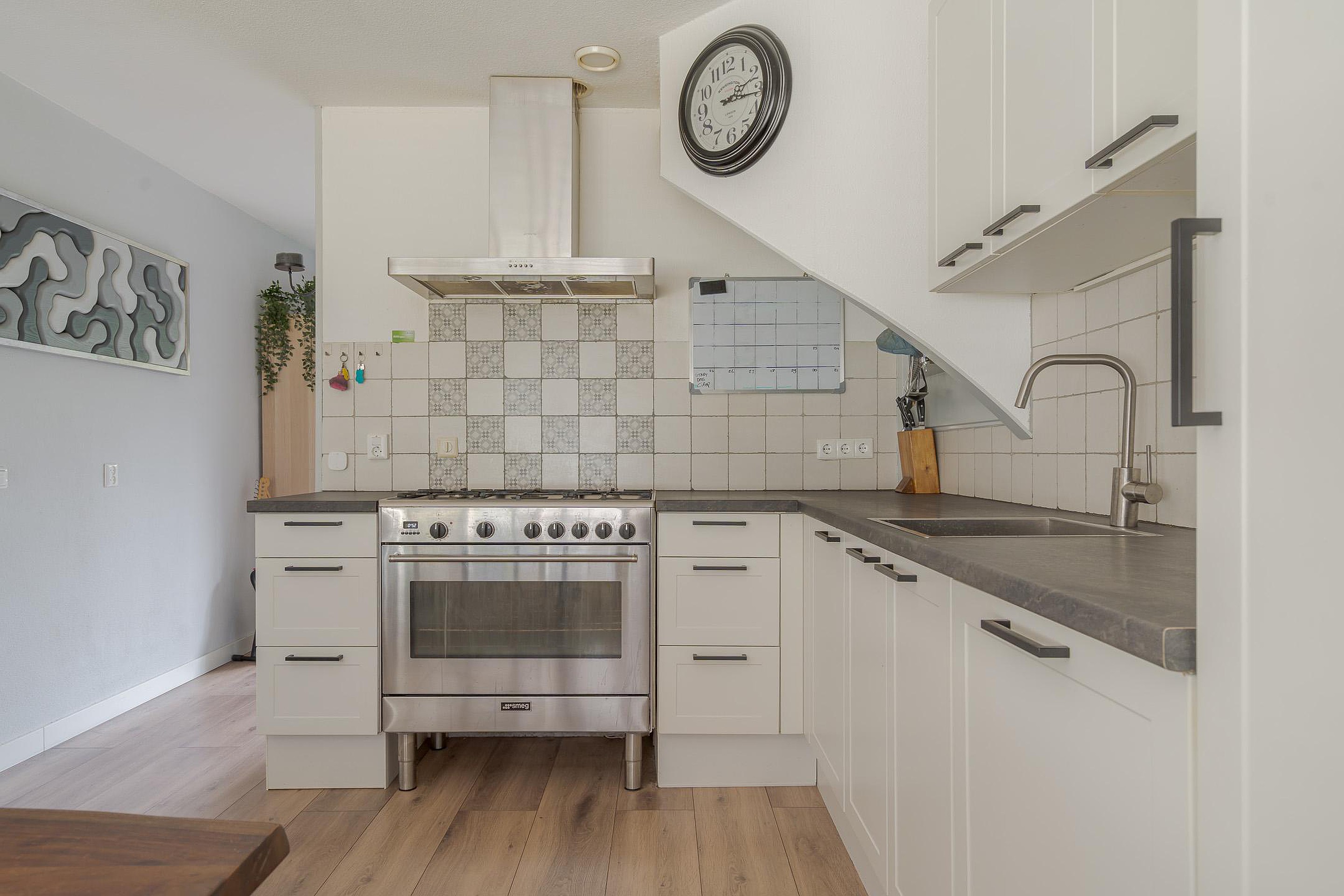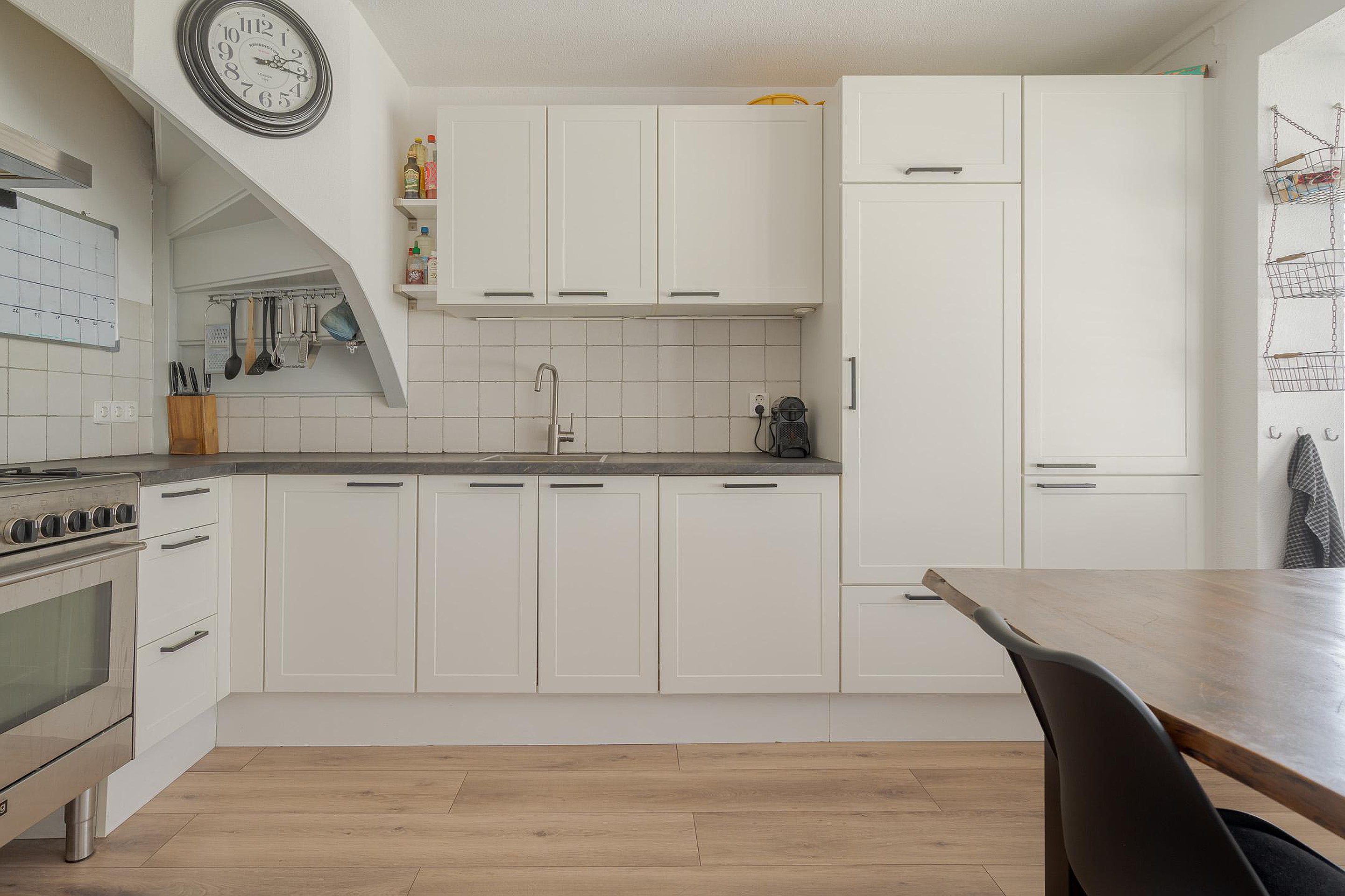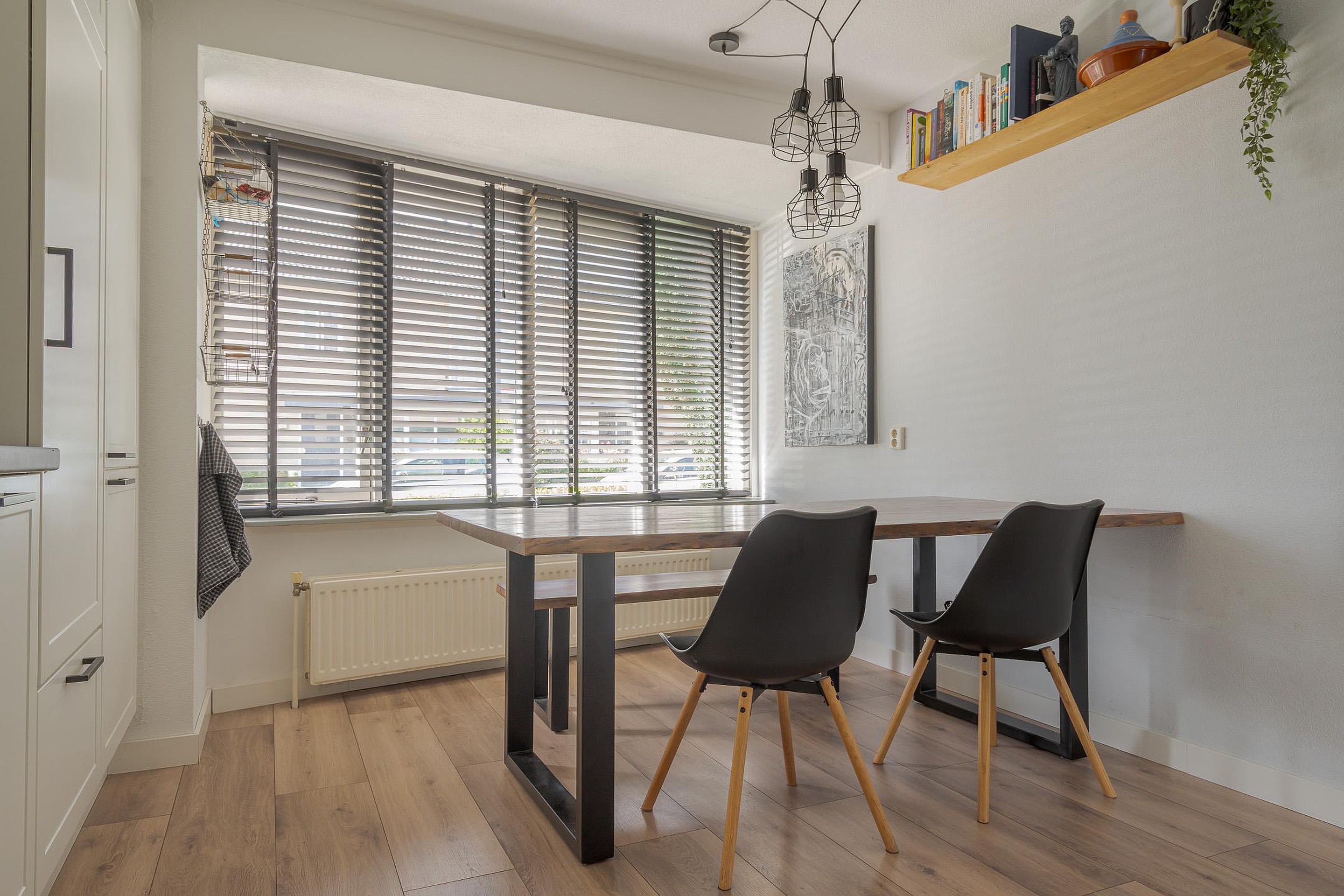 Aan de voorzijde van de woning is de open keuken/eetkamer gesitueerd. Deze is uitgevoerd in een hoekopstelling en voorzien van diverse inbouwapparatuur.