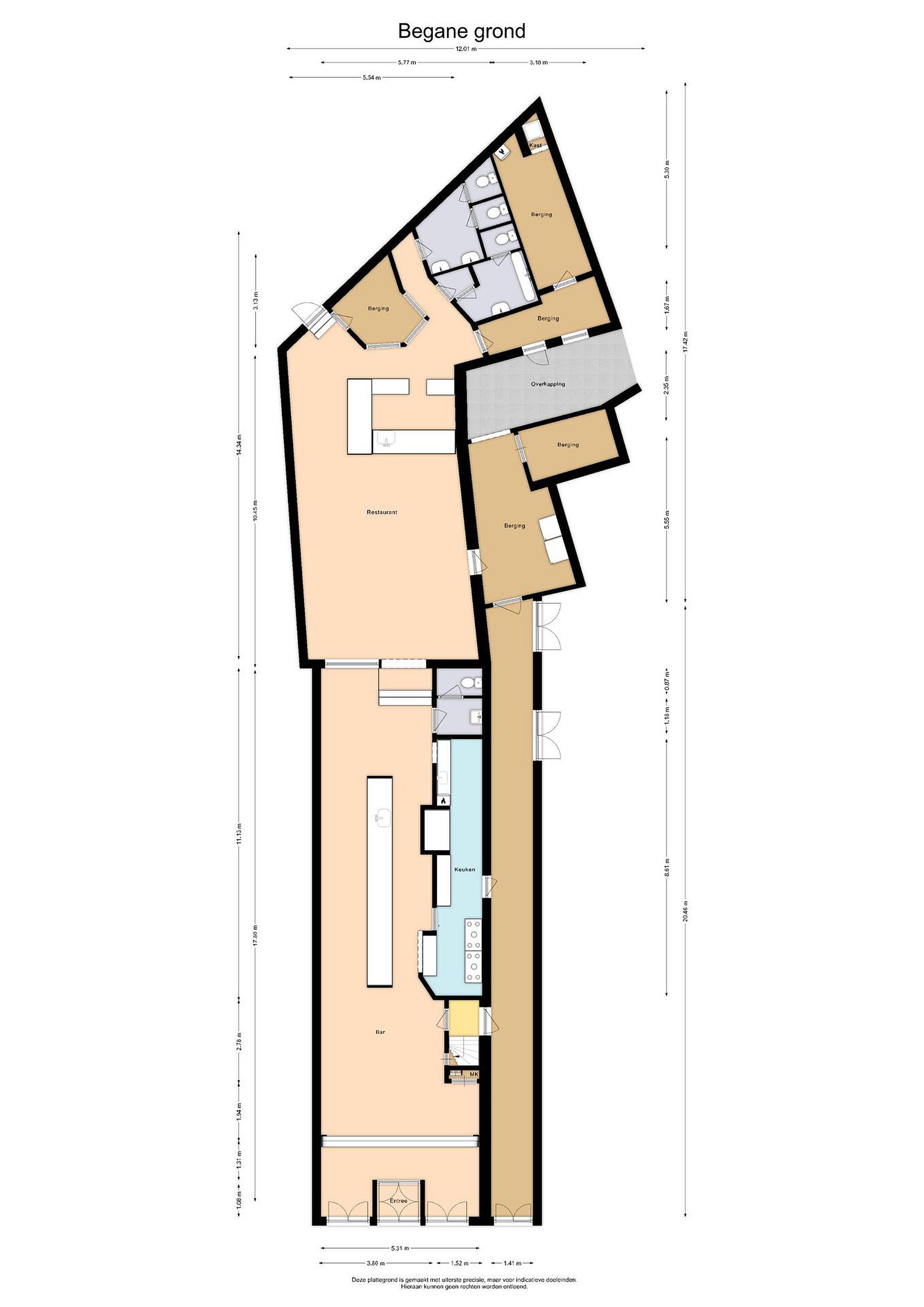 Begane grond Indeling pub: Entree, bar, meterkast, prive hal met trap naar de woning, keuken, toilet, restaurant met bar, berging, toiletten, berging en overkapping. Naast het pand is een overdekte steeg met berging.