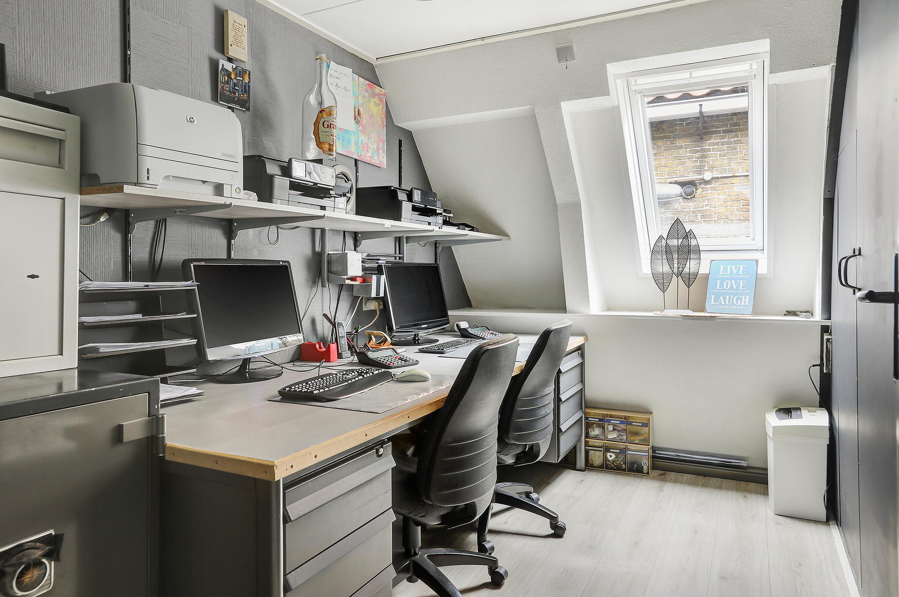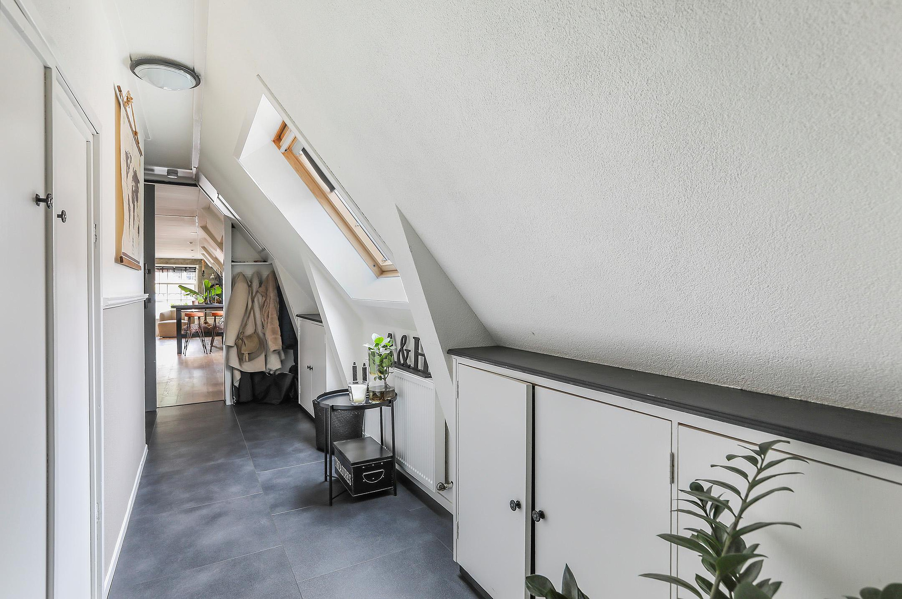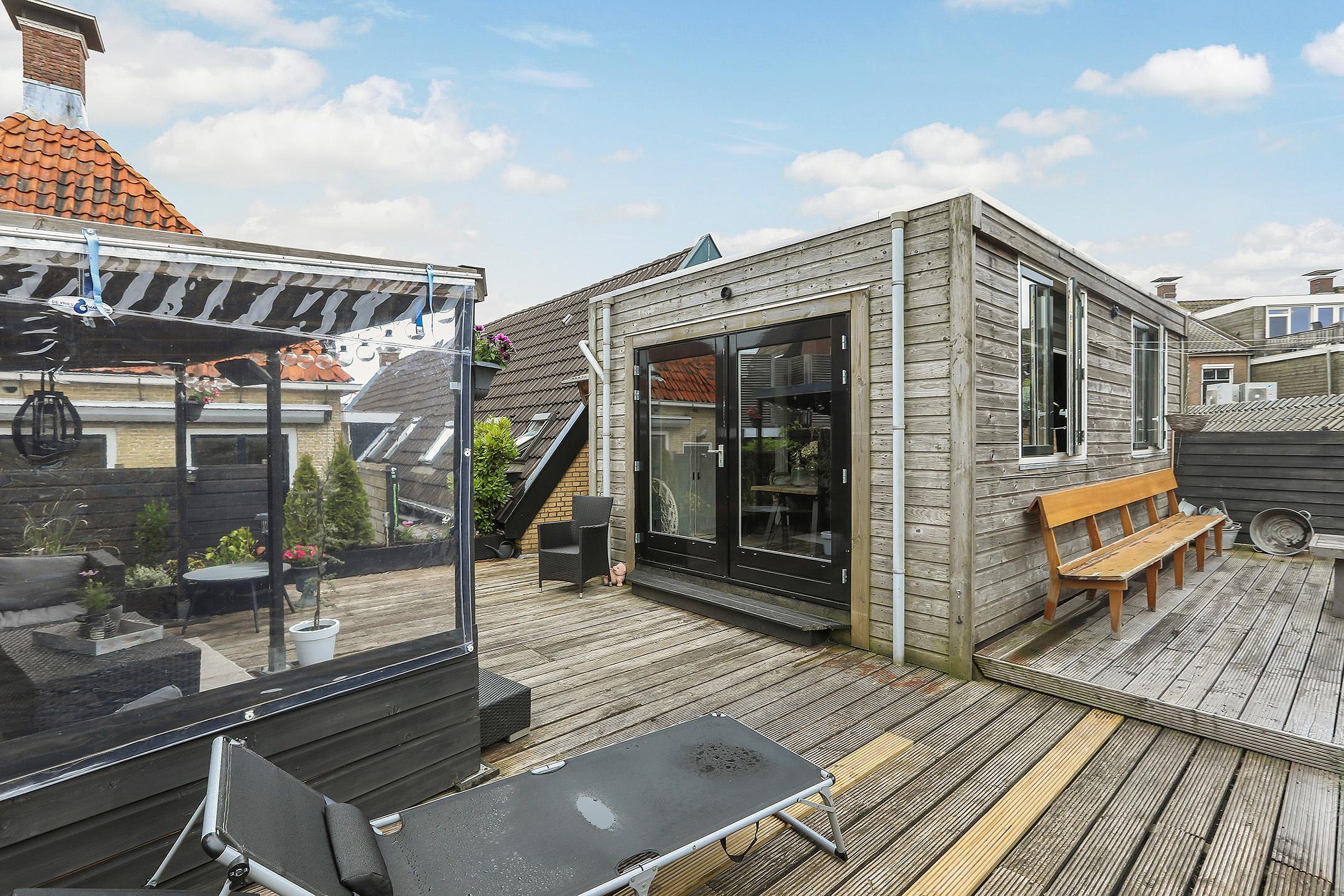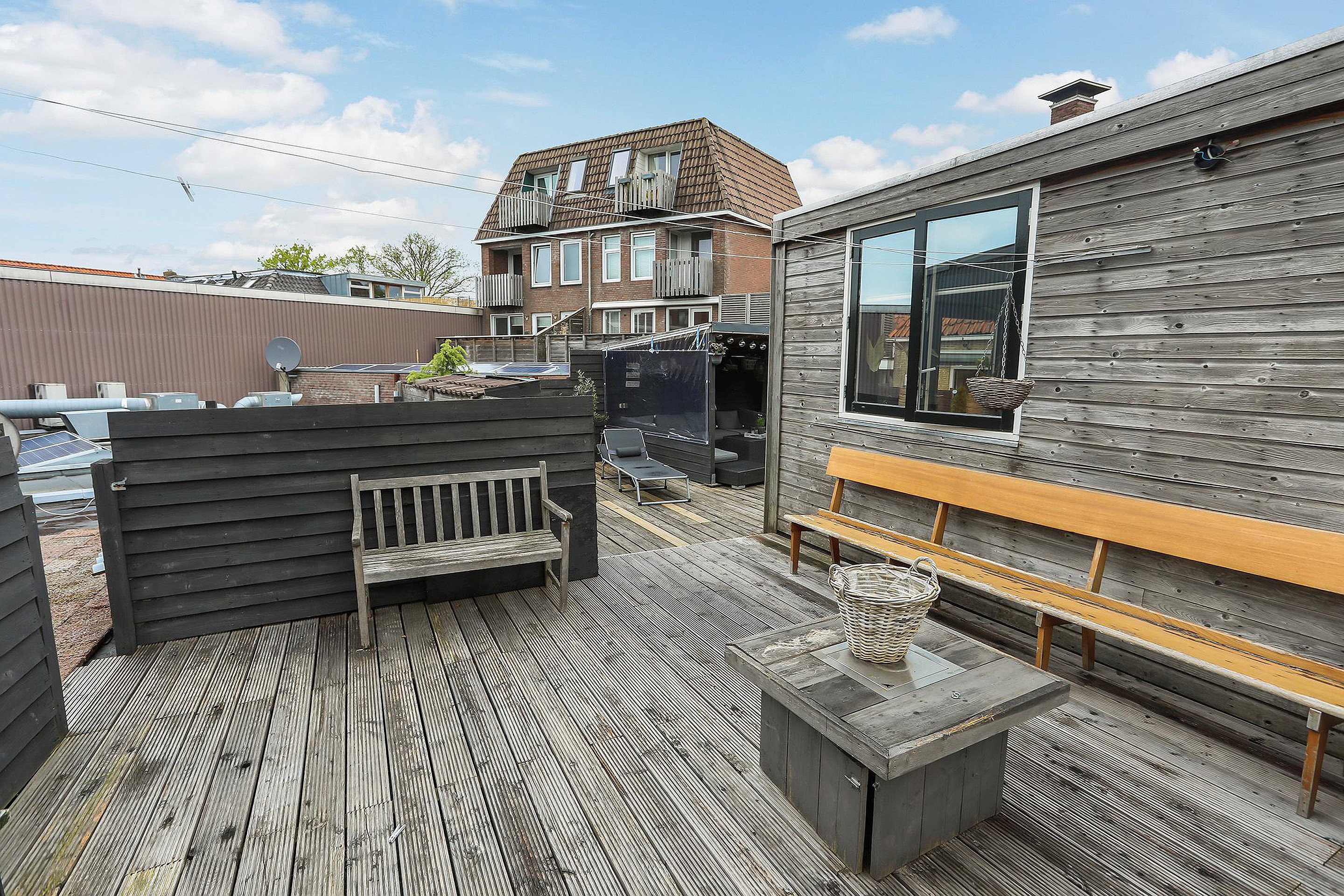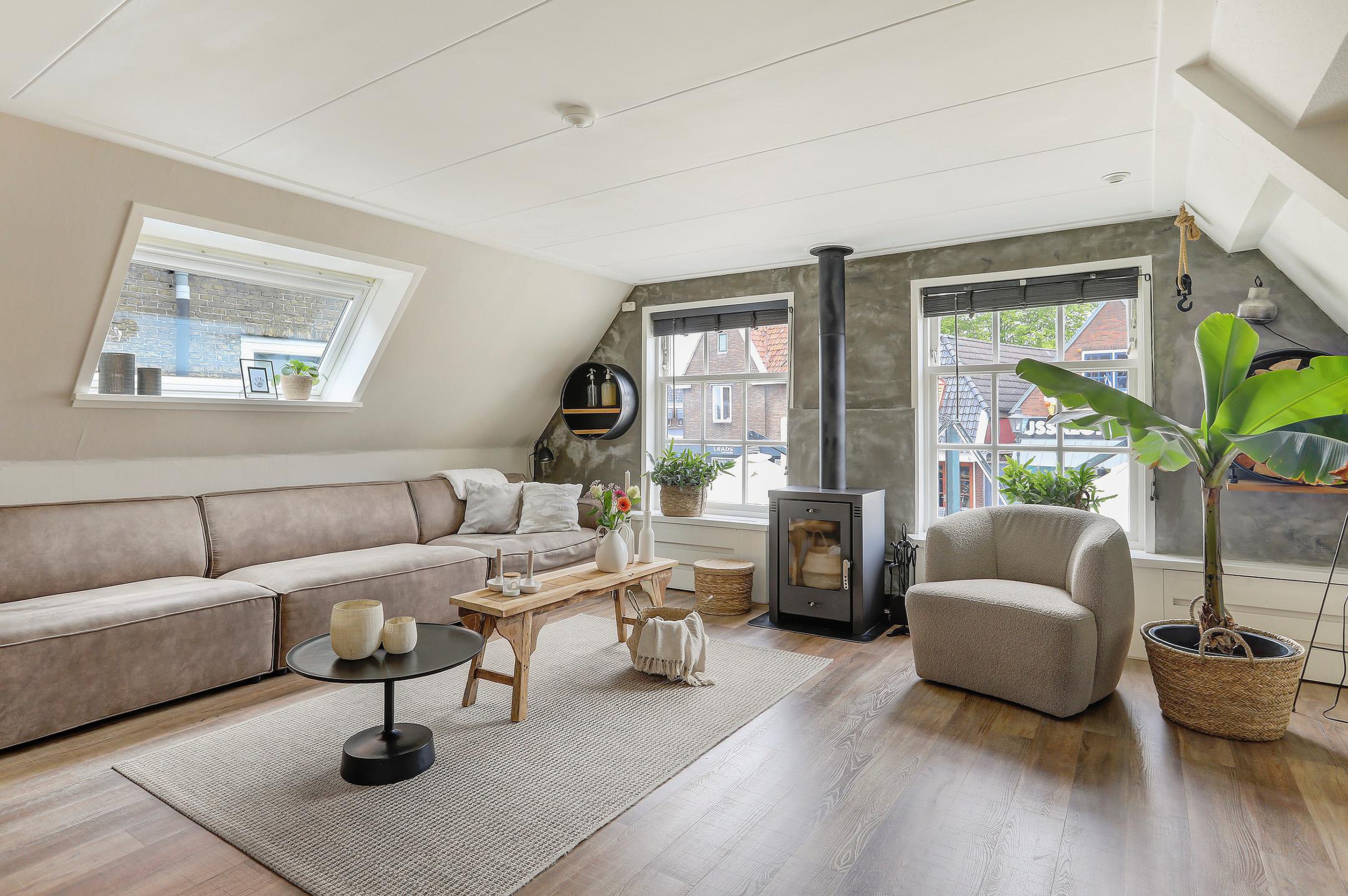 Eerste verdieping 1e verdieping: trapopgang, deur naar de woonkamer met houtkachel en op meerdere plaatsen voorzien van dakramen. Ruime open keuken voorzien van diverse inbouwapparatuur zoals: 5-pits gasfornuis met afzuigkap, oven en vaatwasser. Via de keuken kom je in de hal. Badkamer met ligbad, wastafel en douchecabine, separaat toilet, 2 slaapkamers/kantoor. Aan de achterzijde van de woning is op het dakterras een uitbouw gerealiseerd, waarin zich een royale slaapkamer bevindt met een kamer en suite. Deze lichte ruimte beschikt over openslaande deuren naar het dakterras. De ensuite-kamer kan uitstekend dienen als inloopkast, werkruimte of zitkamer.