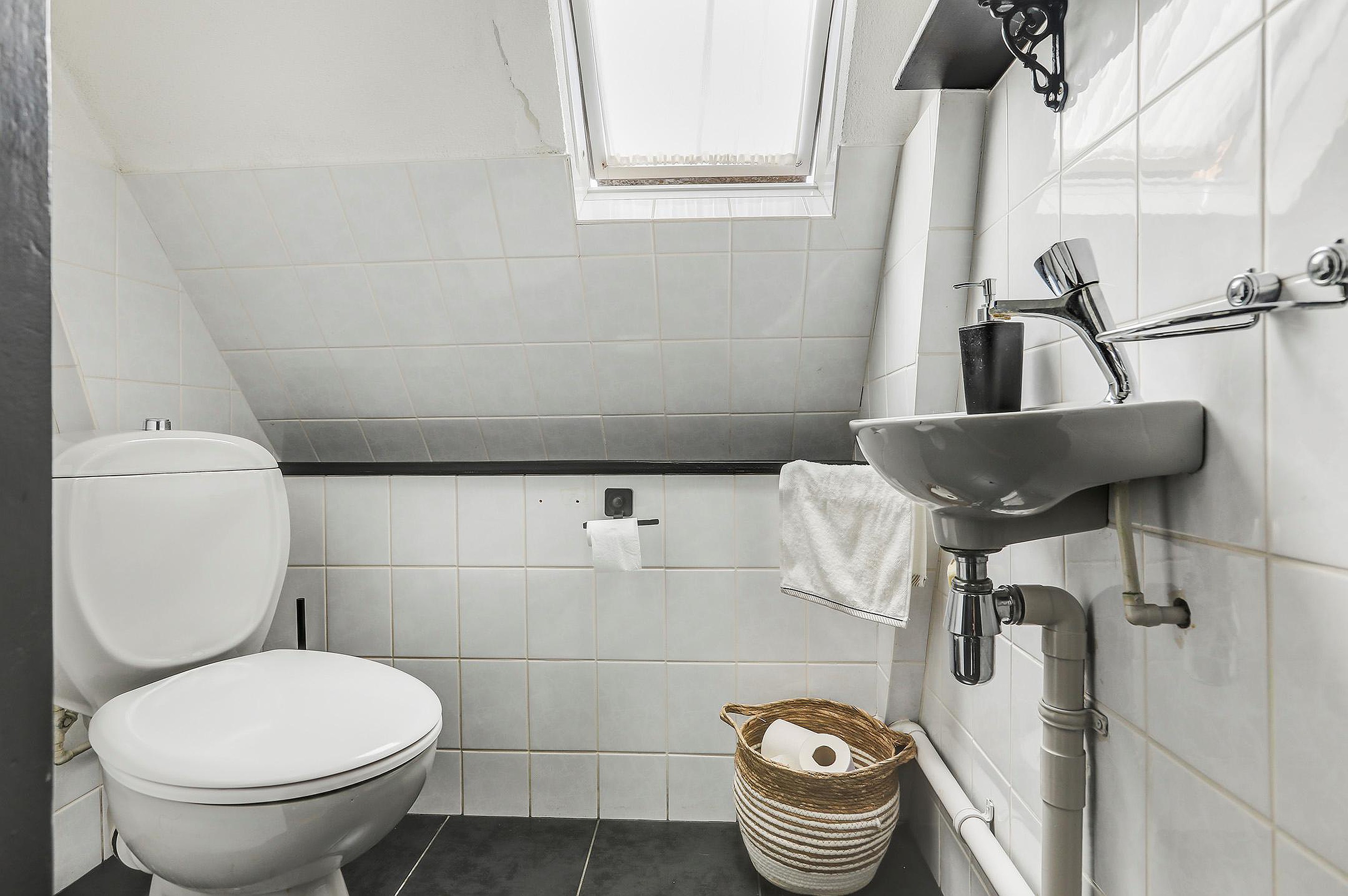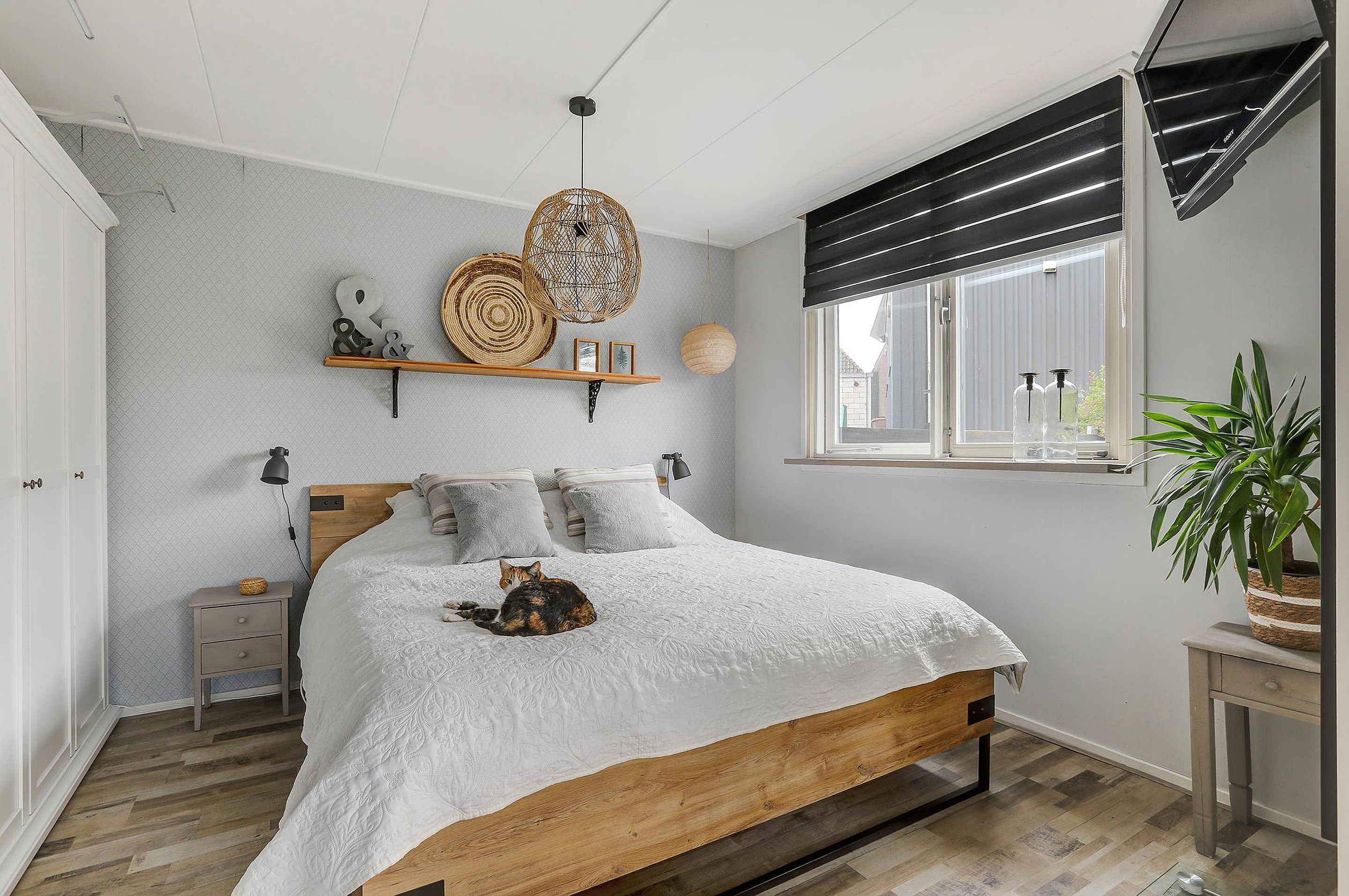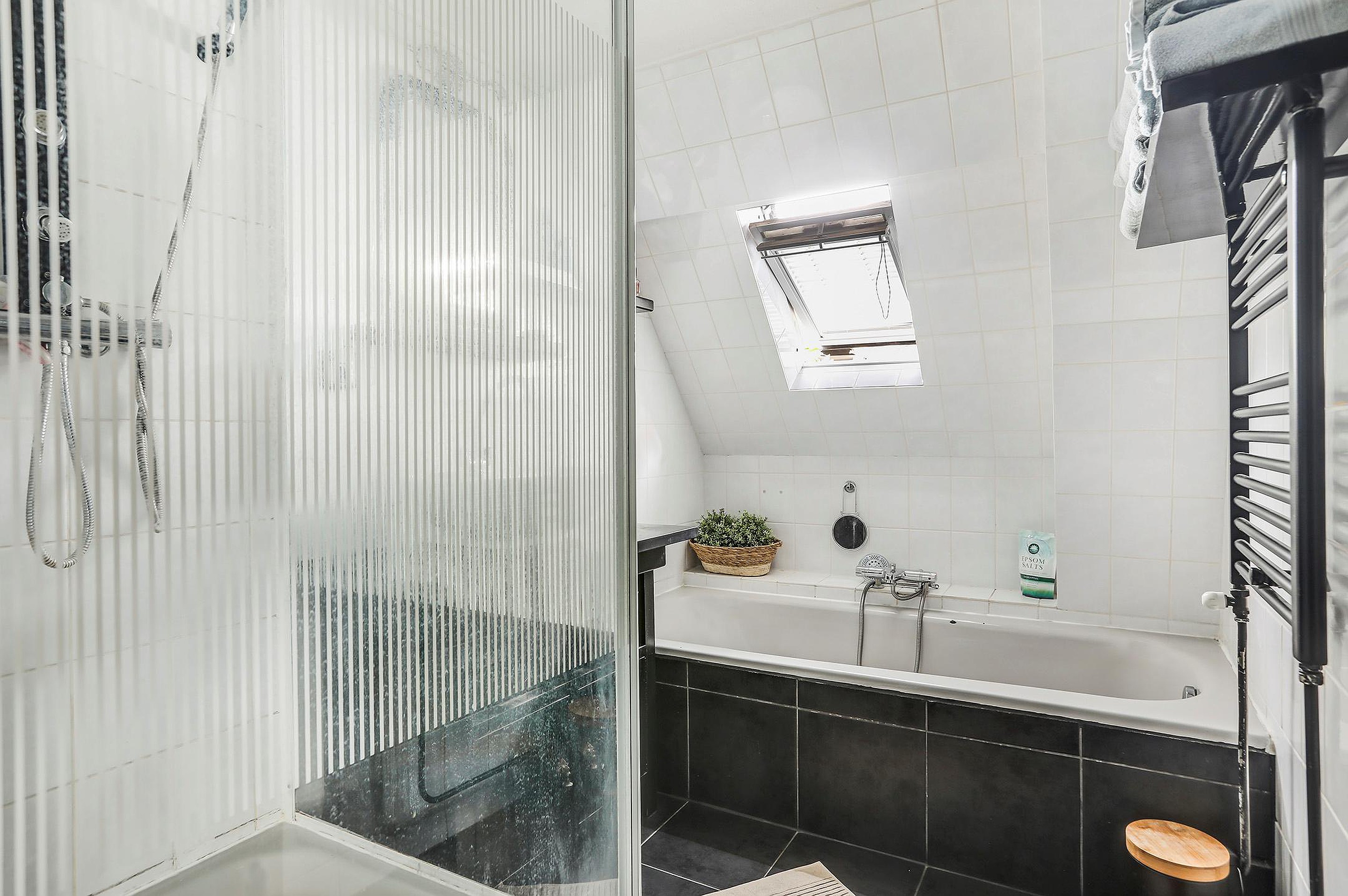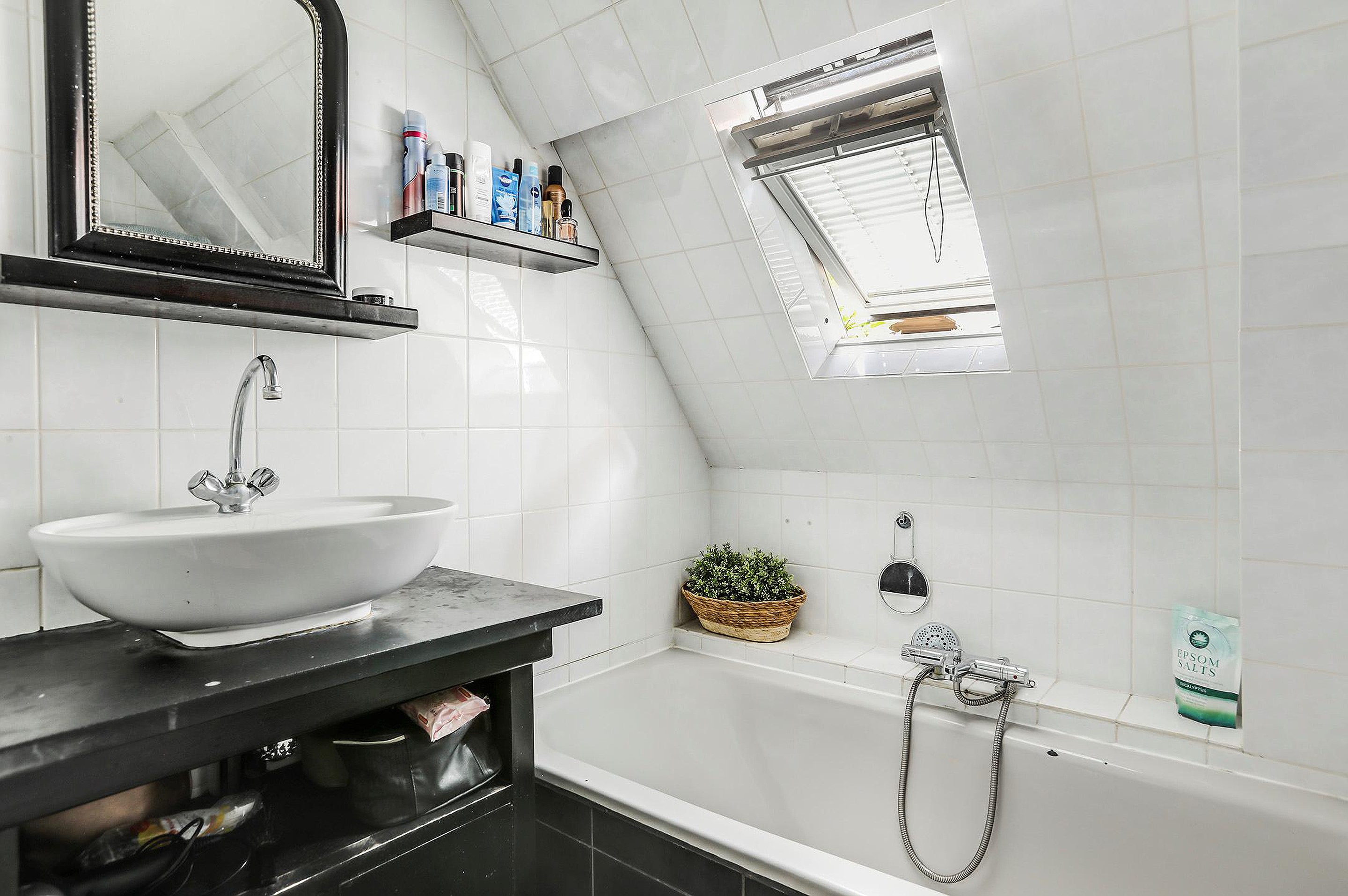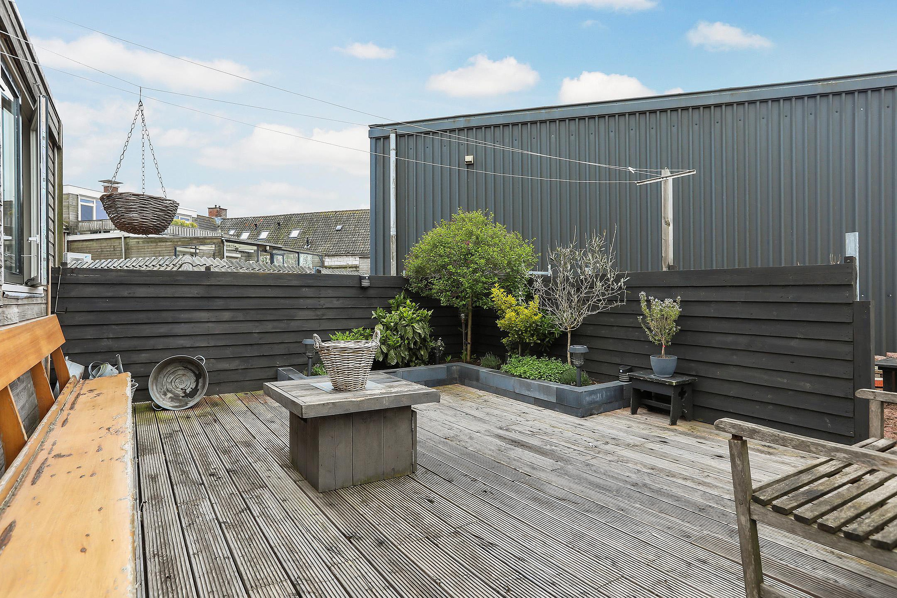 Eerste verdieping 1e verdieping: trapopgang, deur naar de woonkamer met houtkachel en op meerdere plaatsen voorzien van dakramen. Ruime open keuken voorzien van diverse inbouwapparatuur zoals: 5-pits gasfornuis met afzuigkap, oven en vaatwasser. Via de keuken kom je in de hal. Badkamer met ligbad, wastafel en douchecabine, separaat toilet, 2 slaapkamers/kantoor. Aan de achterzijde van de woning is op het dakterras een uitbouw gerealiseerd, waarin zich een royale slaapkamer bevindt met een kamer en suite. Deze lichte ruimte beschikt over openslaande deuren naar het dakterras. De ensuite-kamer kan uitstekend dienen als inloopkast, werkruimte of zitkamer.