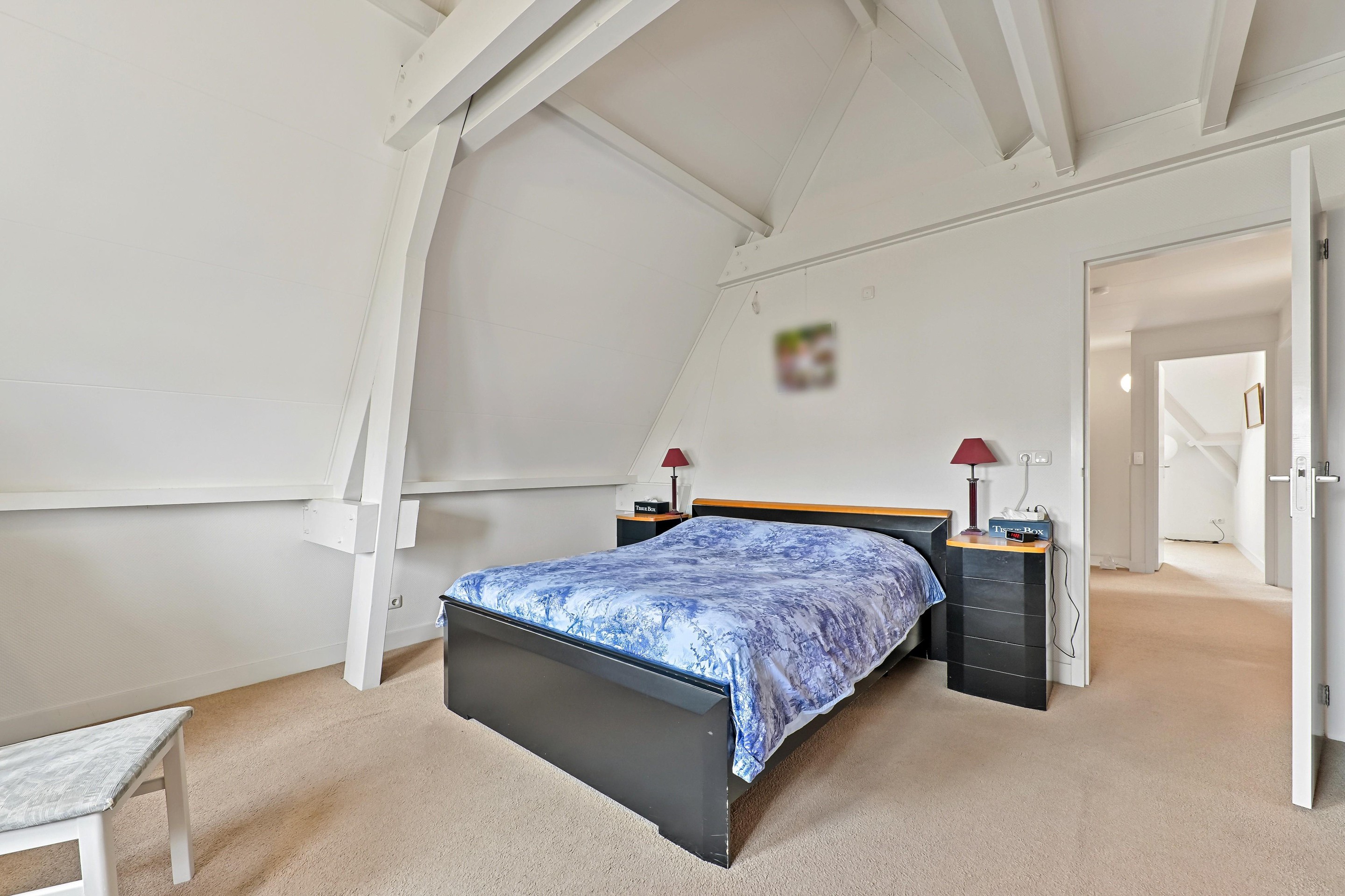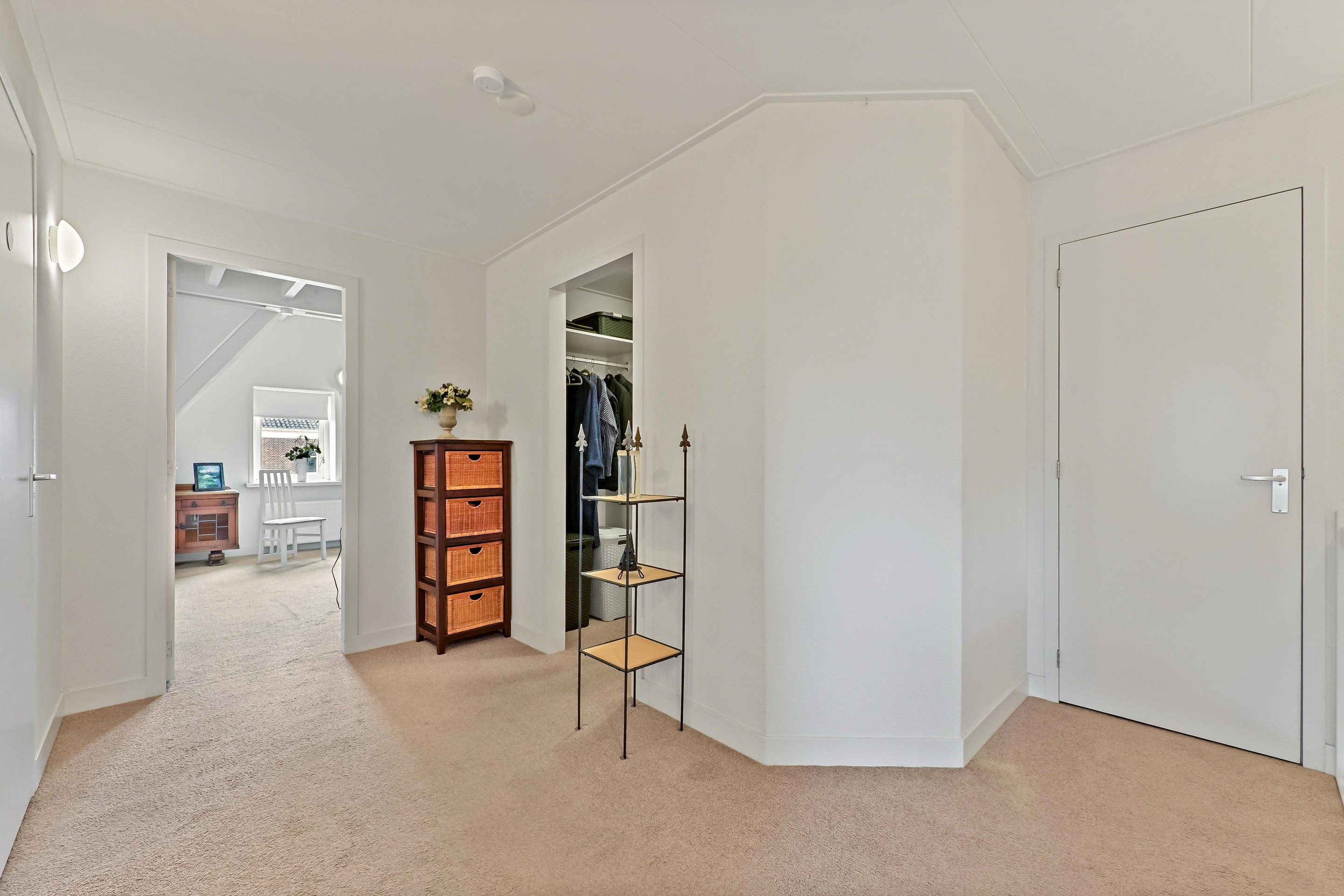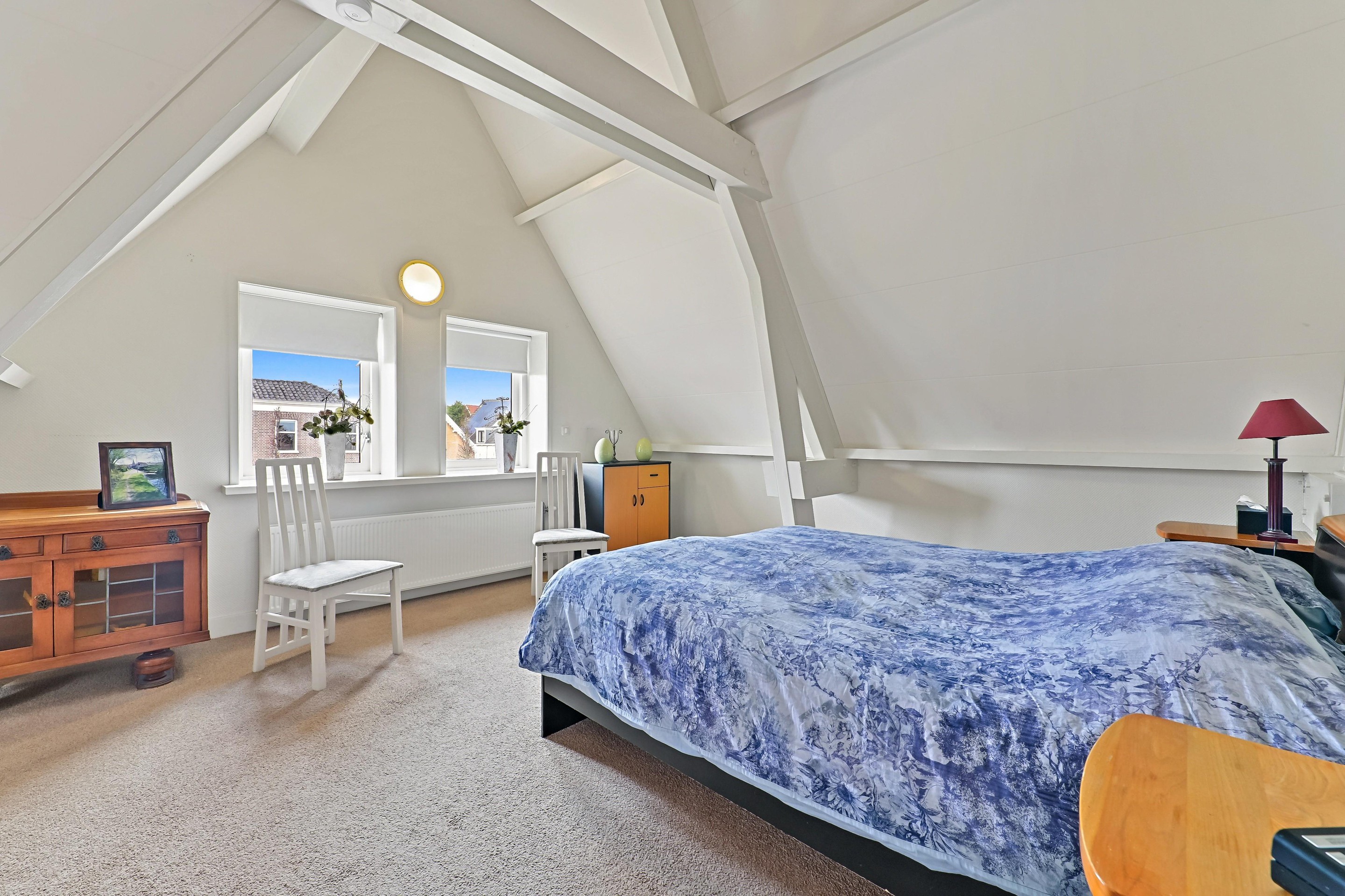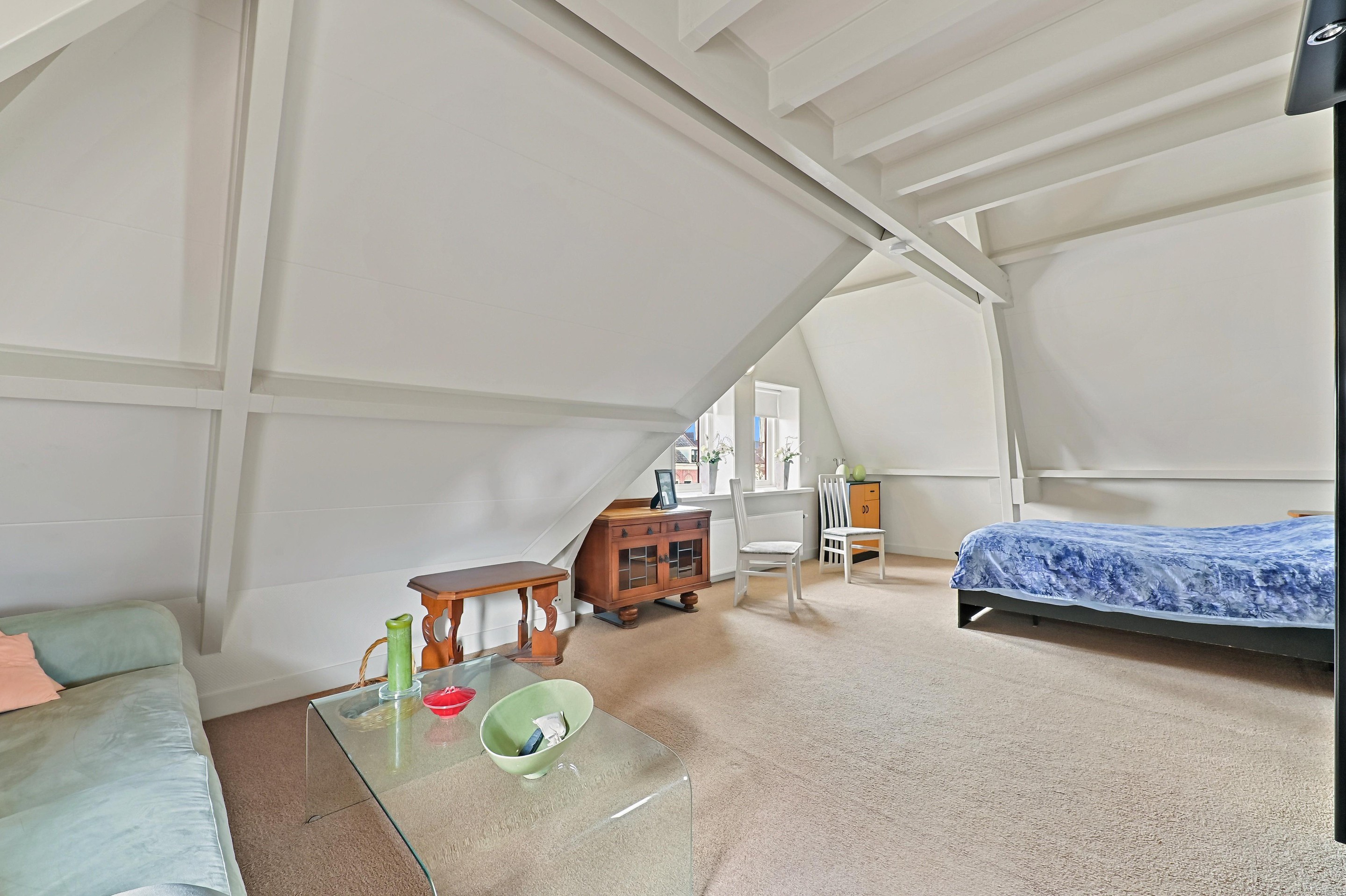 Op de bovenverdieping zijn drie slaapkamers aanwezig. De overloop bevindt zich in het midden van de woning. Op de overloop is een zeer ruime inloopkast aanwezig. Aan de voorzijde van de woning bevinden zich twee slaapkamers. Dankzij de bijzondere vorm van de kap zijn er diverse hoogtes in de woning aanwezig. Bij de voorste kamer is de hoge nok mooi zichtbaar gemaakt. De andere slaapkamer beschikt over een dakkapel aan de zijkant van de woning. Over een groot gedeelte van het huis is een vliering aanwezig, en is toegankelijk via een losse trap in een van de kamers aan de voorzijde. De badkamer is ruim van opzet en voorzien van een vrijstaand ligbad, een tweede toilet, een inloopdouche, designradiator en een stijlvolle wastafel. De hoofdslaapkamer is aan de achterzijde van de woning en is maar liefst 26,4 m2 groot. Ook in deze fraaie ruimte is de hoge nok zichtbaar en dankzij twee ramen in de achtergevel én een dakkapel aan de zijkant komt er veel licht de ruimte binnen.