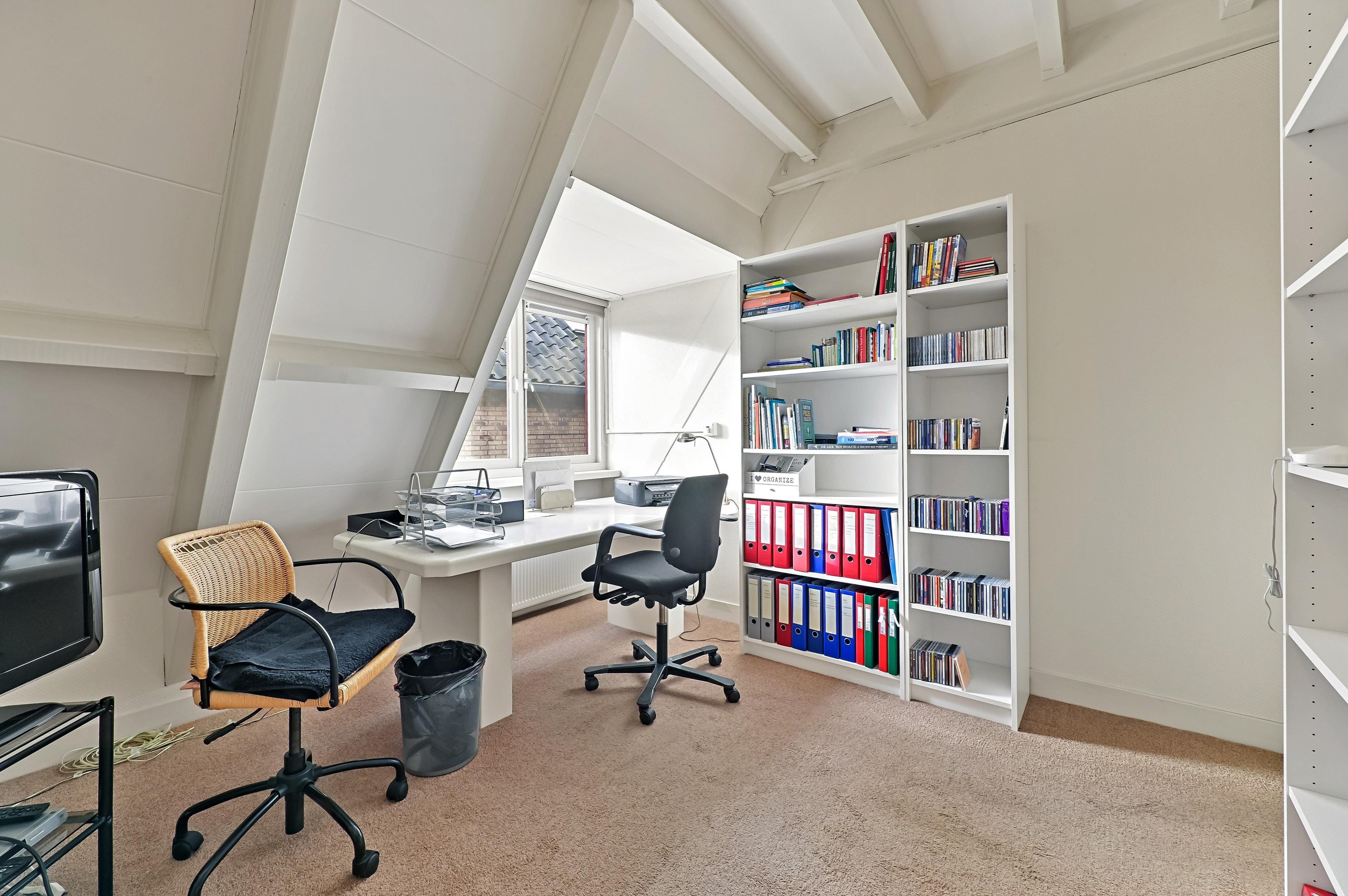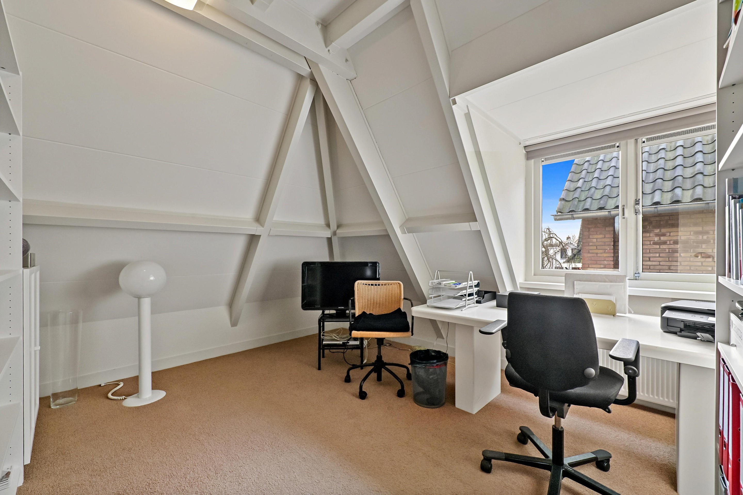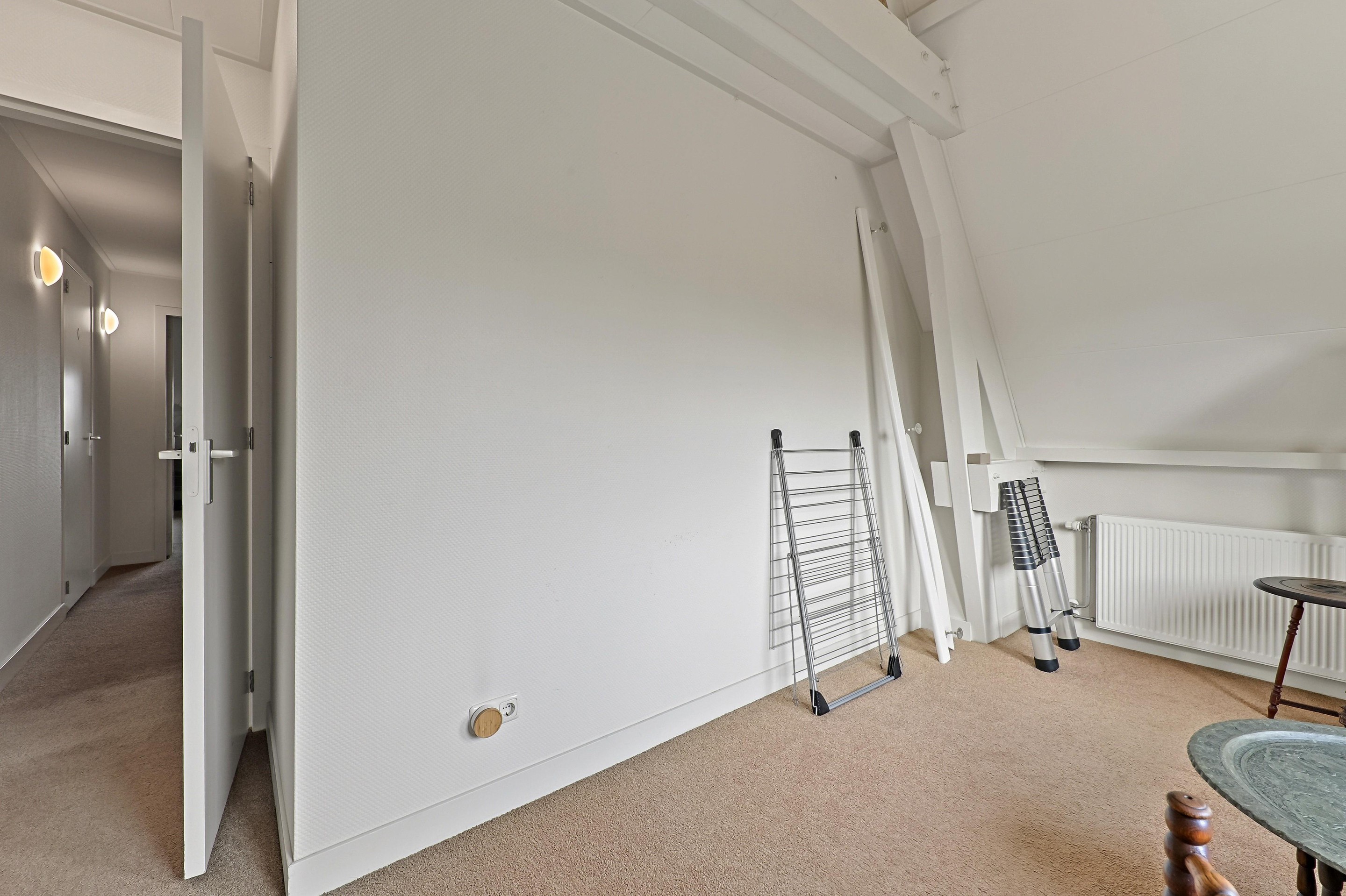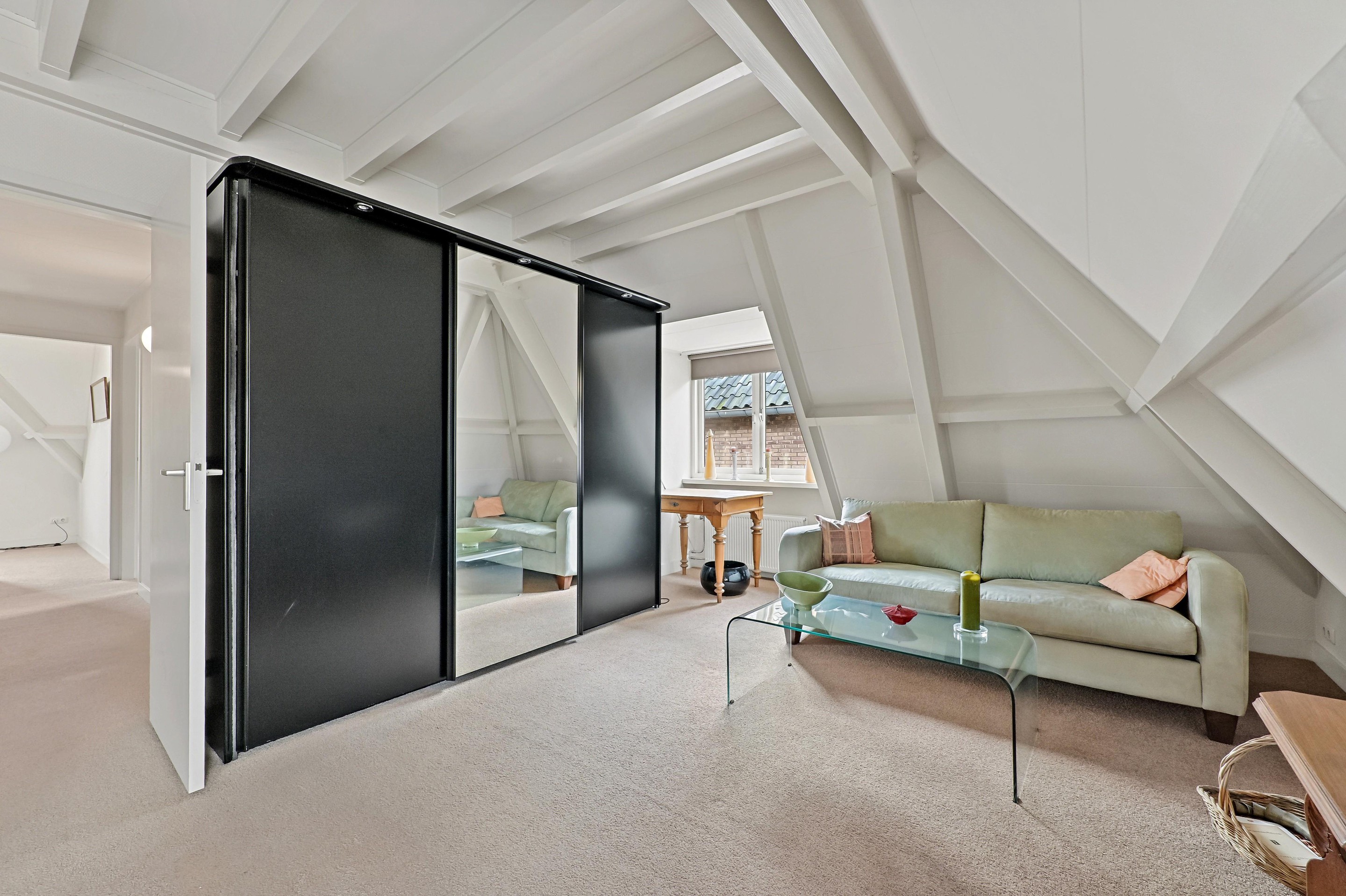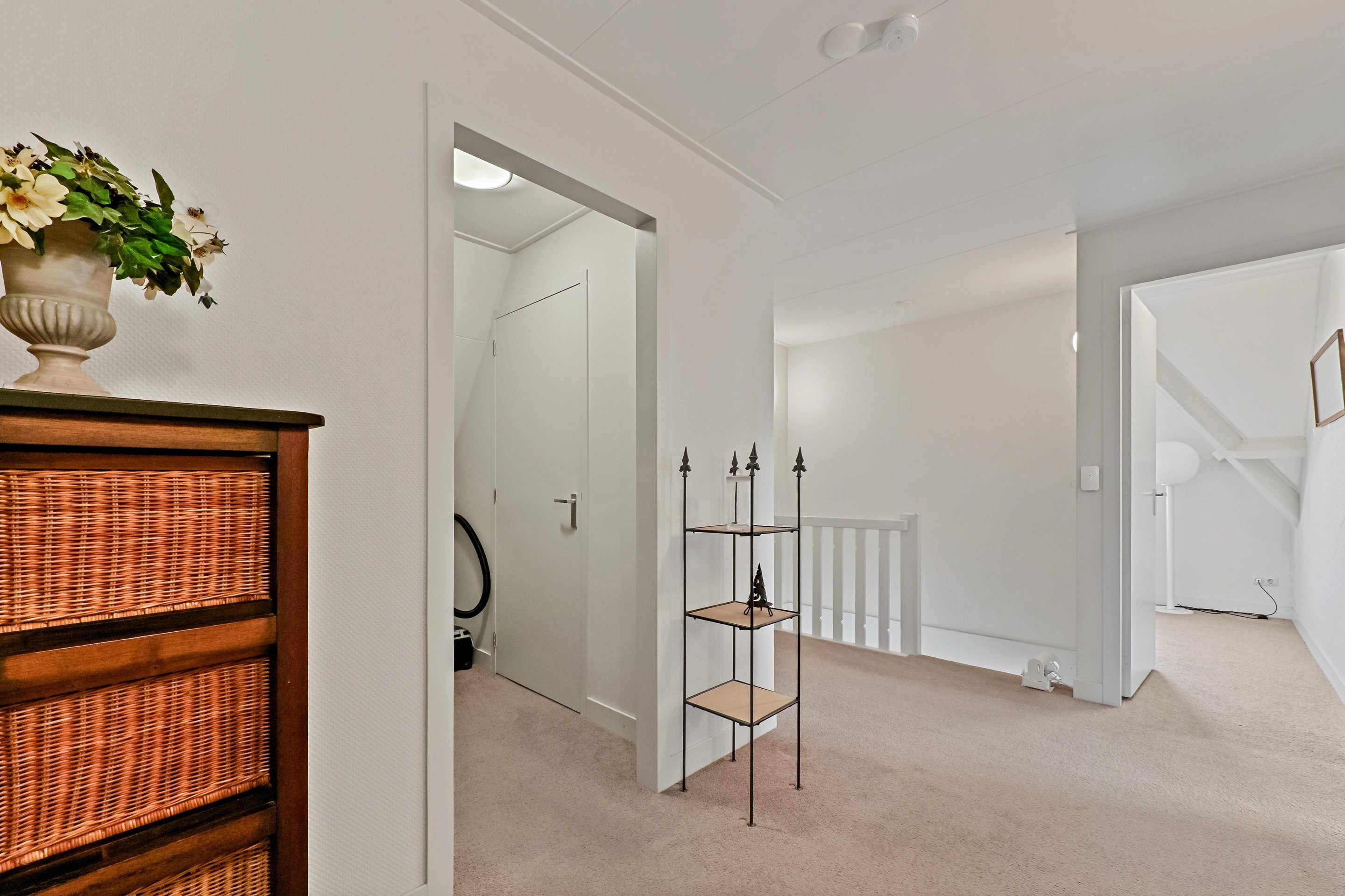Op de bovenverdieping zijn drie slaapkamers aanwezig. De overloop bevindt zich in het midden van de woning. Op de overloop is een zeer ruime inloopkast aanwezig. Aan de voorzijde van de woning bevinden zich twee slaapkamers. Dankzij de bijzondere vorm van de kap zijn er diverse hoogtes in de woning aanwezig. Bij de voorste kamer is de hoge nok mooi zichtbaar gemaakt. De andere slaapkamer beschikt over een dakkapel aan de zijkant van de woning. Over een groot gedeelte van het huis is een vliering aanwezig, en is toegankelijk via een losse trap in een van de kamers aan de voorzijde. De badkamer is ruim van opzet en voorzien van een vrijstaand ligbad, een tweede toilet, een inloopdouche, designradiator en een stijlvolle wastafel. De hoofdslaapkamer is aan de achterzijde van de woning en is maar liefst 26,4 m2 groot. Ook in deze fraaie ruimte is de hoge nok zichtbaar en dankzij twee ramen in de achtergevel én een dakkapel aan de zijkant komt er veel licht de ruimte binnen.